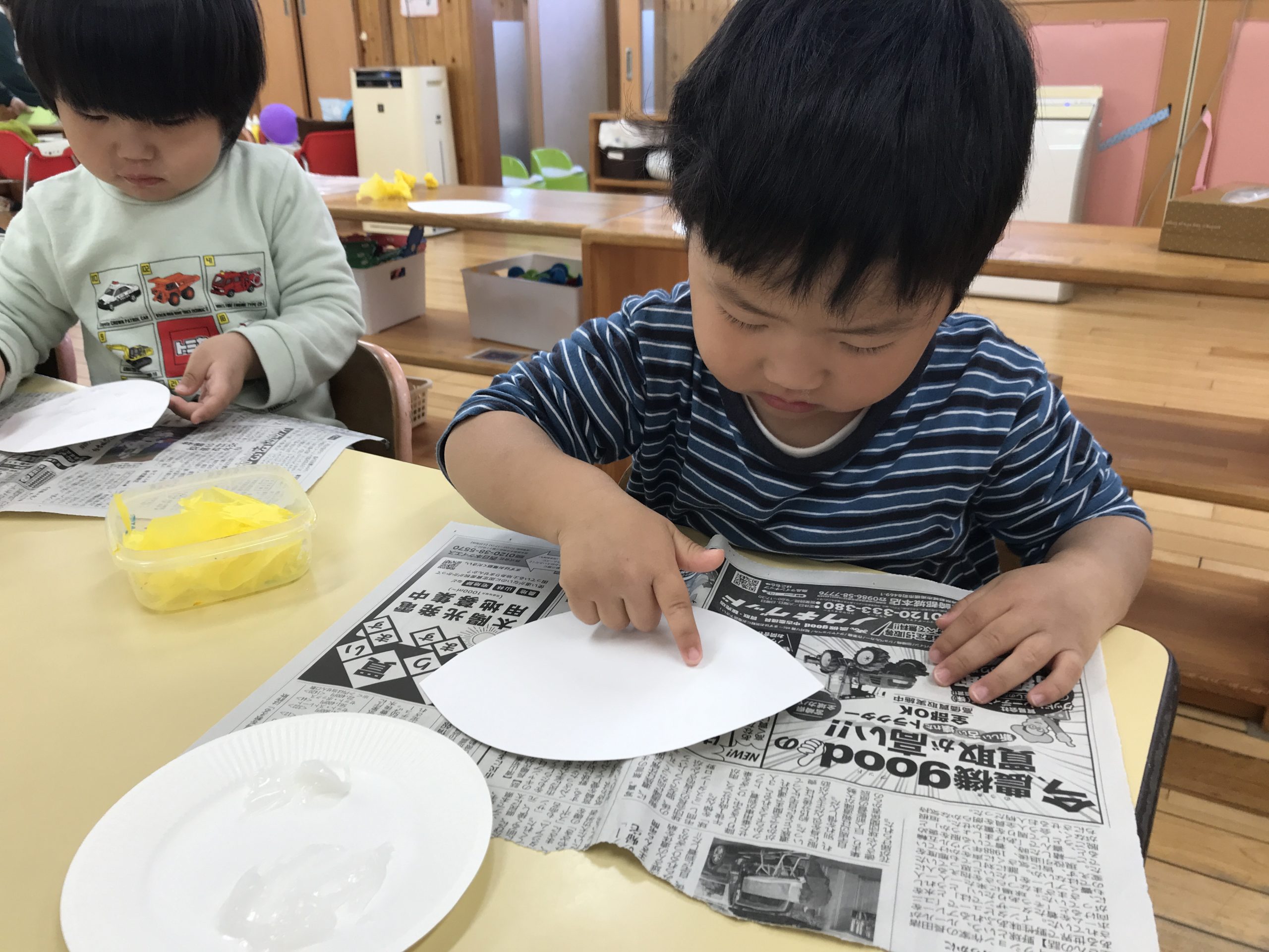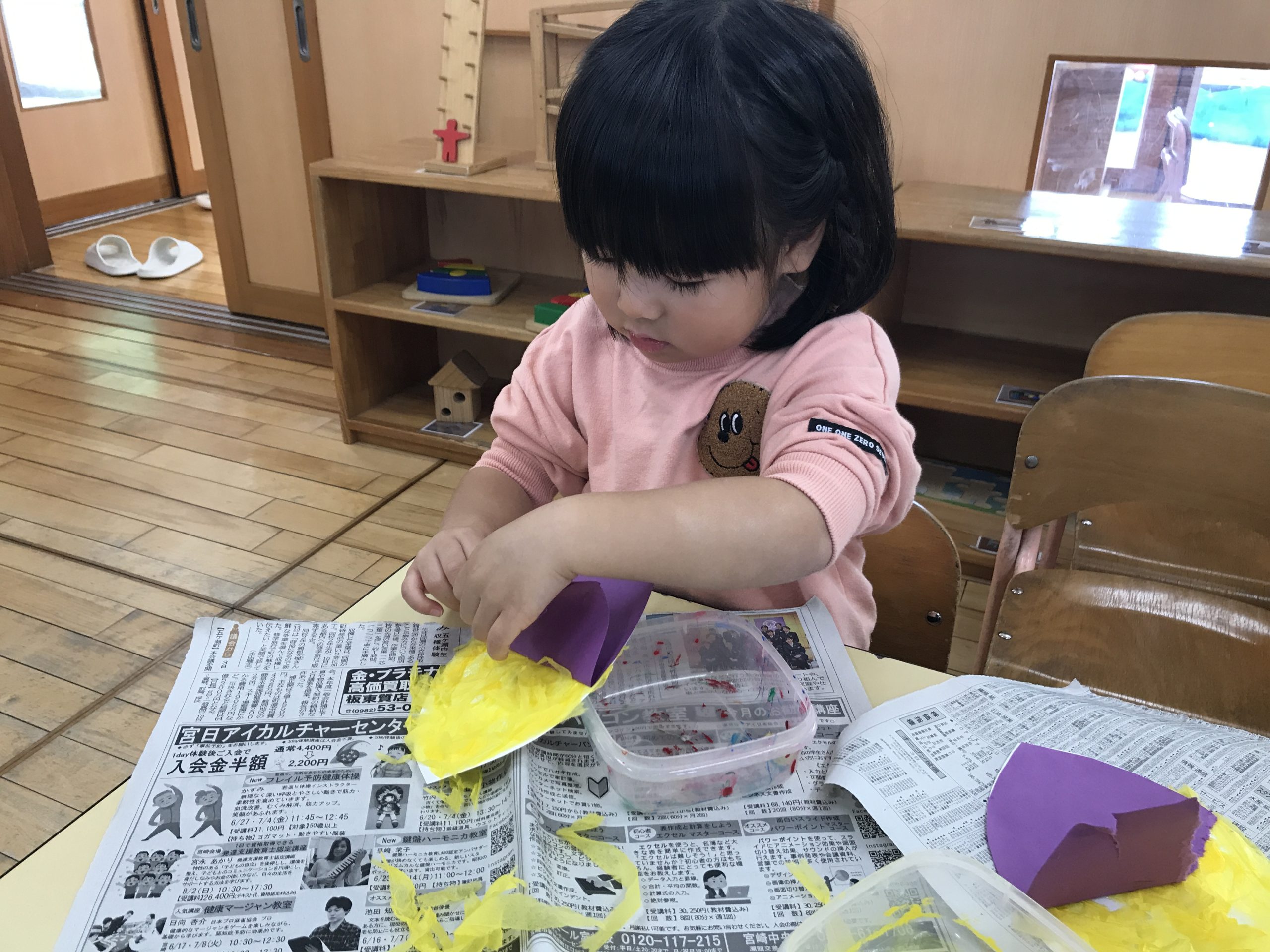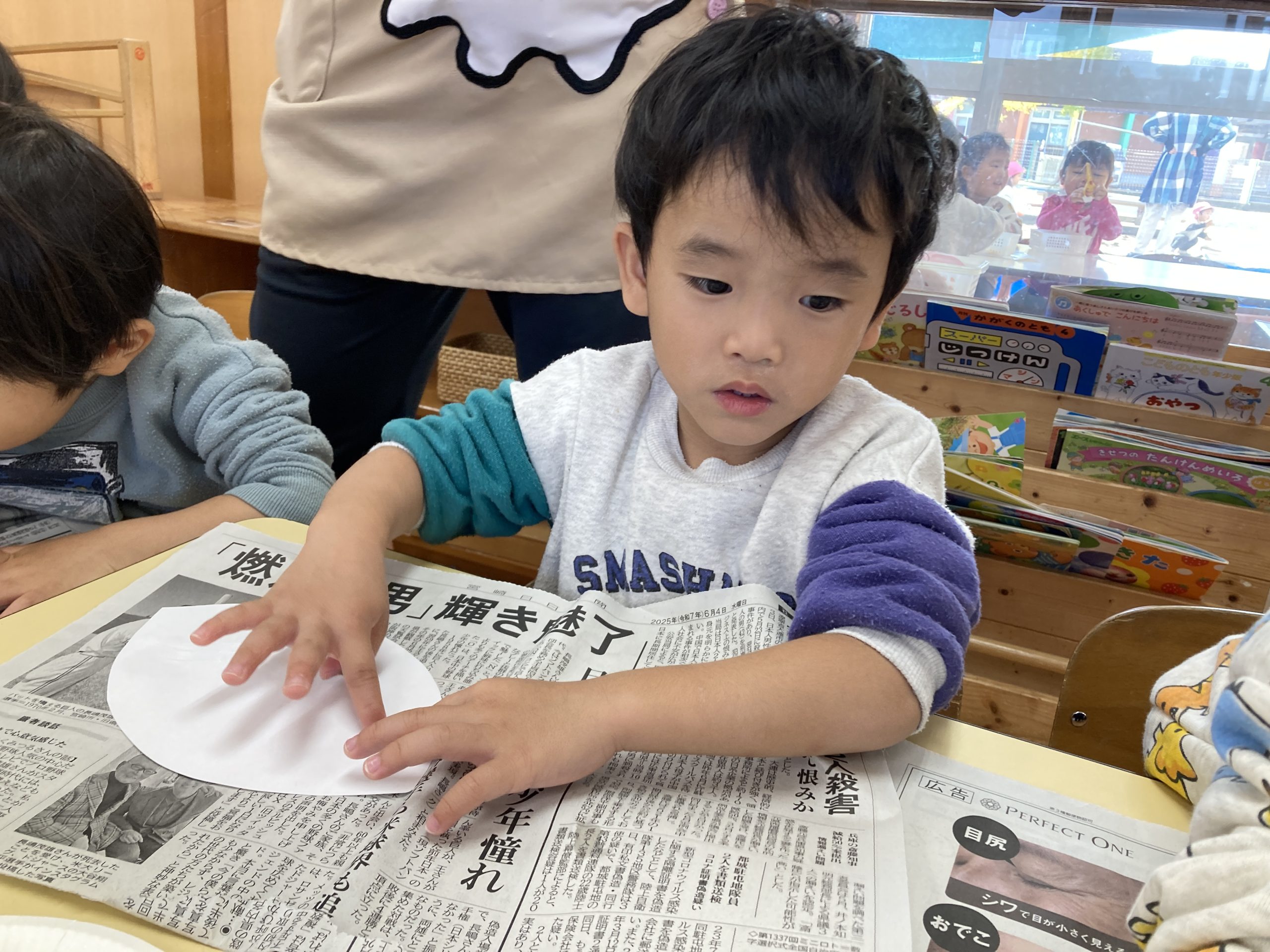 今日は、製作で焼き芋を作りました🍠💛花紙をちぎり、画用紙にのりを塗って花紙を貼り付けました!みんな上手に作ることができていましたよ✨また、画用紙を破いて焼き芋の皮がむけている様子も表現しました!