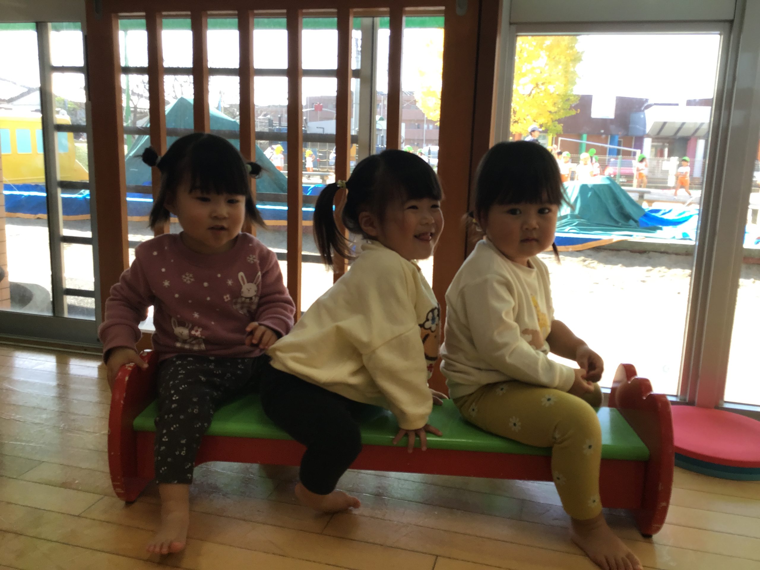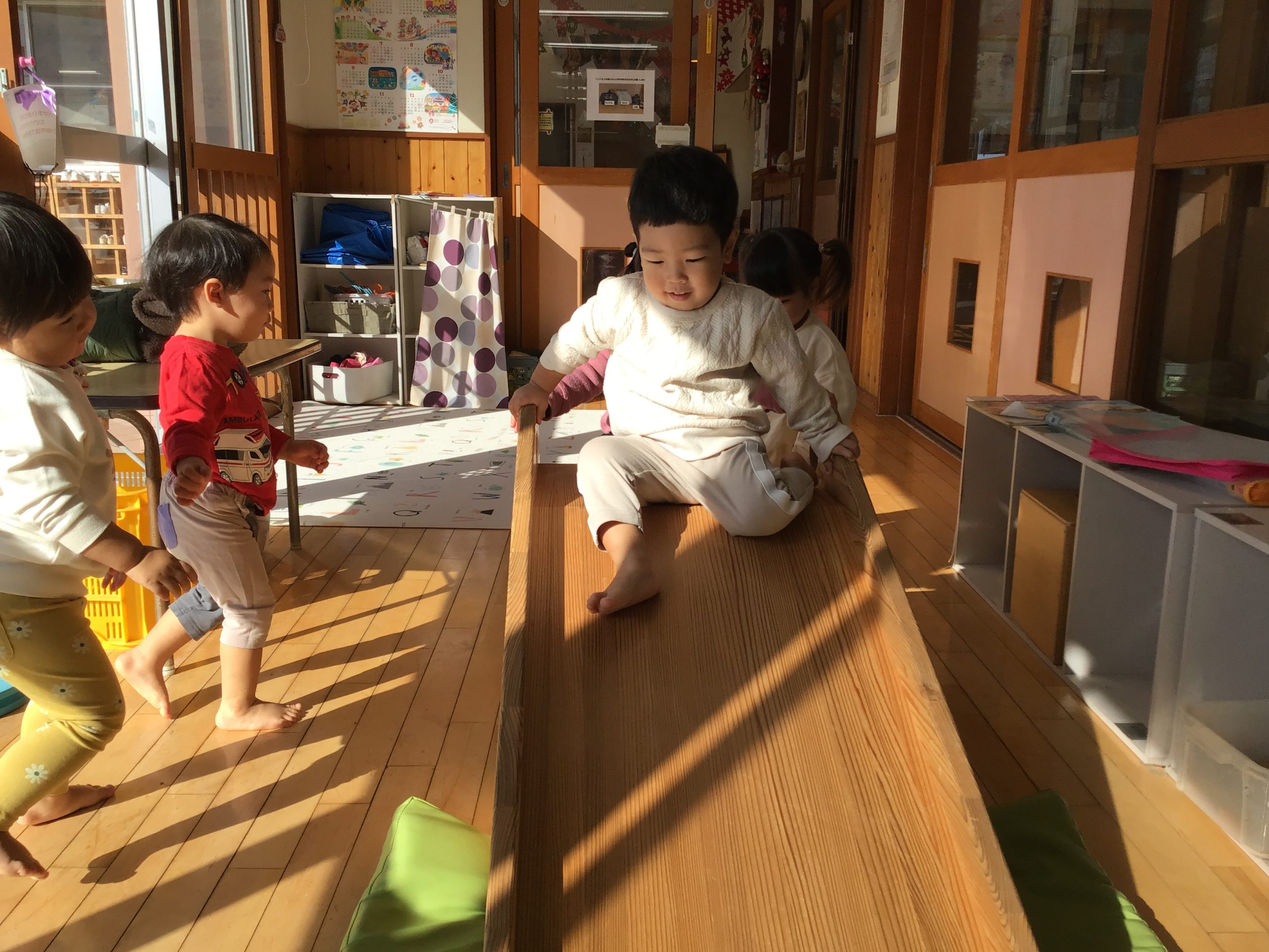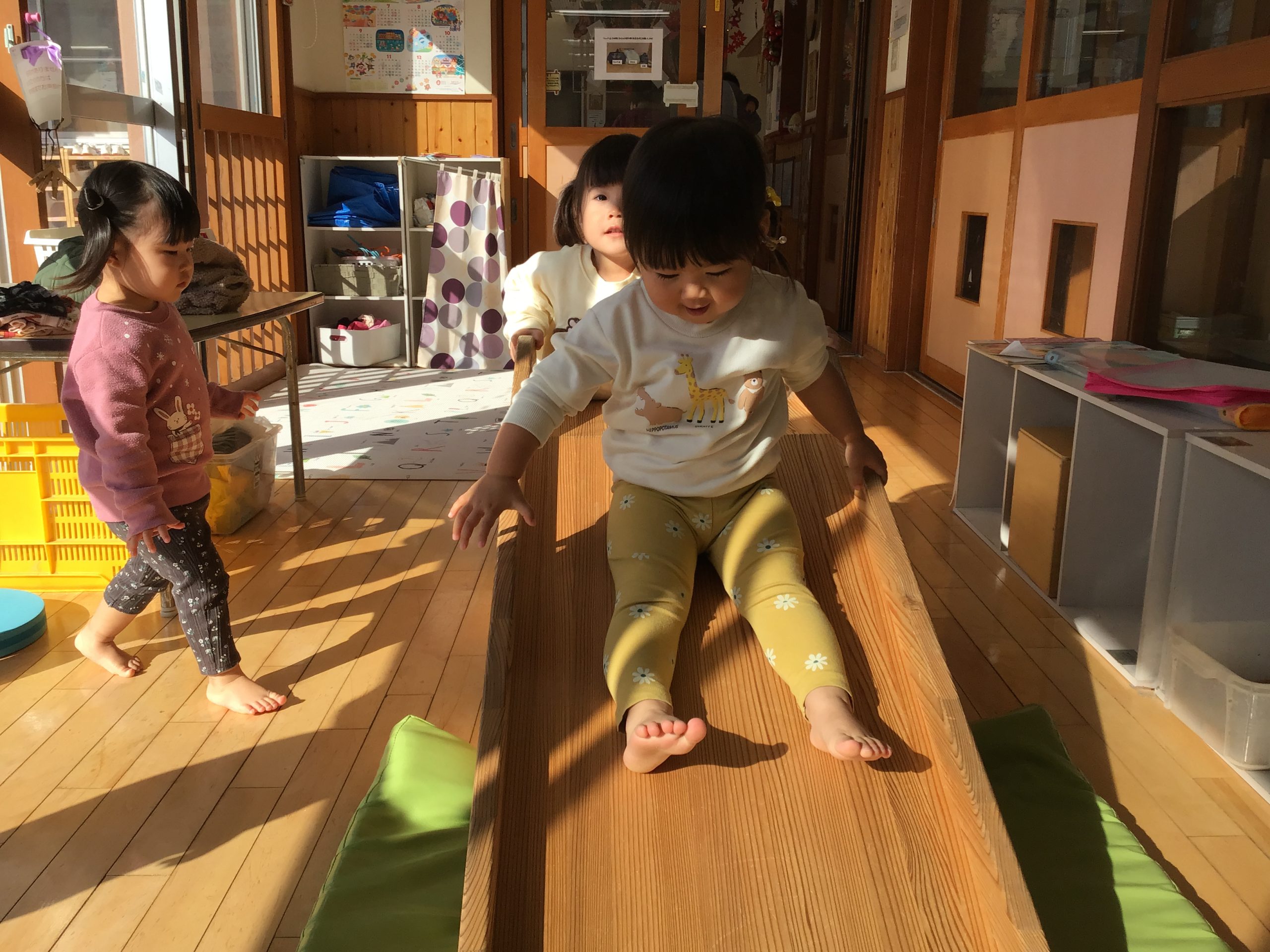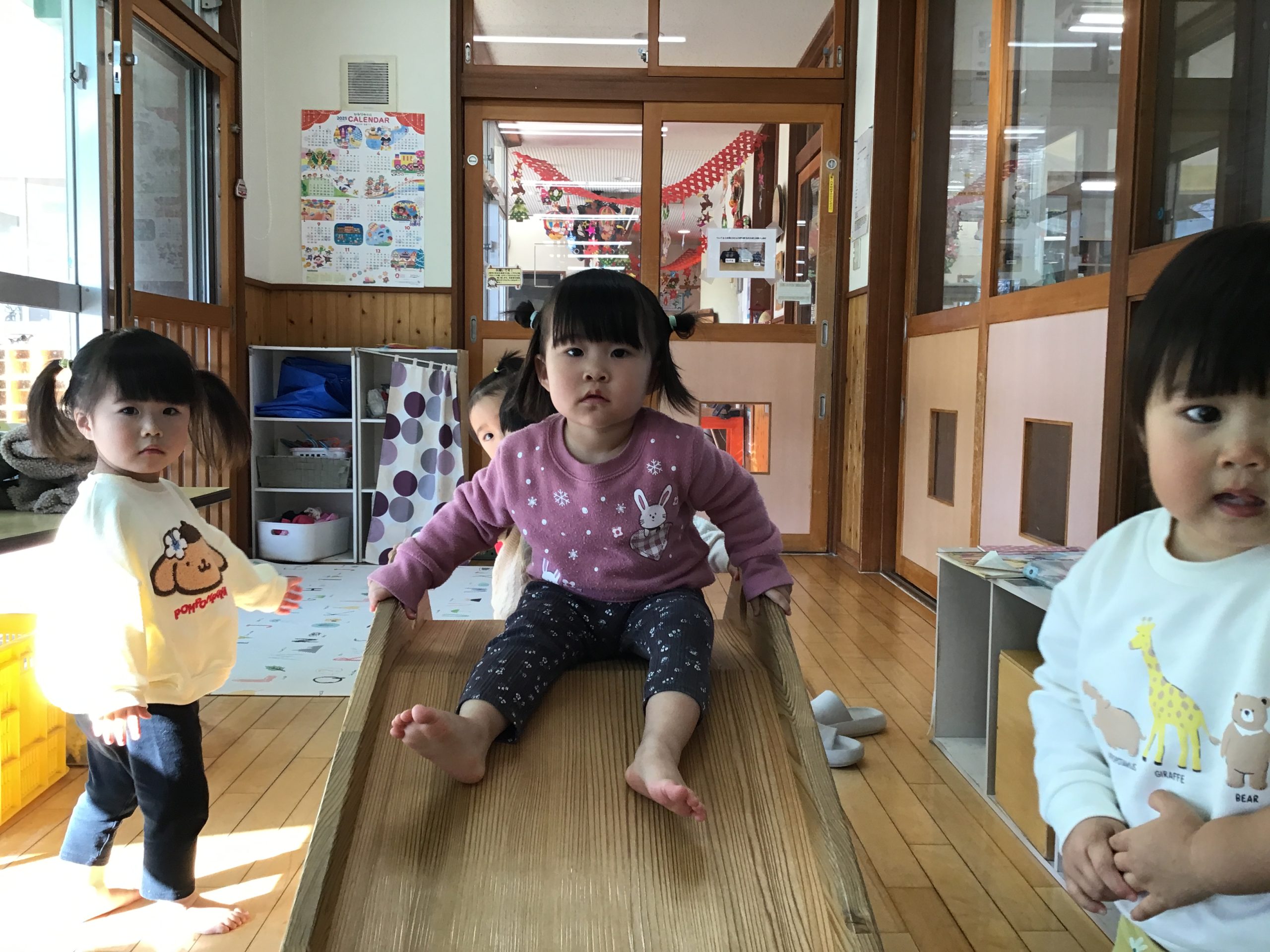 今日は、木製の滑り台で遊びました🎶順番を守って楽しんで遊んでいましたよ!!また、椅子に座ってバスごっこもしていました✨