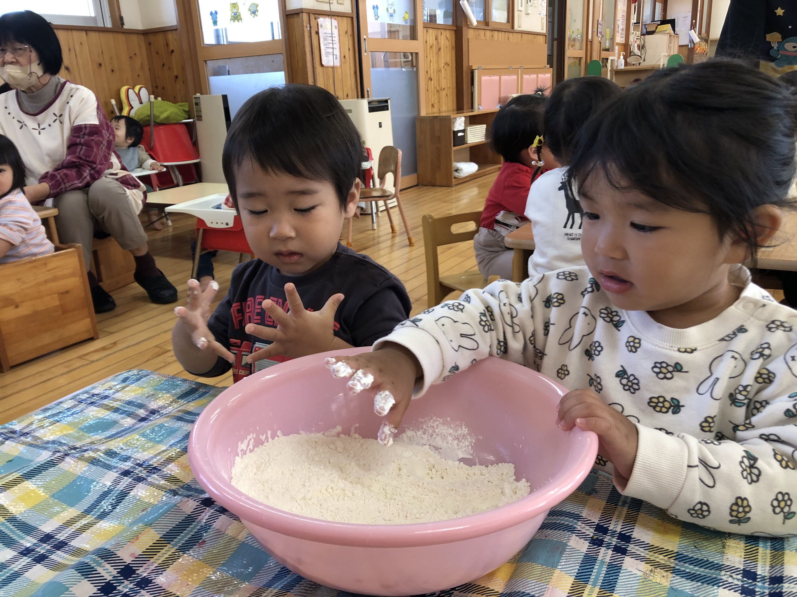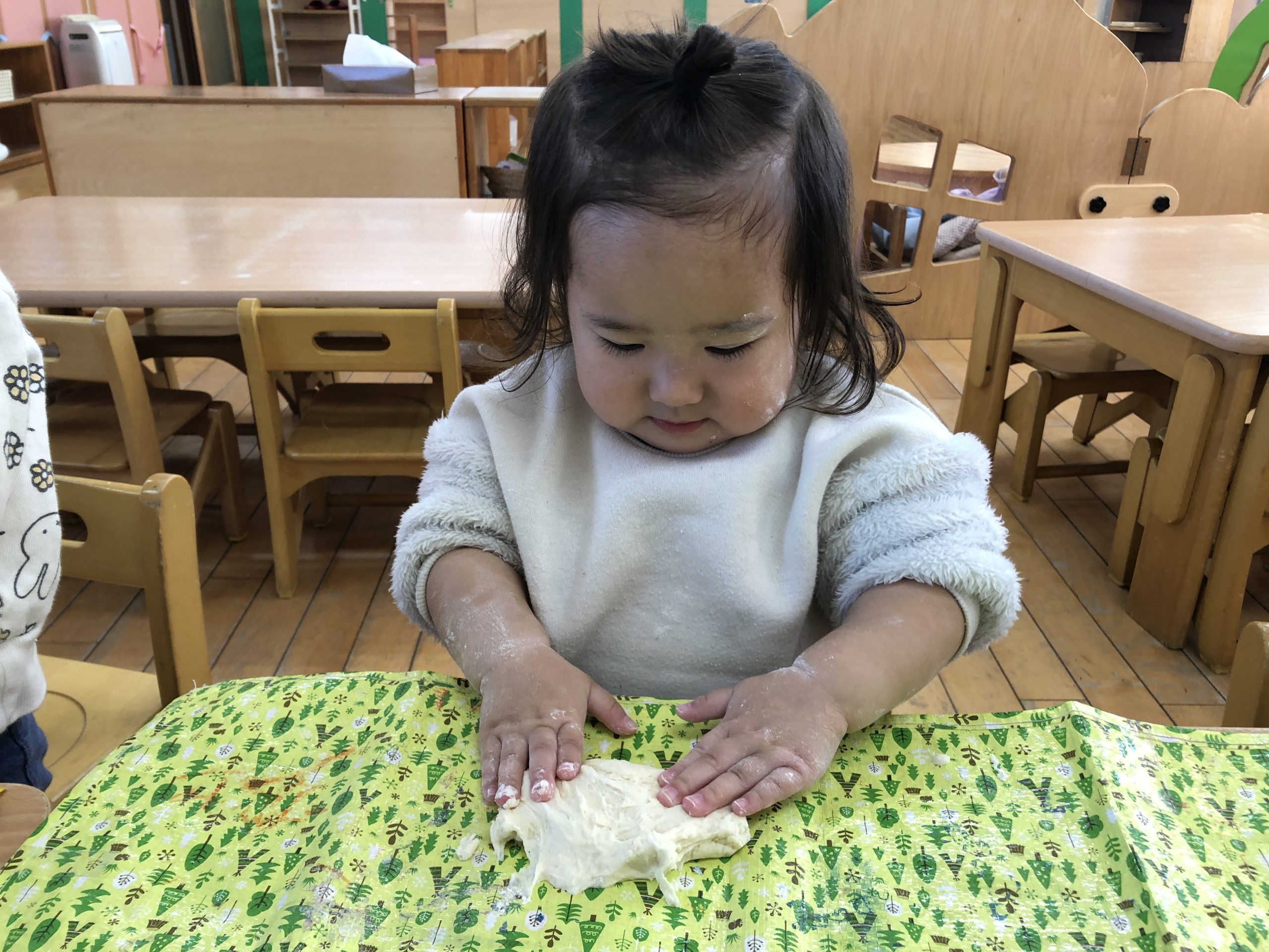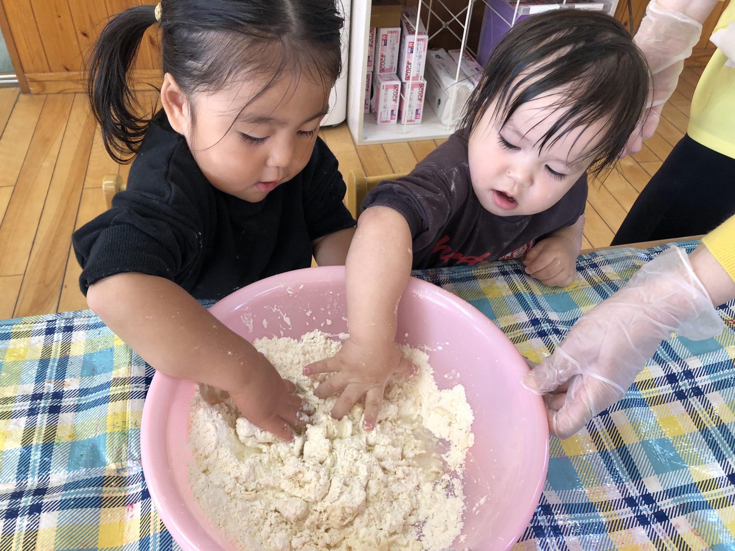 今日は小麦粉粘土遊びをしました!サラサラとベトベトの感触の違いを触って確かめましたよ🎵