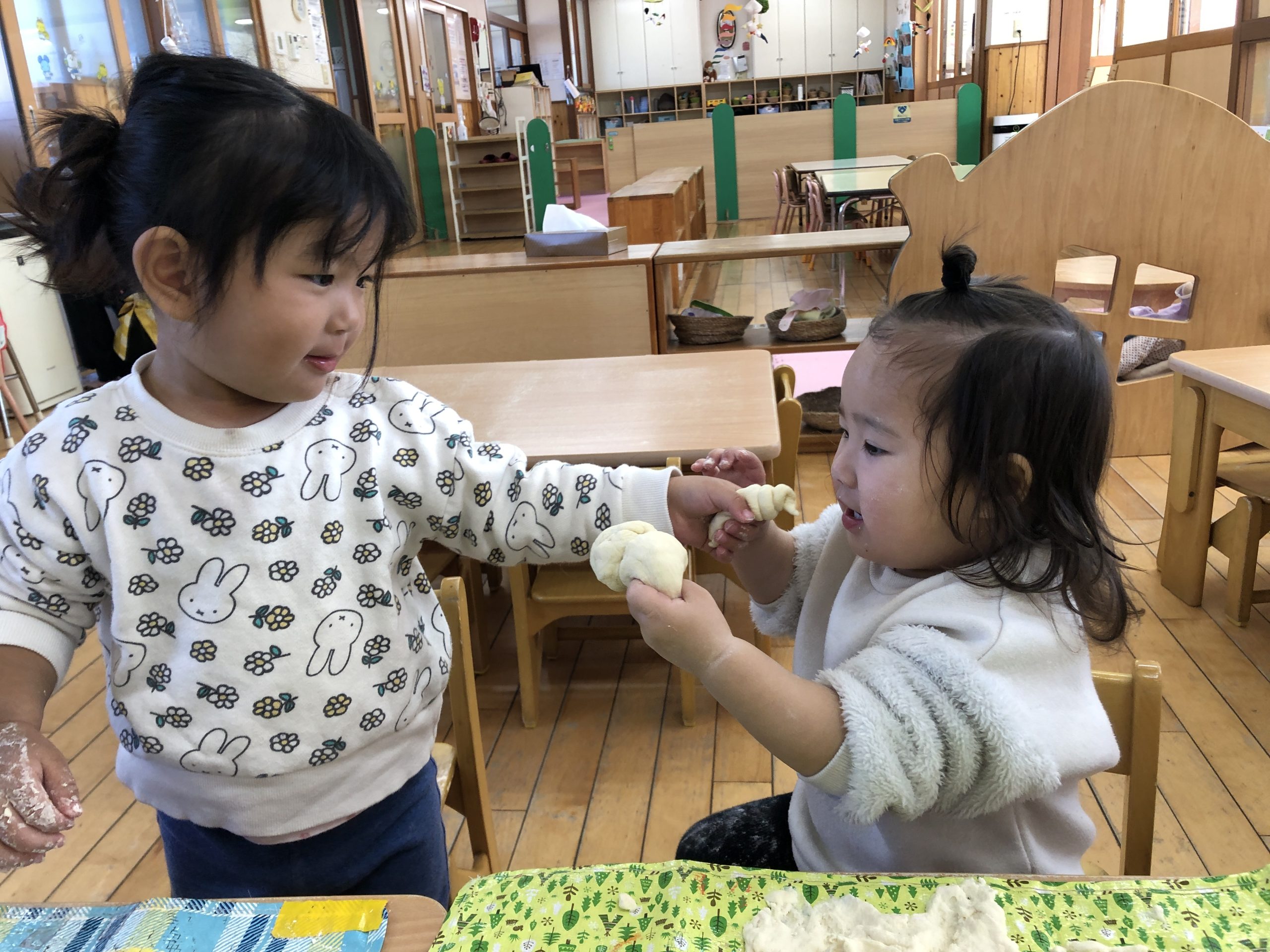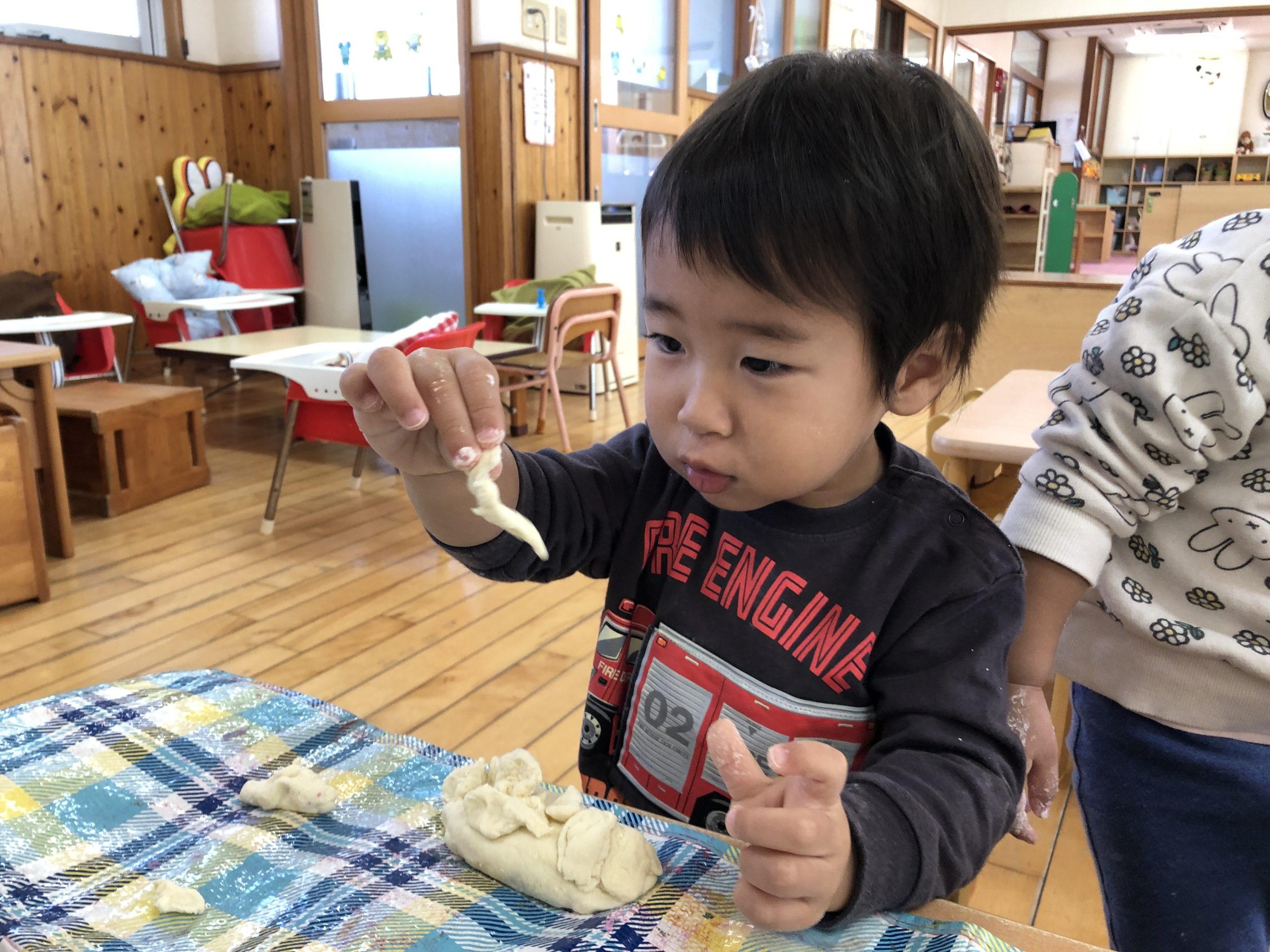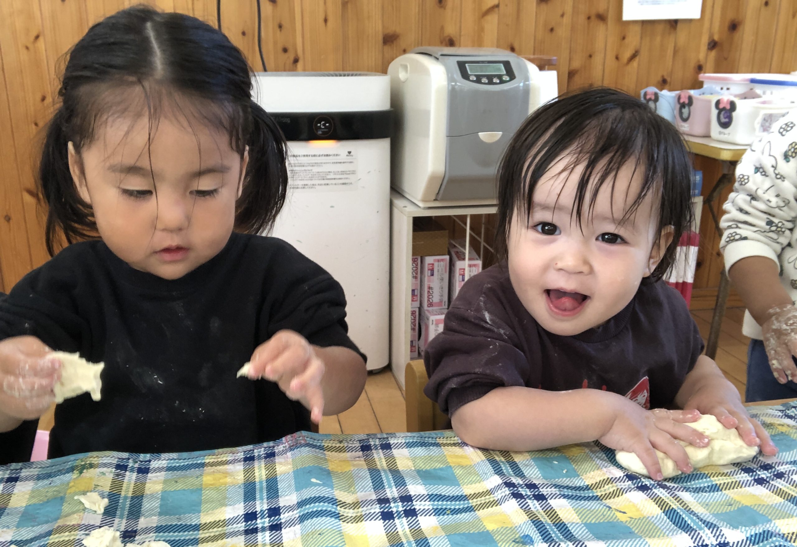 今日は小麦粉粘土遊びをしました!サラサラとベトベトの感触の違いを触って確かめましたよ🎵