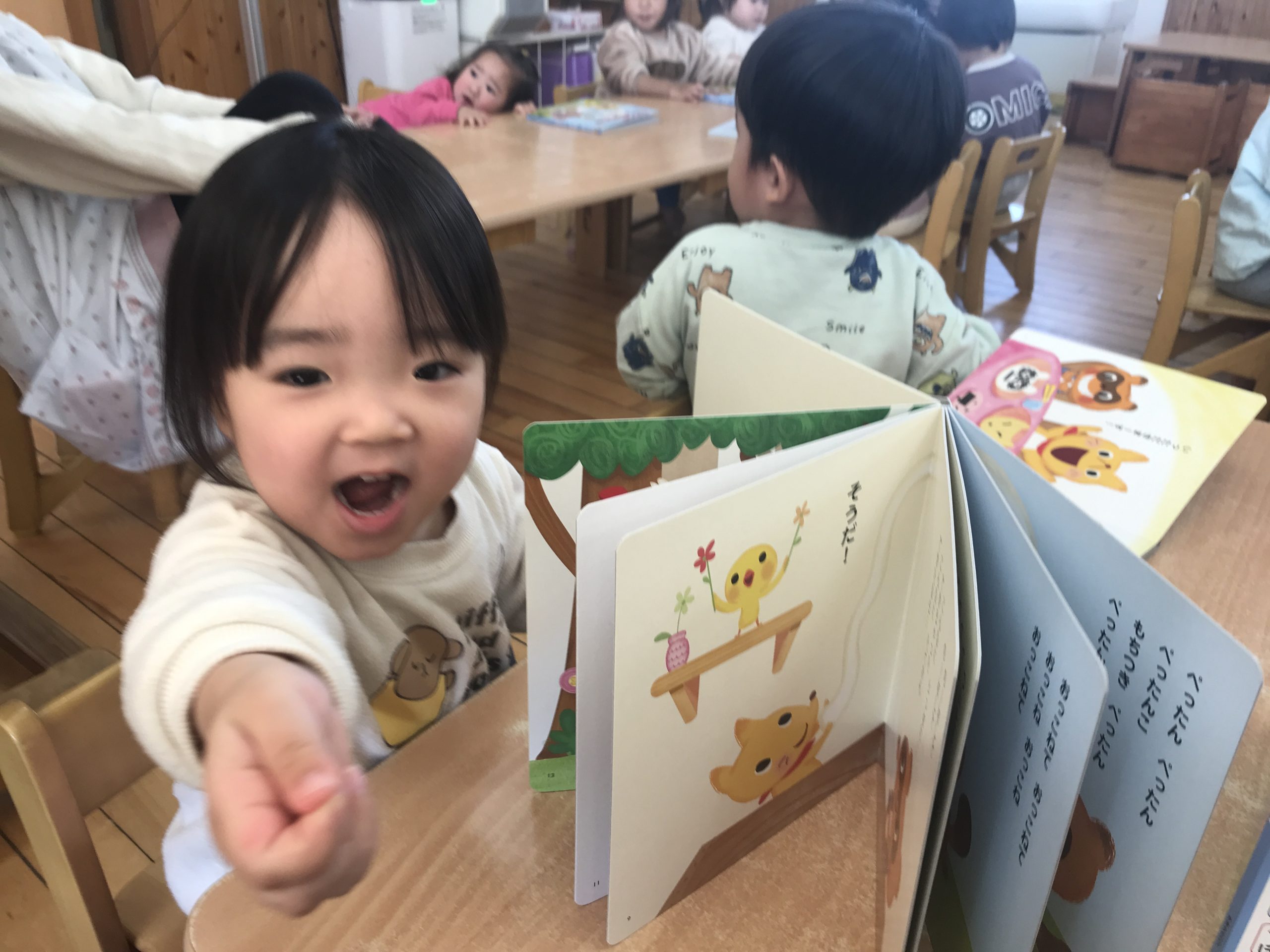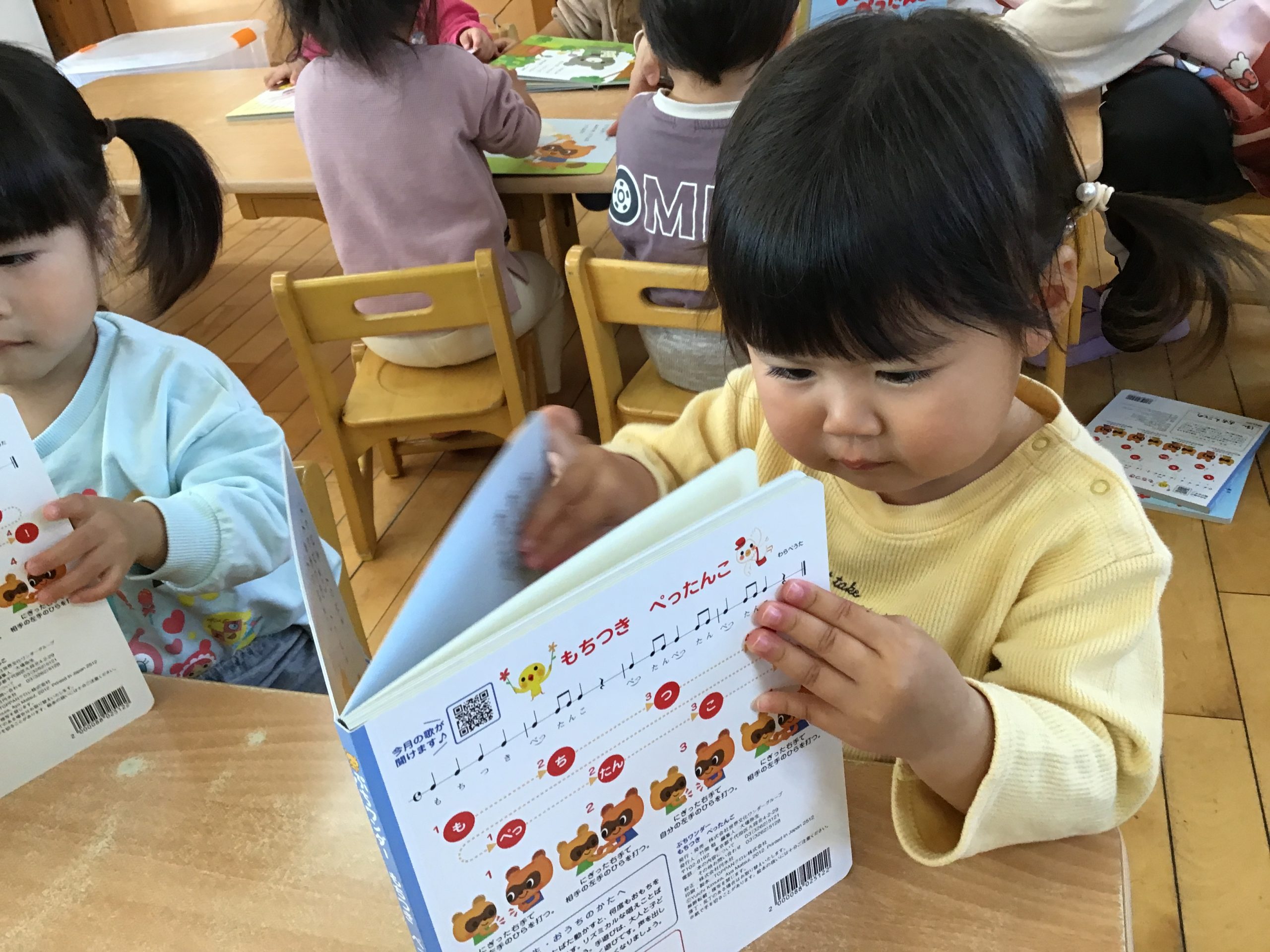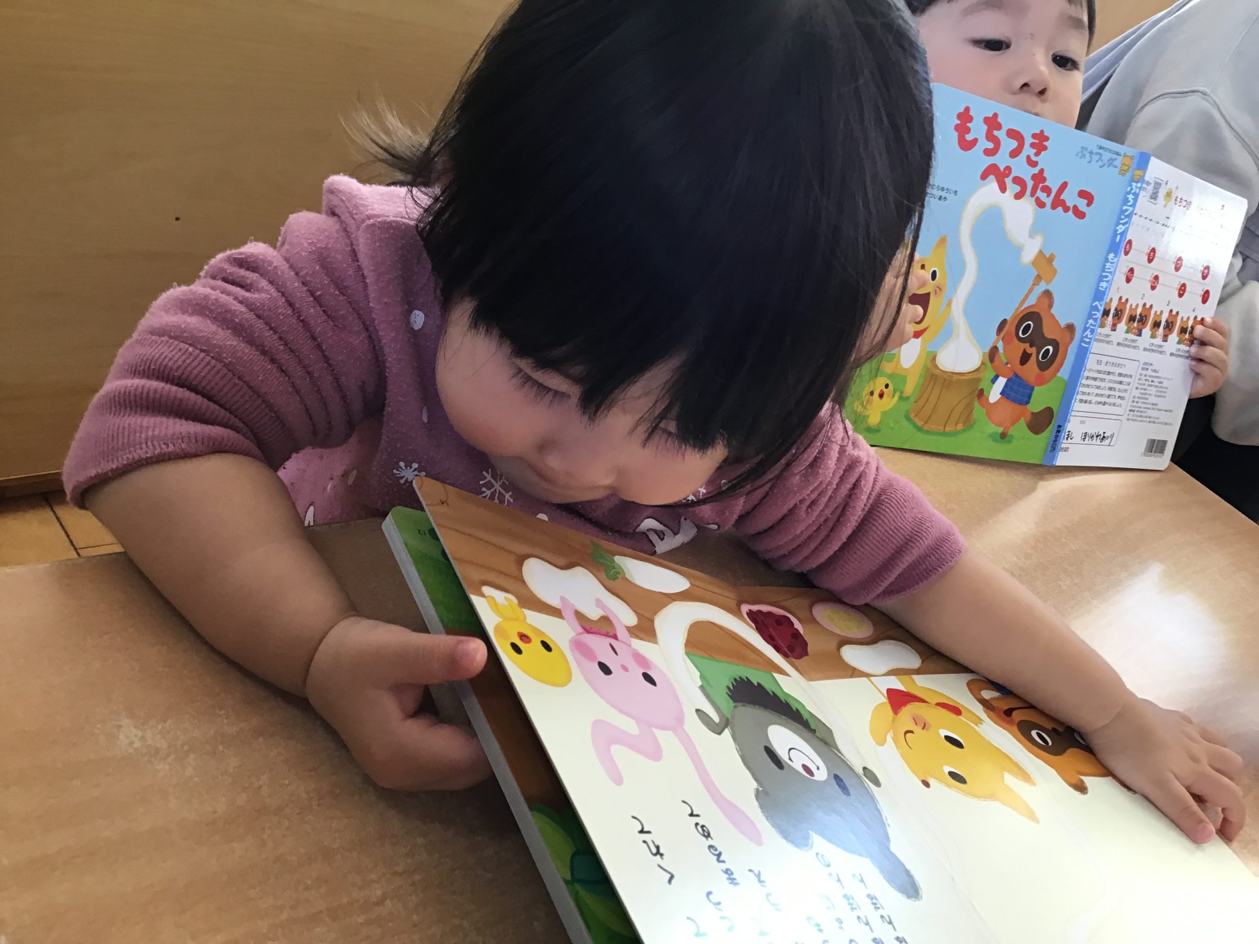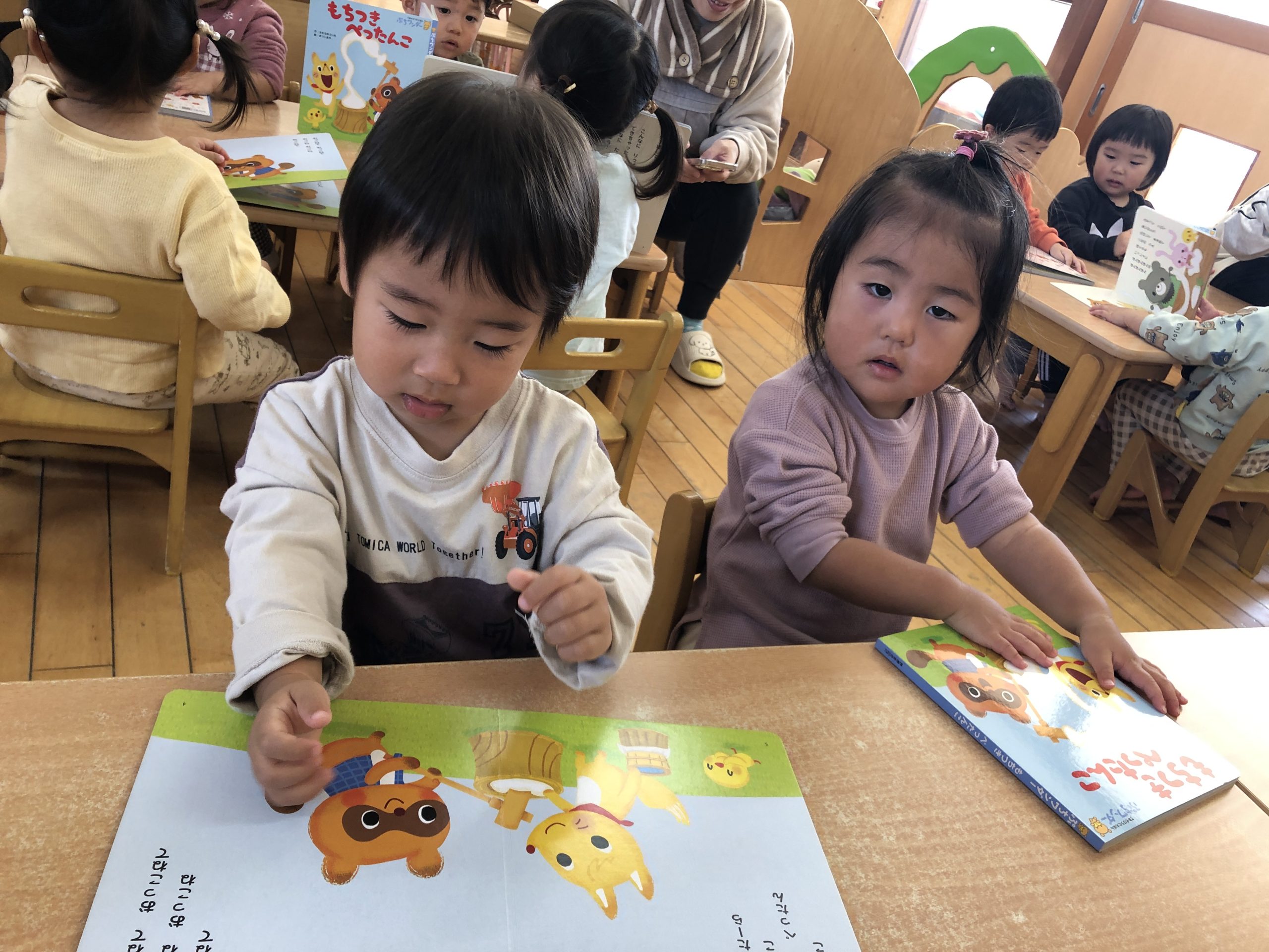 今日は月刊絵本「もちつきぺったんこ」の読み聞かせをしました!ぺったんぺったんとおしゃべりしながら楽しみましたよ♪