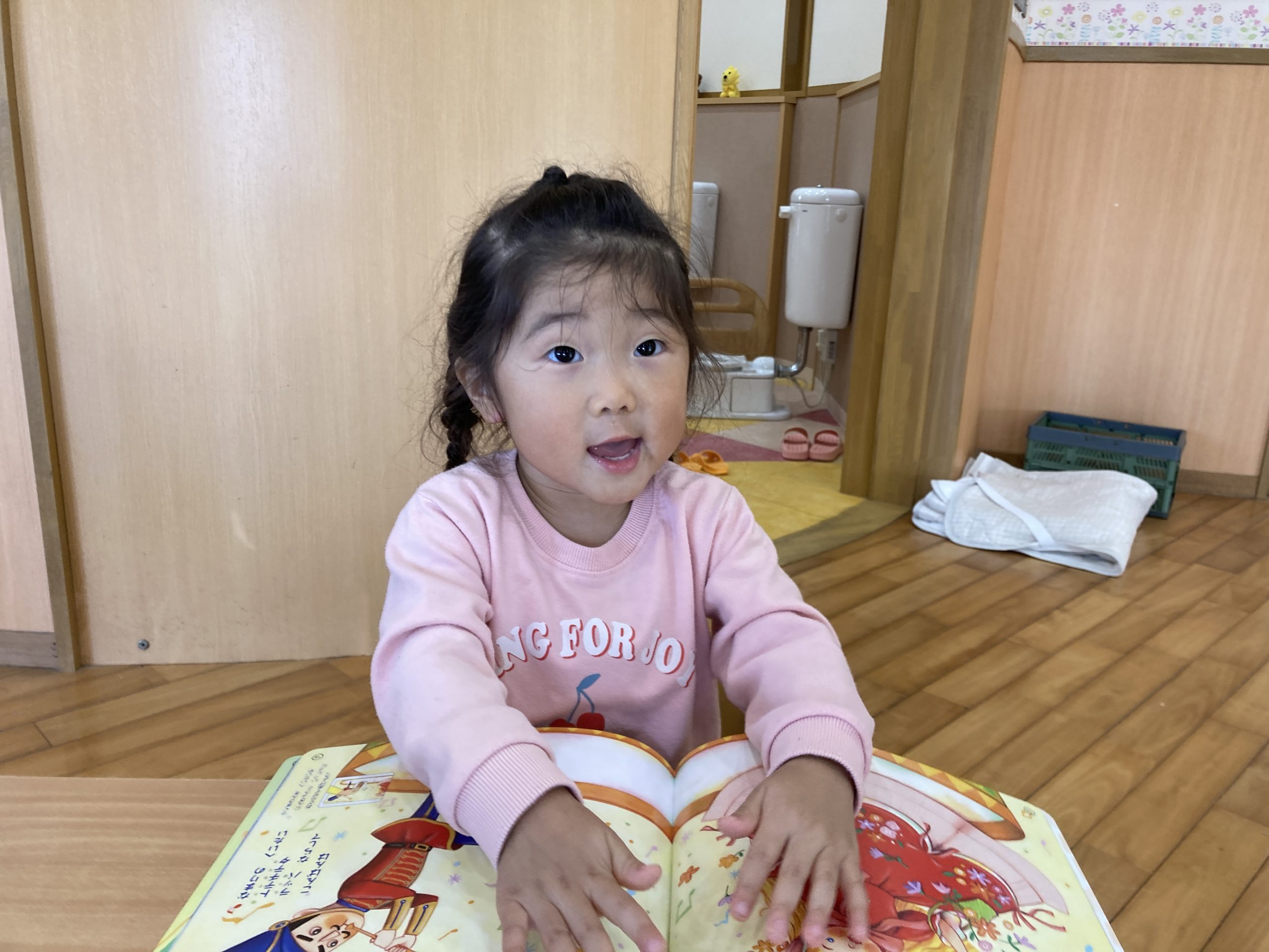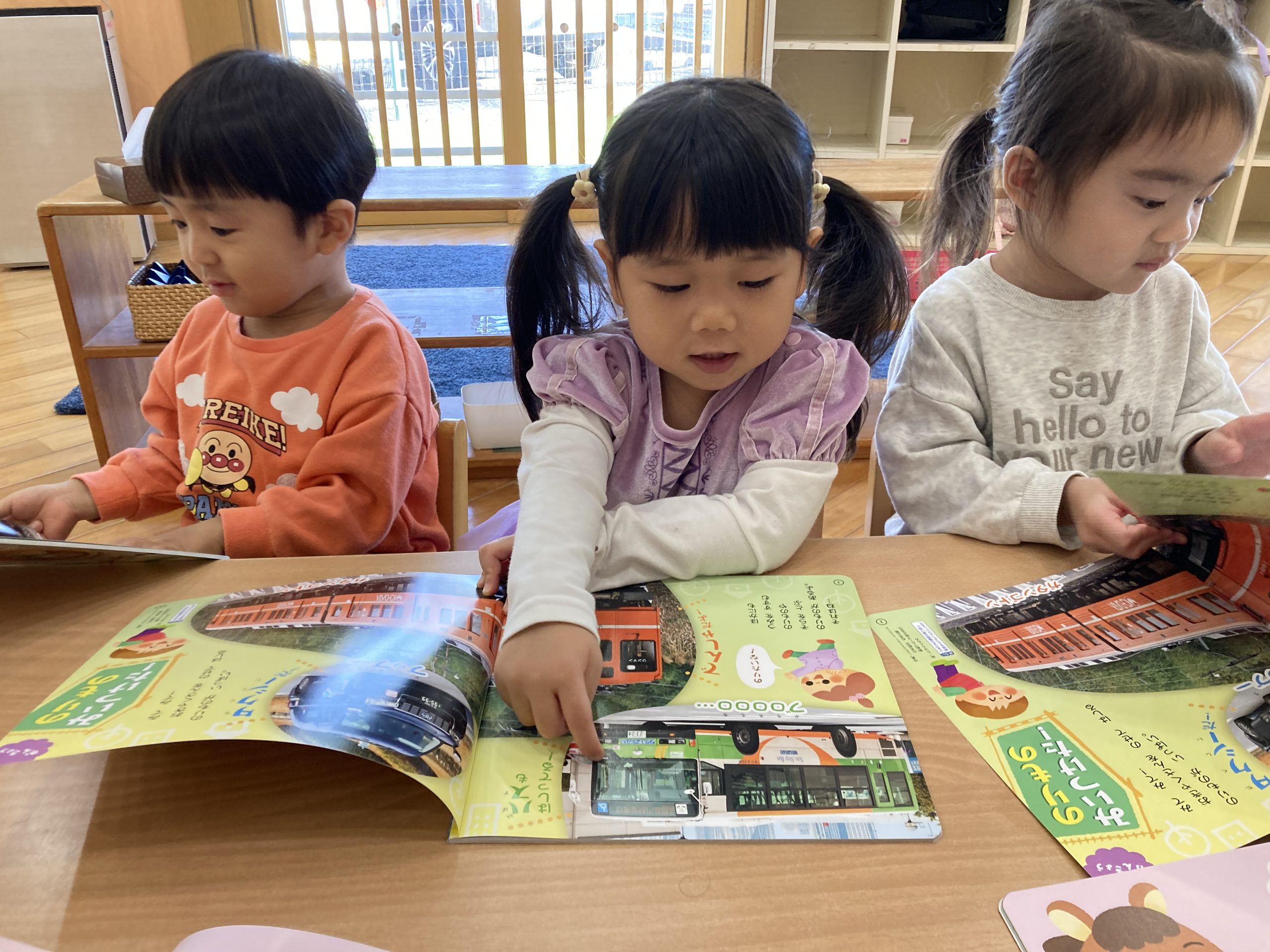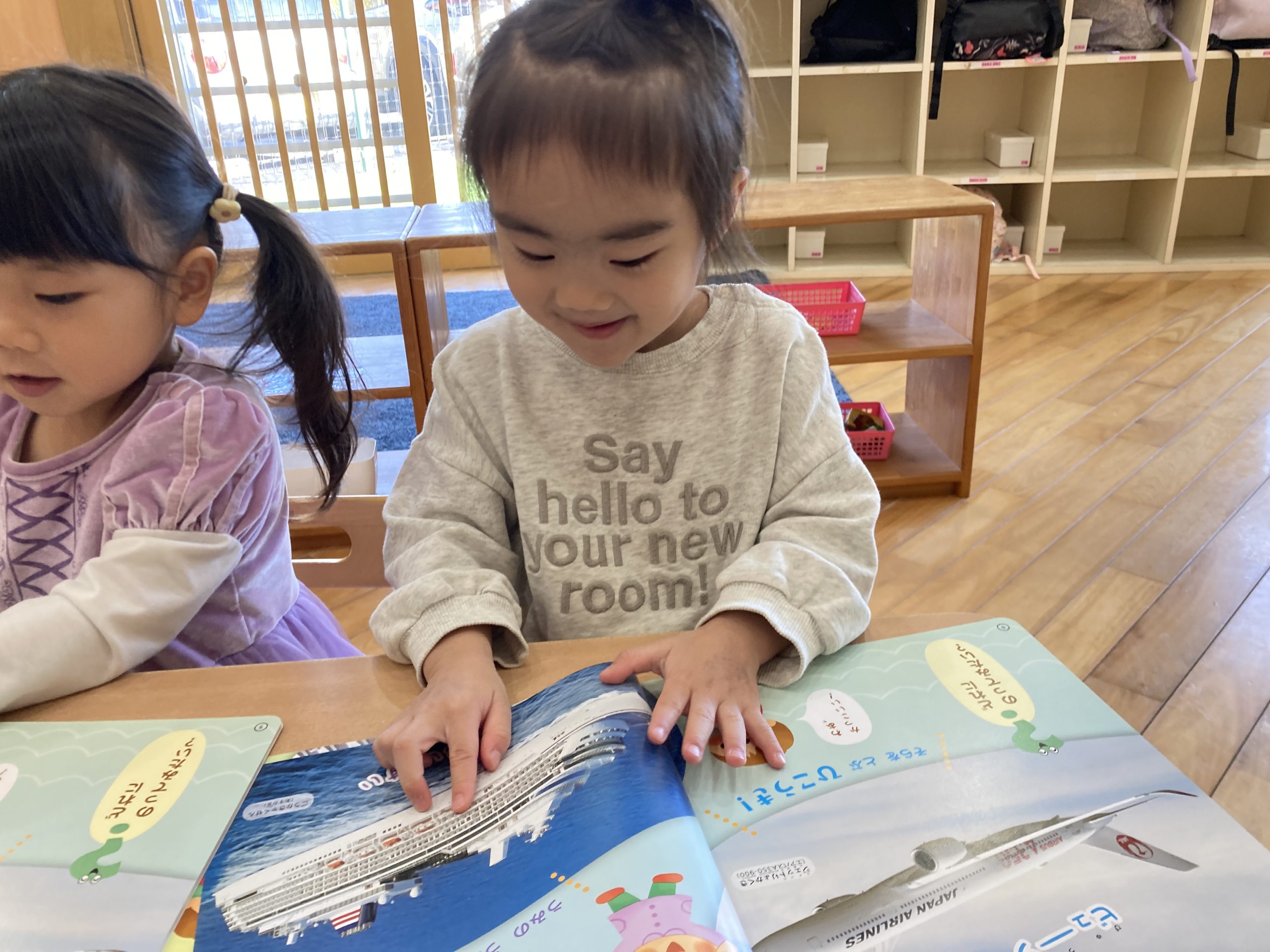 今日は、月刊絵本を読みました📚飛行機や船などの乗り物のシールを貼りながら、友だちとの会話を楽しんでいましたよ✨