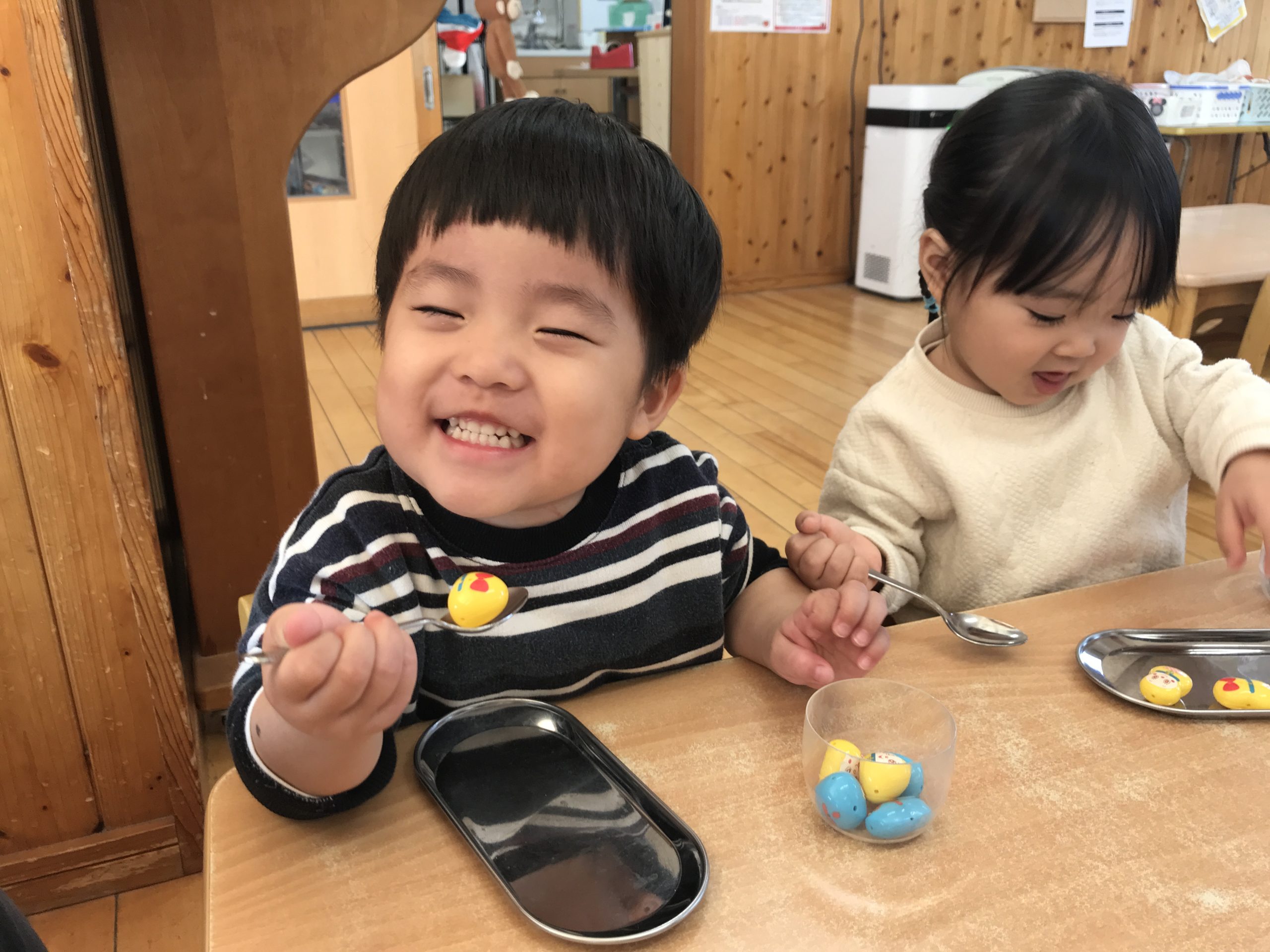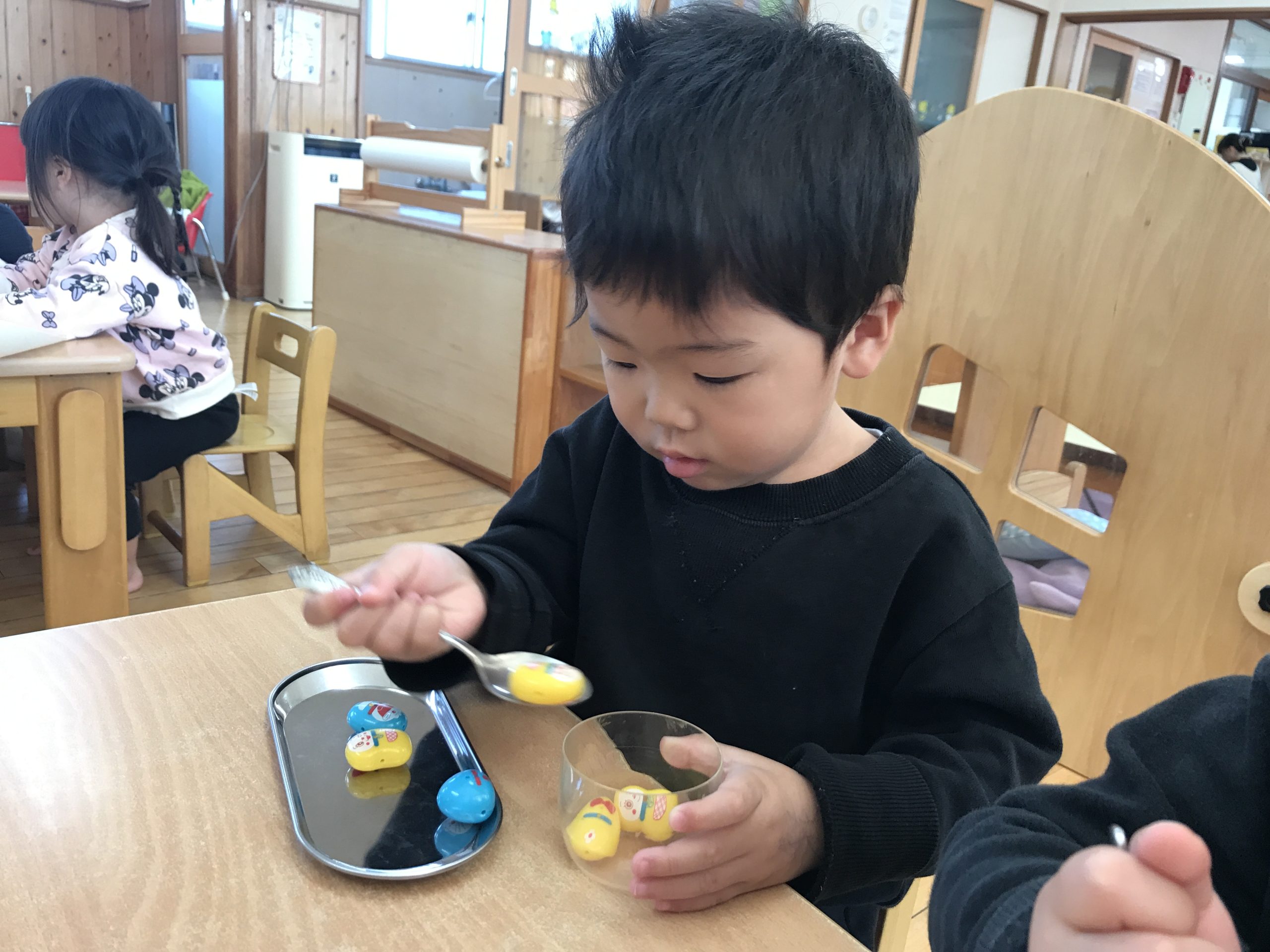 今日は豆うつしをしました🎵下握りで持って上手に豆をうつすことができていましたよ✨