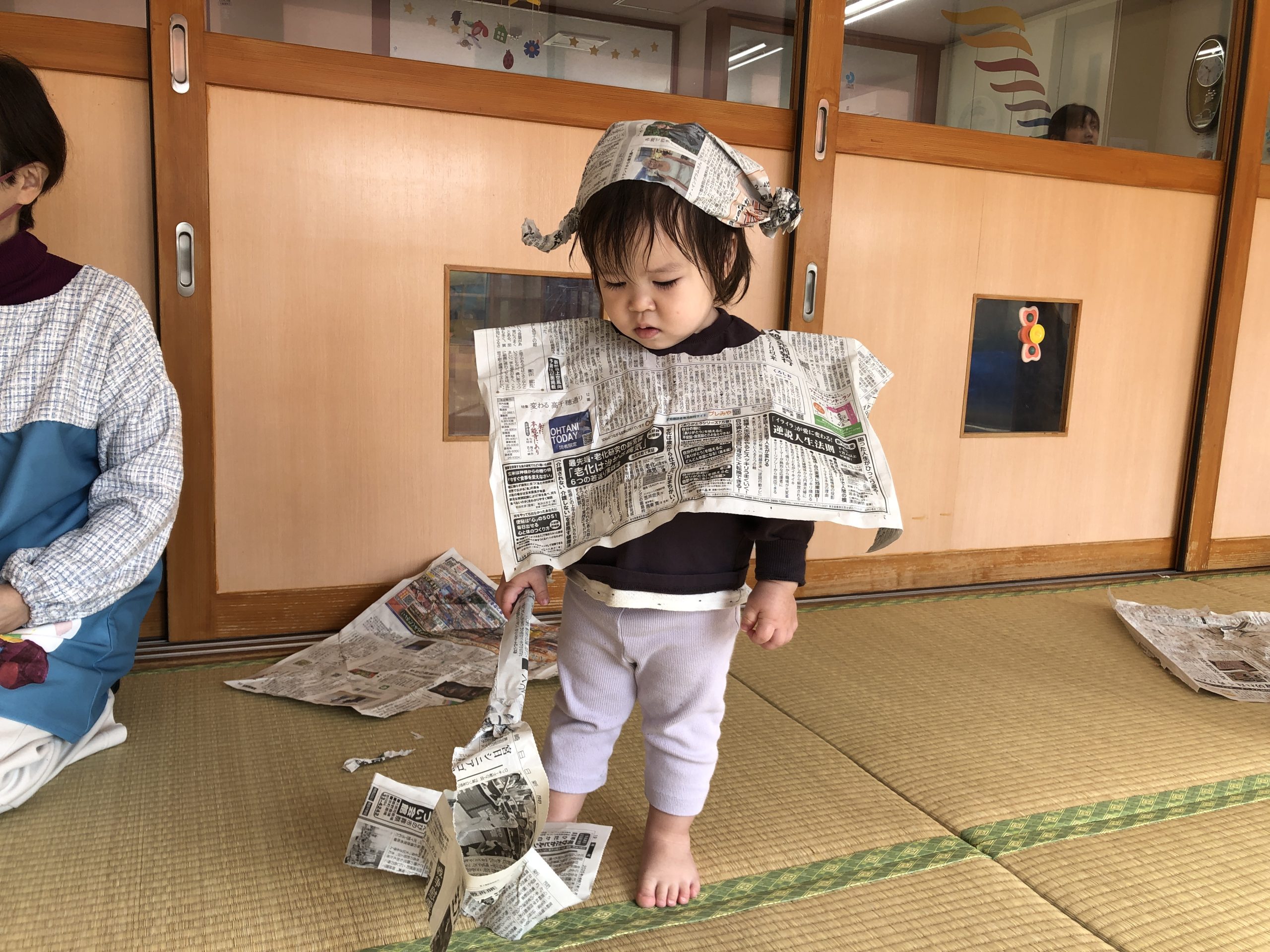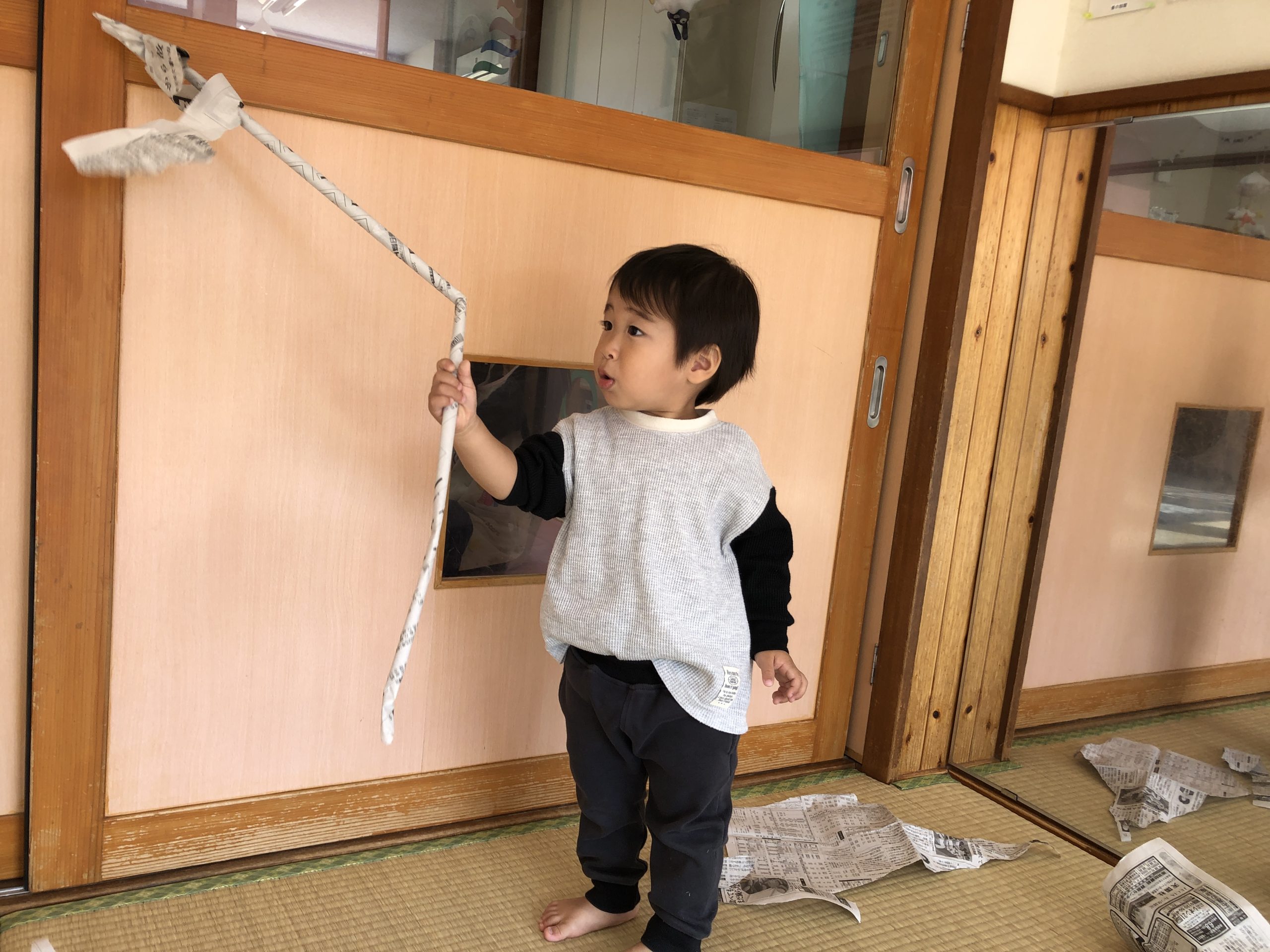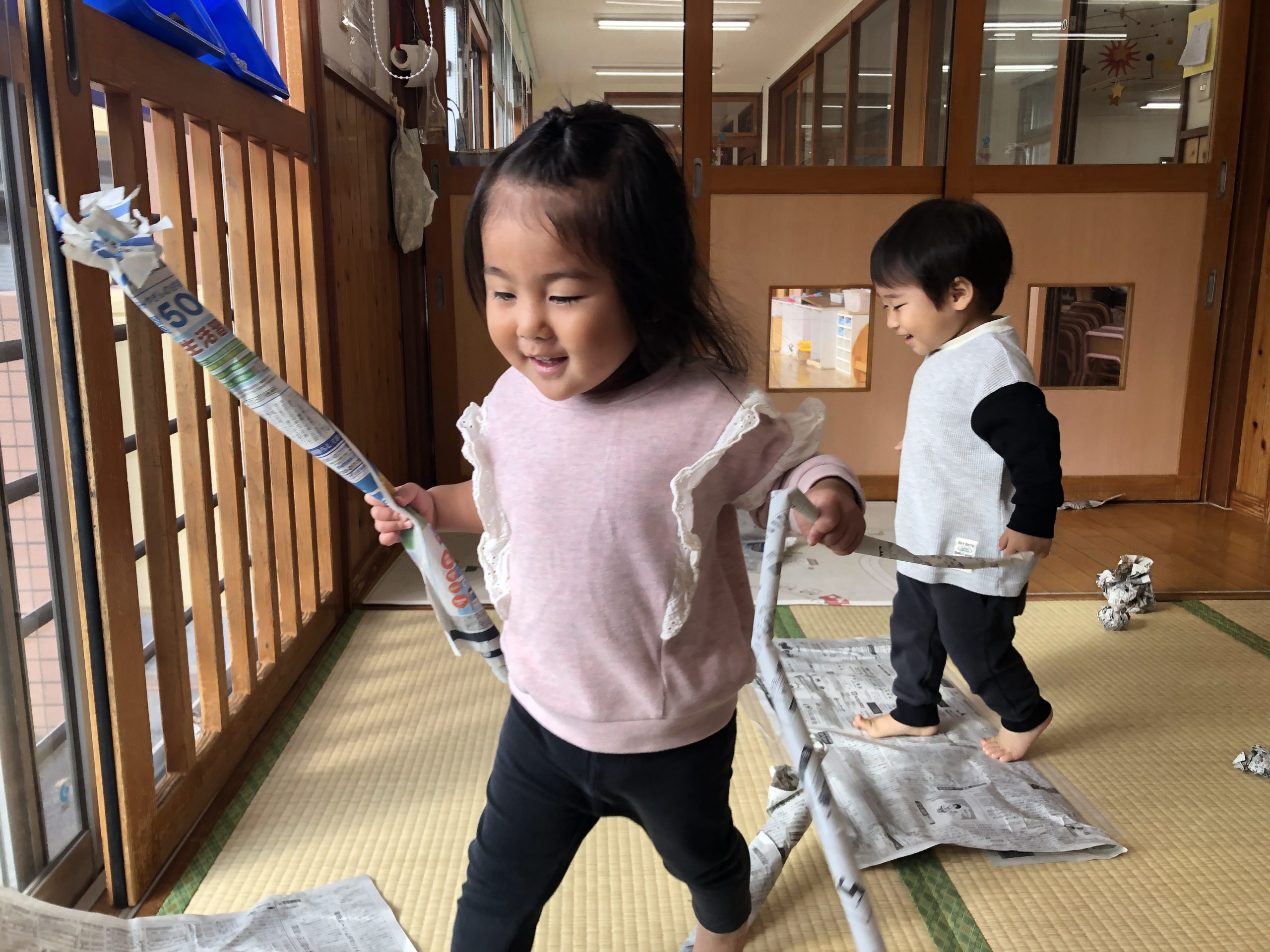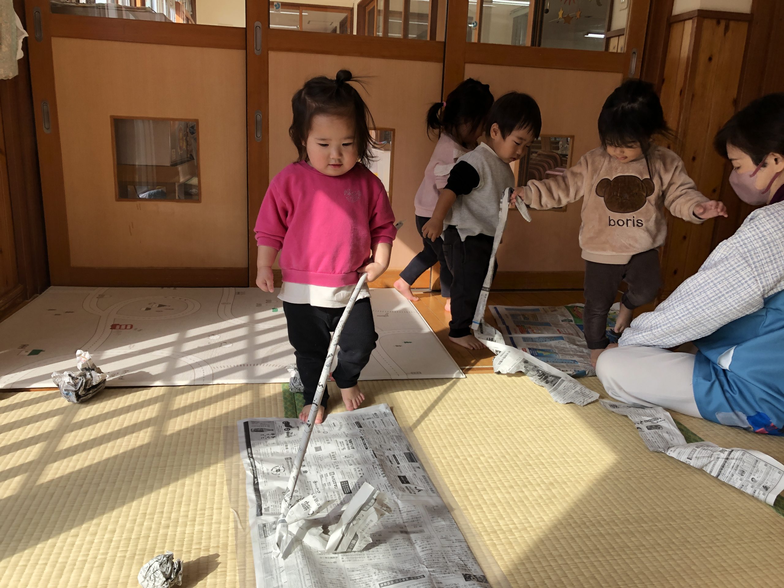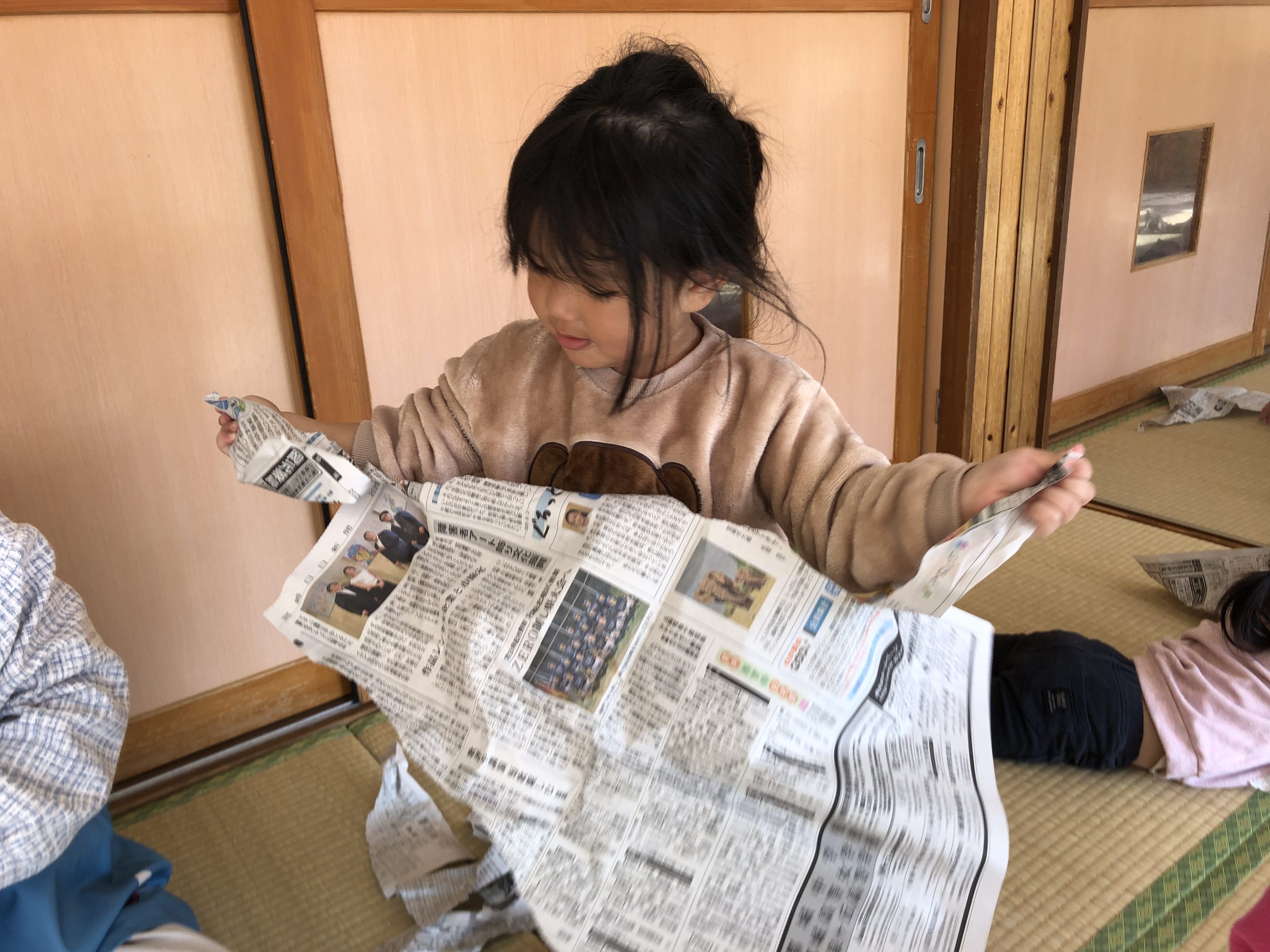 今日は新聞紙遊びをしました!ビリビリ破いたり、お掃除をしたりして楽しみましたよ🎵