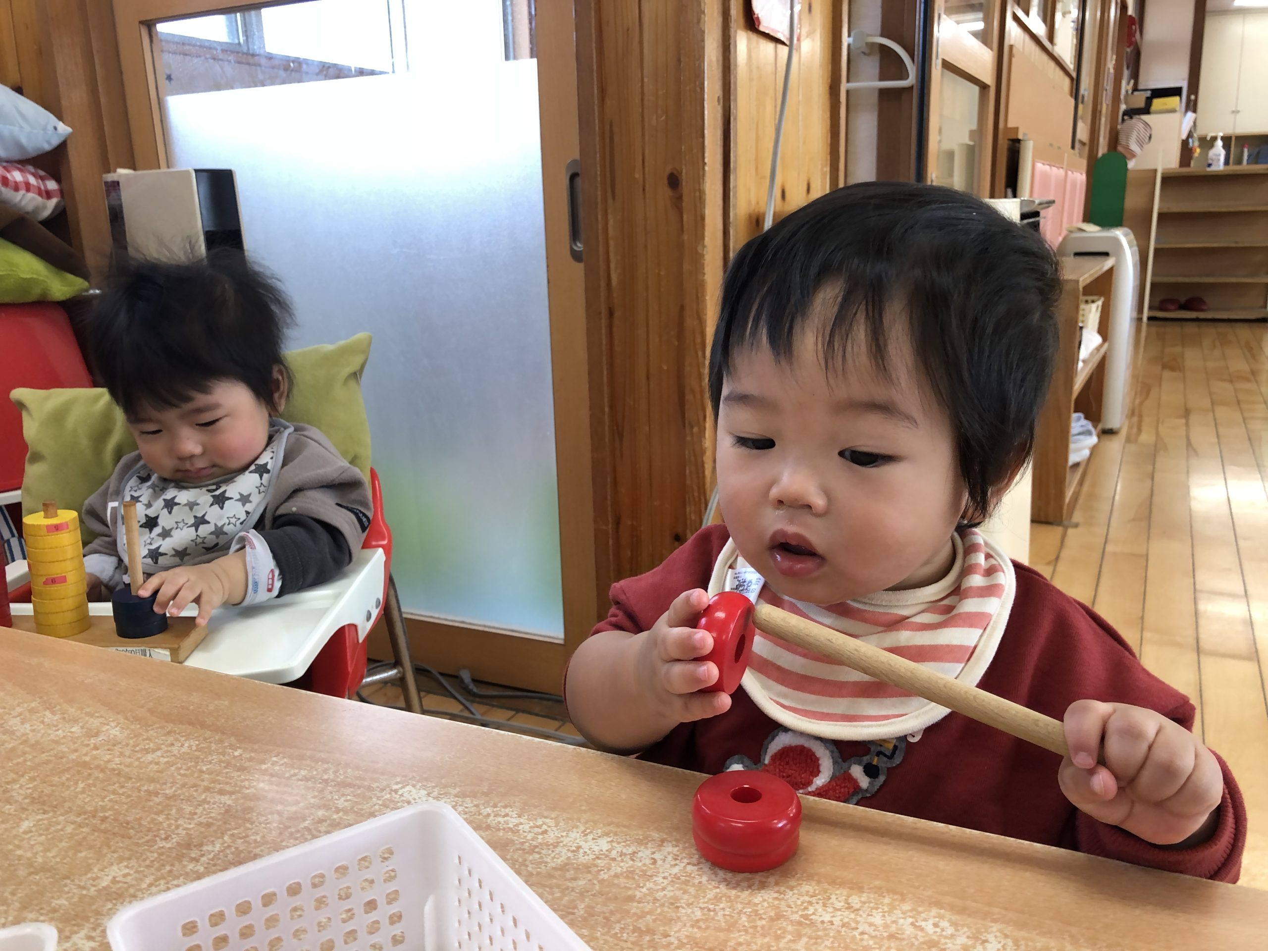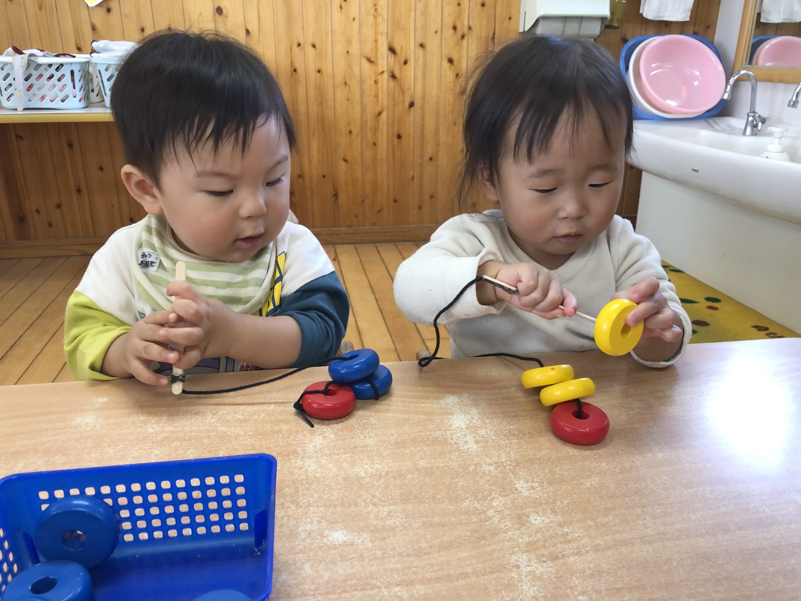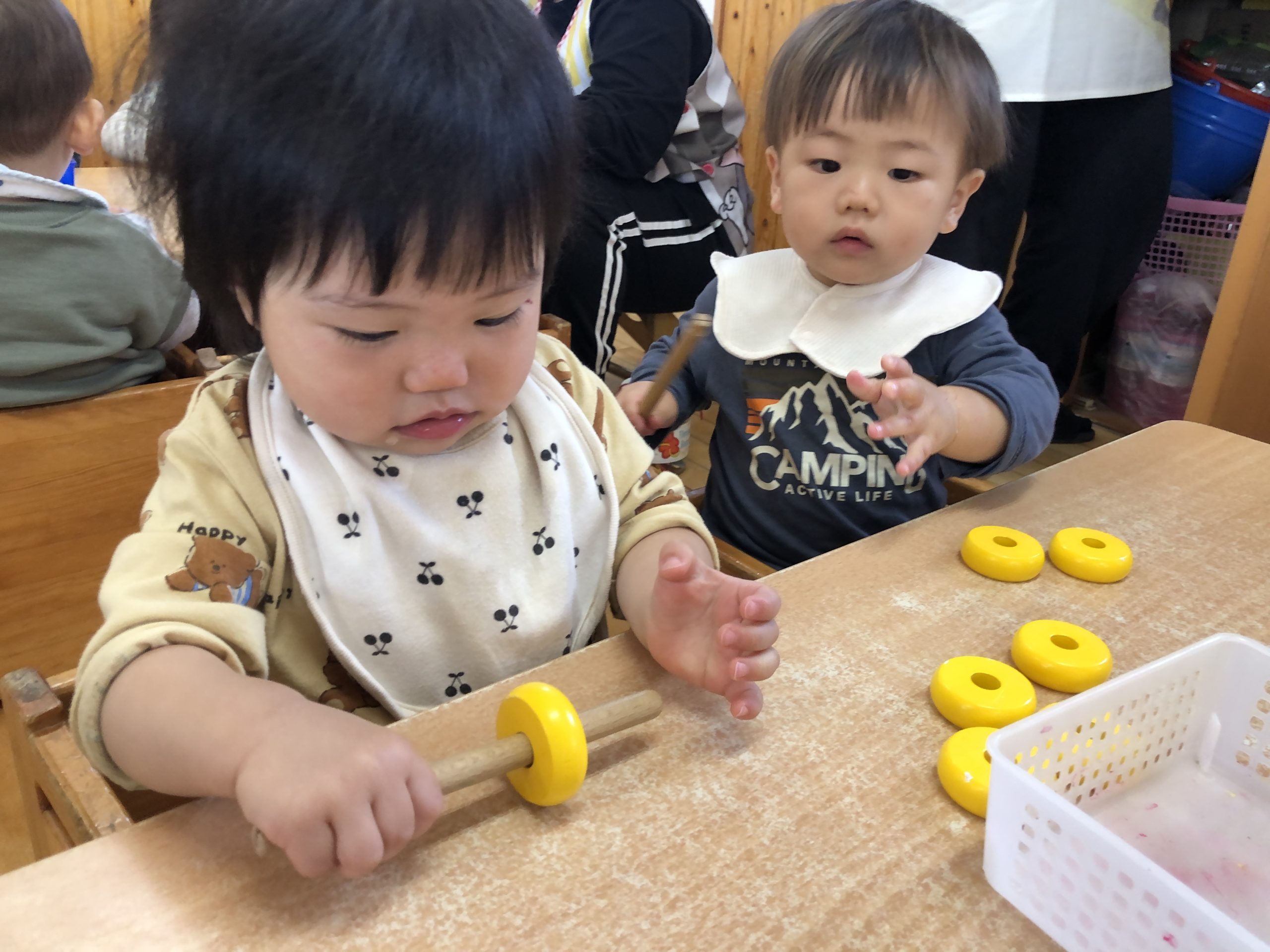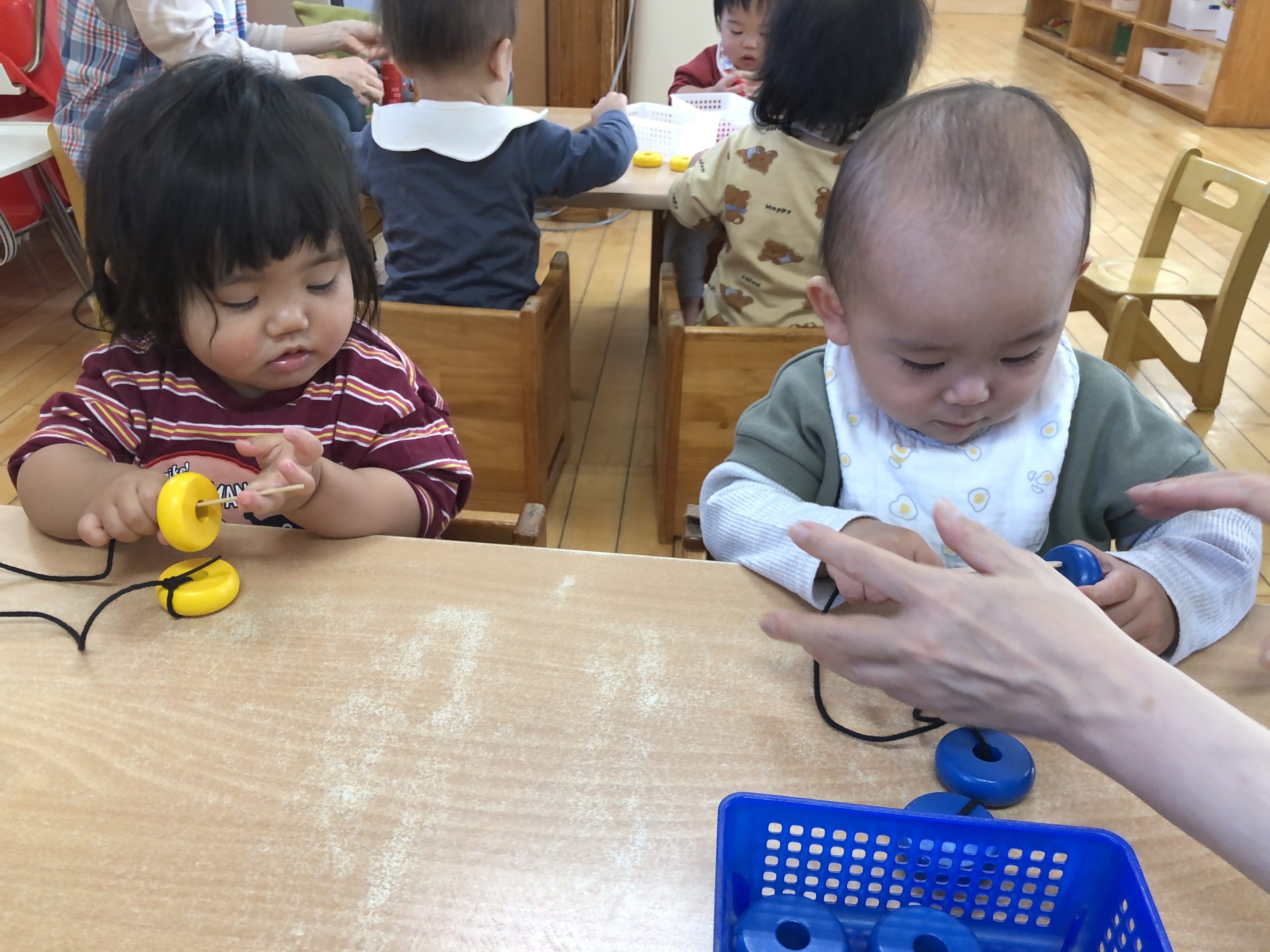 棒にたくさん輪っかを通していましたよ。紐通しは、輪っかを通し切るのがなかなか難しいようでしたが、一緒に通せると喜んでいました♪