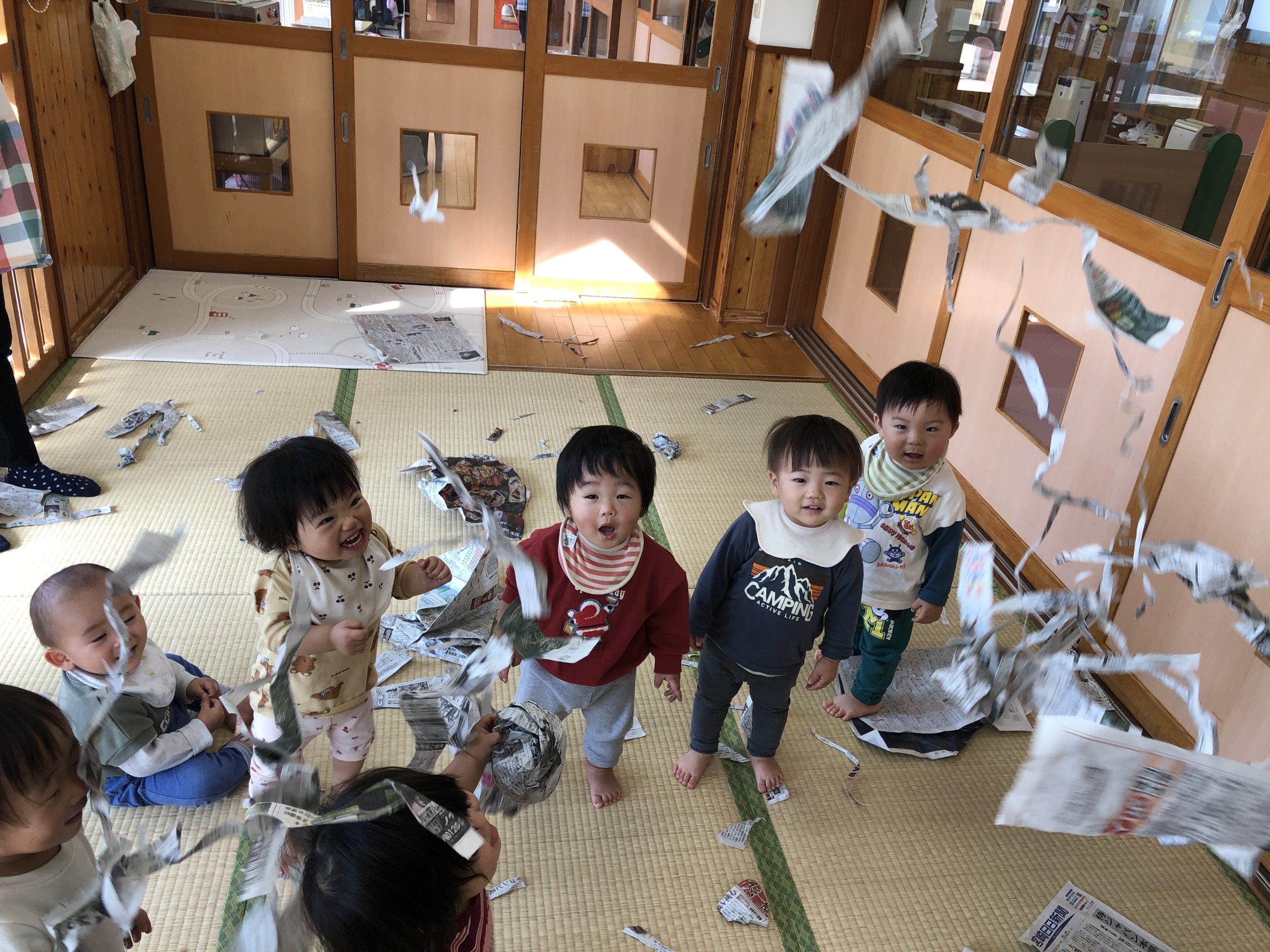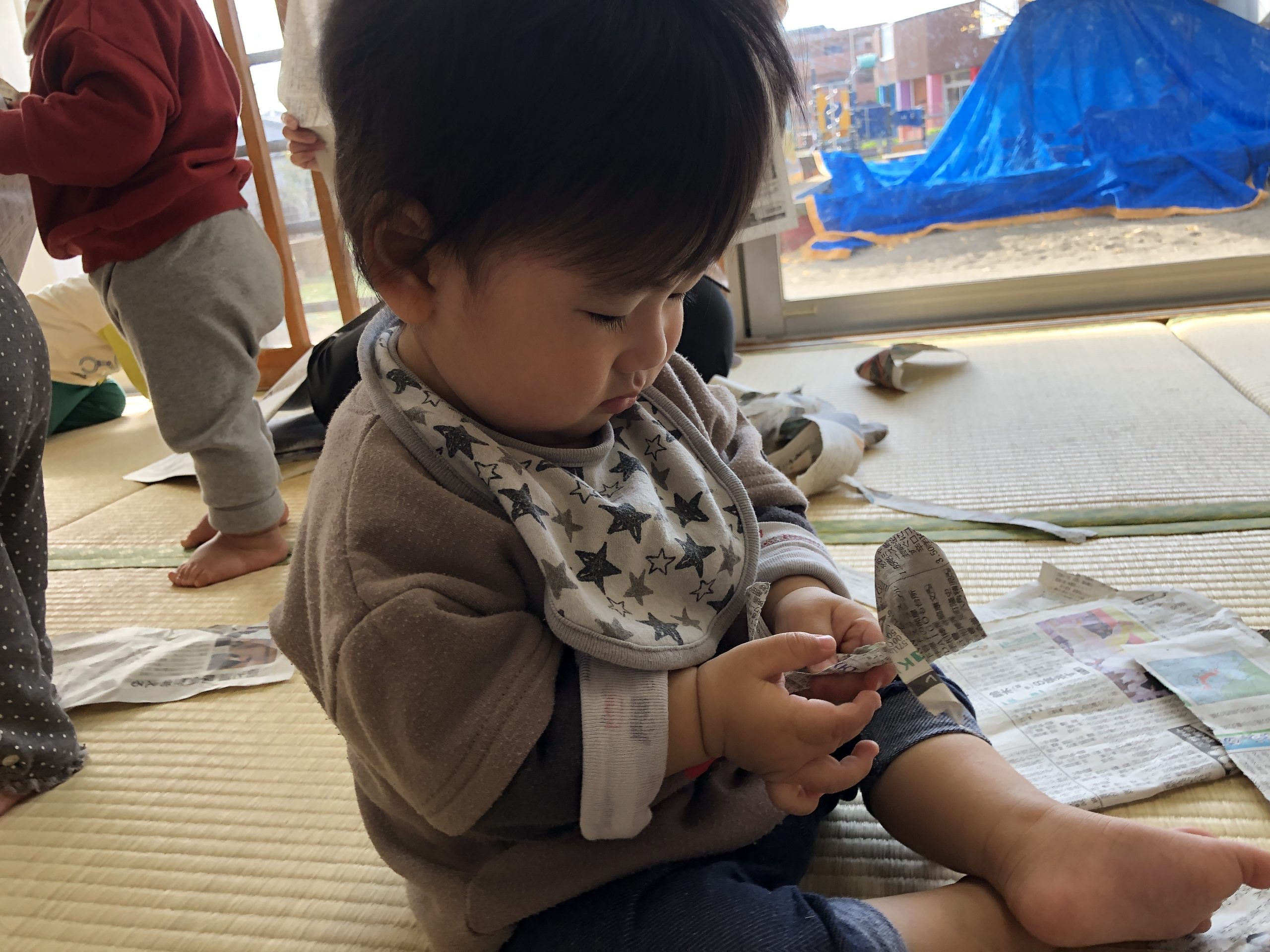 今日は、紐・棒通しあそびや新聞紙あそびをしました。
