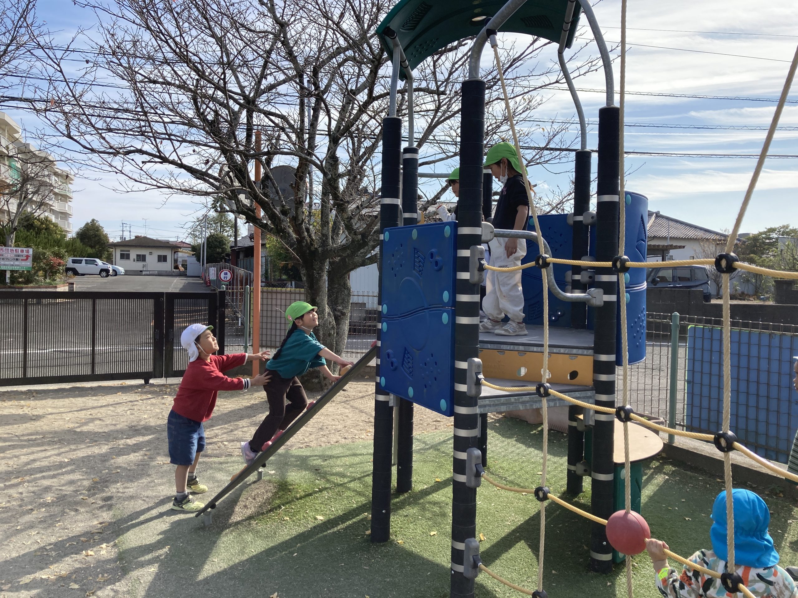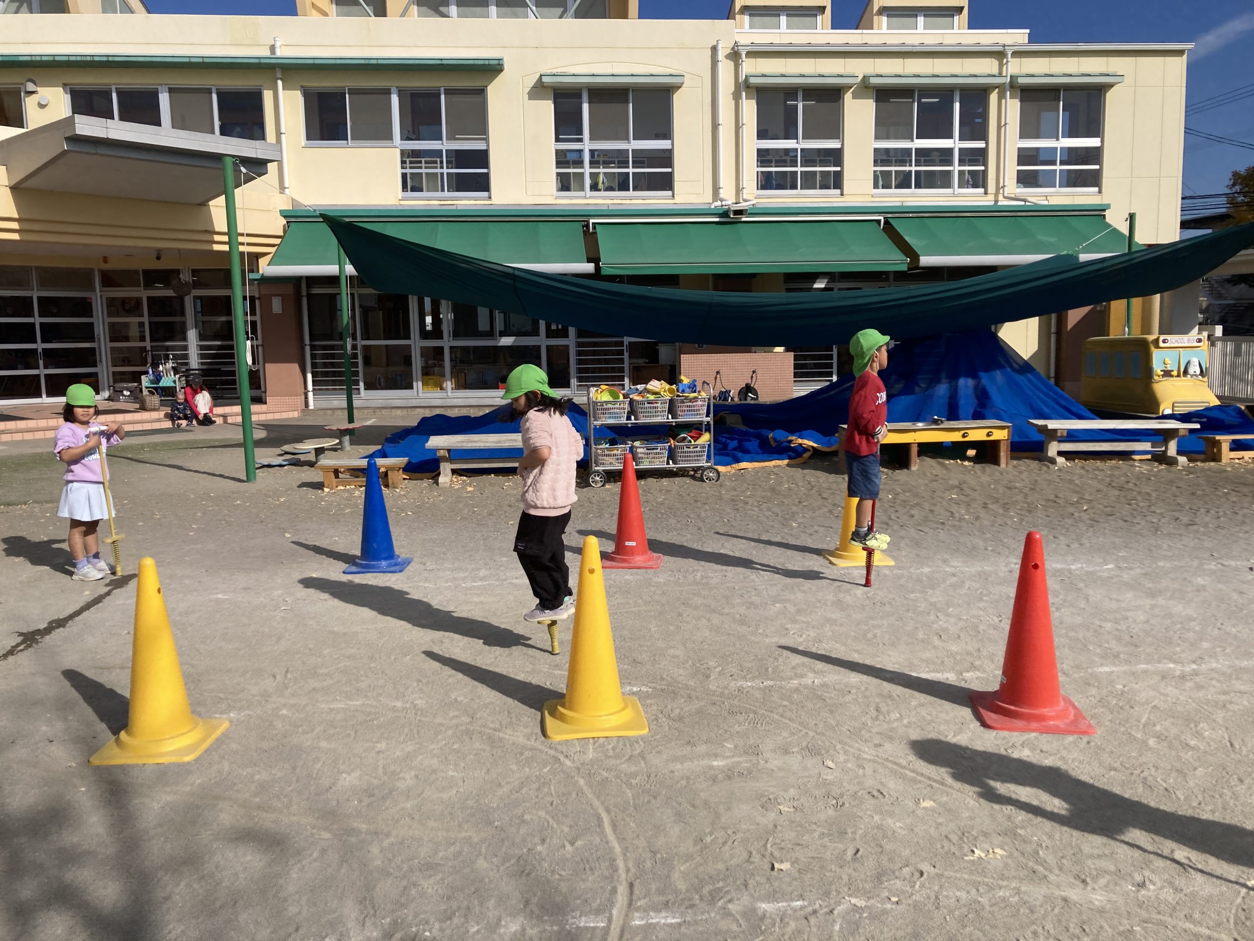 今日は、戸外遊びをしました。ホッピングでジグザグの道を進む練習をしました。繰り返し練習して上手になっていました。午後からは防犯訓練もしました。