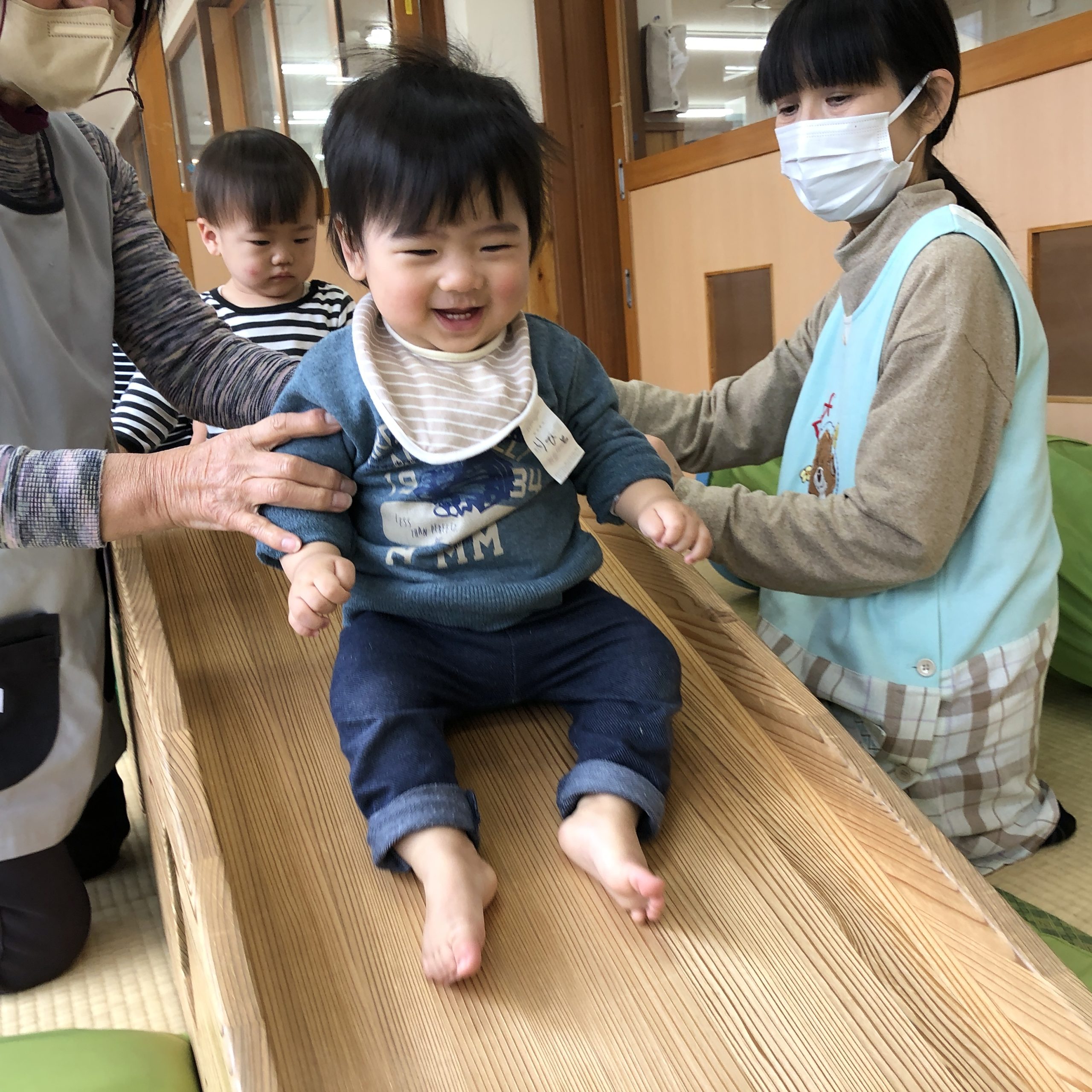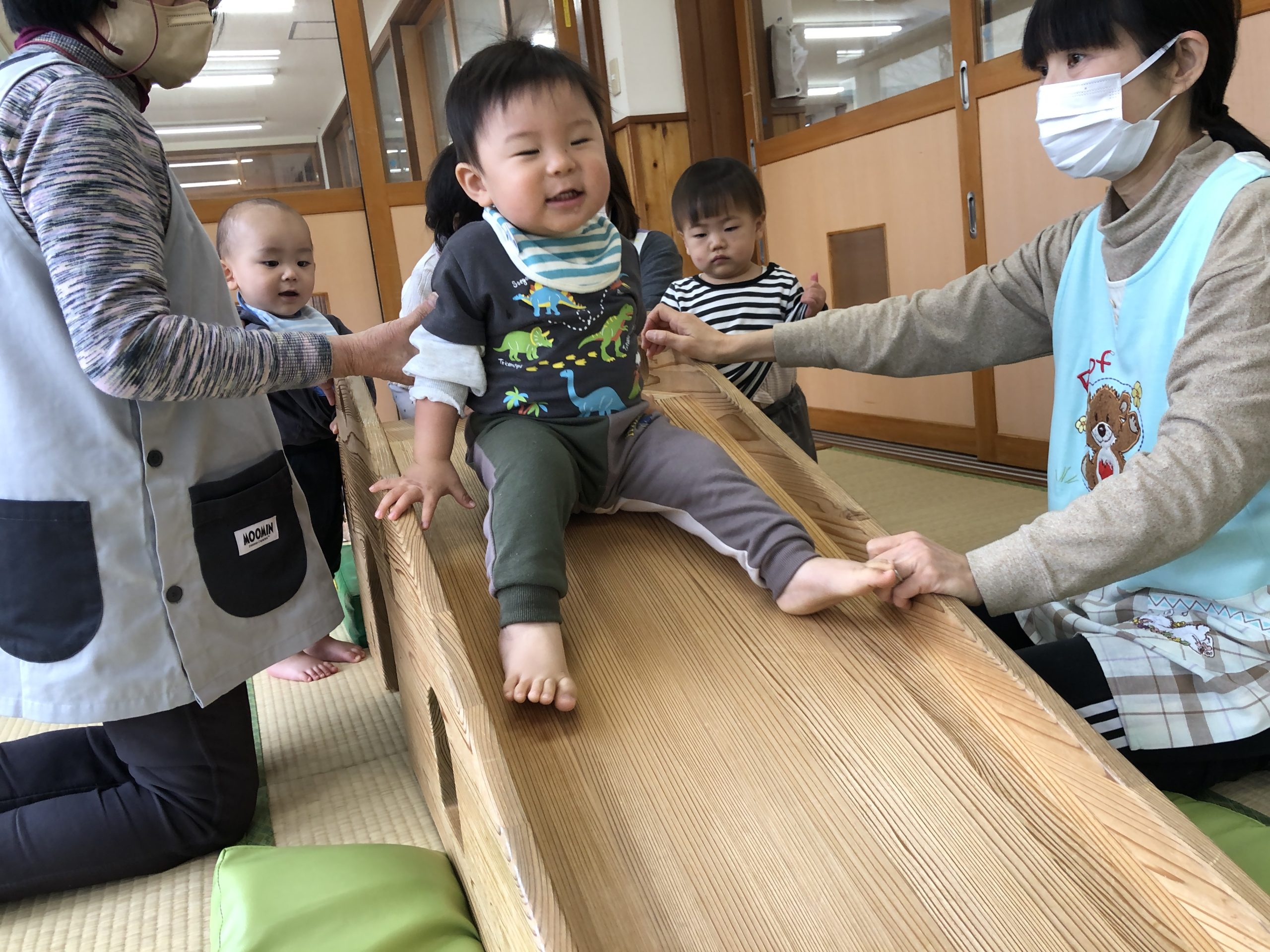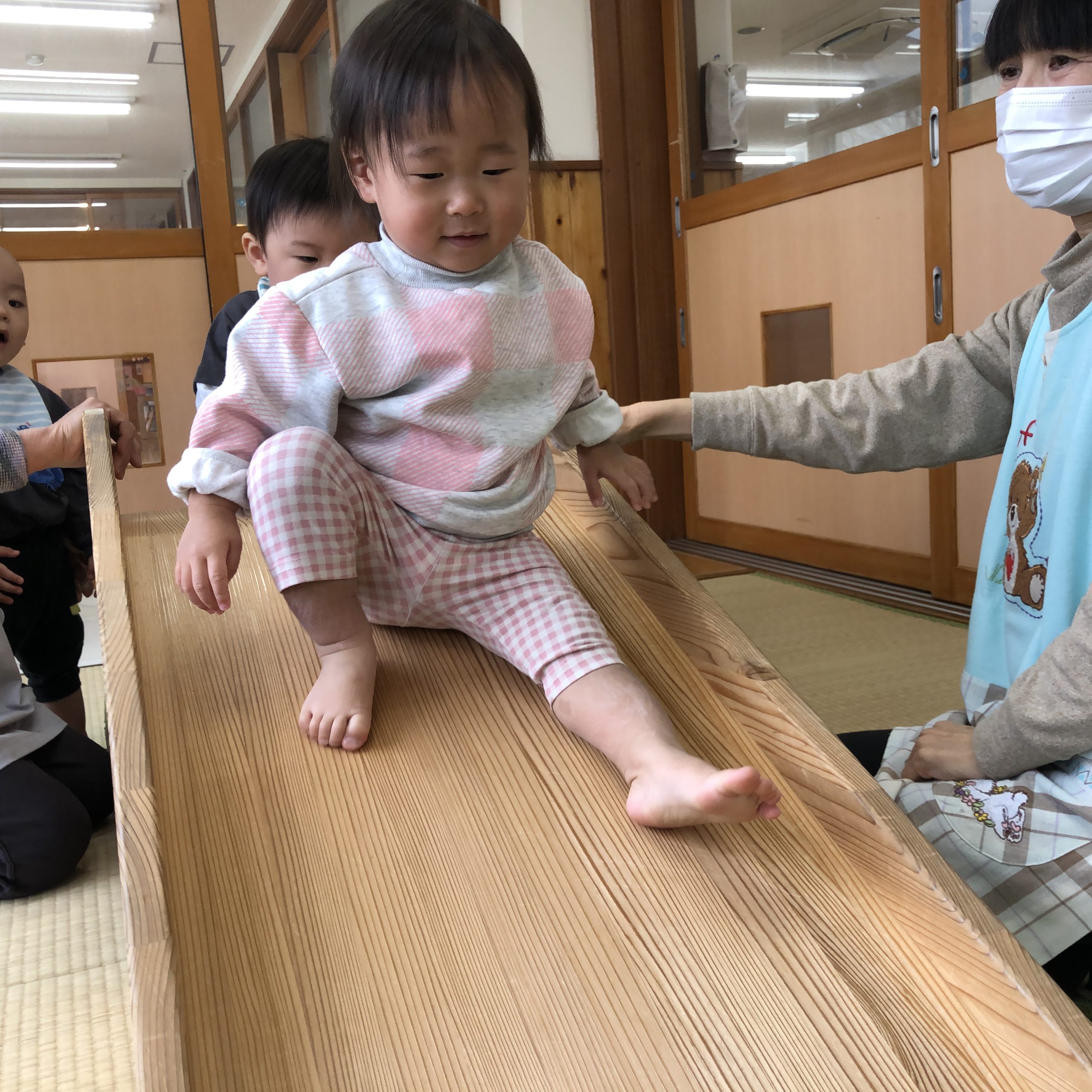 今日は、木製滑り台であそびました。階段の方からよじ登って~滑り降り🎶何度も楽しんで遊んでいたお友だちでした☆彡