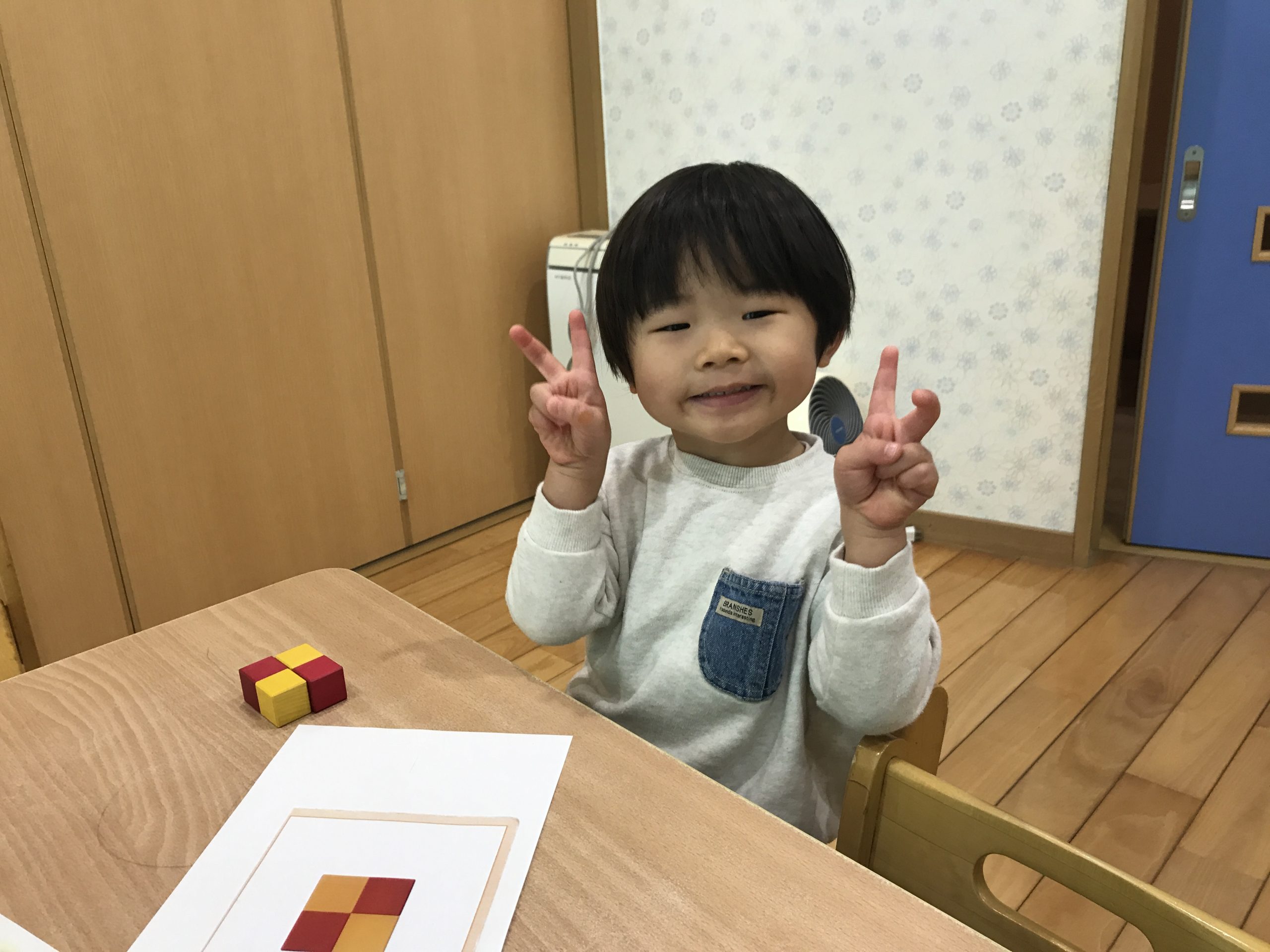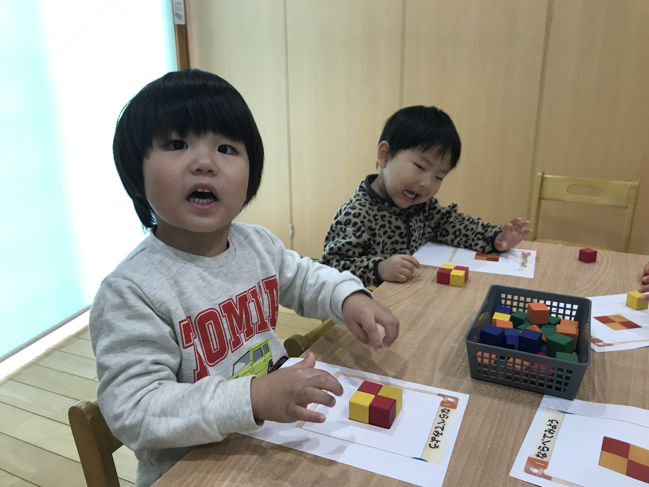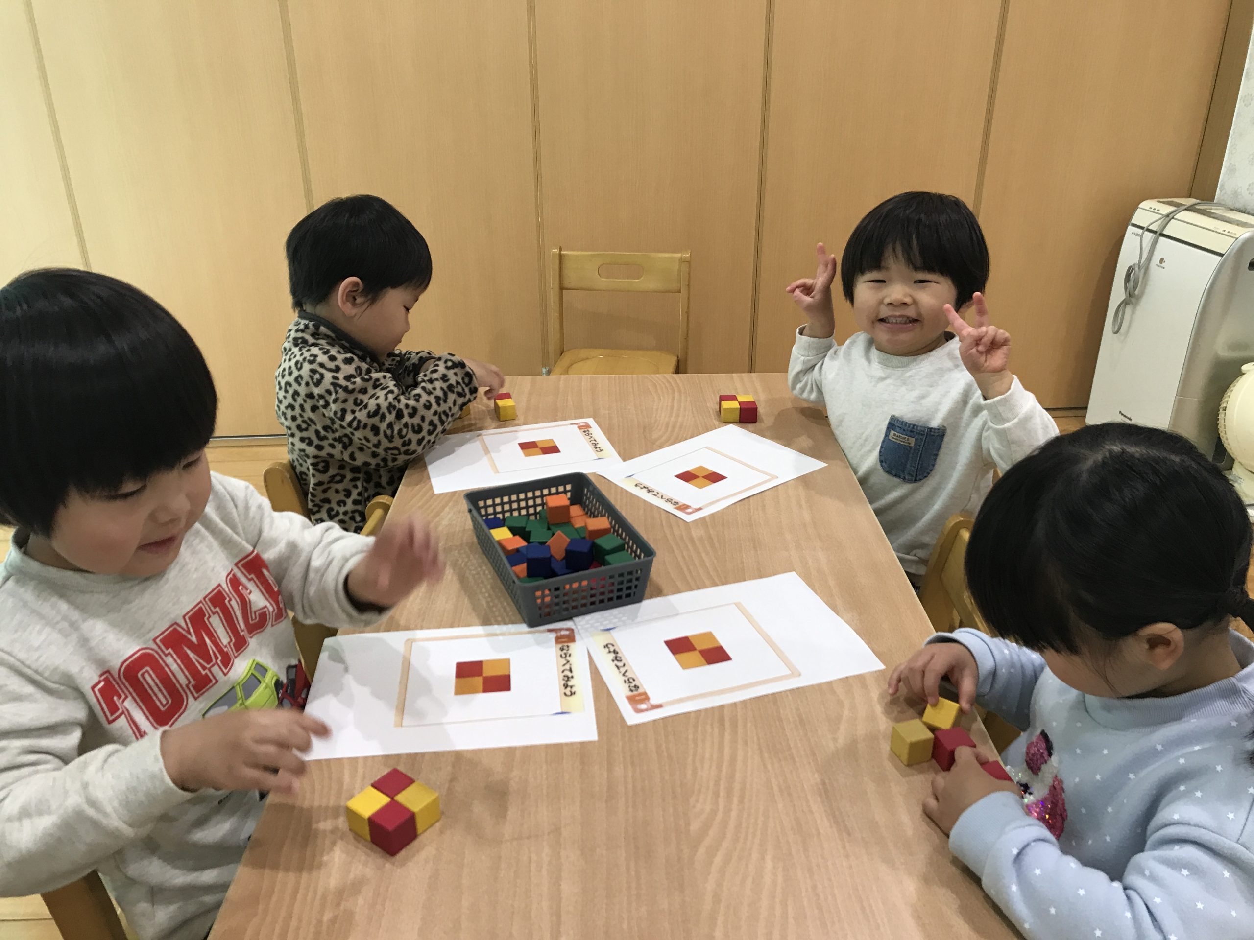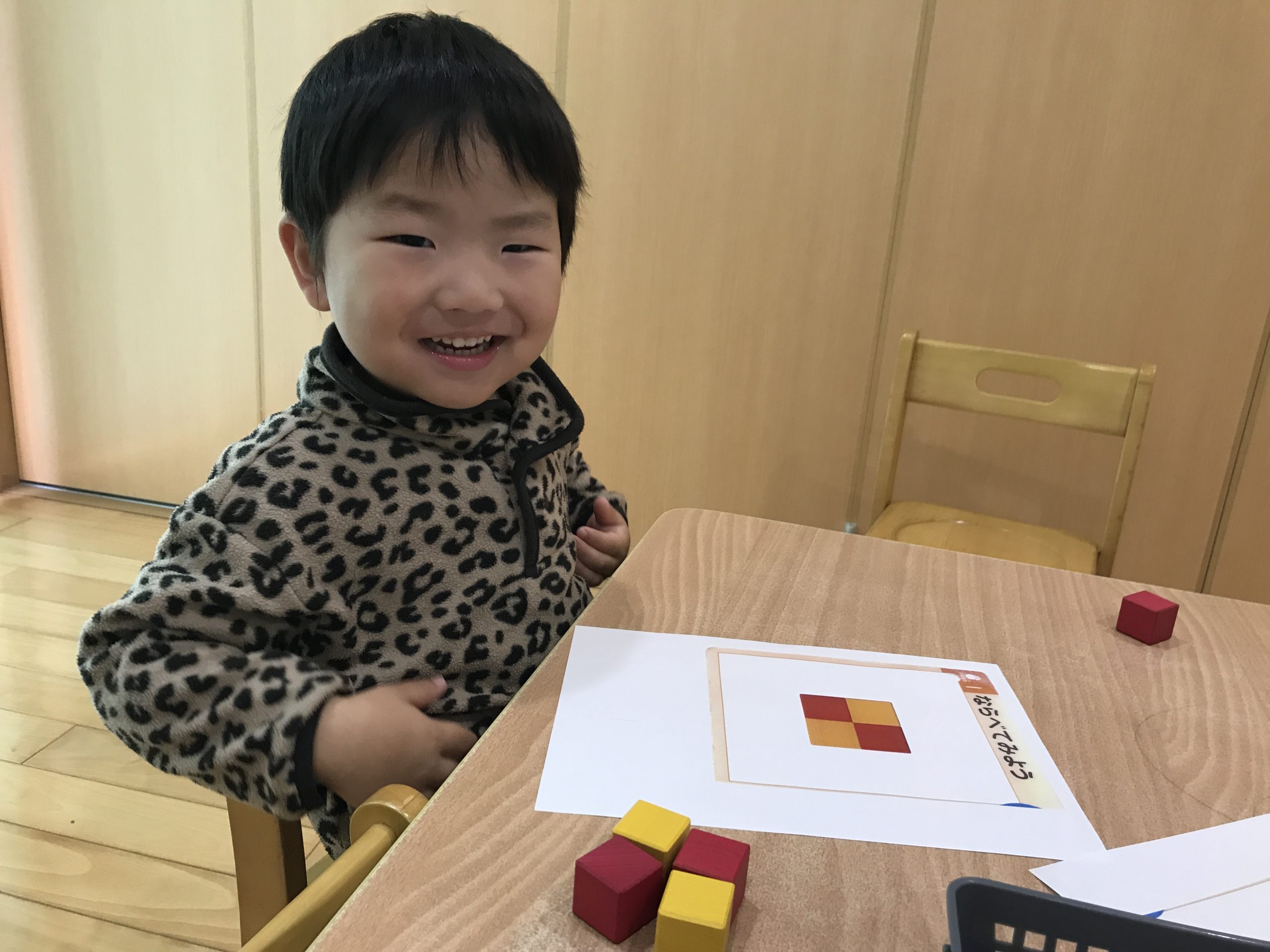今日は、くもんキューブをしました!写真を見ながら、同じようにキューブを並べて遊びましたよ😊✨上手にできると嬉しそうにしていました🎵