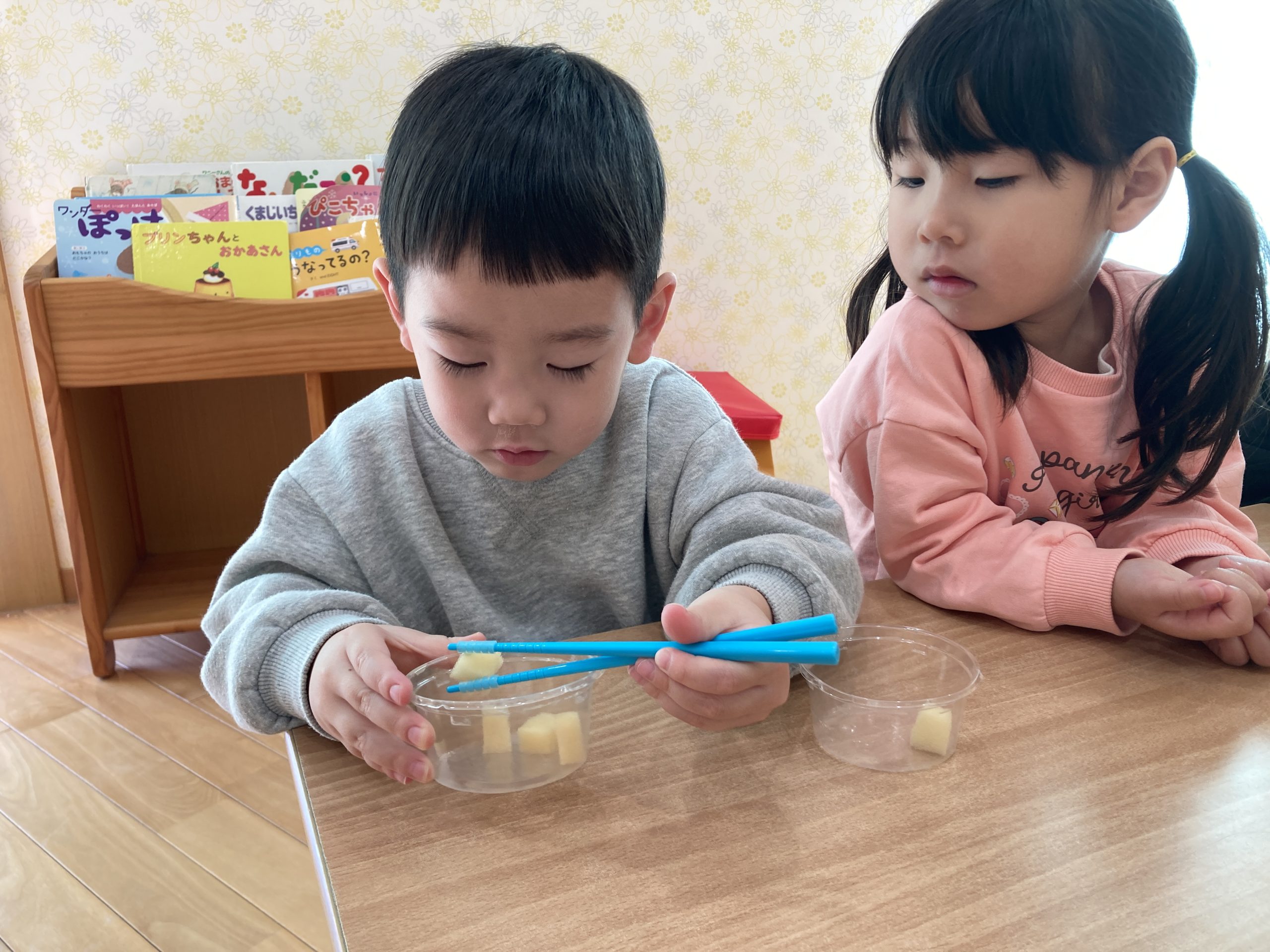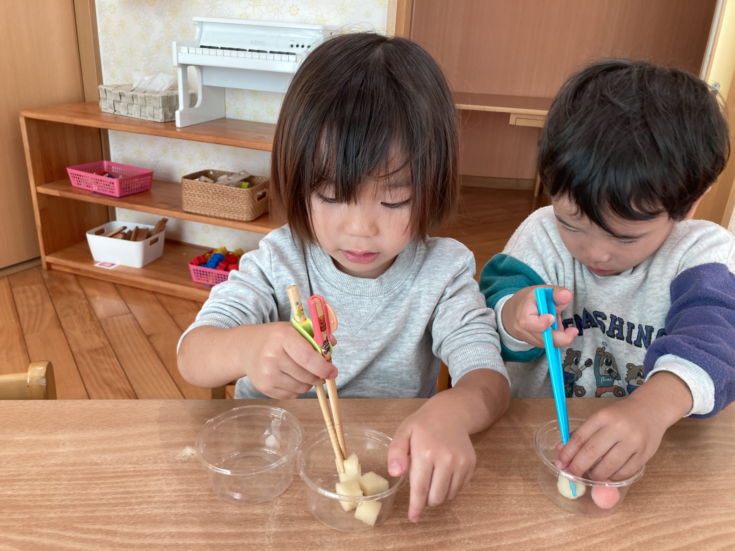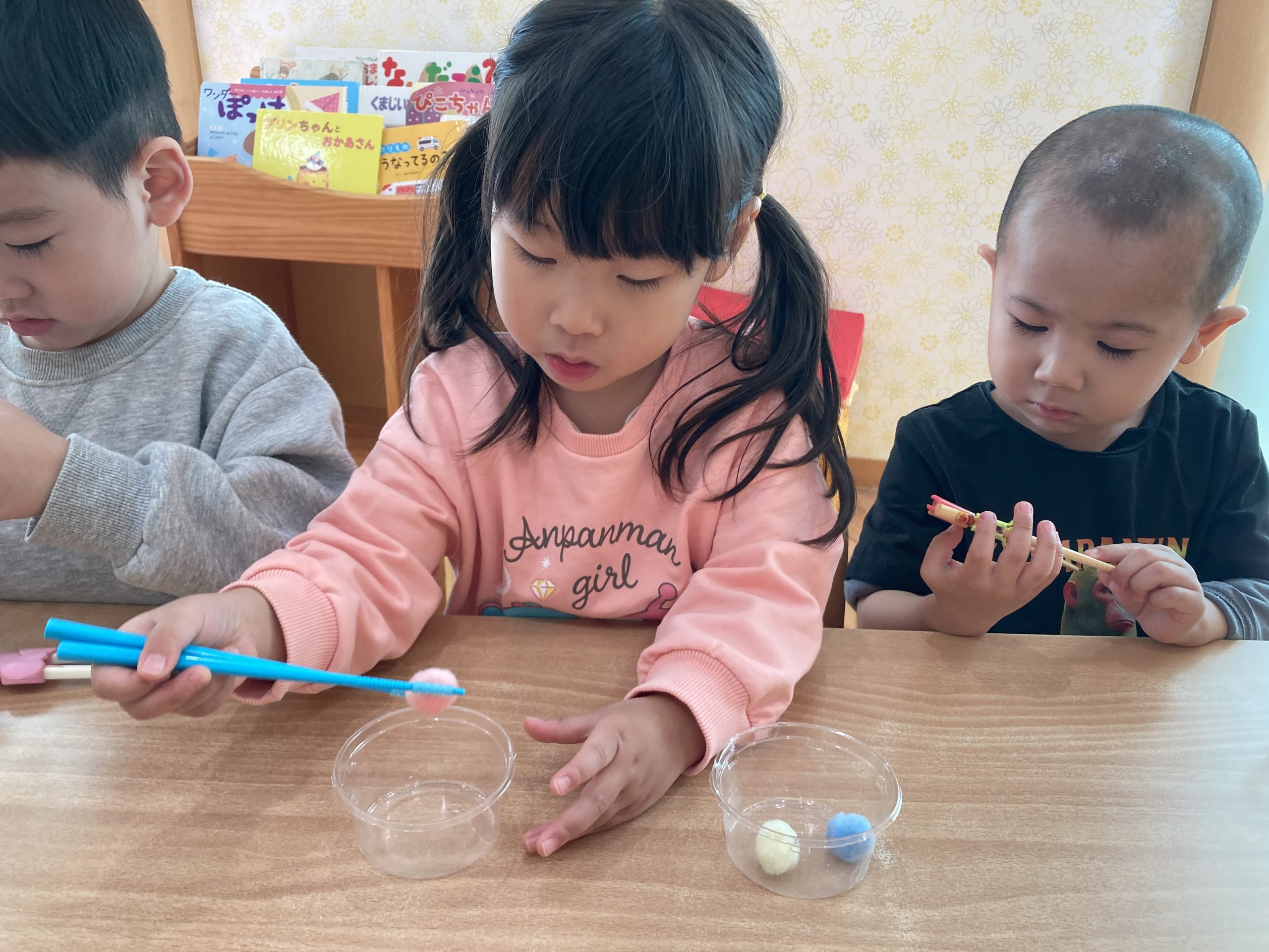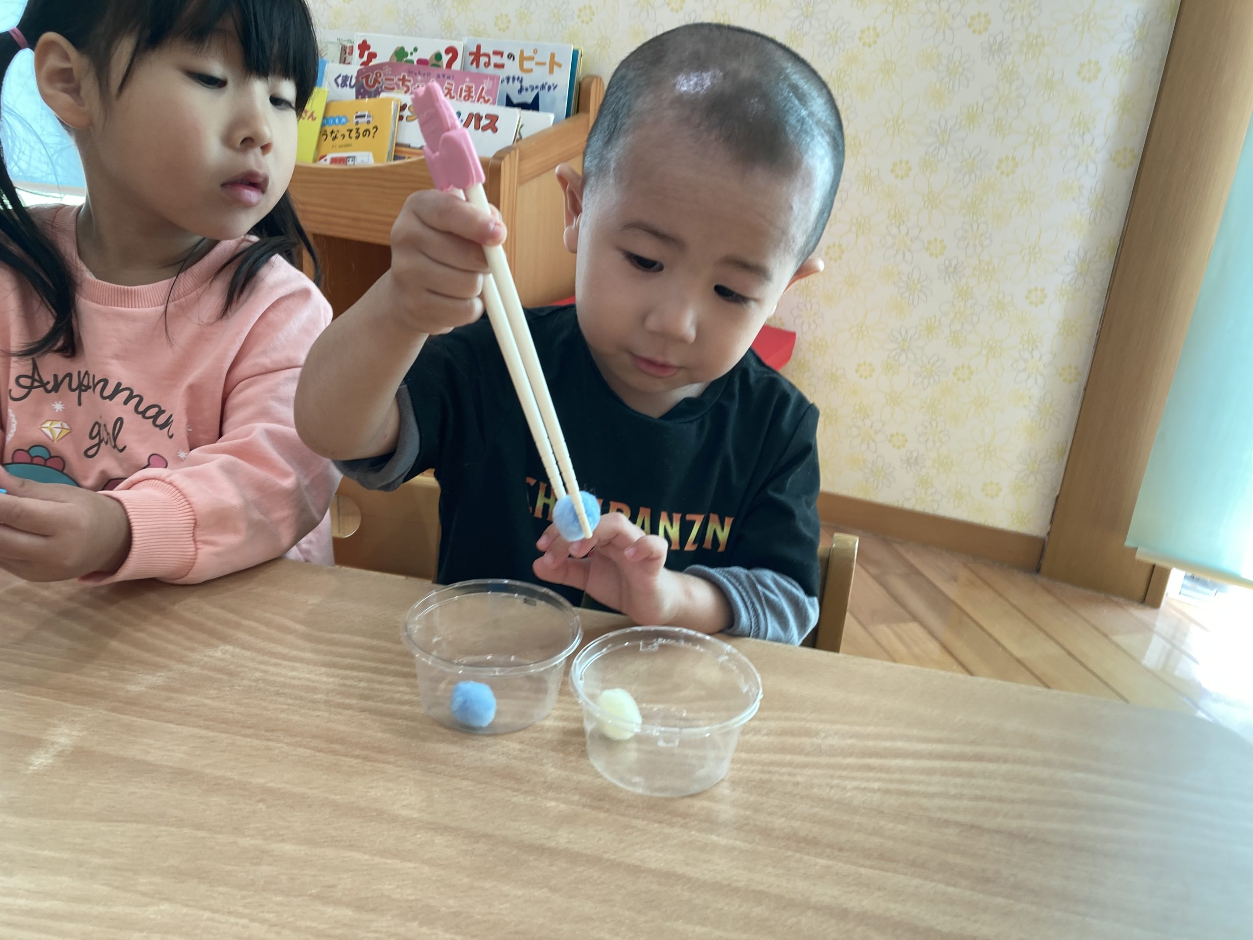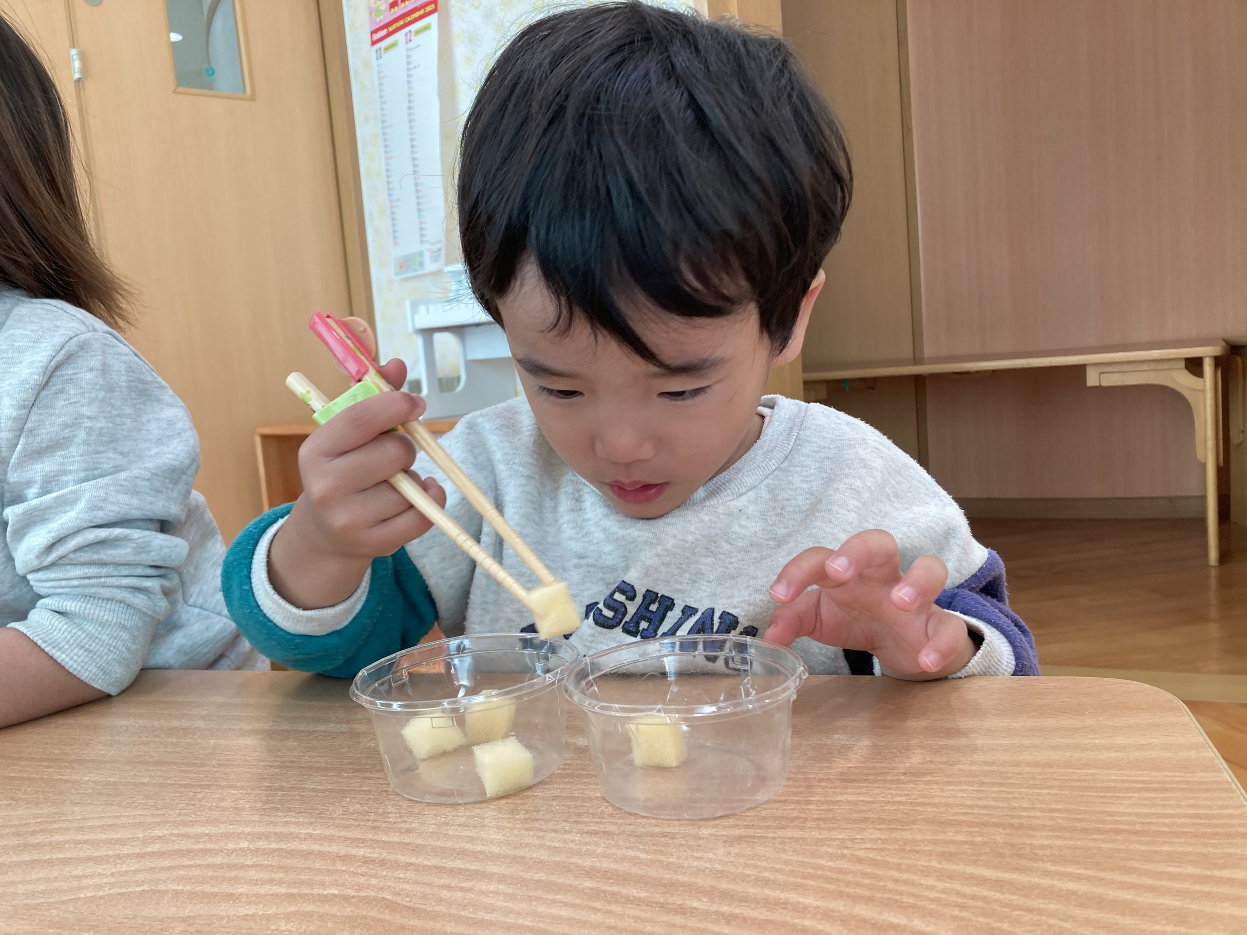今日は、豆うつしをしました!箸の持ち方に少し苦戦しながらも、箸で上手に掴もうと頑張っていました!✨みんな集中して取り組むことができていましたよ😊✨