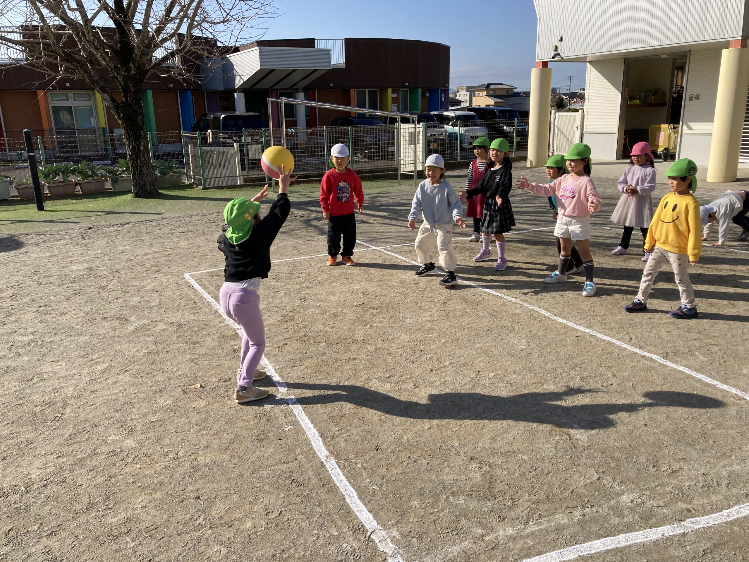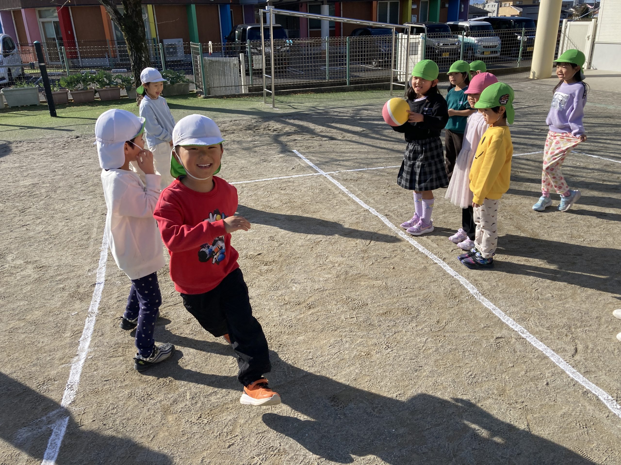 今日は戸外であそびました。ドッチボール大会に向けて、ボールをキャッチする練習をしたり、お友だちをねらって、投げる練習をしたりしました。最後はそれぞれ自分たちのしたい遊びをしました。