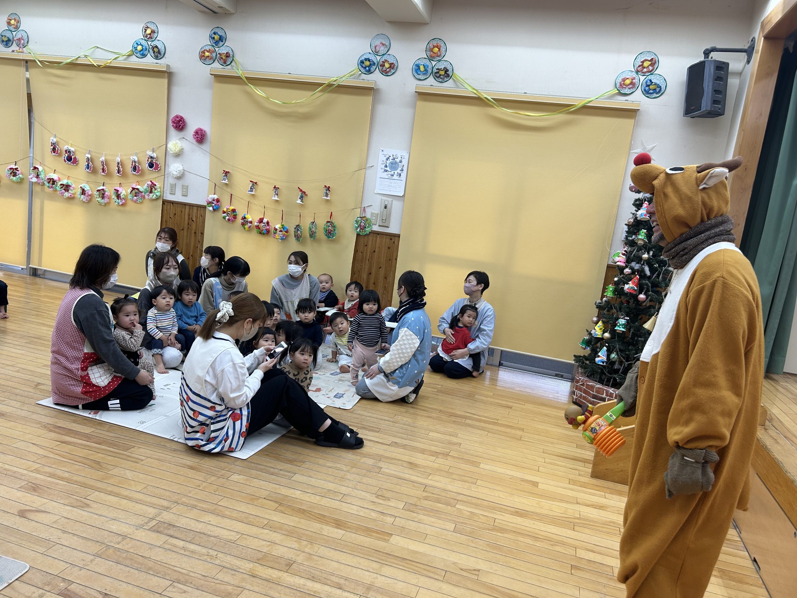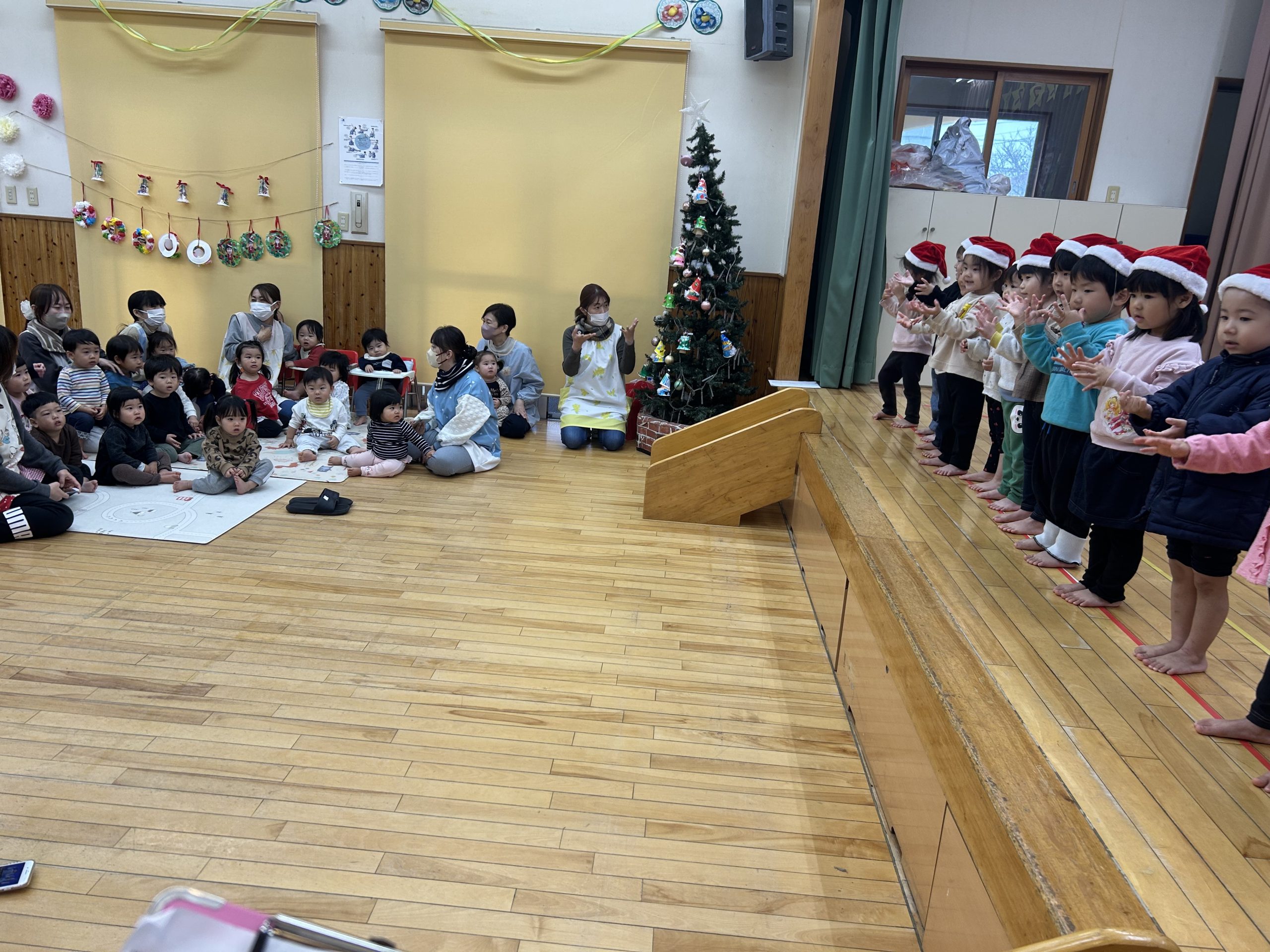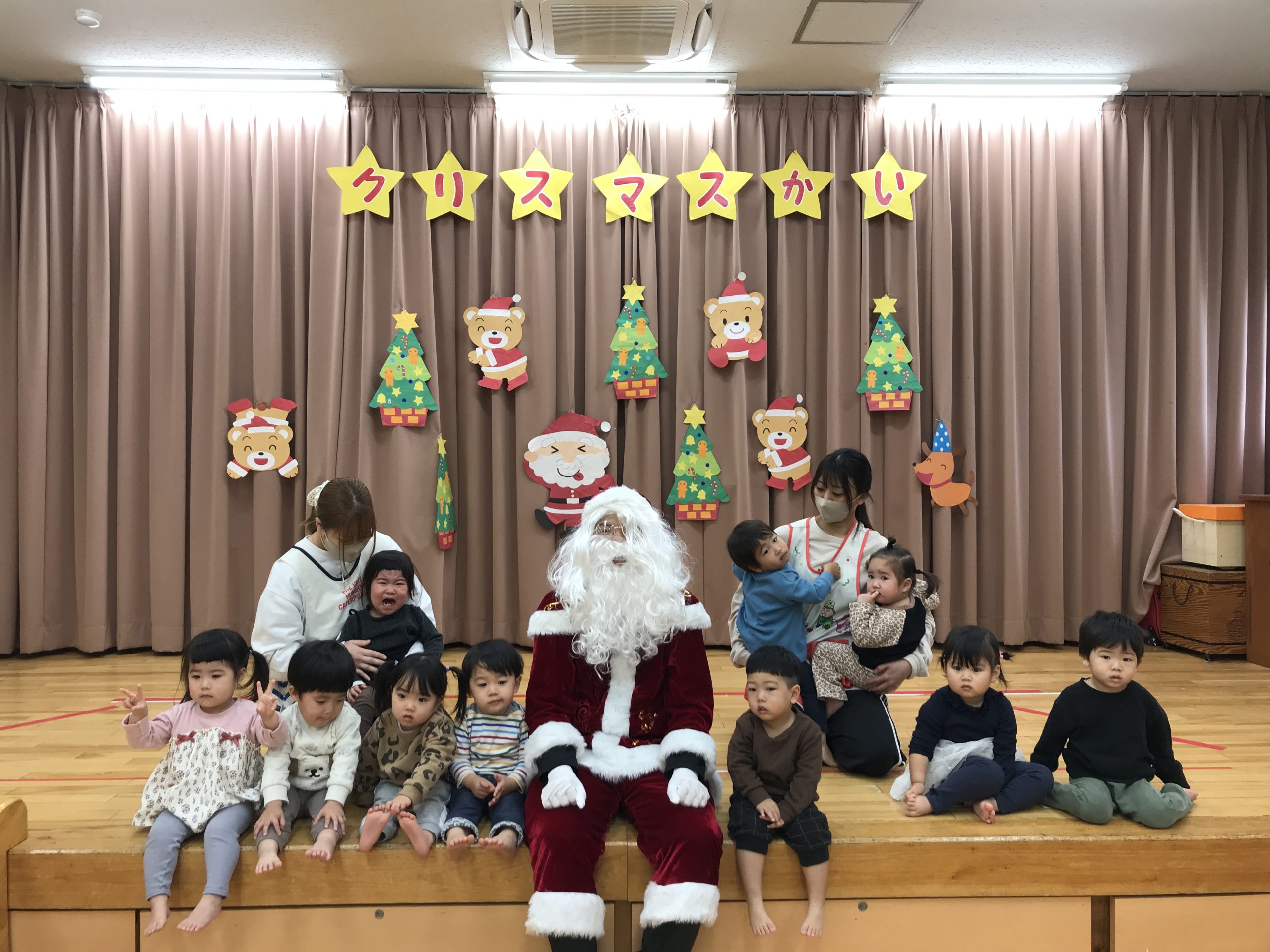 今日はクリスマス会がありました!うさぎぐみ、きりんぐみさんのリズムを見たり、サンタさんからプレゼントを貰ったりしましたよ🎅