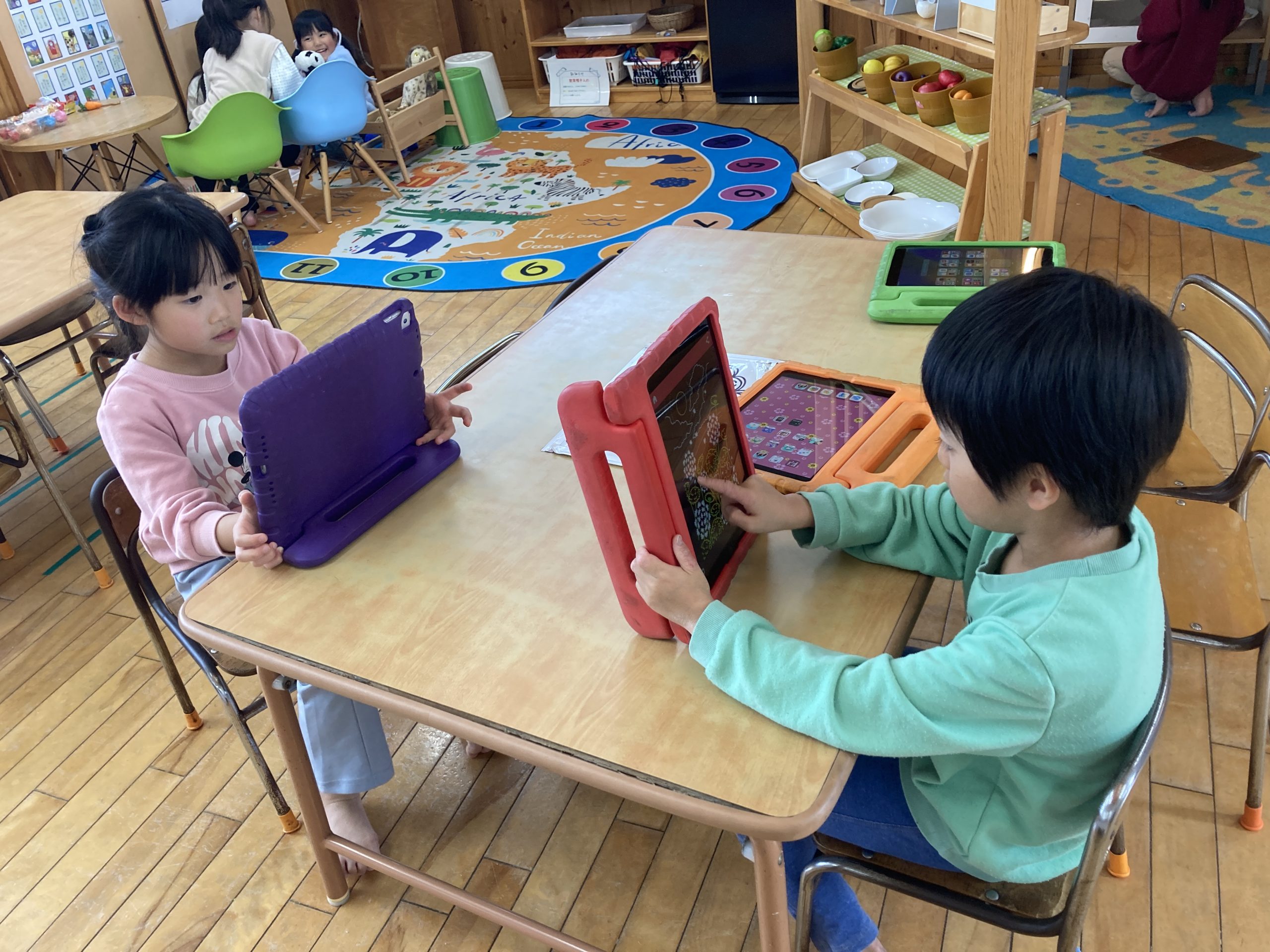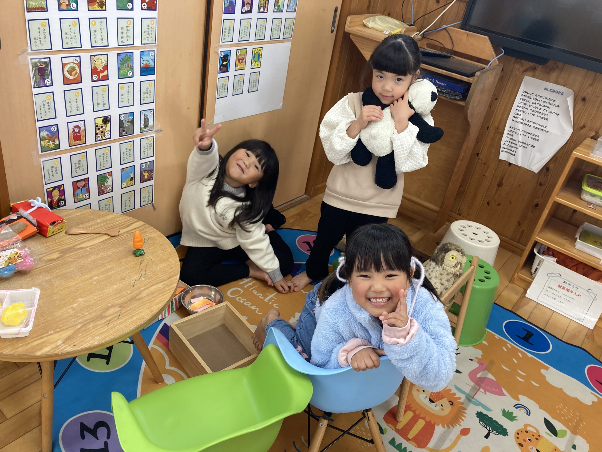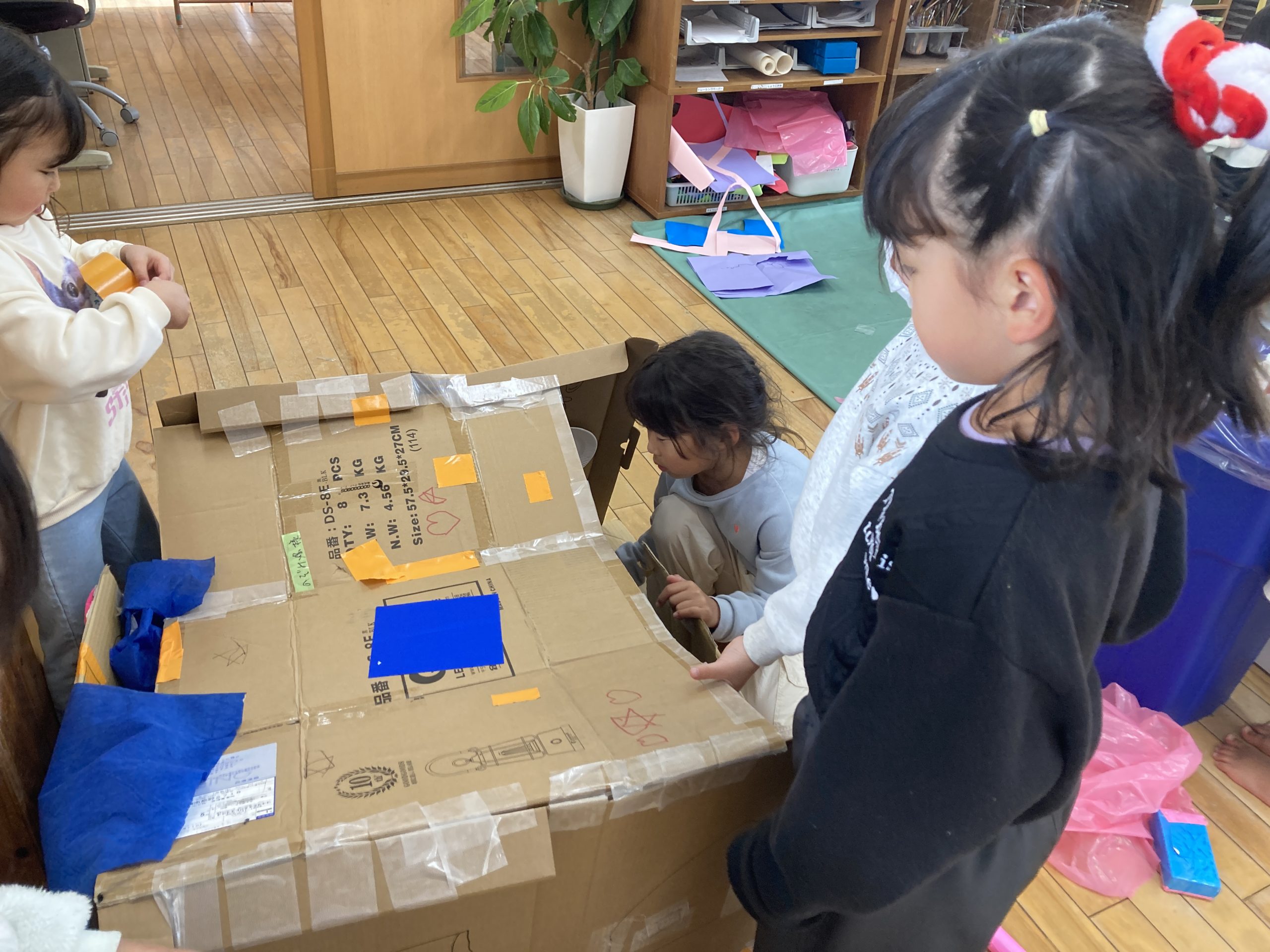 今日は、コーナー遊びをしました。製作遊びでは、りすぐみさんと一緒に大きな家🏠を作っていました。