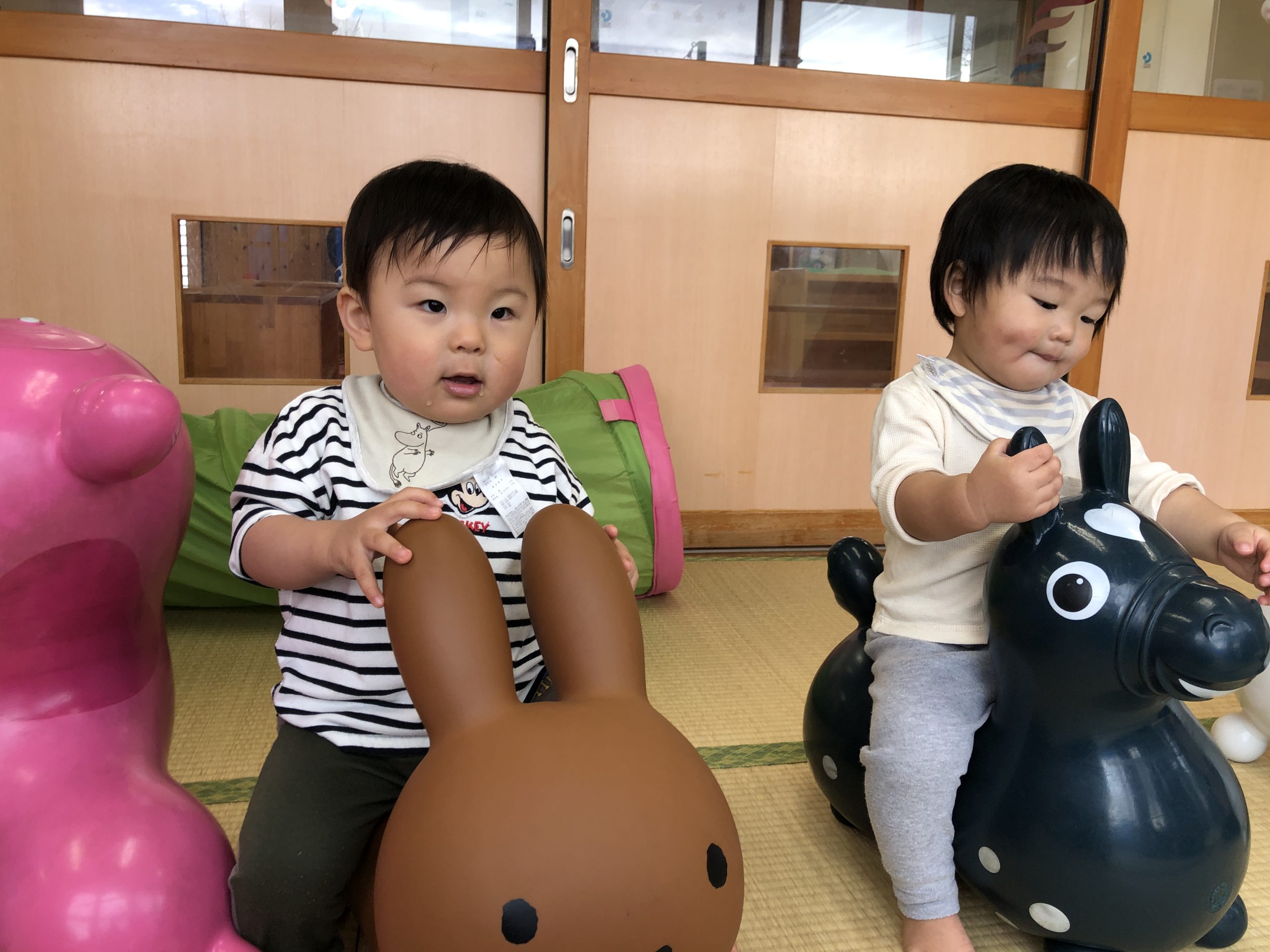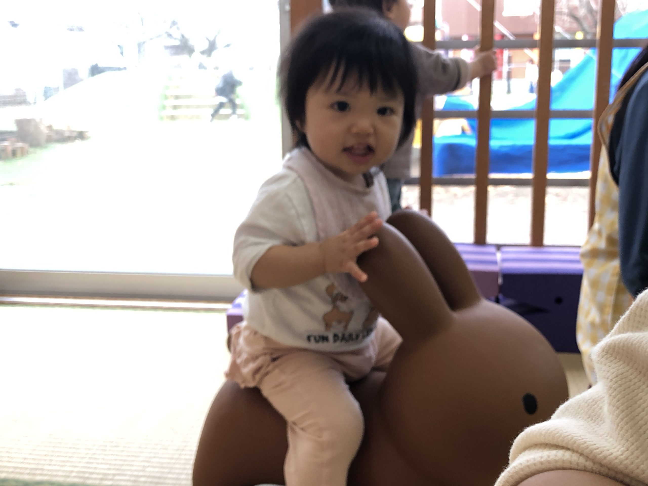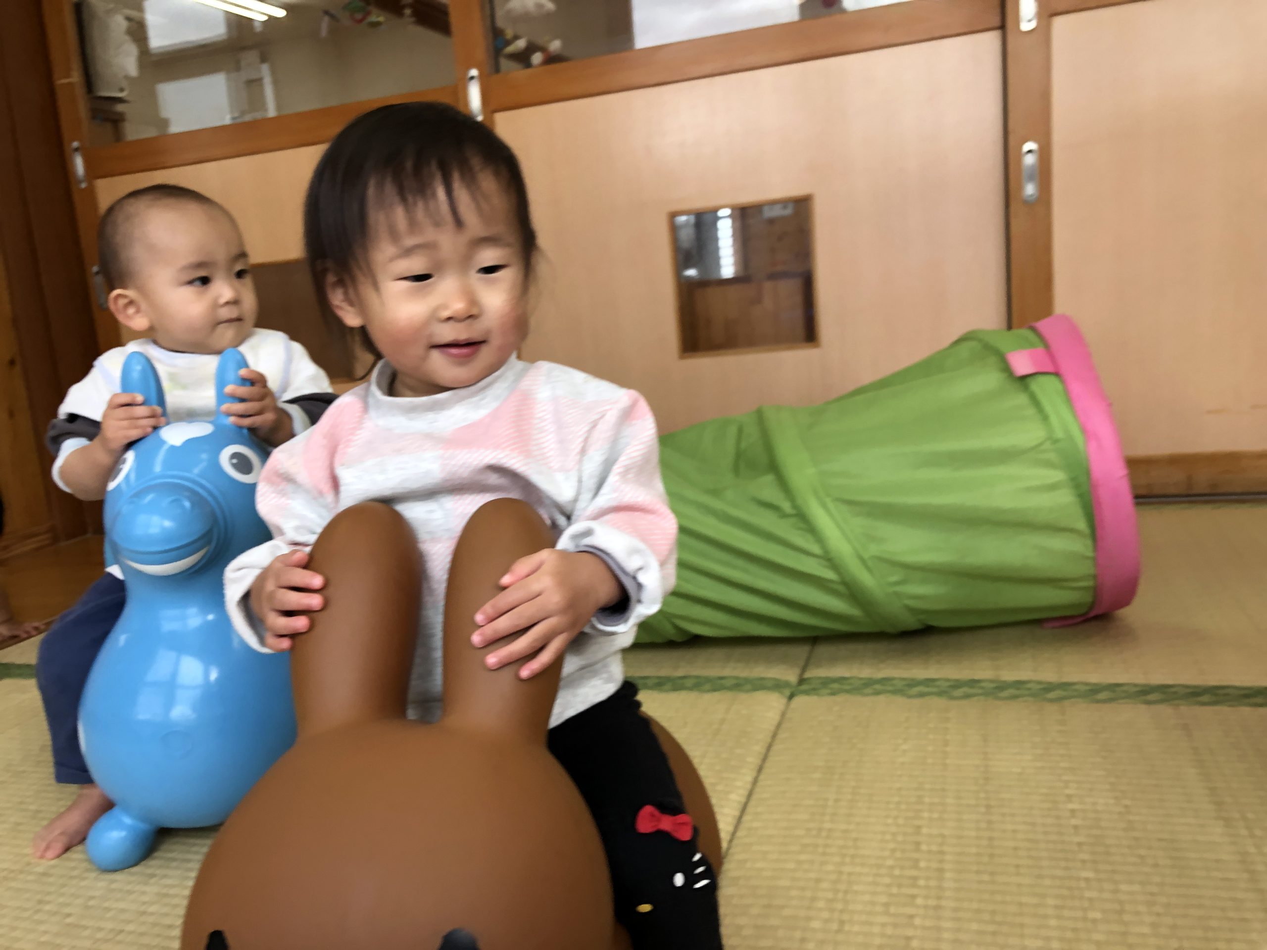 今日は、ボブルス階段・半円遊具、蛇腹トンネル、ロディ・ミッフィーの遊具であそびました。ロディやミッフィーに跨ってみたり、自分で足を屈伸させて弾んで楽しんでいましたよ🎶