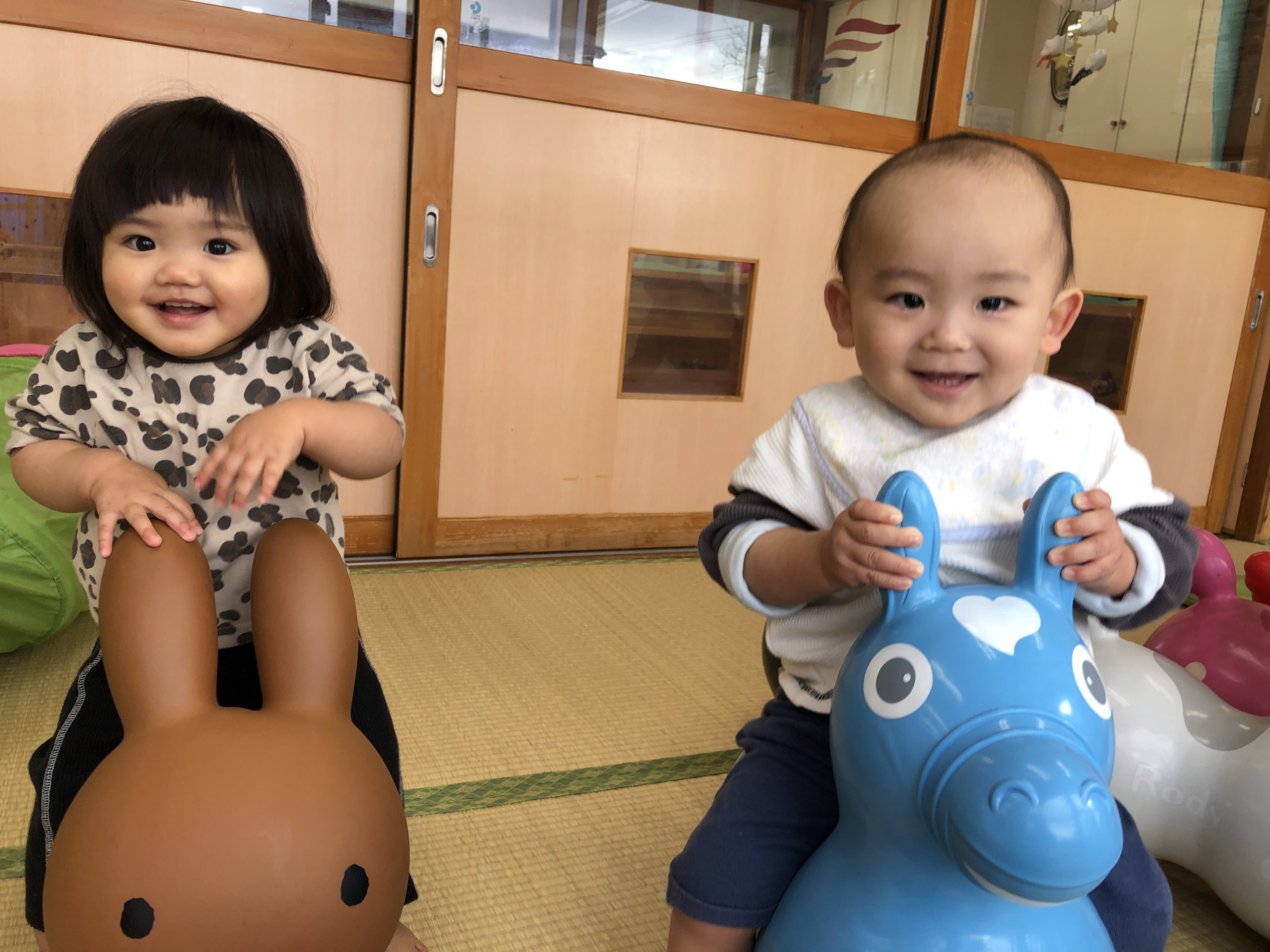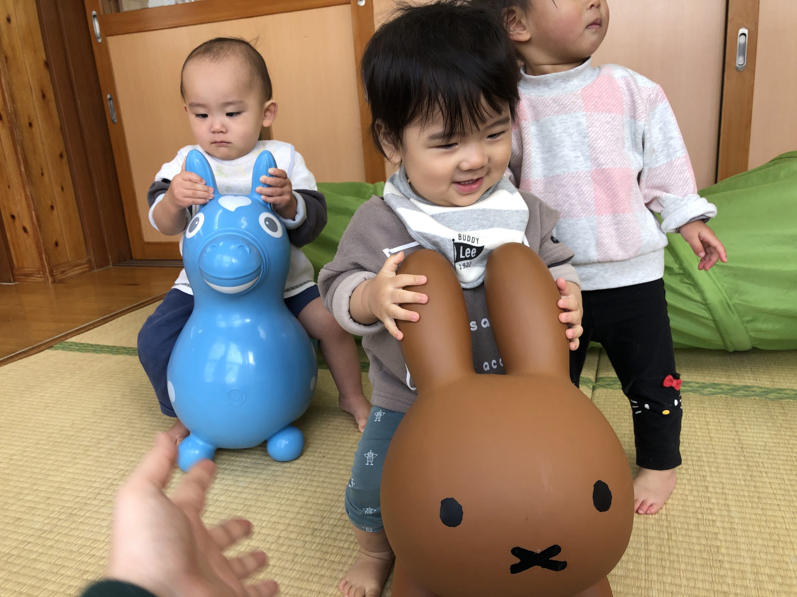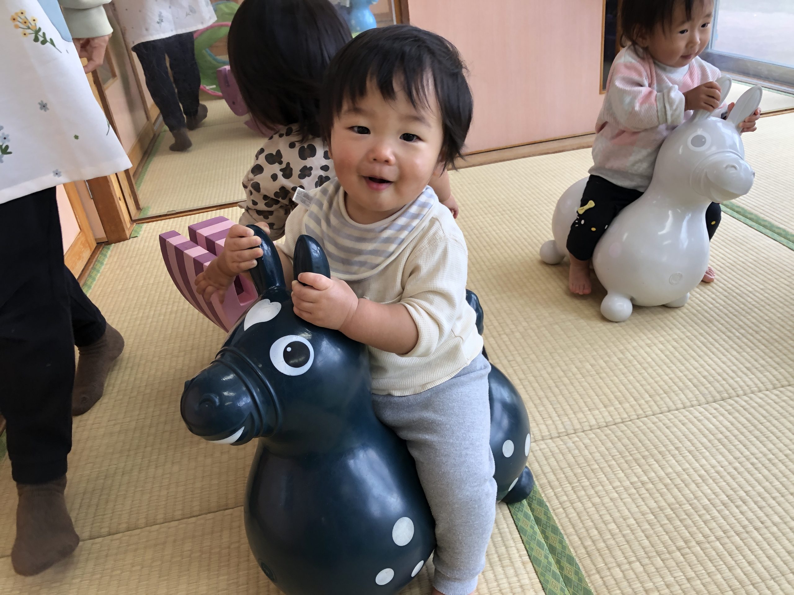今日は、ボブルス階段・半円遊具、蛇腹トンネル、ロディ・ミッフィーの遊具であそびました。ロディやミッフィーに跨ってみたり、自分で足を屈伸させて弾んで楽しんでいましたよ🎶