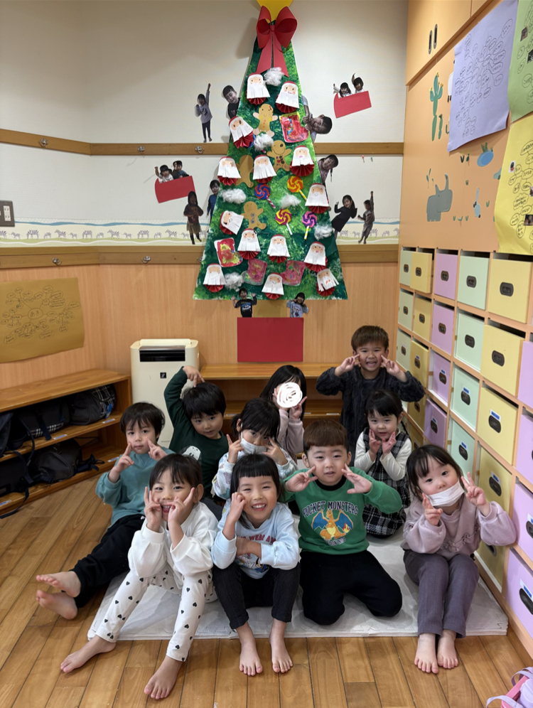 つきぐみで製作したクリスマスツリーも完成したのでみんなで写真を撮りましたよ📸