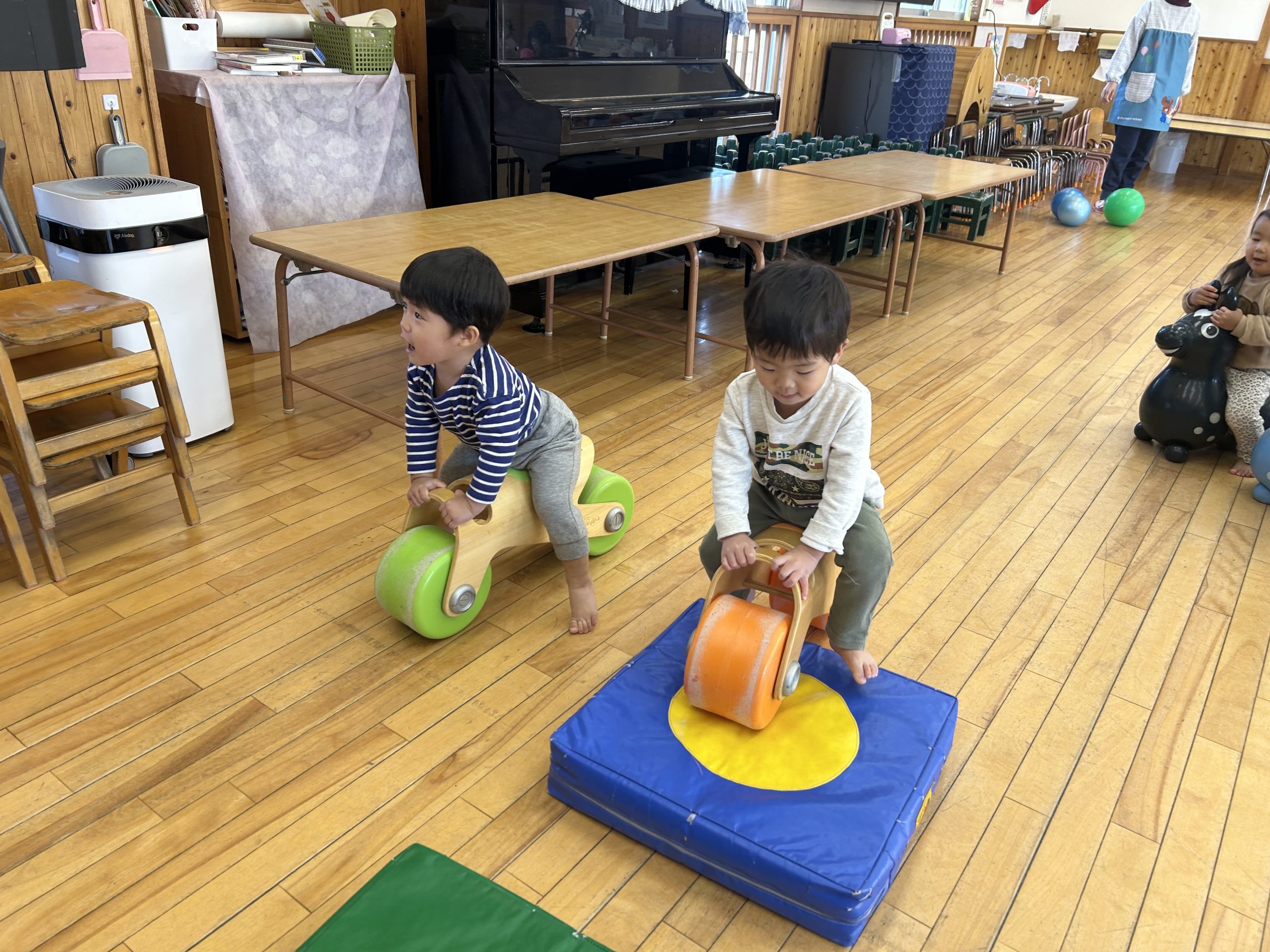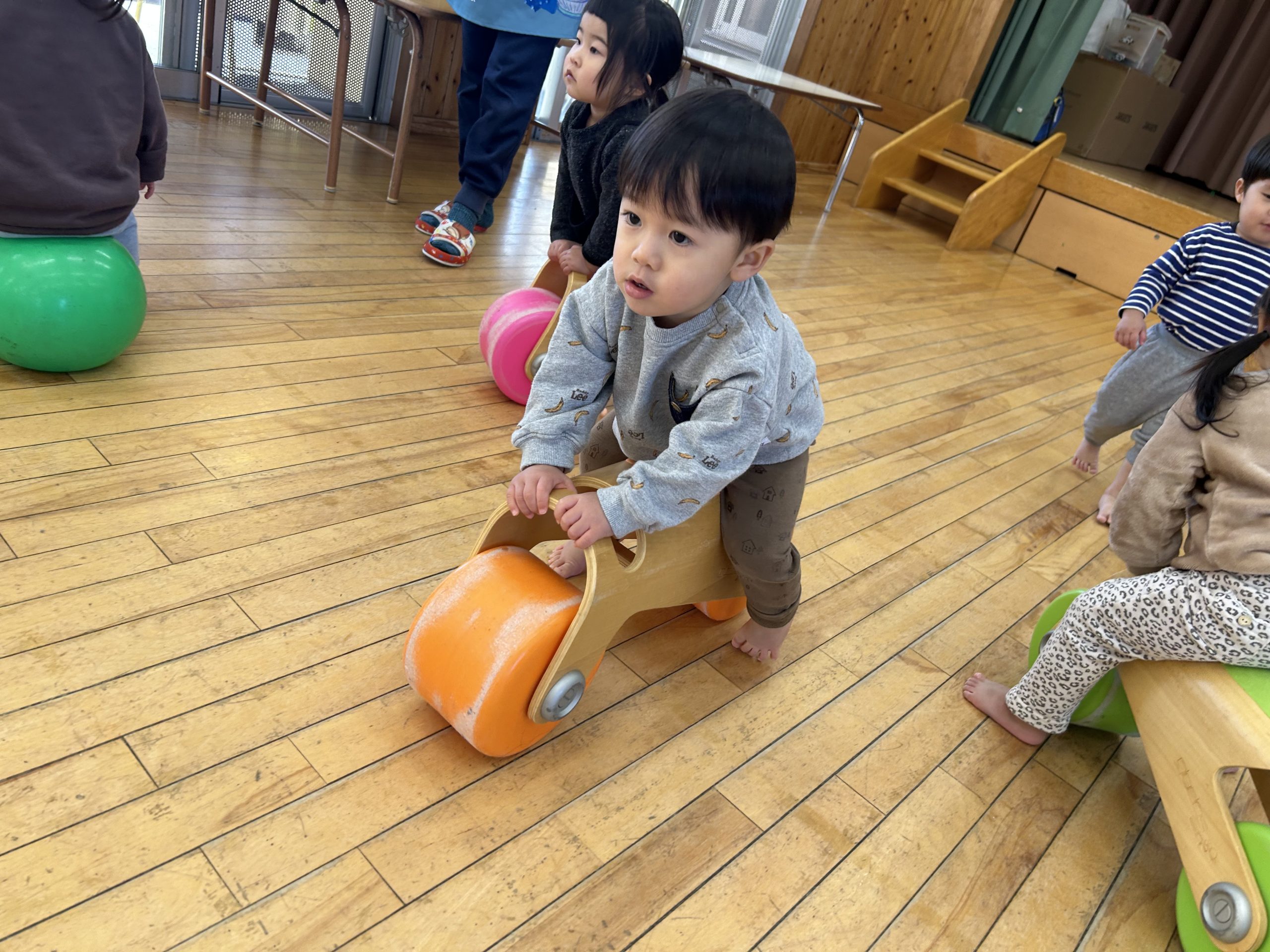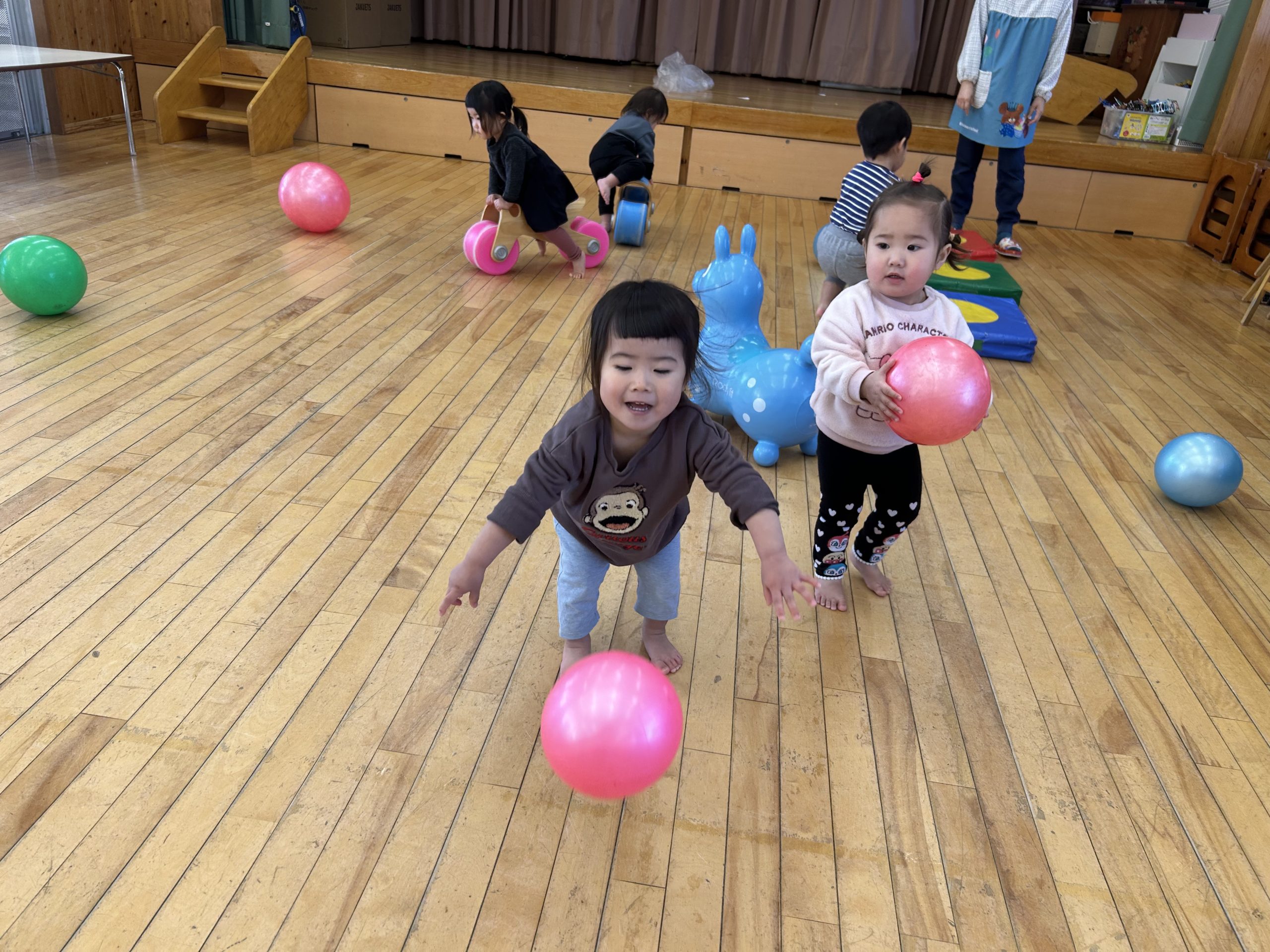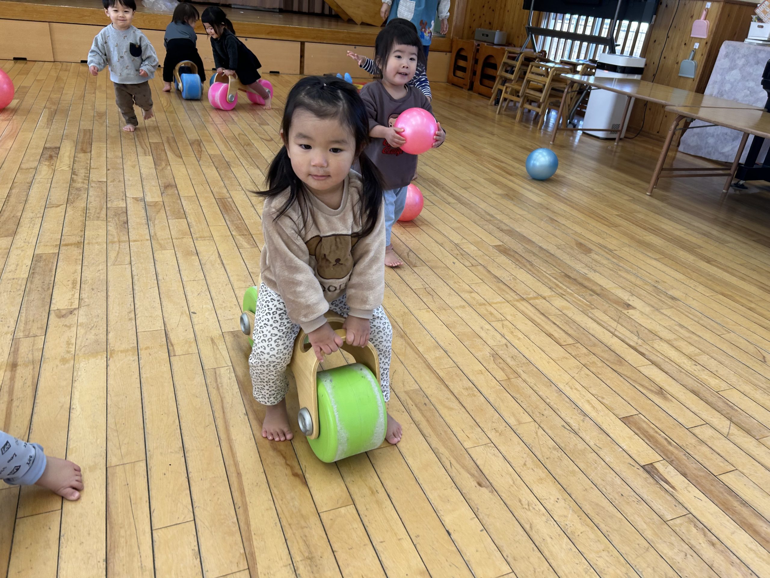 今日はホールで運動遊びをしました!ボール、バイク、ロディで遊びましたよ🎵