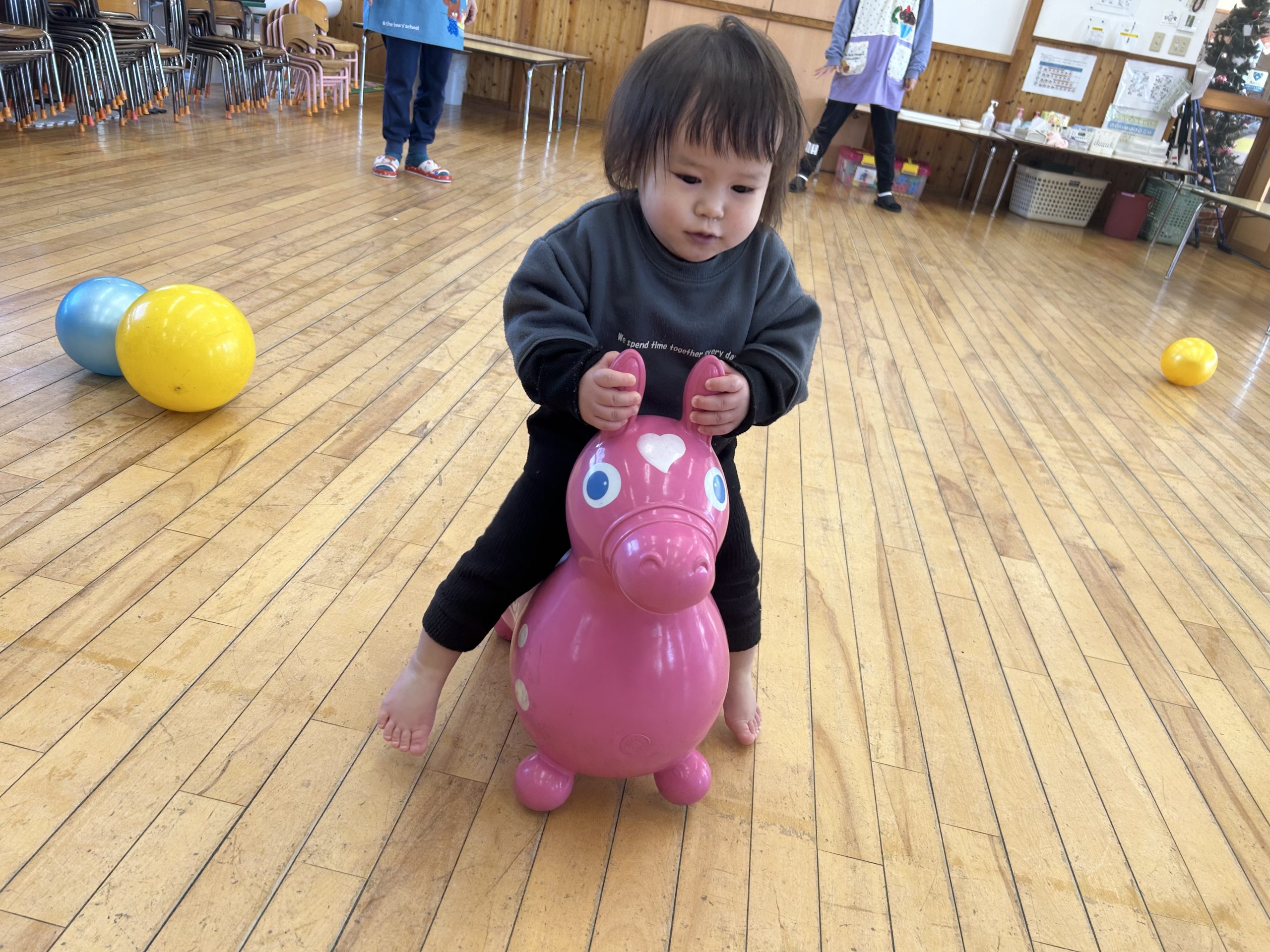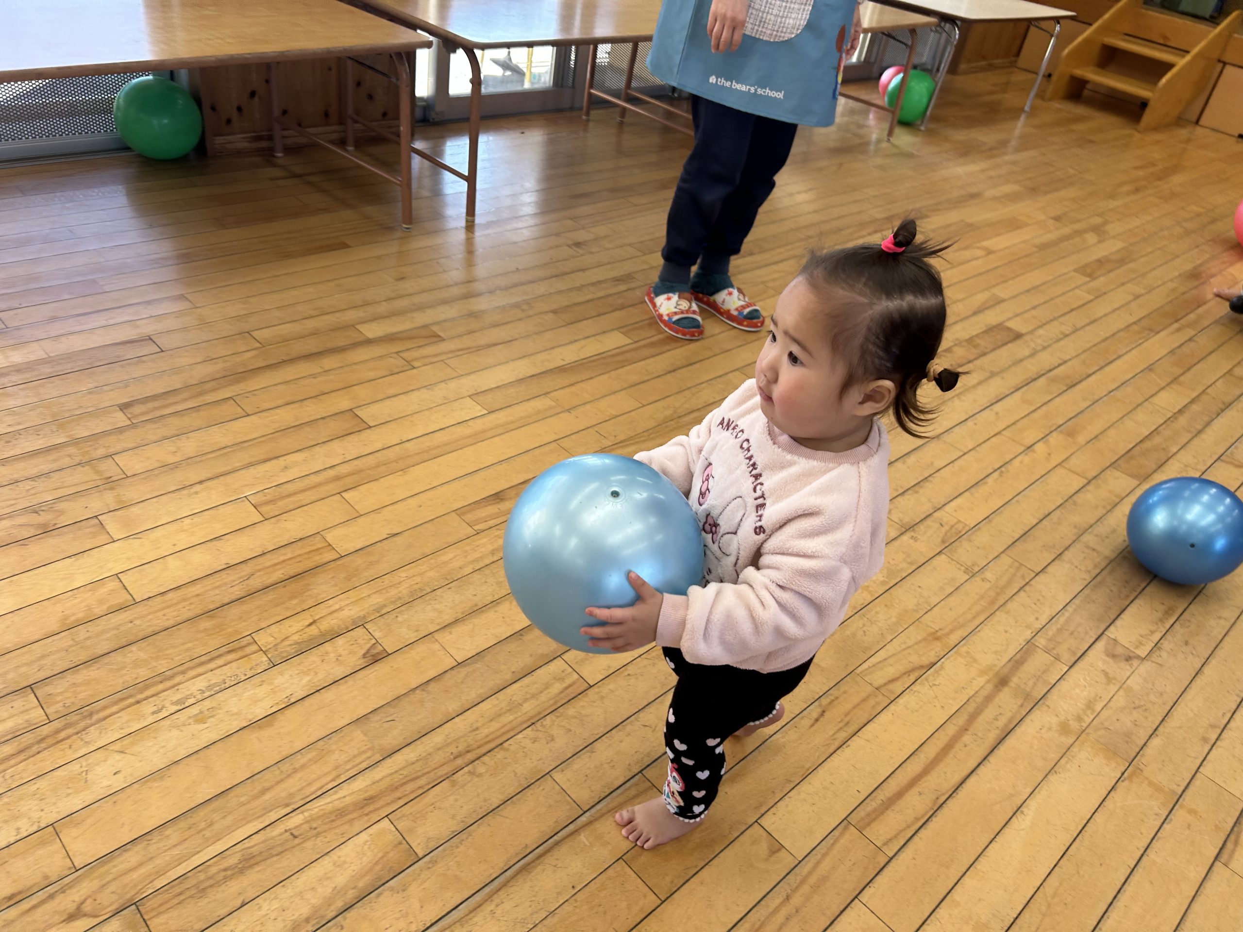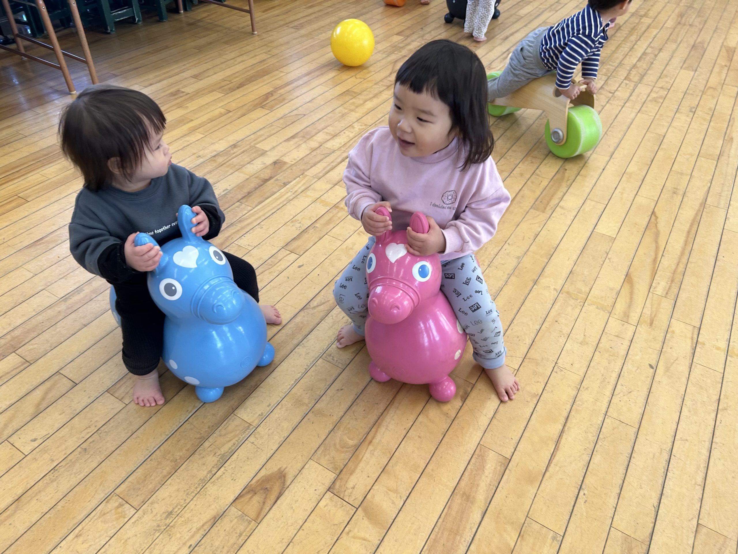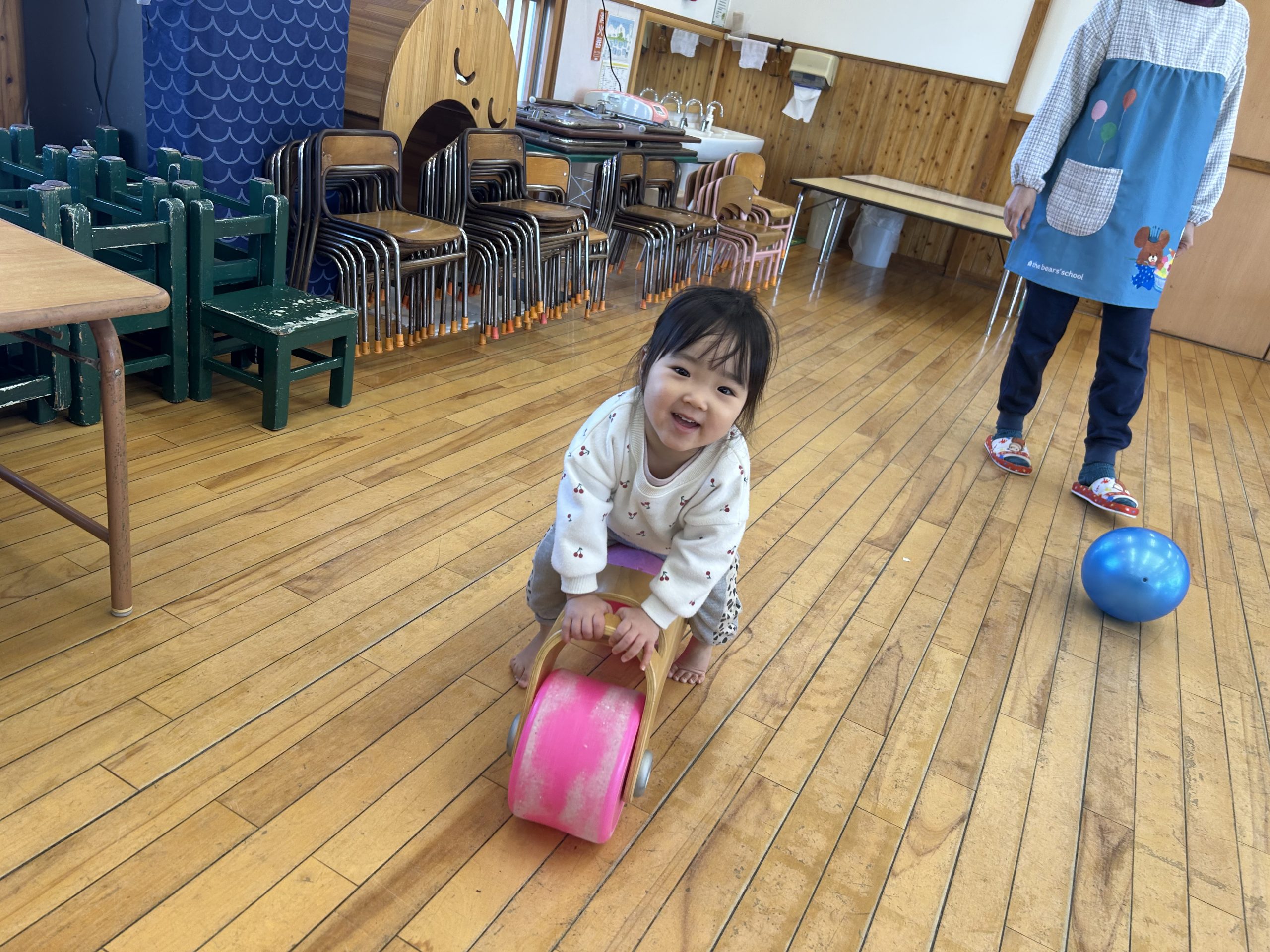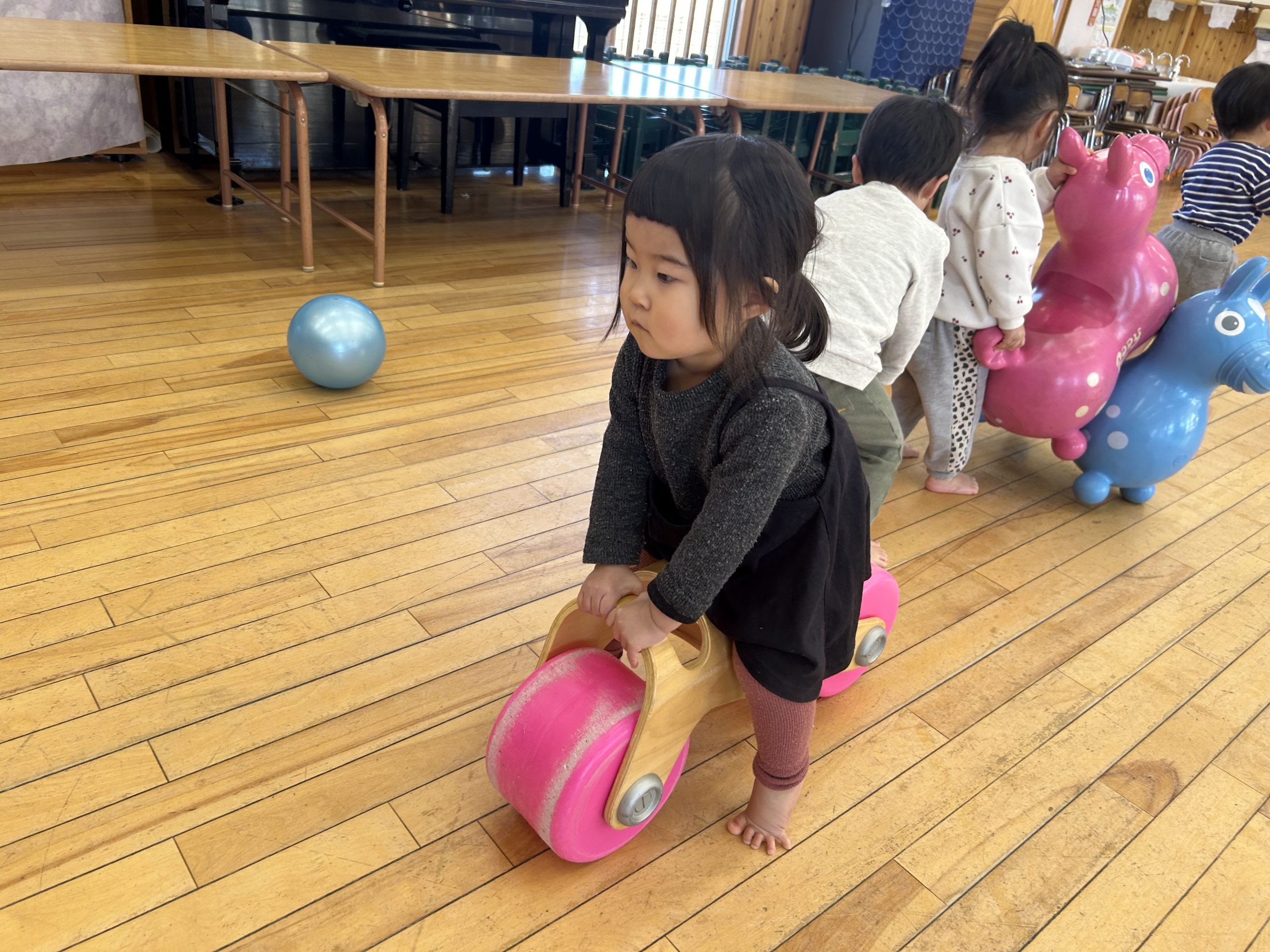今日はホールで運動遊びをしました!ボール、バイク、ロディで遊びましたよ🎵