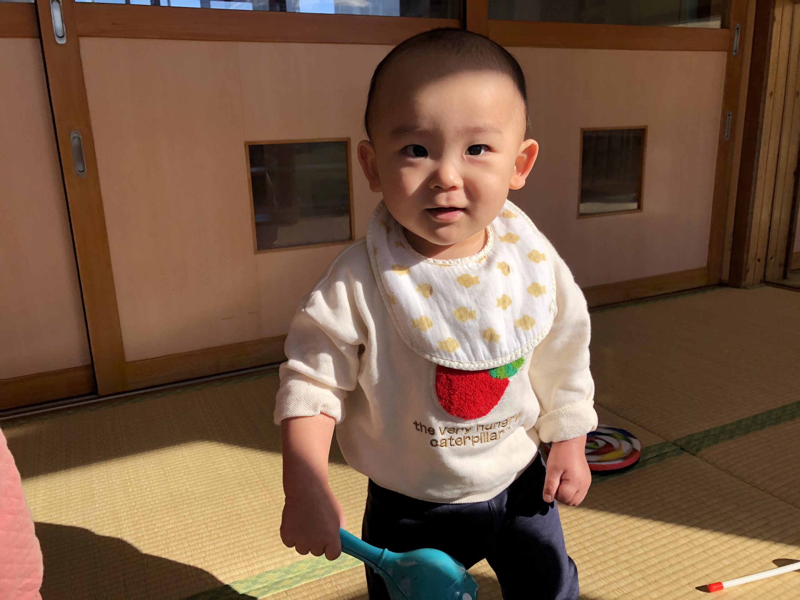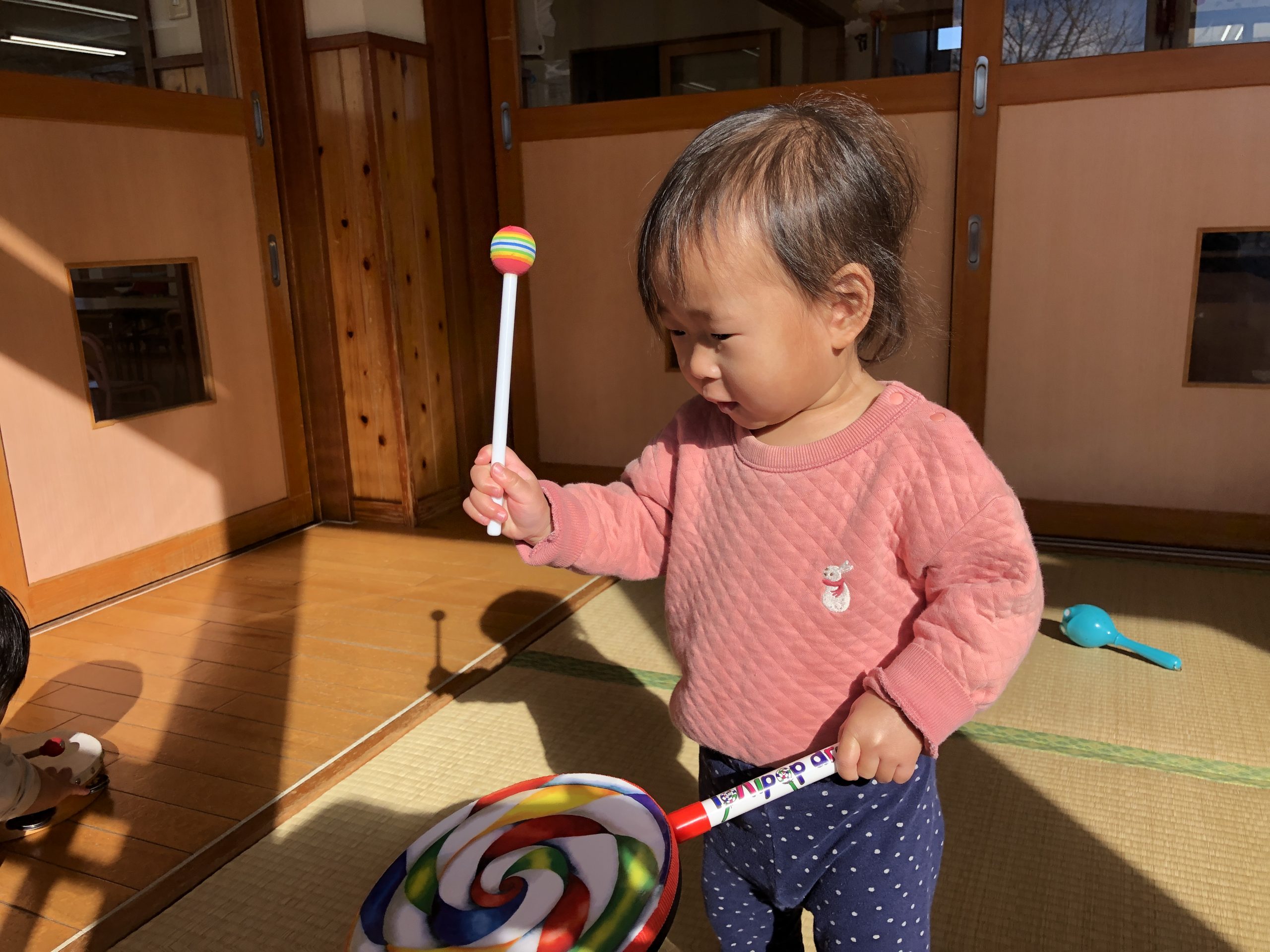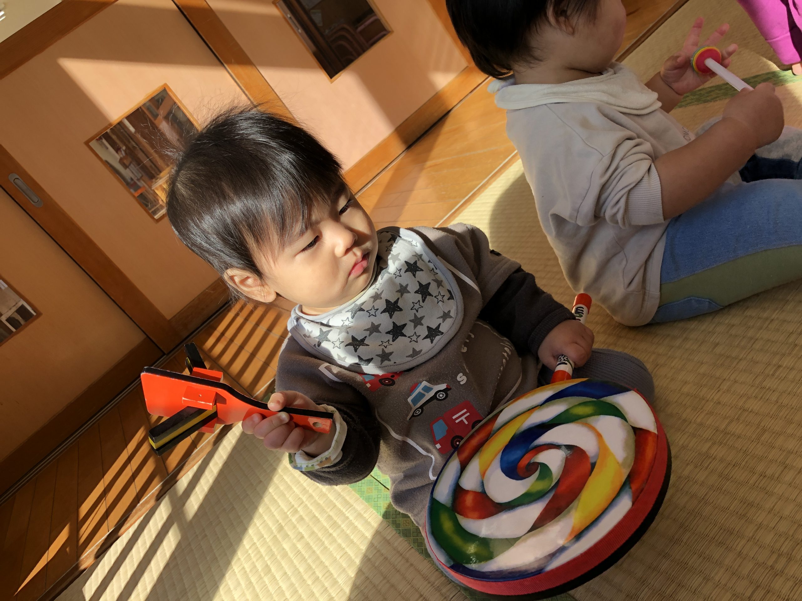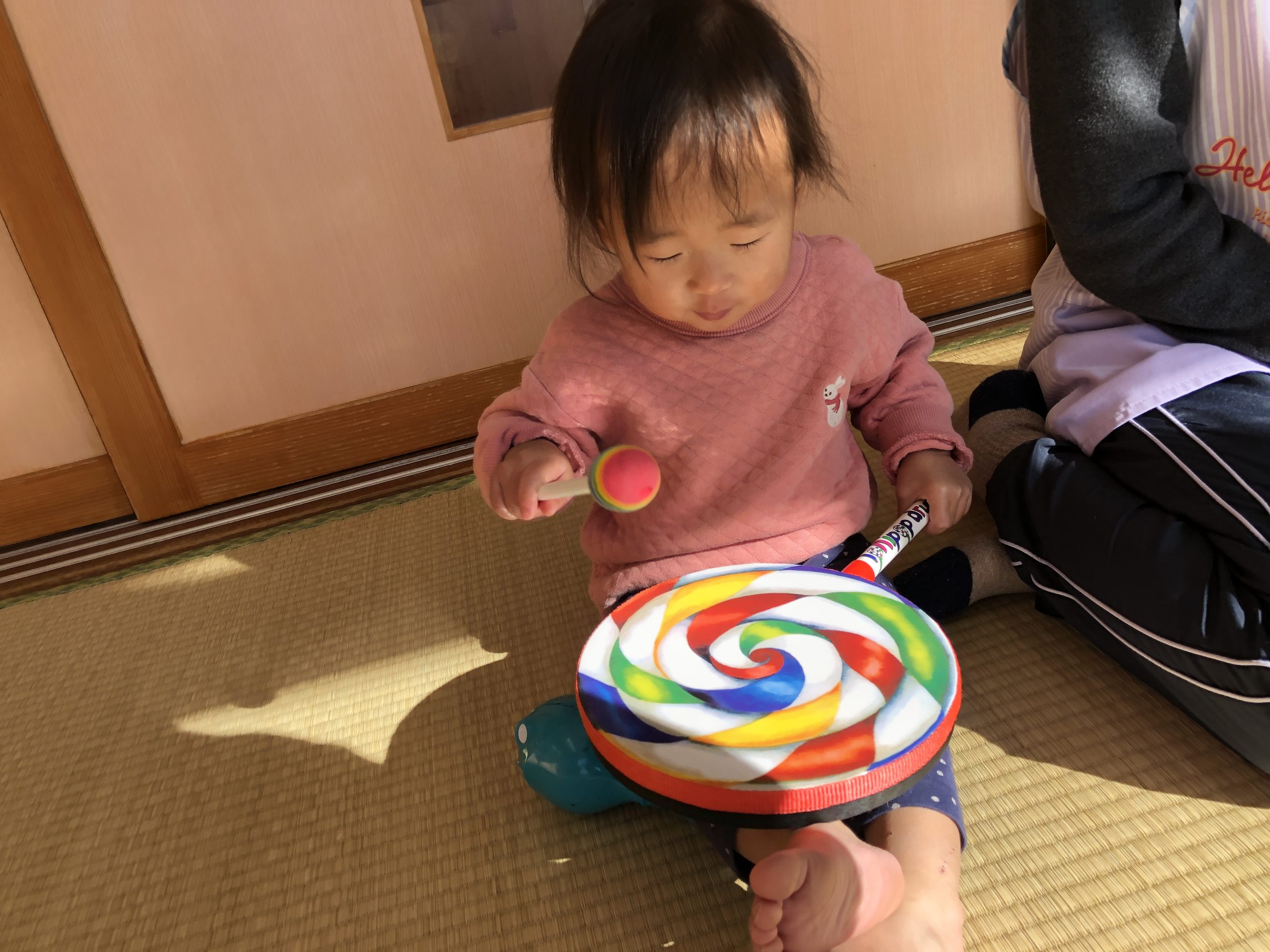 今日は畳のお部屋でリズムあそび&音のなるおもちゃあそびをしました。🎵からだダンダン体操♫の音楽に合わせて、体を動かしたり、手あそびうたにあわせて、手あそびをしたりしました。音の鳴るおもちゃでは、太鼓、鈴、タンバリン、マラカスなどの楽器を鳴らして、遊びました🎼