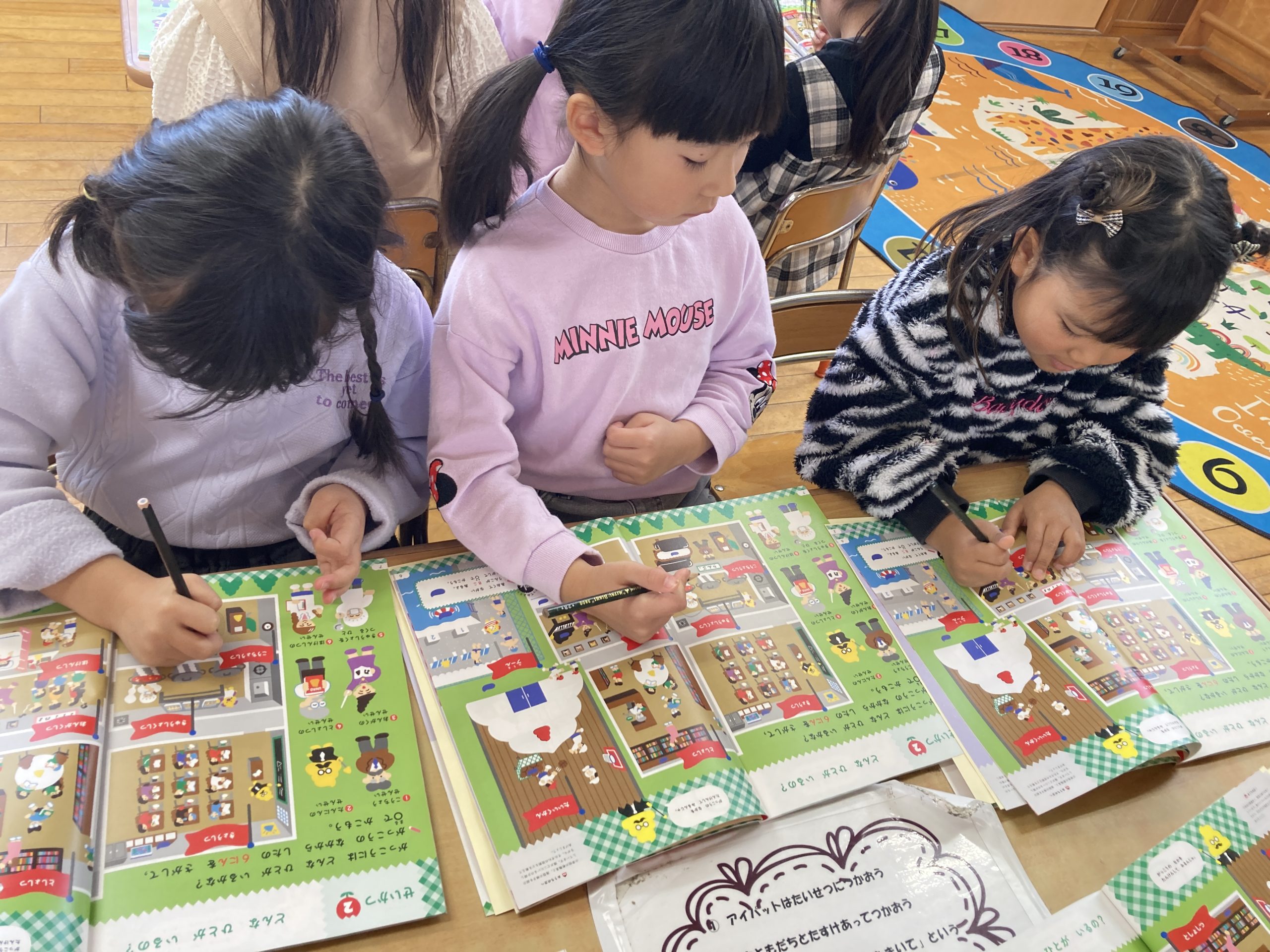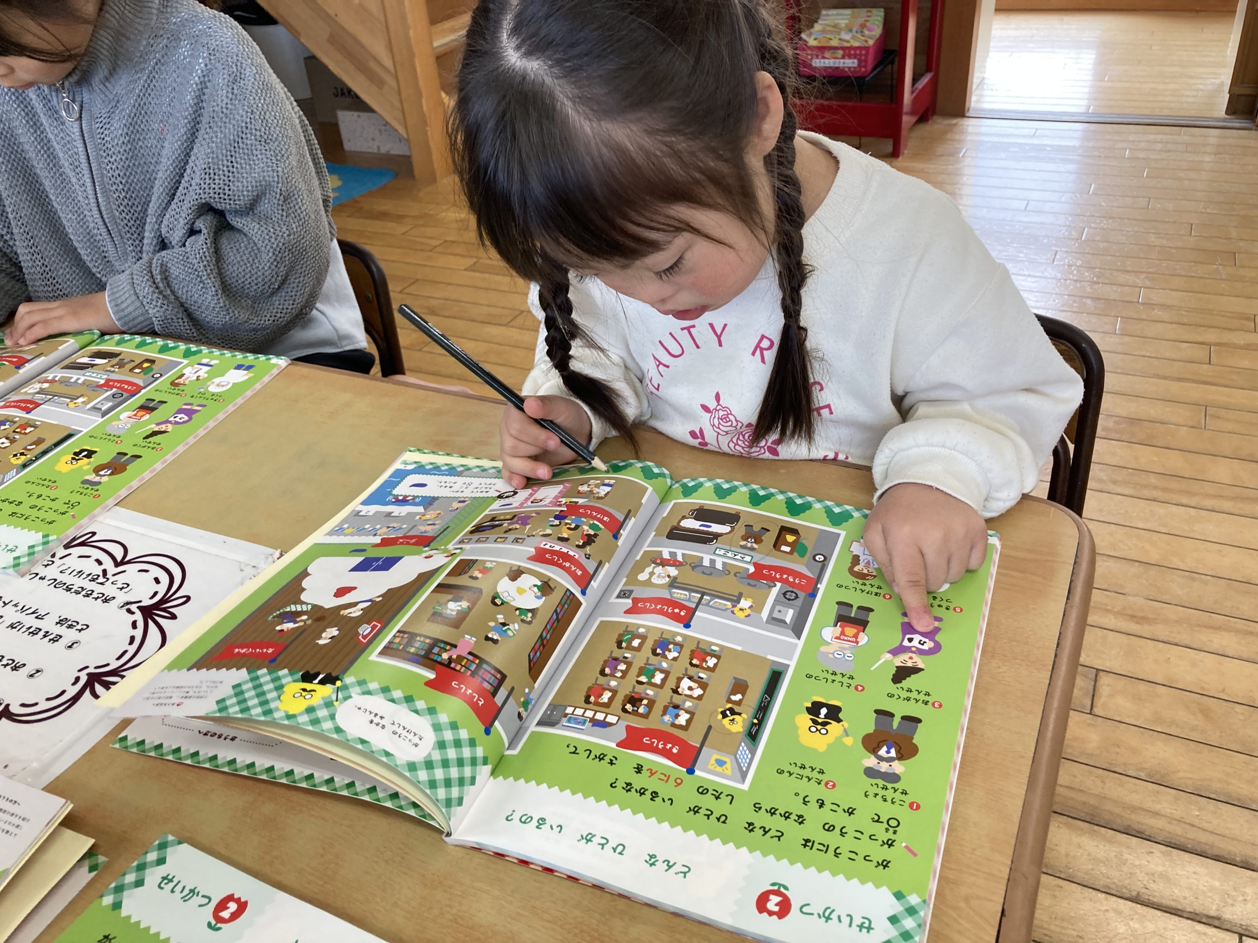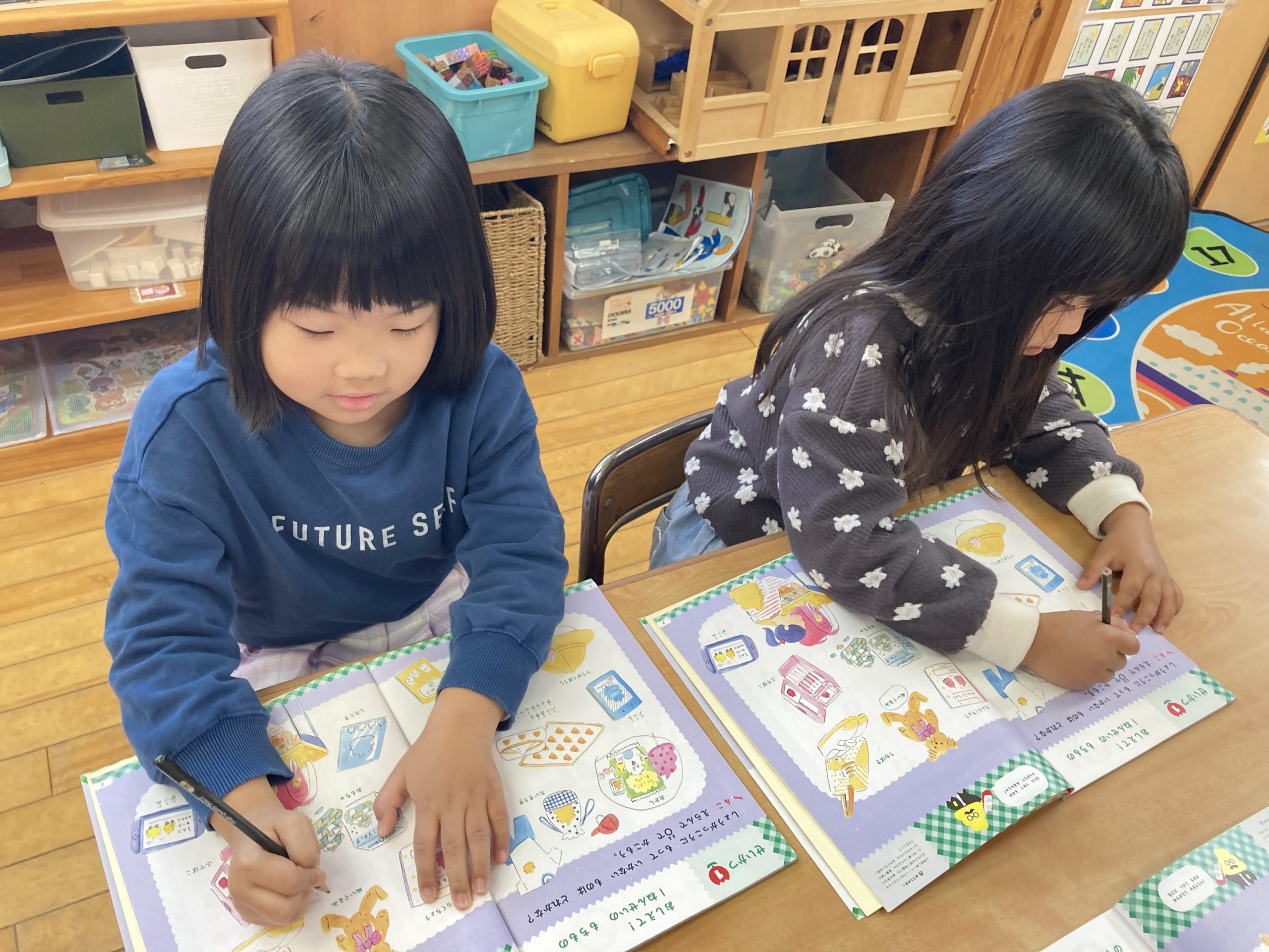 今日は、ドリルを使ってもじかずあそびをしました。自分で考えながら問題を解いていました。2ページ分問題をしましたが「もっとしたーい」とこれから取り組んでいくのを楽しみにしていました。