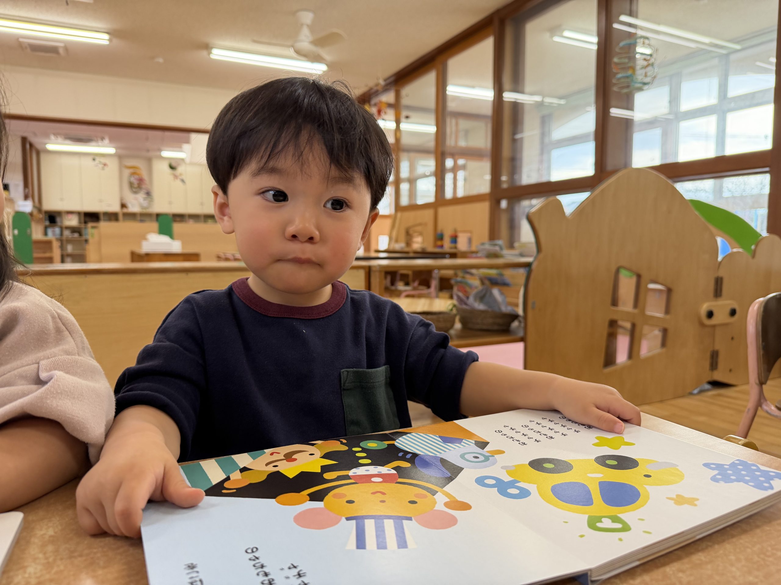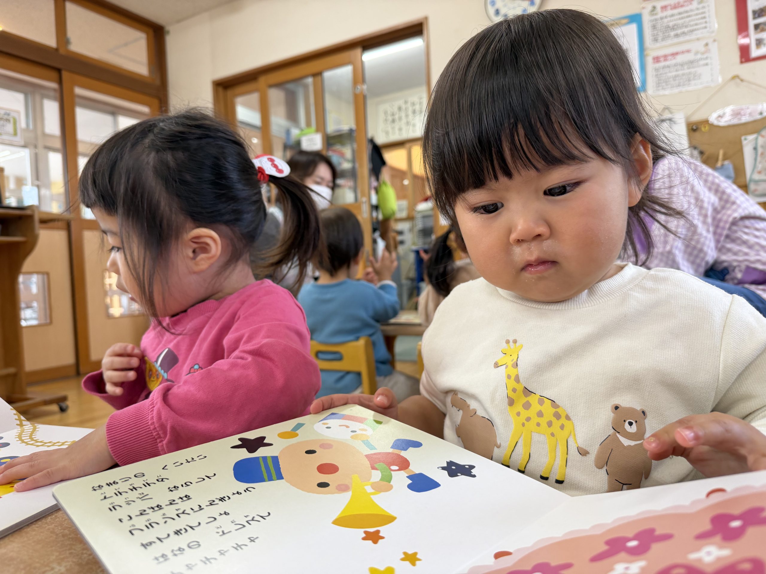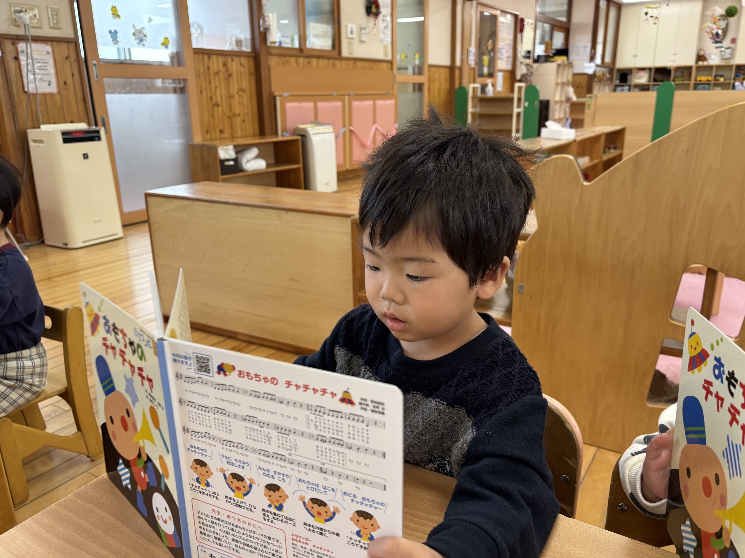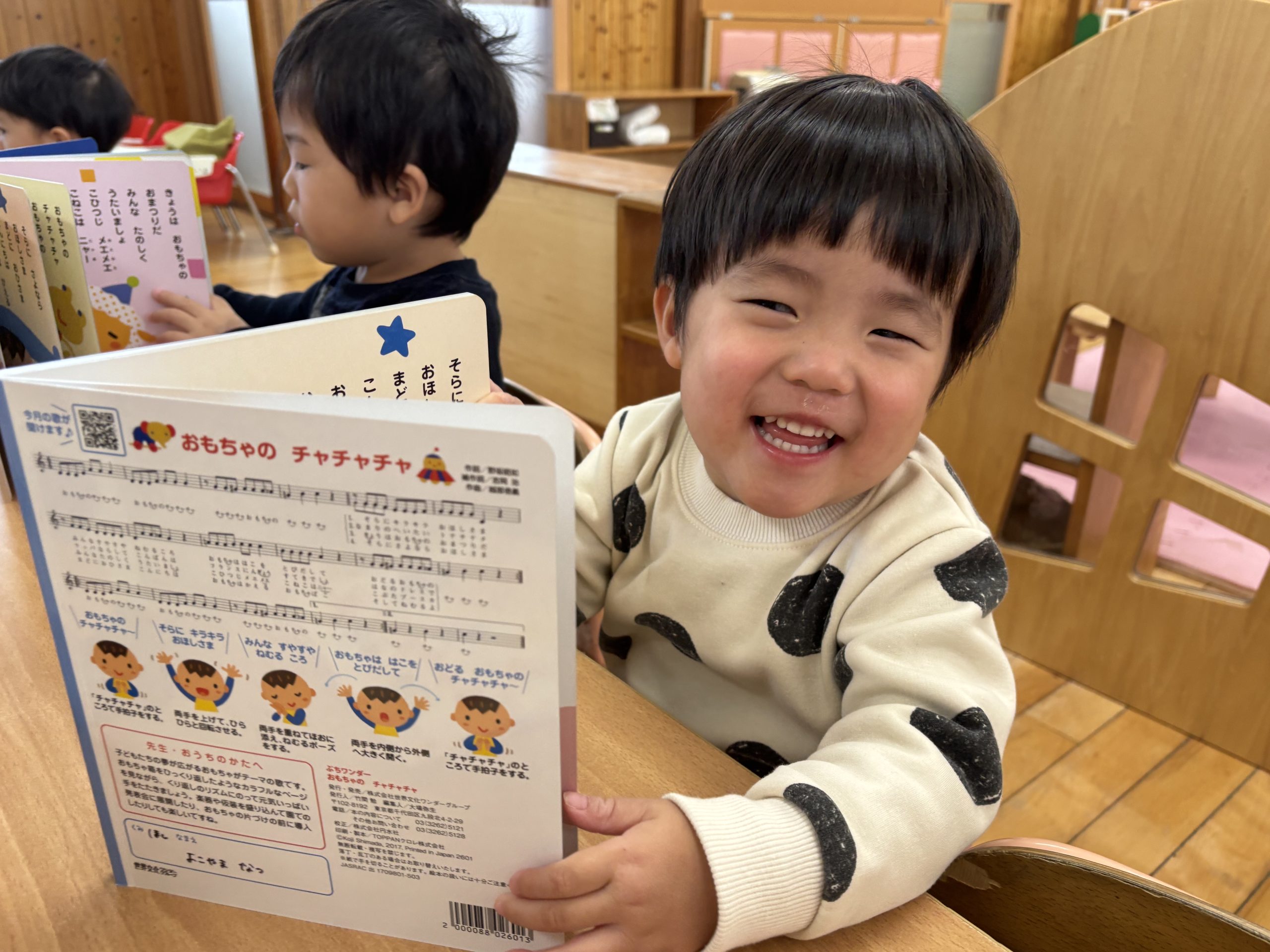 今日は月刊絵本「おもちゃのチャチャチャ」を見ました🎵音楽に合わせて歌を歌ったりと楽しそうに絵本を見ていましたよ😊