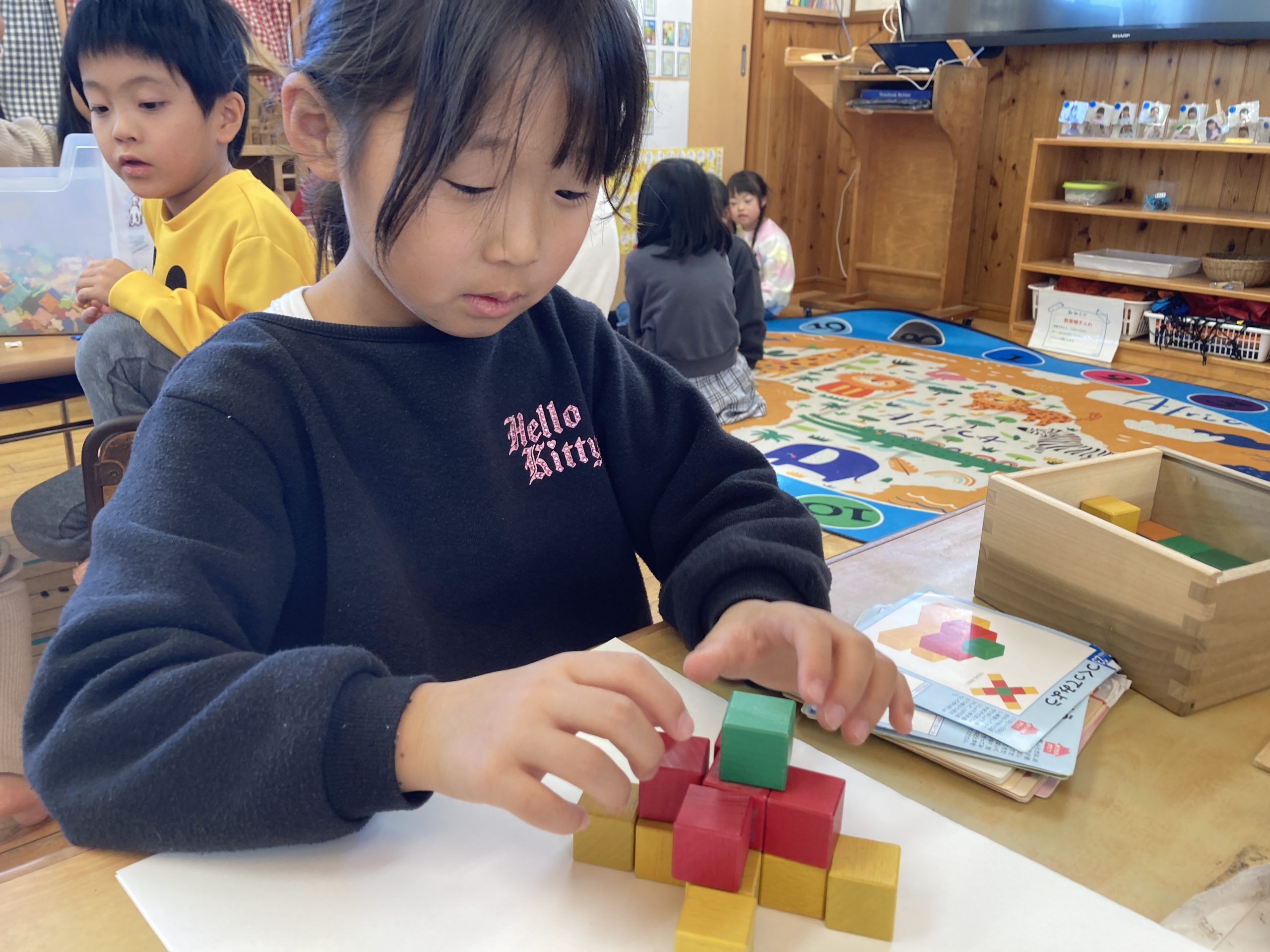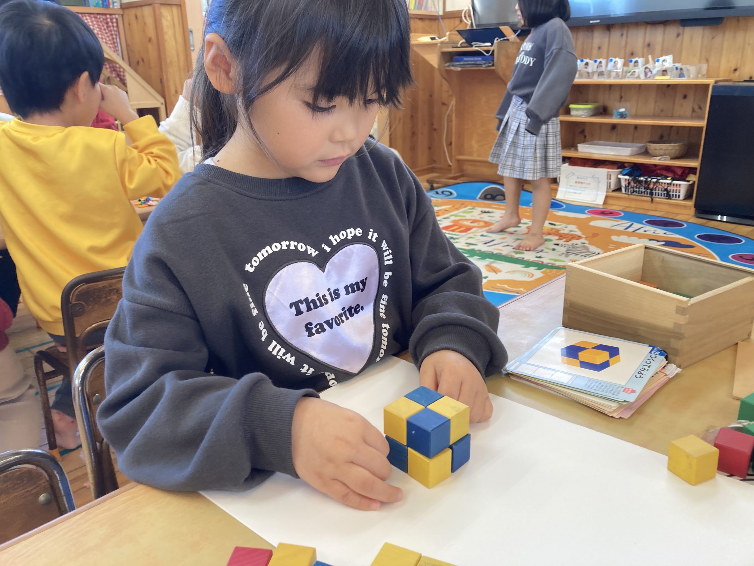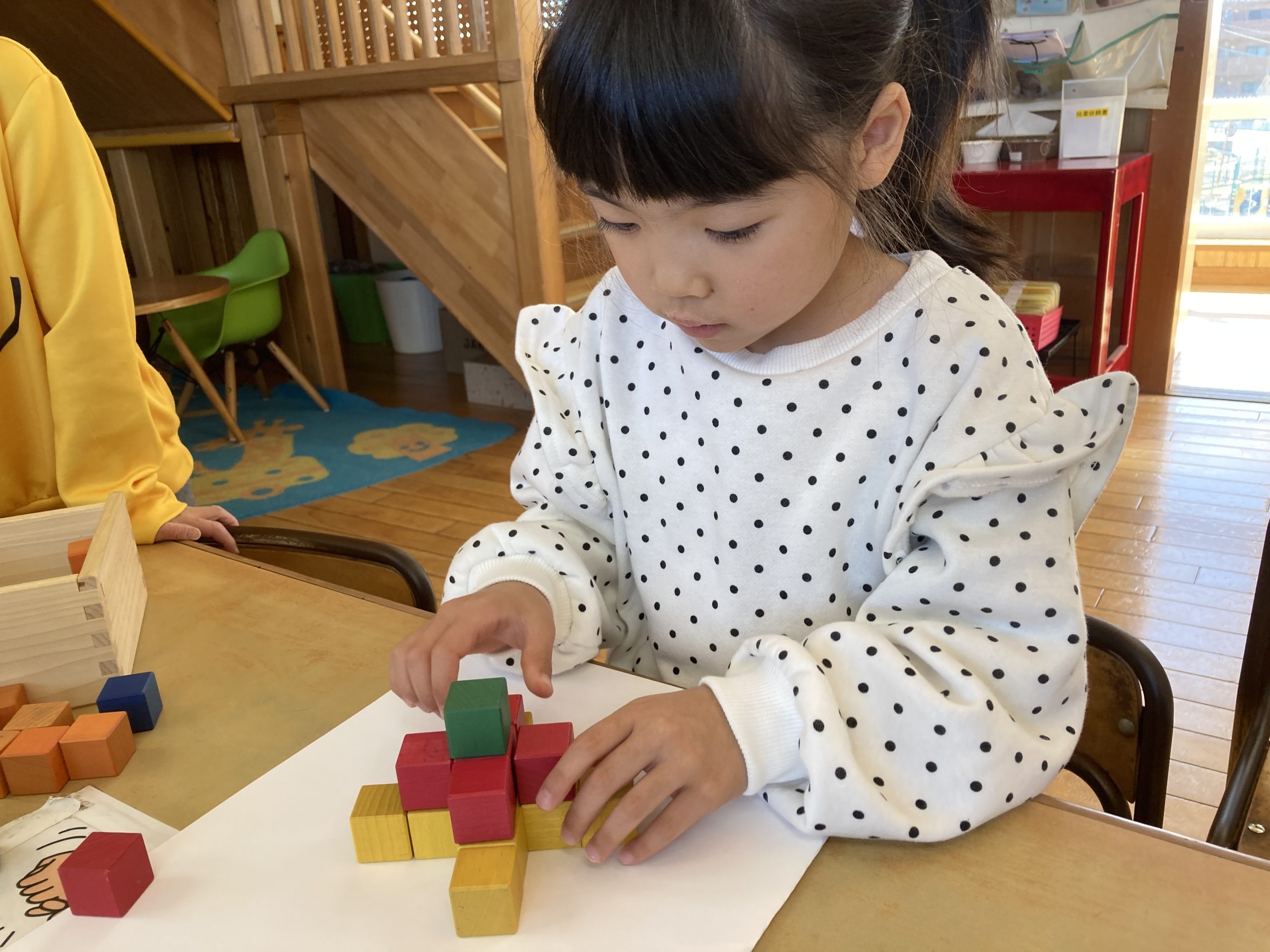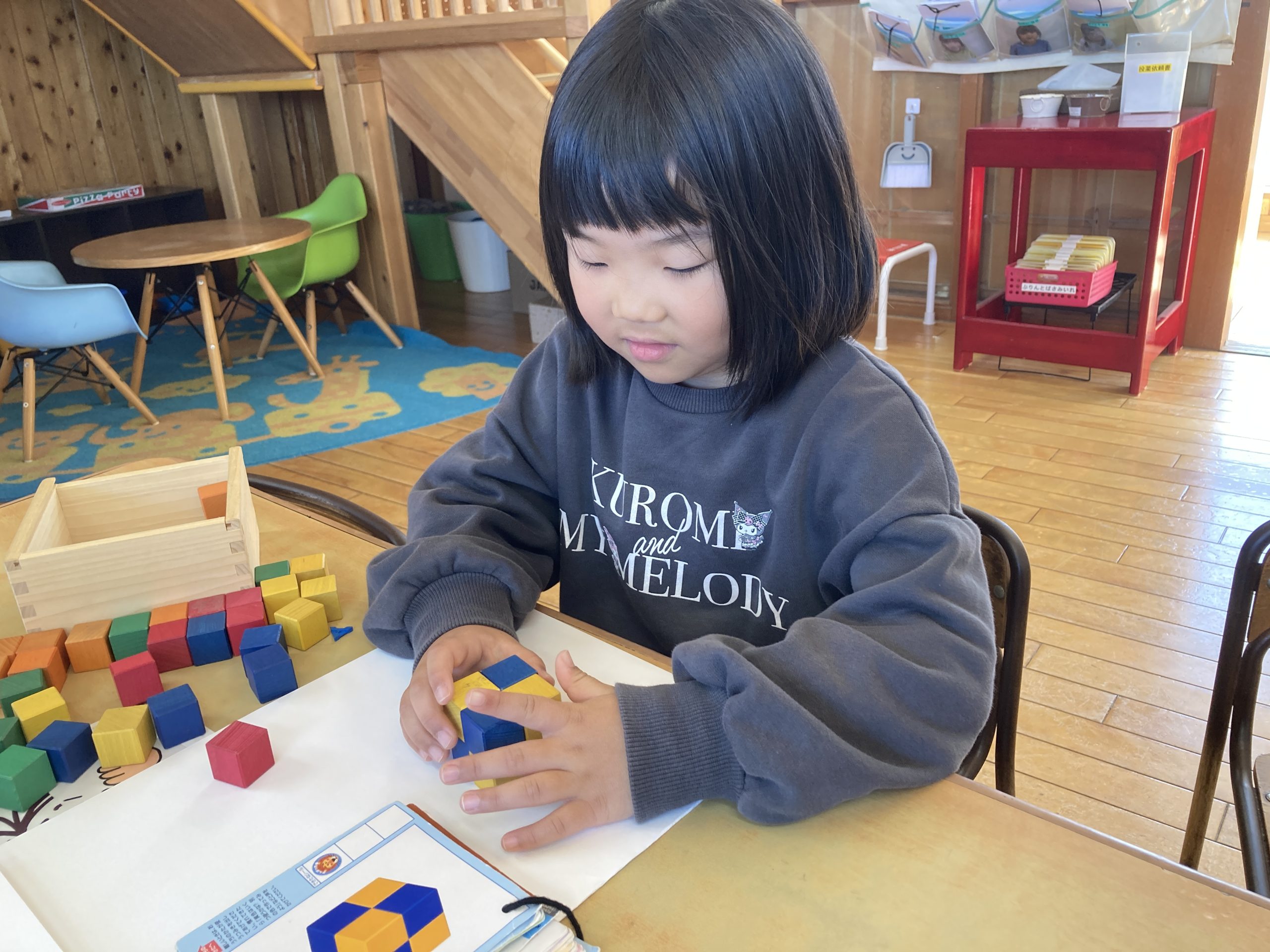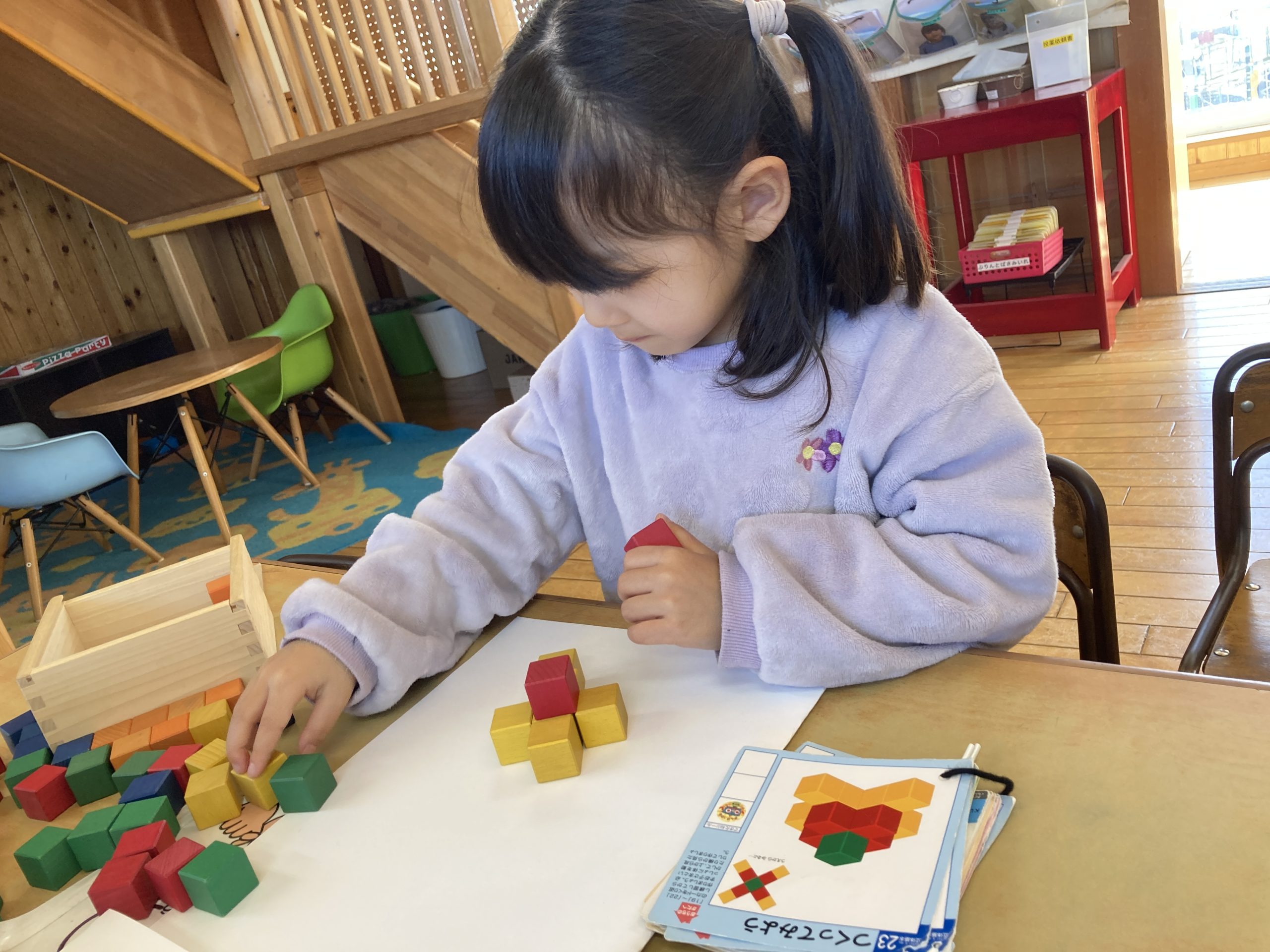 今日は、「くもんキューブ」に取り組みました。見本のカードを見ながら、カードと同じようにキューブを組み合わせて、平面や立体を完成させました。色や数を確認しながら、同じように完成させることができました。