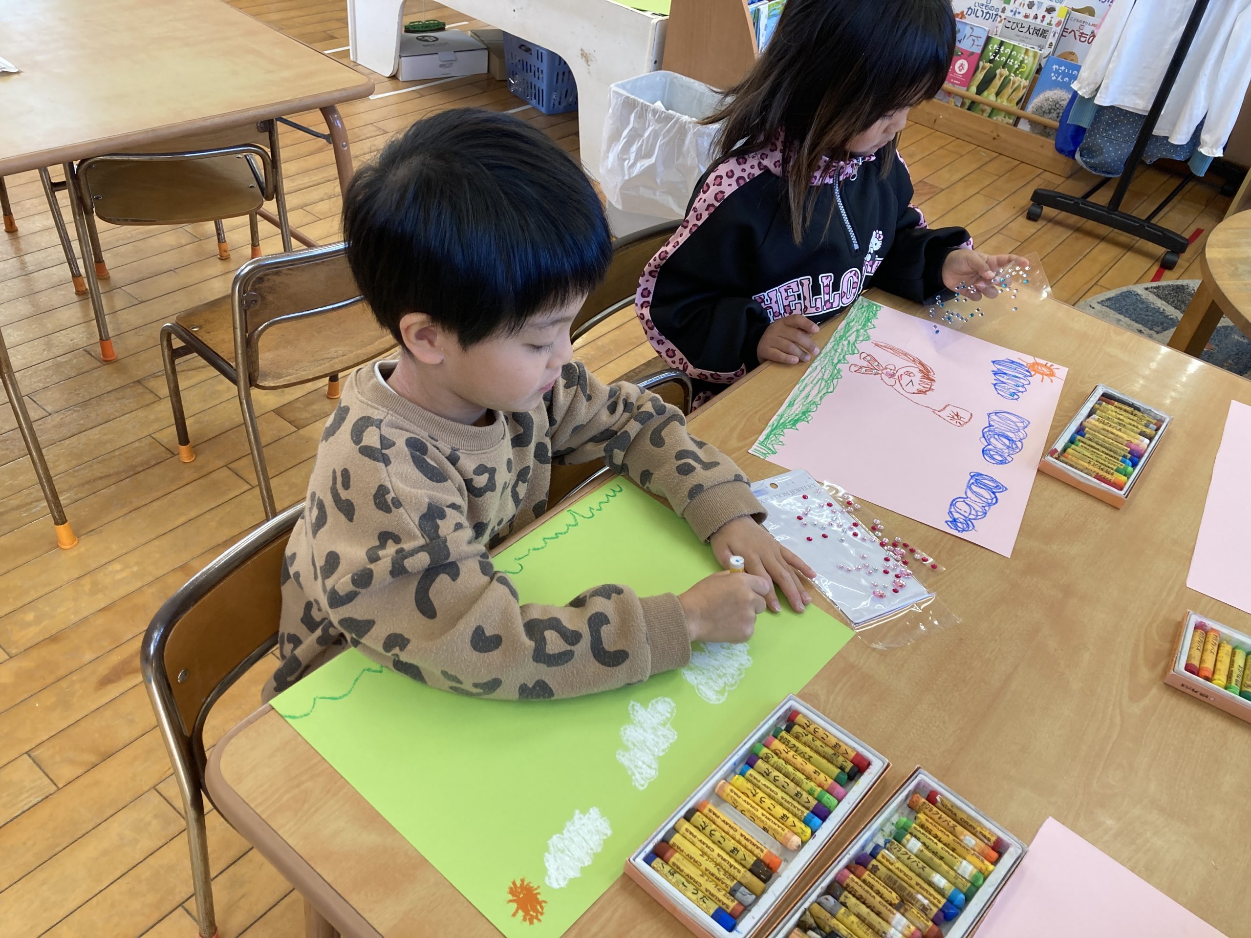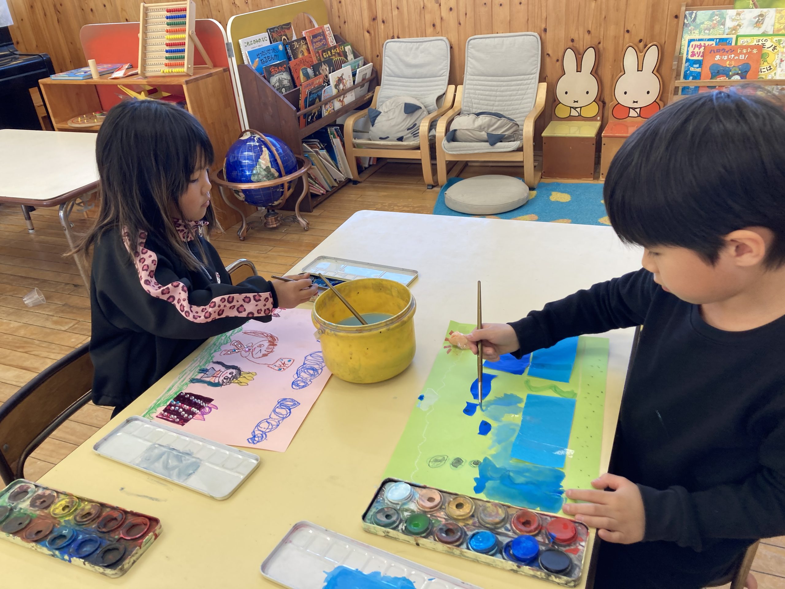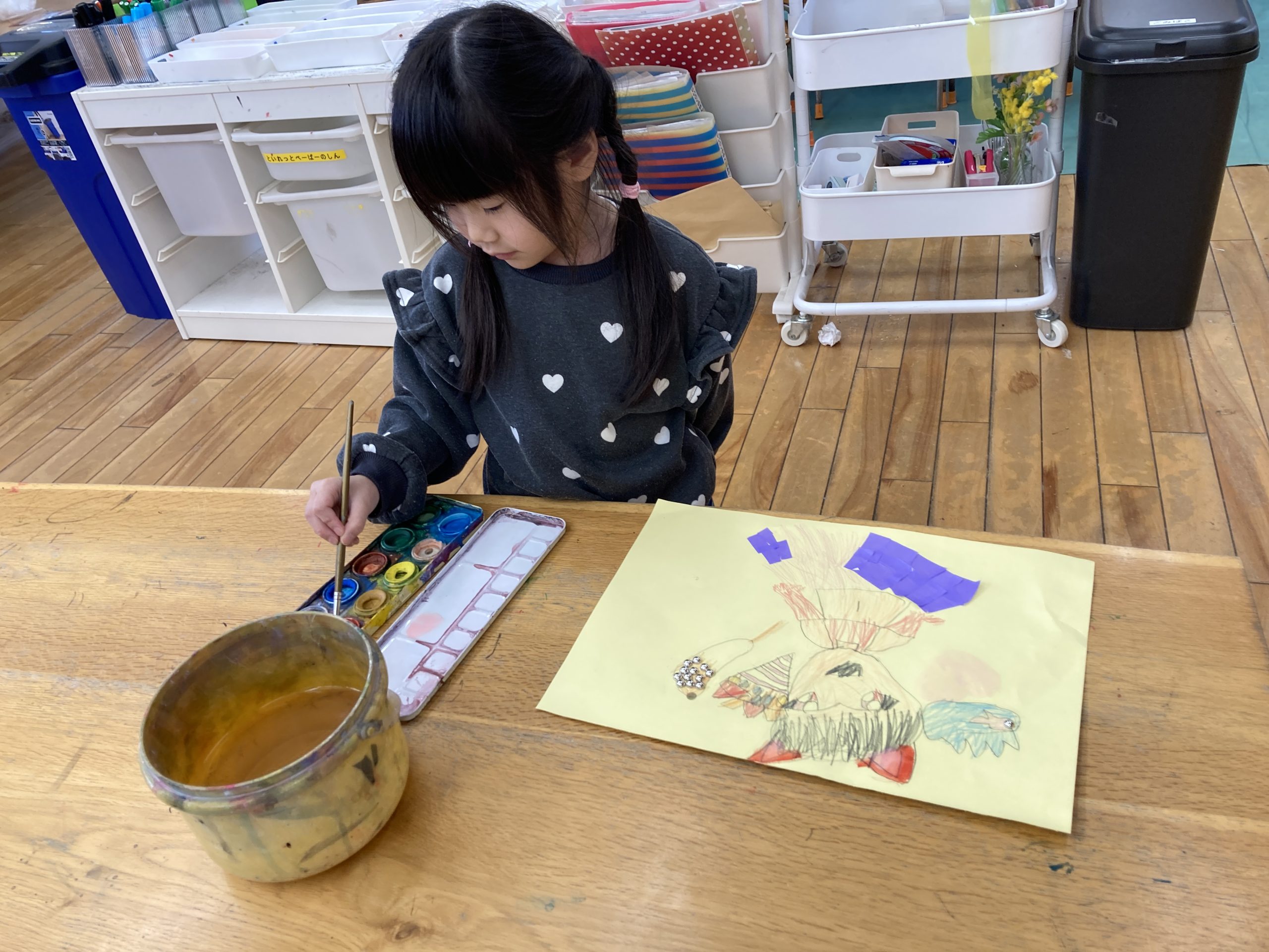 今日は、自分でテーマを決めて好きな絵を描きました。「お正月」「ゆき」などそれぞれ絵の具や折り紙などいろいろな材料を使って完成させていました。