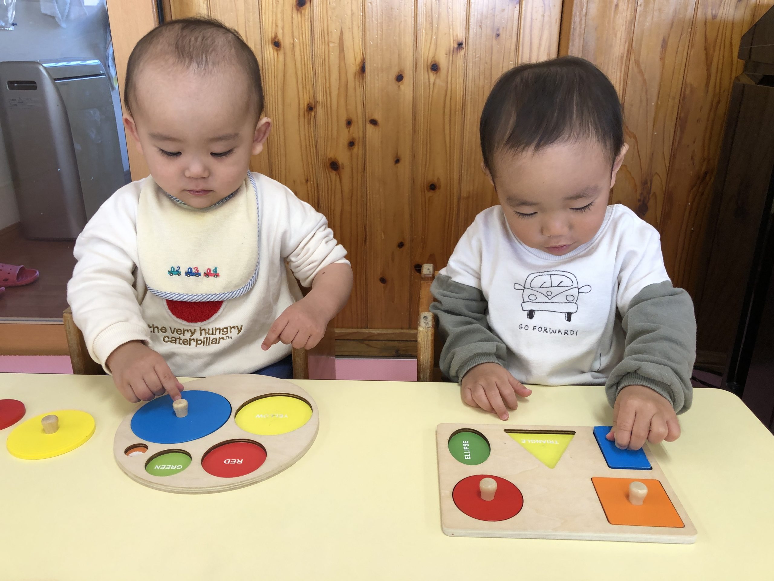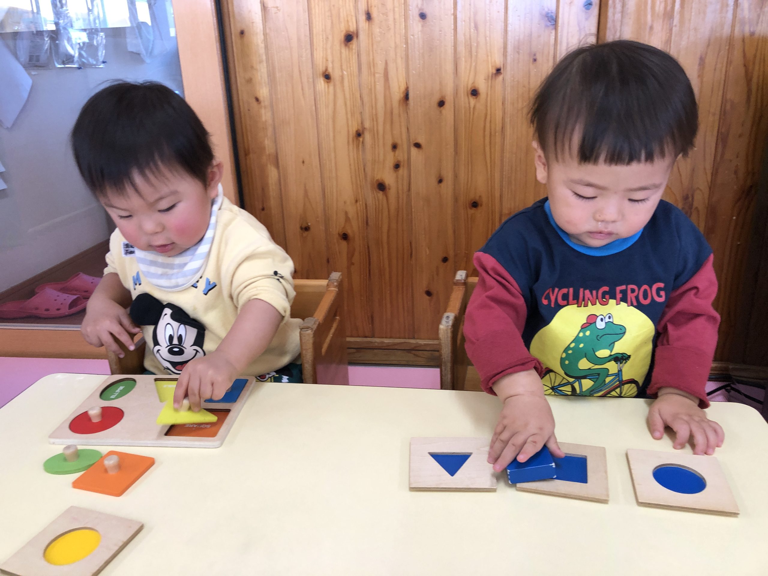 今日は、◯や△・⬜︎の型はめを使って形の認知あそびをしました。置いたり、外したりしながら挑戦!ハマる場所を探して遊んでいました。