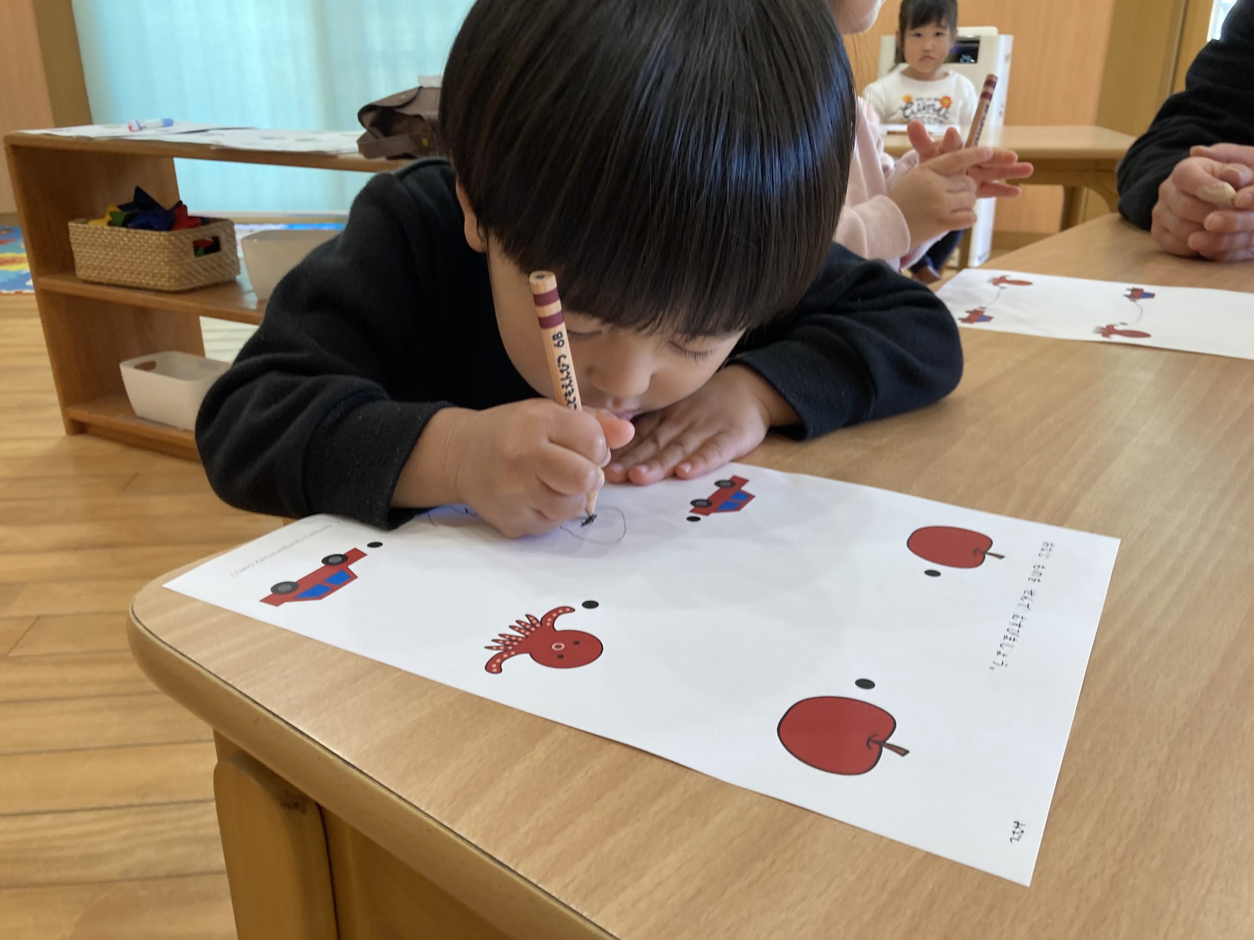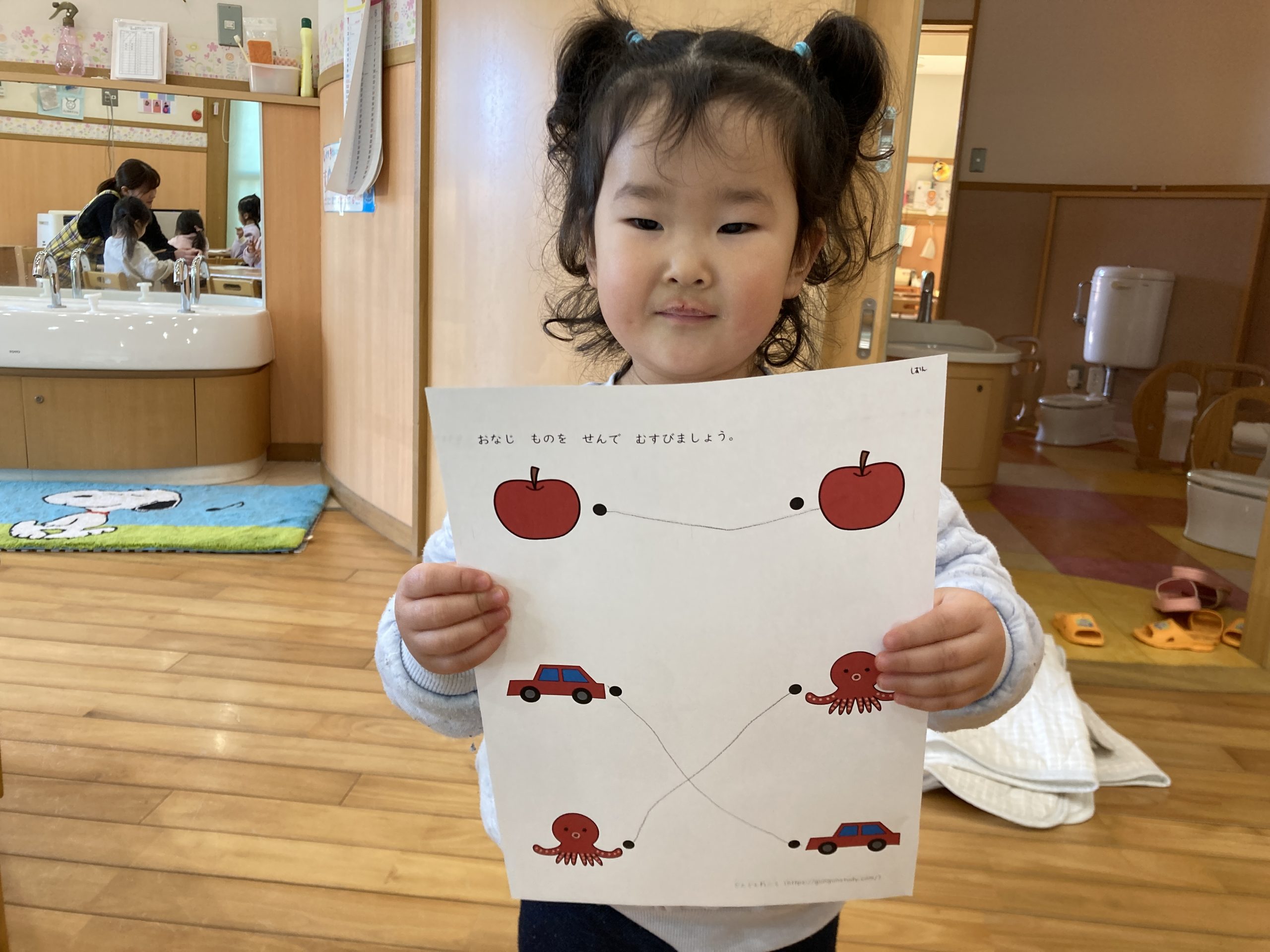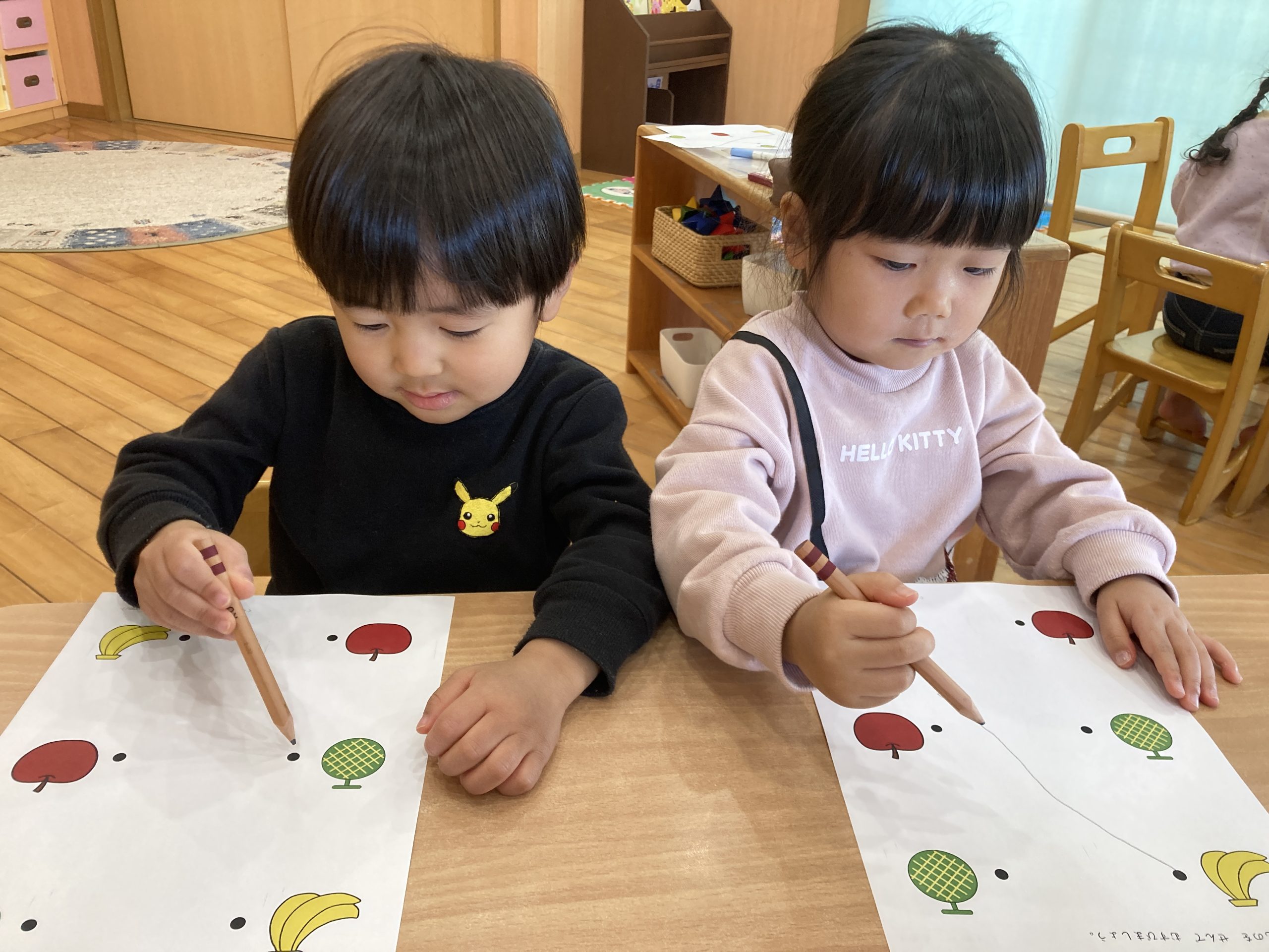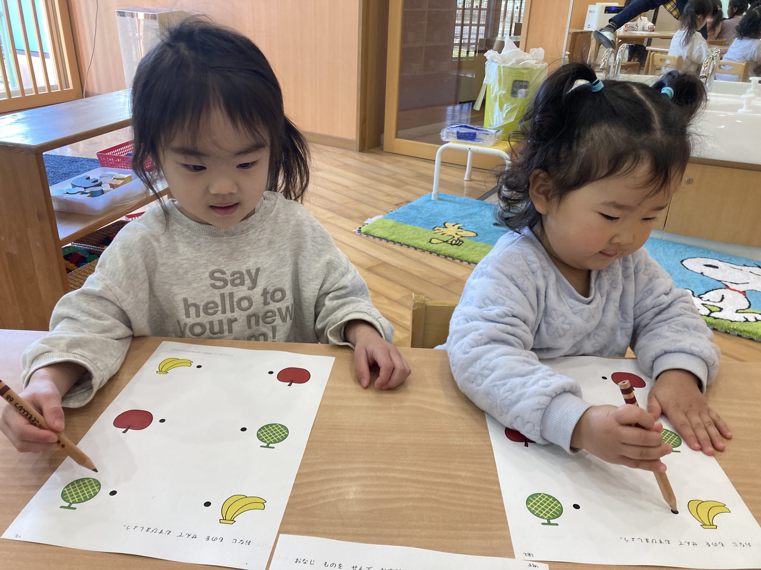今日は、わけっこ遊びをしました!🍎同じものを探しながら、集中して線を結んでいましたよ✨🐙