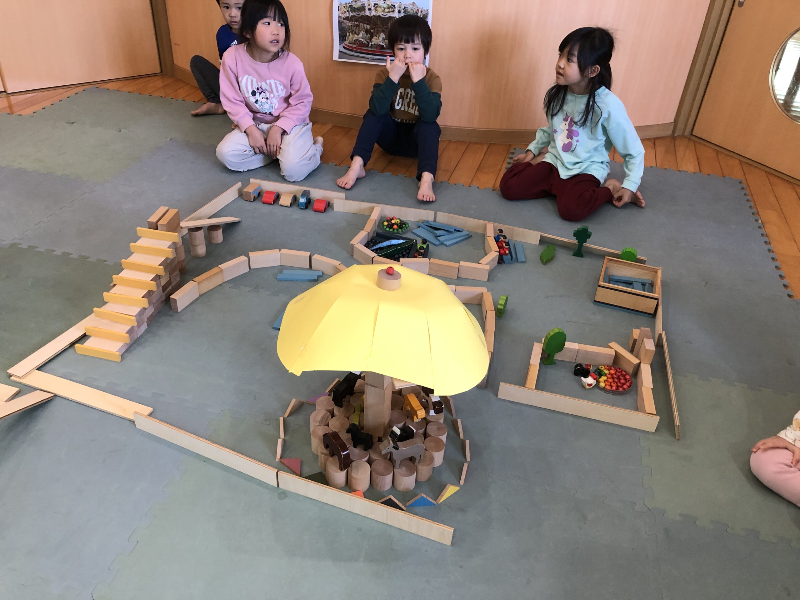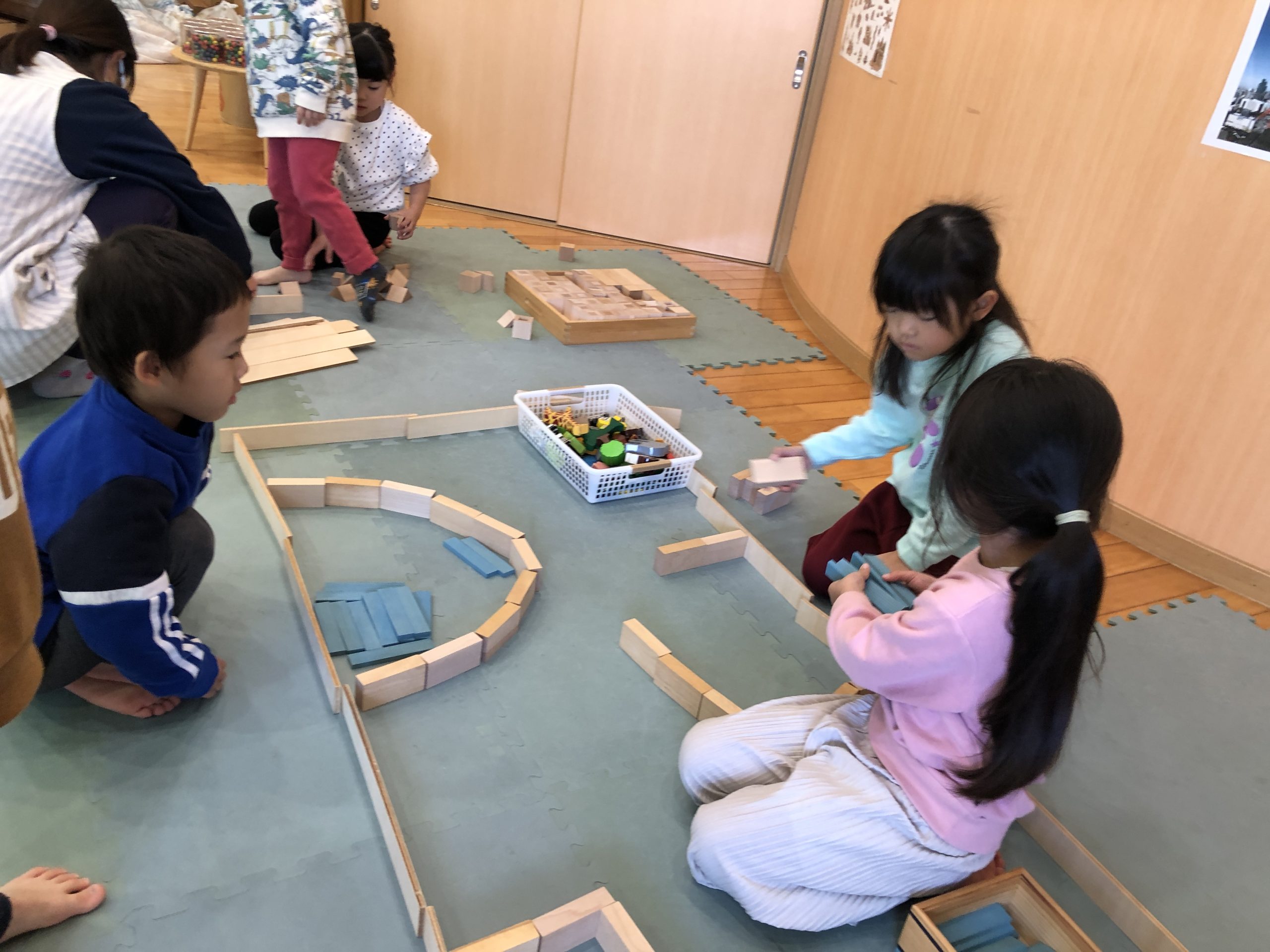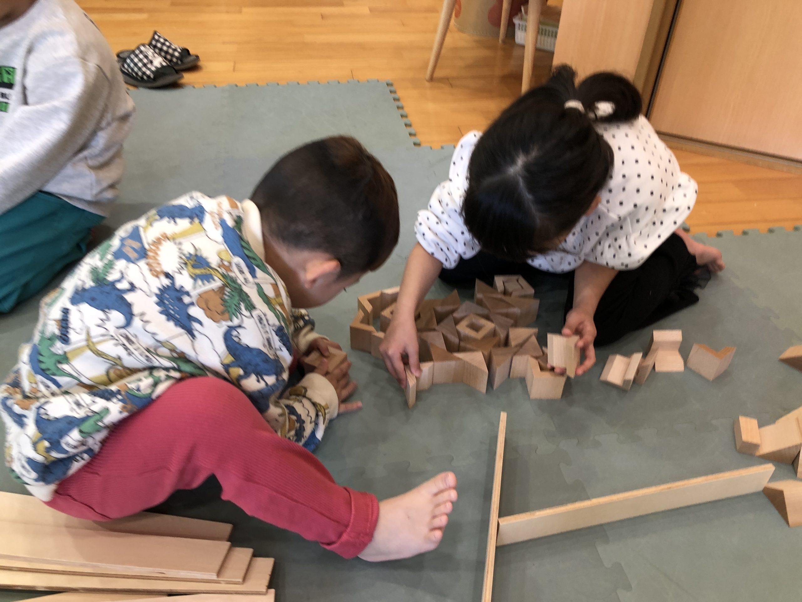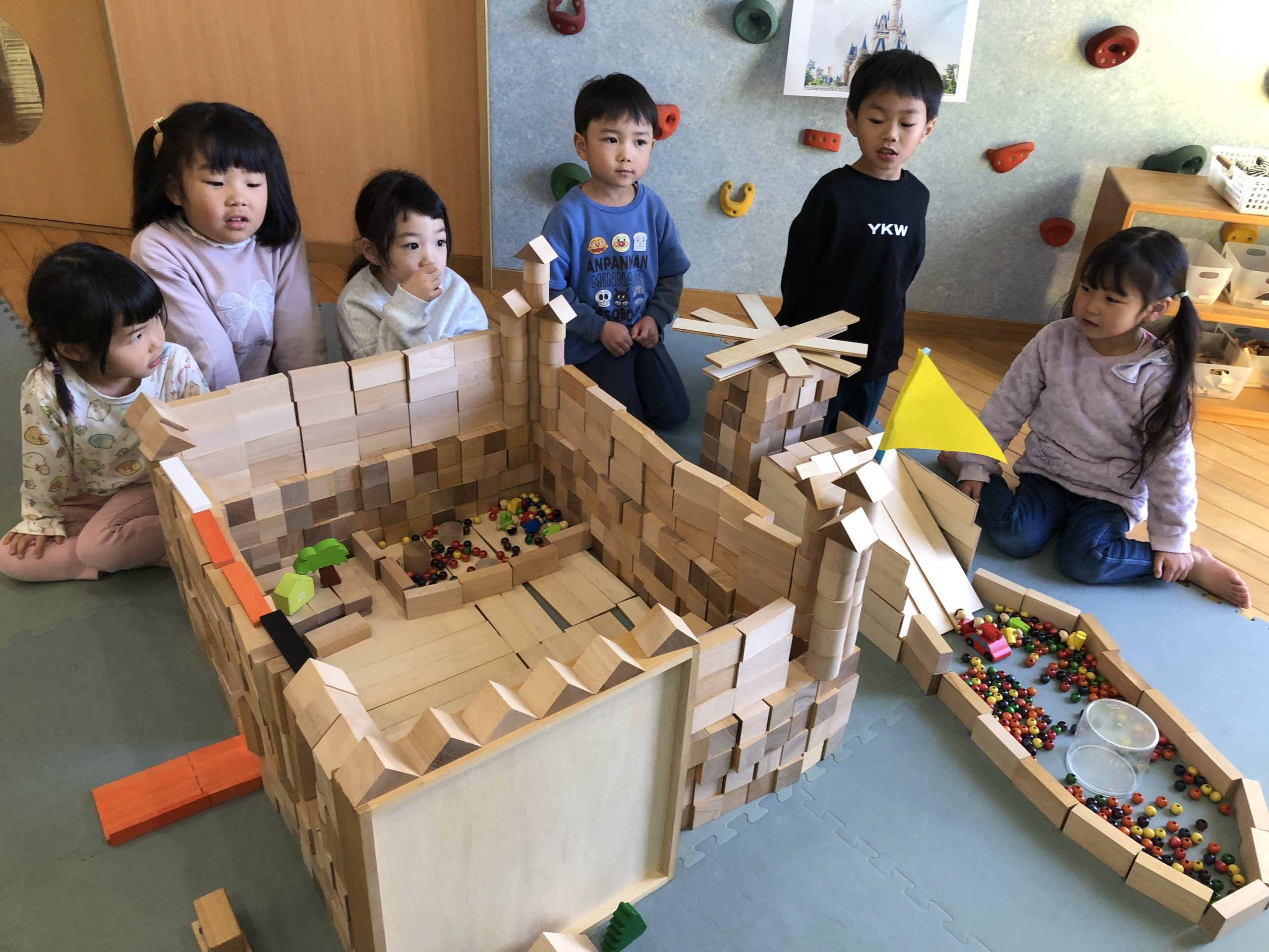 今日の異年齢グループは積み木遊びをしました🌳グループに別れ、お城・ディズニーのホテル・お家・動物園・雪の結晶を作りましたよ!!遊んでいくうちに…「動物園に遊園地を作ろう!」「ホテルにプール作るのはどうかな?」「人が入れるくらいの大きいお家にしようよ!」と話し合いながら進める姿が見られ、それぞれのおグループが楽しんで取り組んでいましたよ😊✨