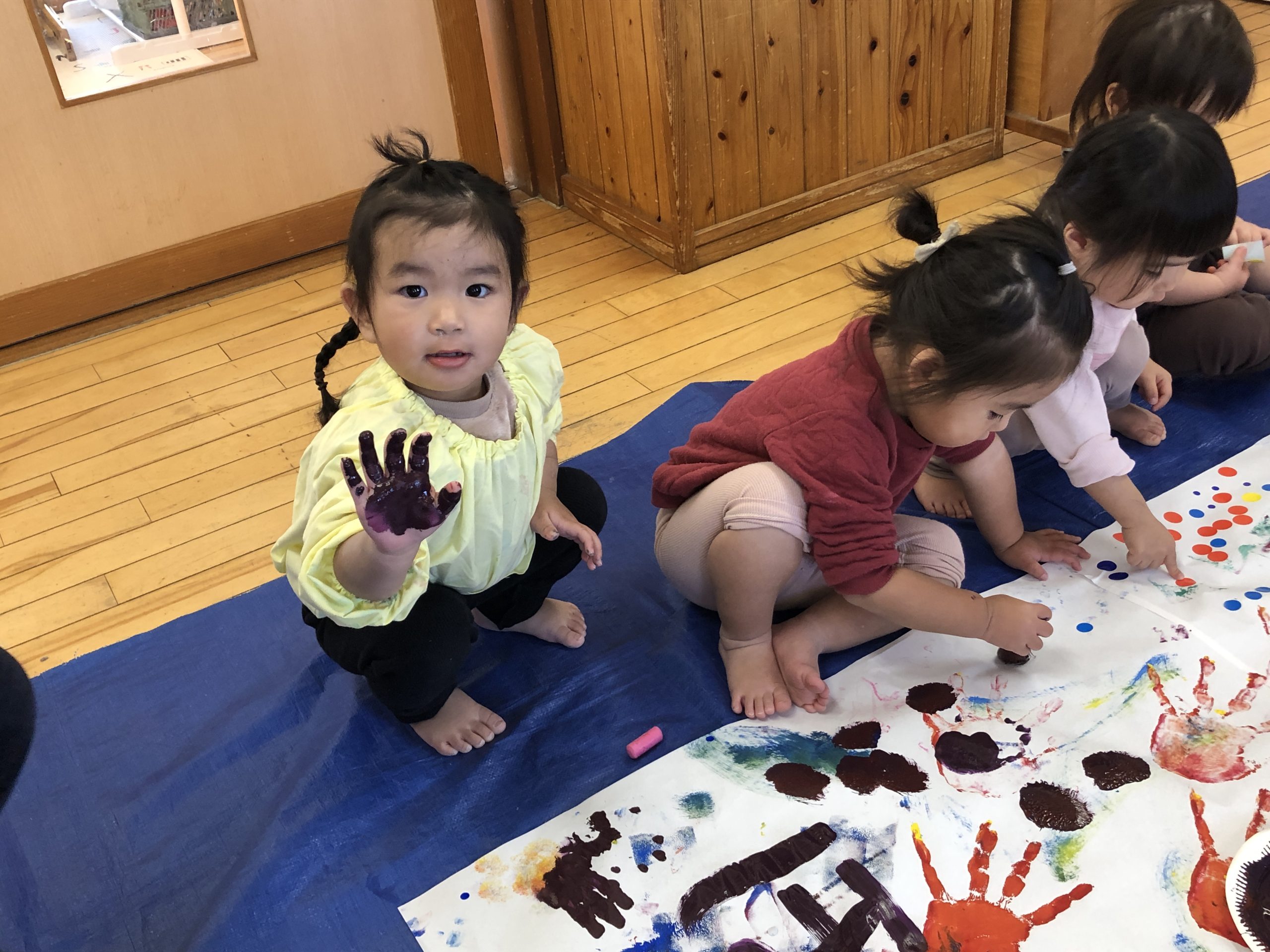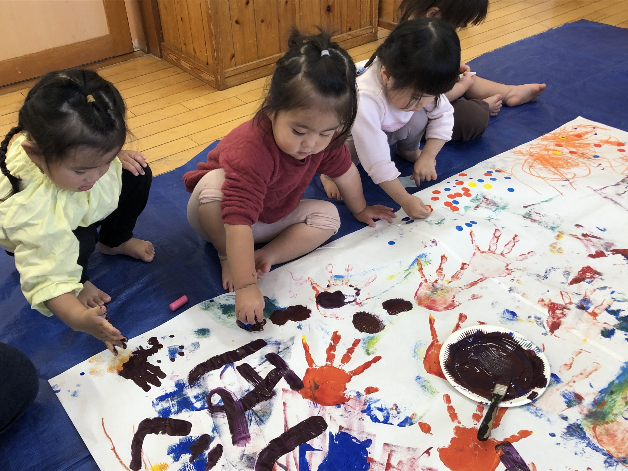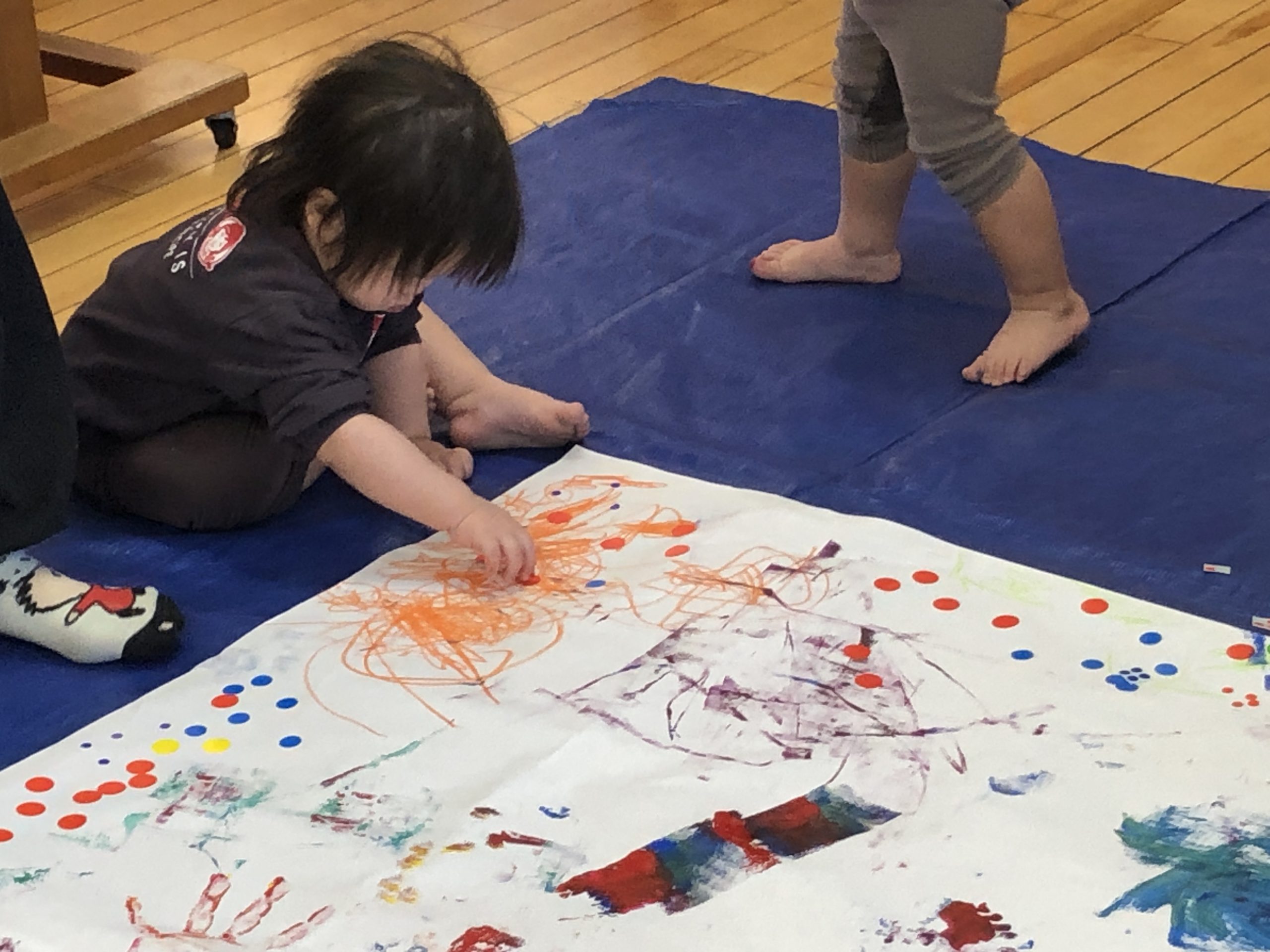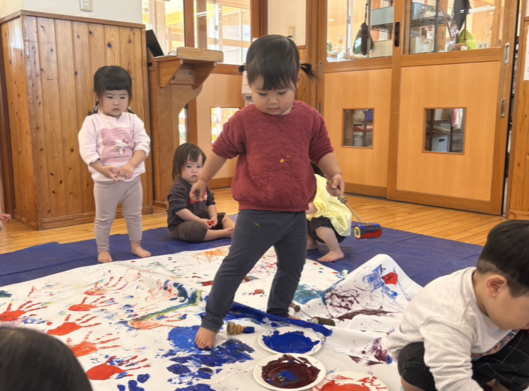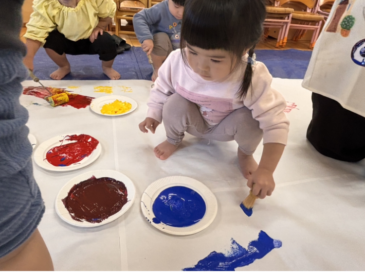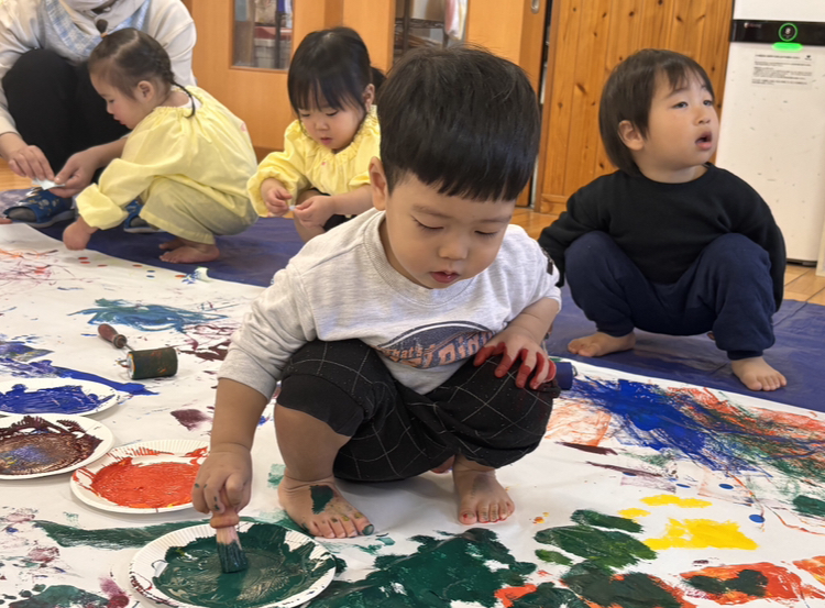 今日は造形あそびをしました!絵の具、折り紙、シール、クレヨンと様々な道具を使ってダイナミックに遊びました✨