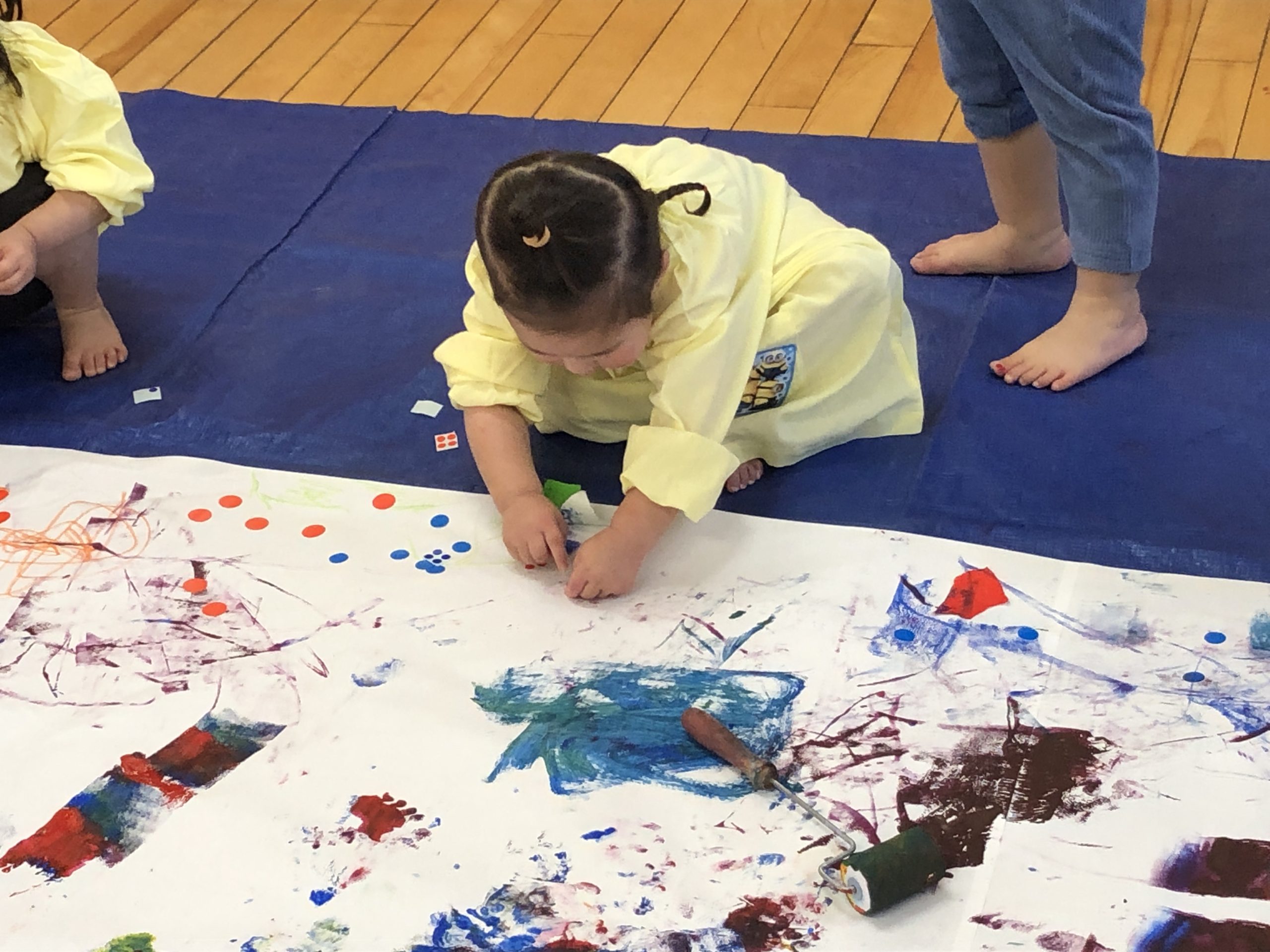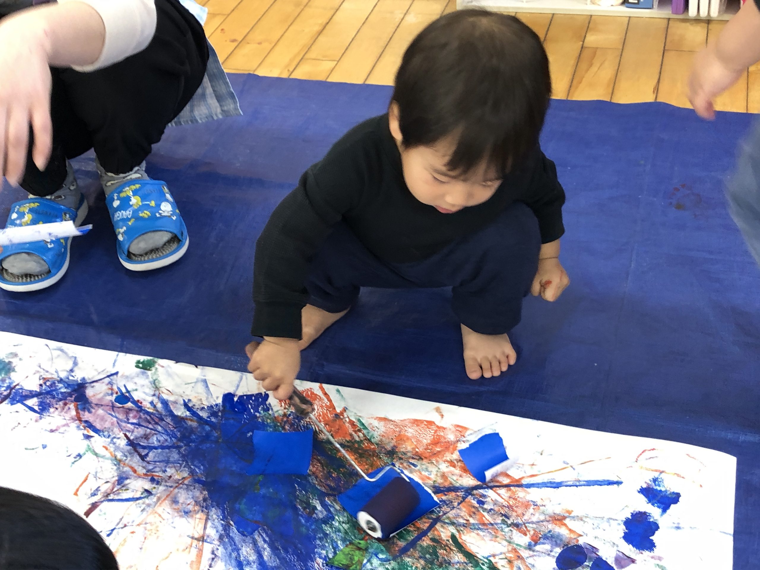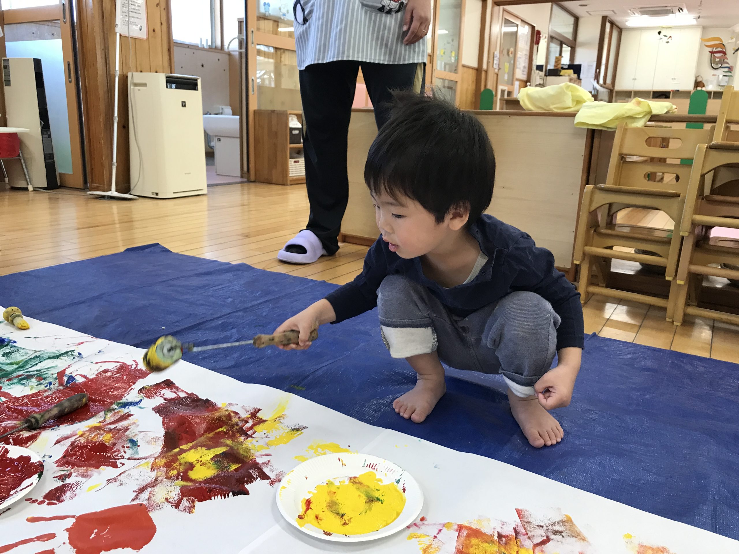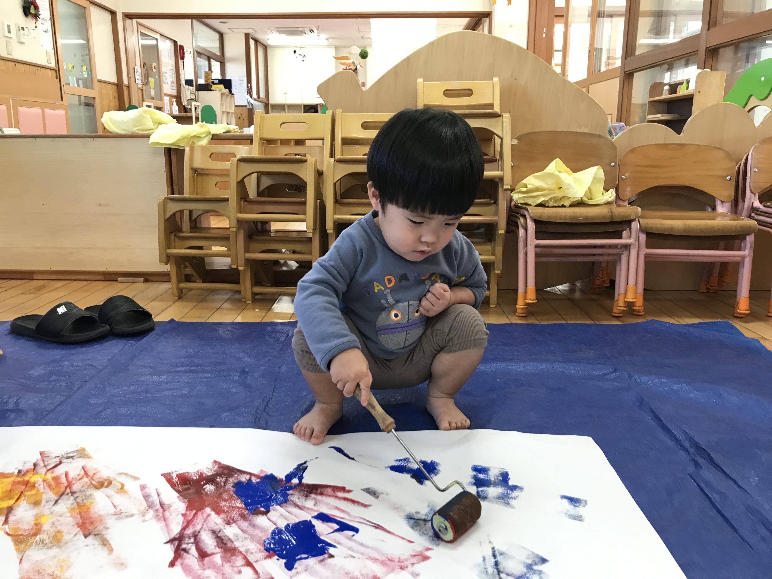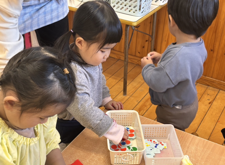 今日は造形あそびをしました!絵の具、折り紙、シール、クレヨンと様々な道具を使ってダイナミックに遊びました✨
