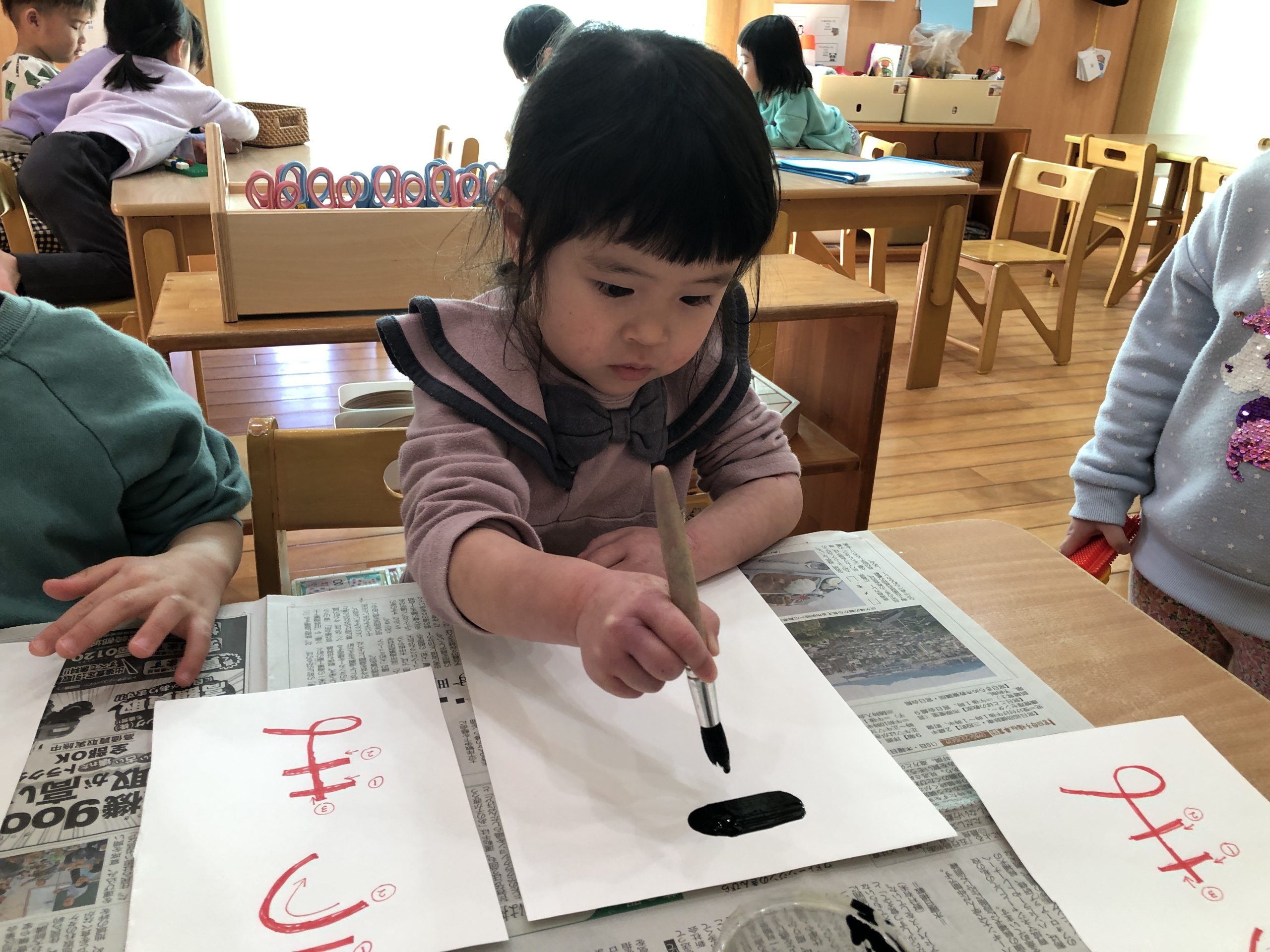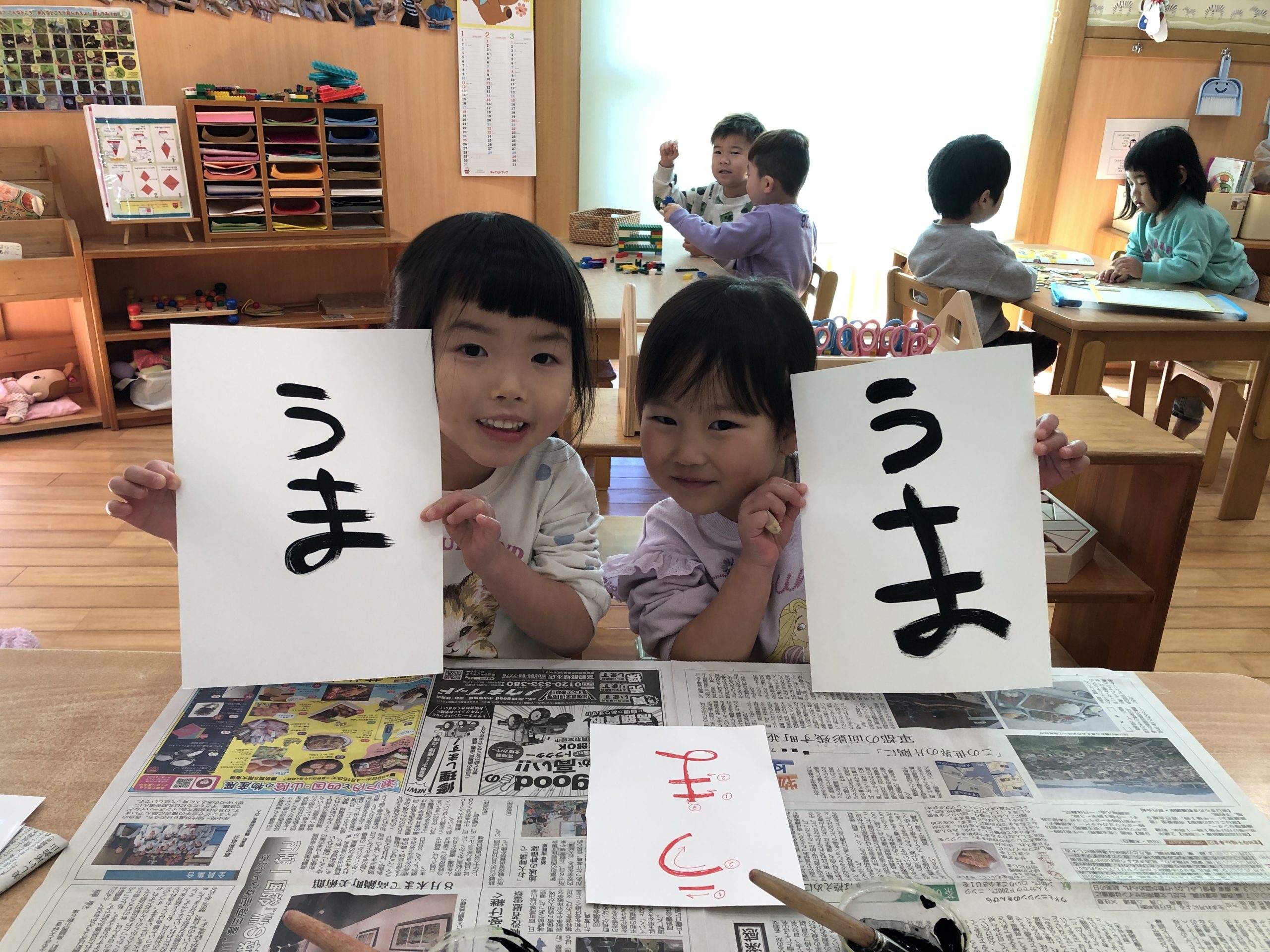 今日の体育遊びでは、縄跳び・長縄・三輪車・大型遊具・マラソン大会の練習をしました🌞長い距離でしたが、最後まで走り切る事ができましたよ✨体育遊びの後は、書初めに挑戦しました🖌みんなお手本を見ながら集中して書き『うま』と書くことができましたよ👏✨