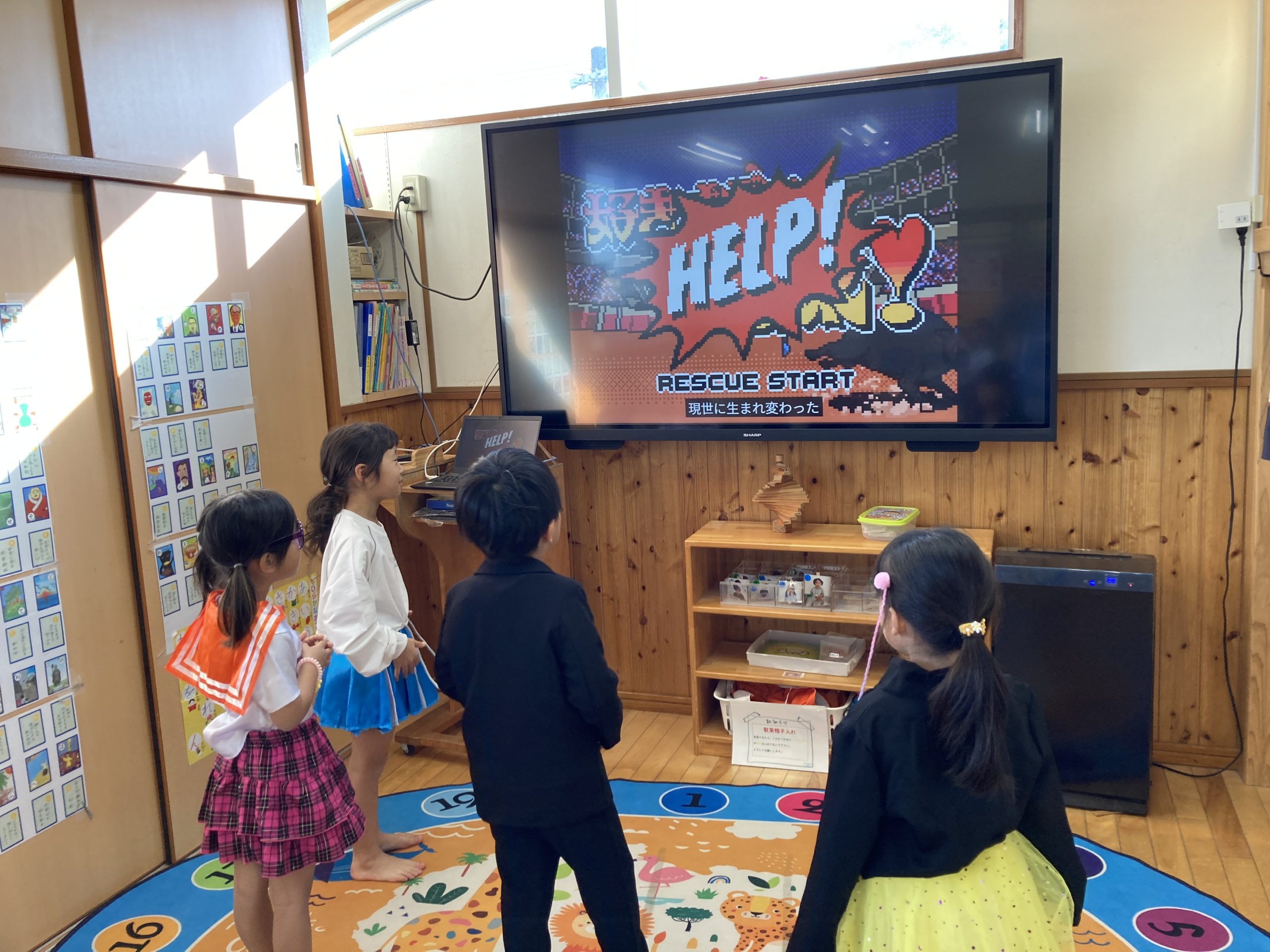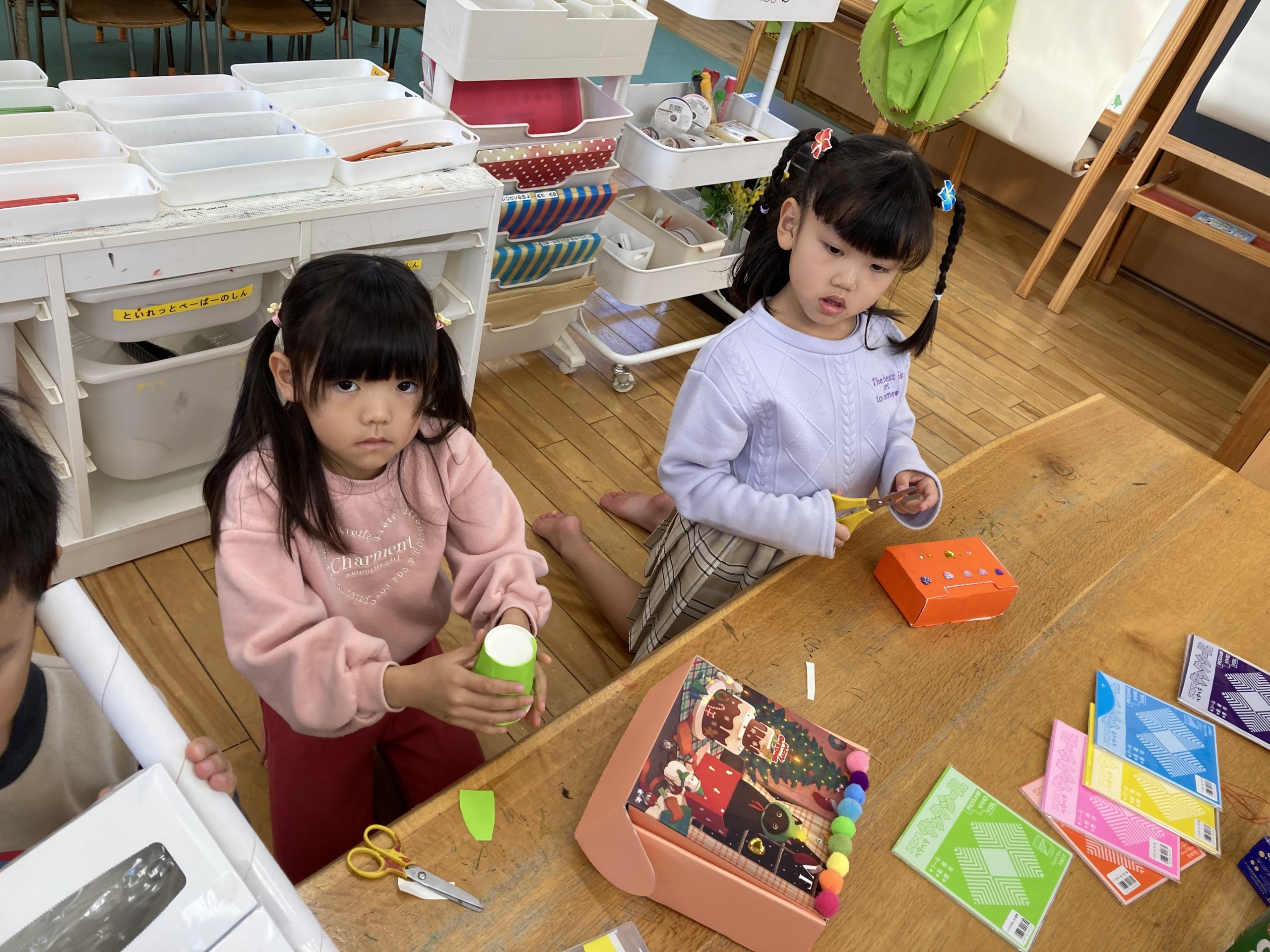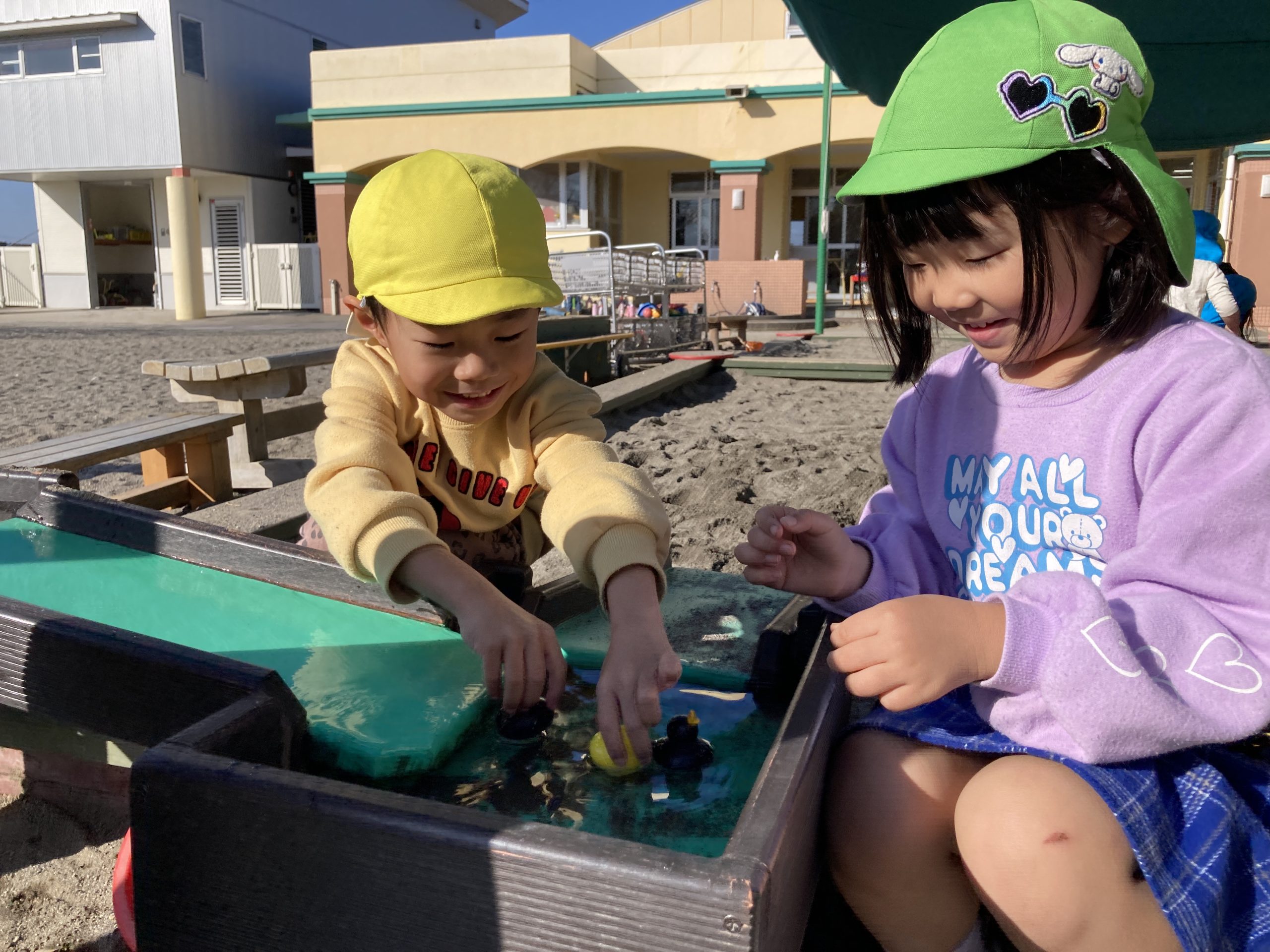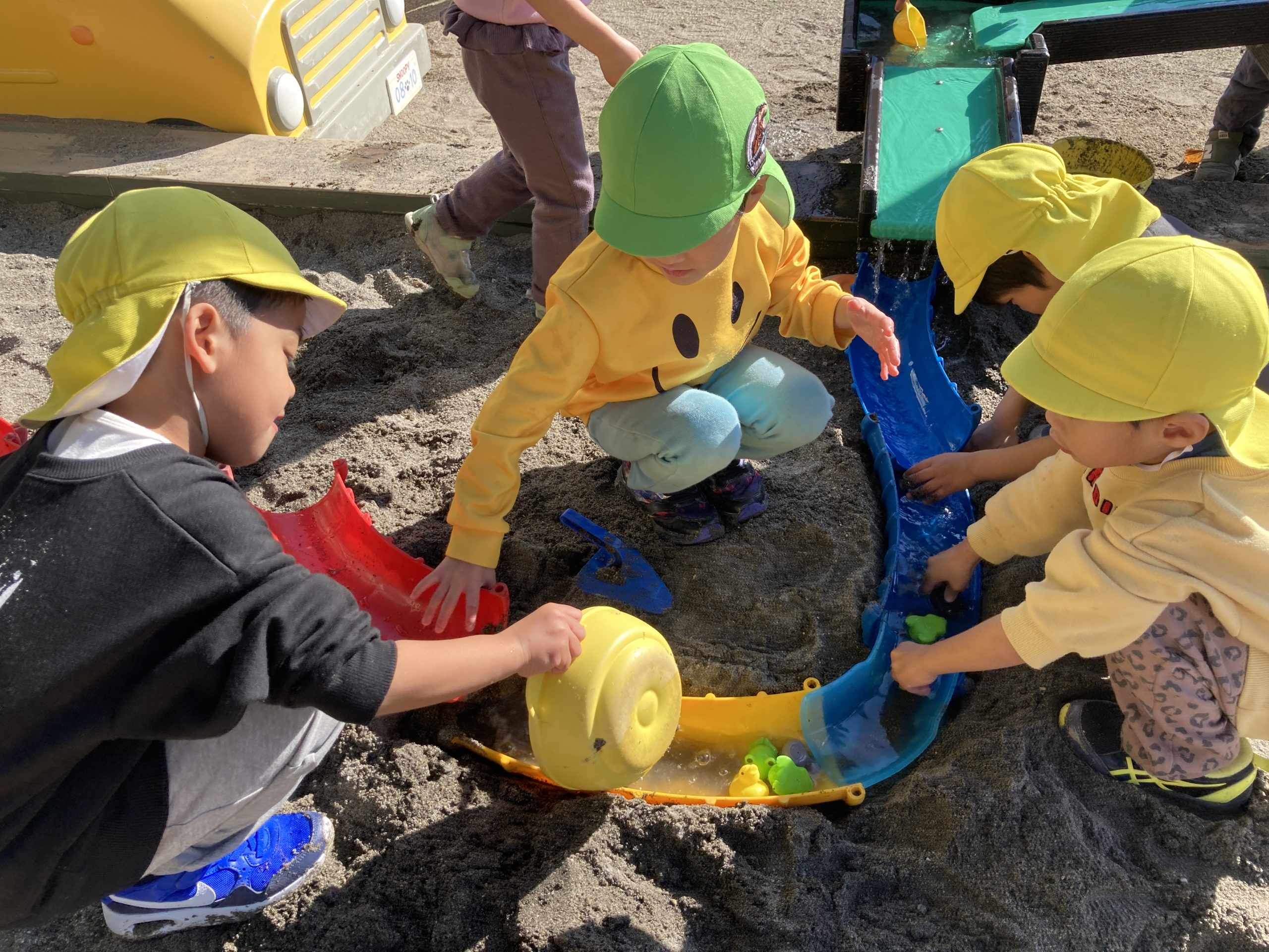 今日は、つき・りす・きりんぐみの異年齢で戸外あそびとコーナー遊びの遊びたいほうを選んで遊びました。異年齢の友だちと一緒に楽しそうに遊んでいました。