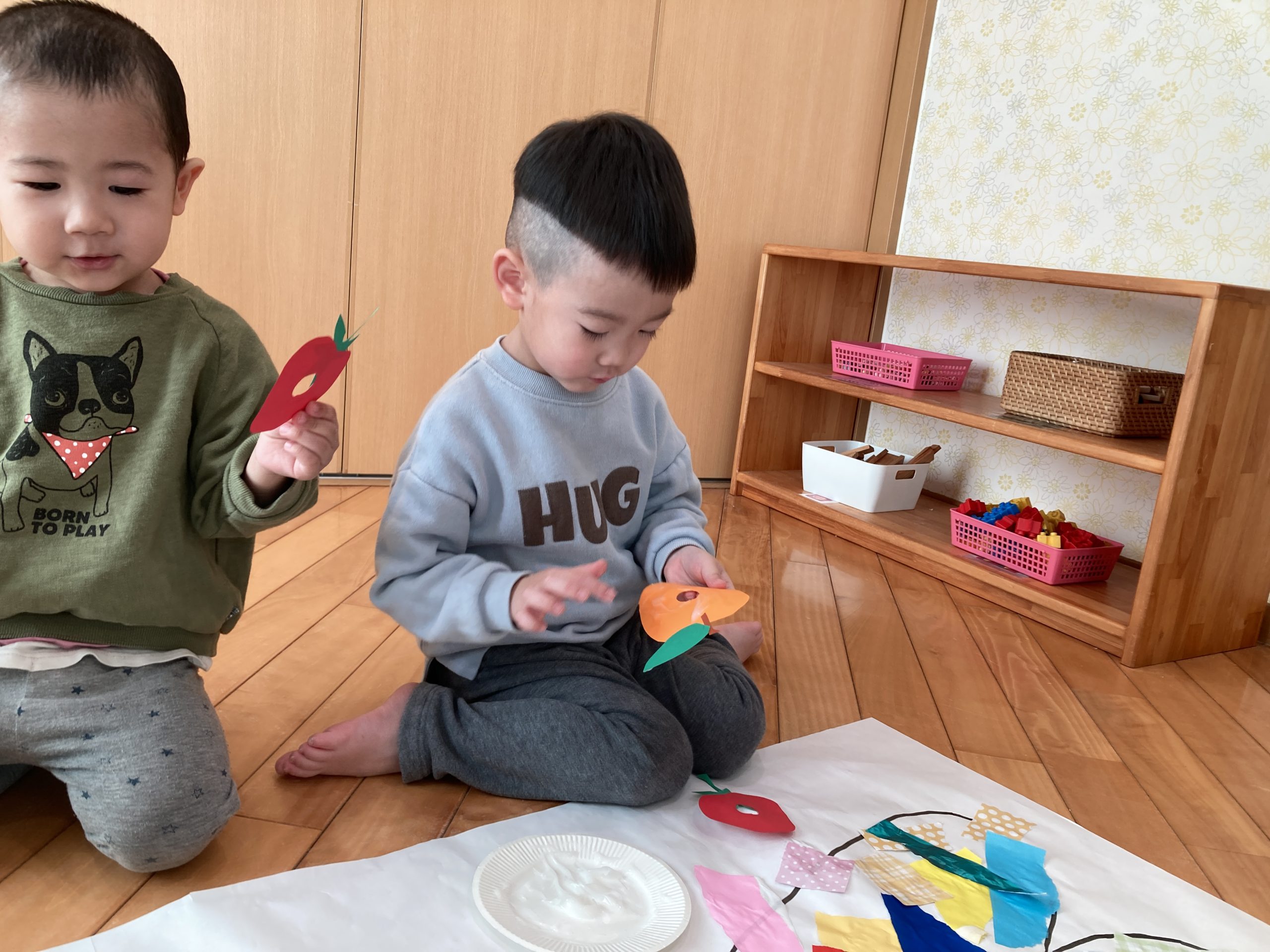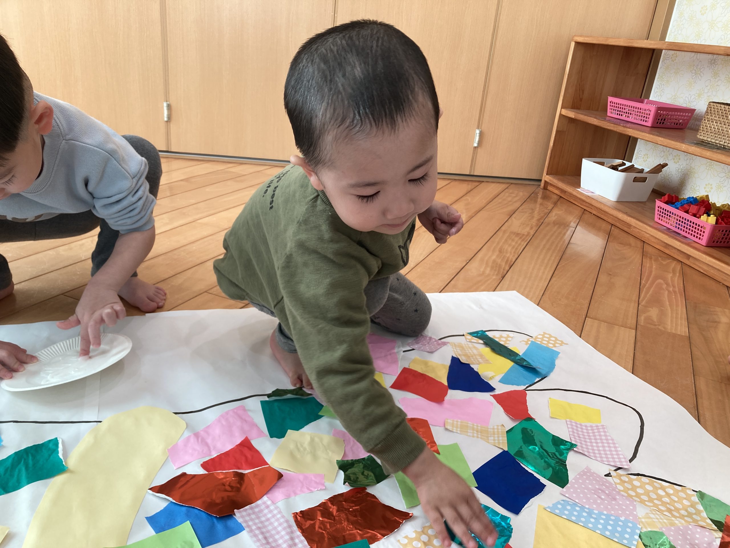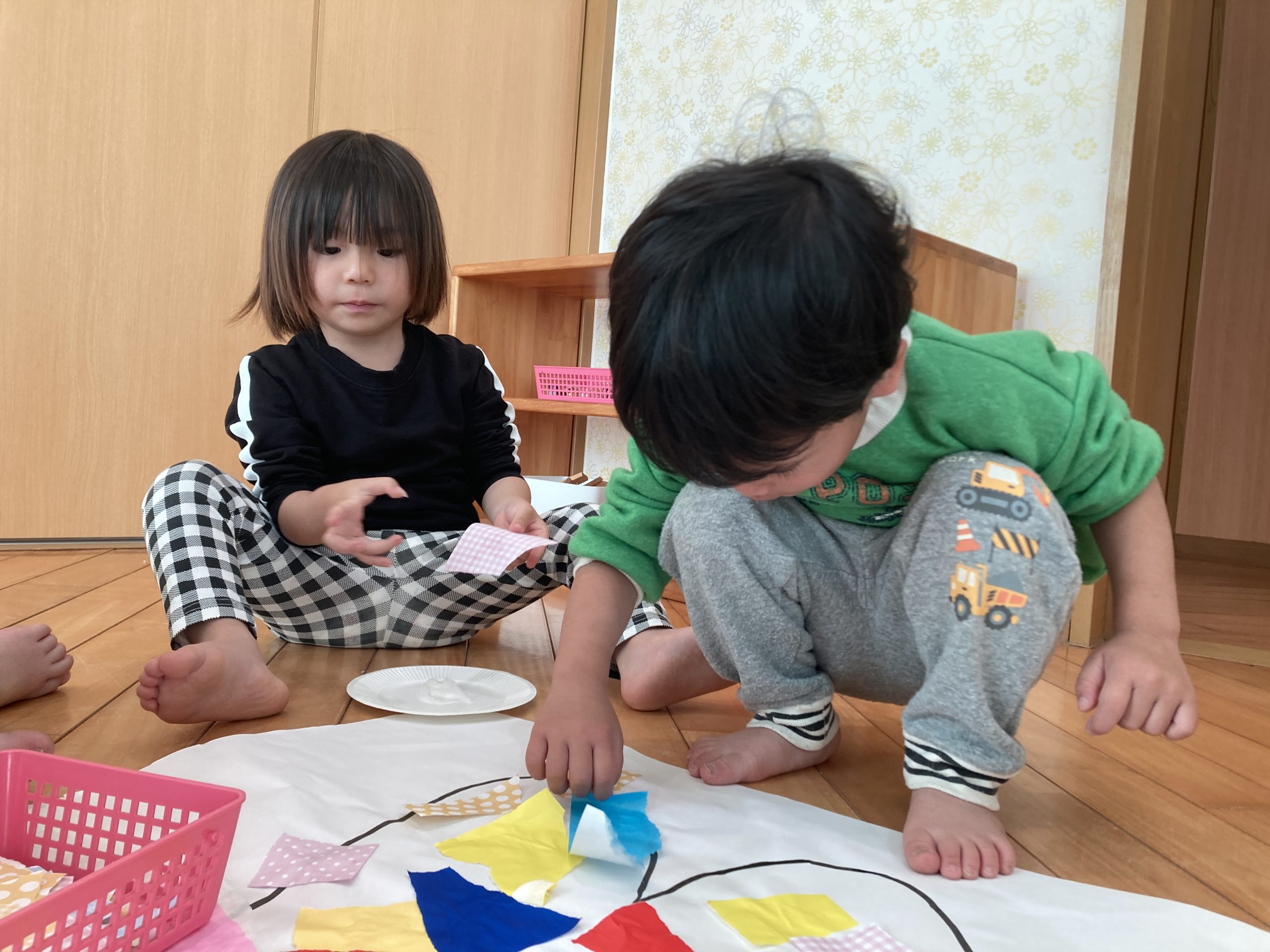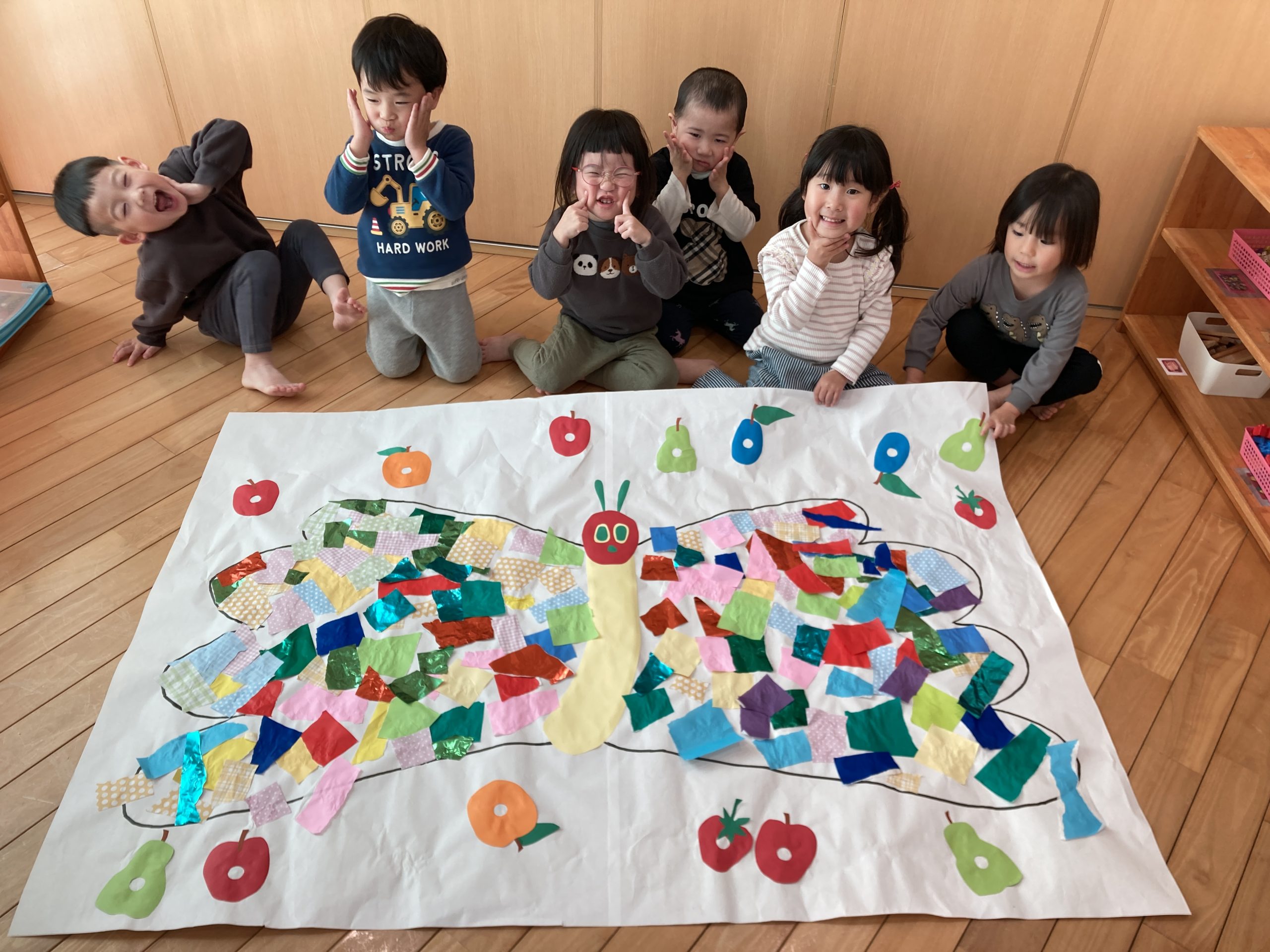 今日は、協同製作ではらぺこあおむしの蝶々を作りました!🦋前回の続きで、折り紙にのりを付けて、模造紙に貼り付けました。最後は、絵本に出てくる果物を貼って完成!✨出来上がった作品を見て、大喜びの子どもたちでした😊🩵