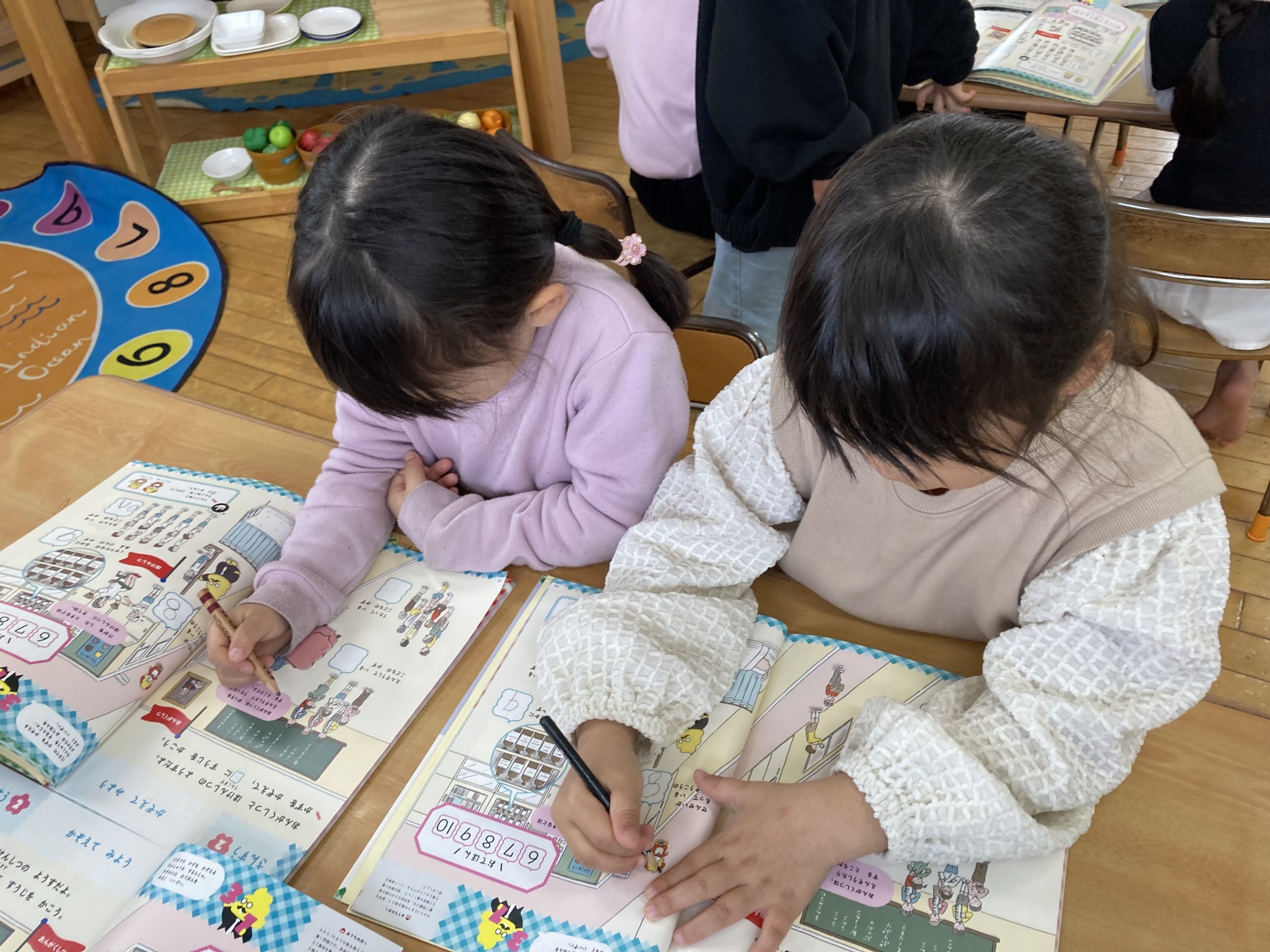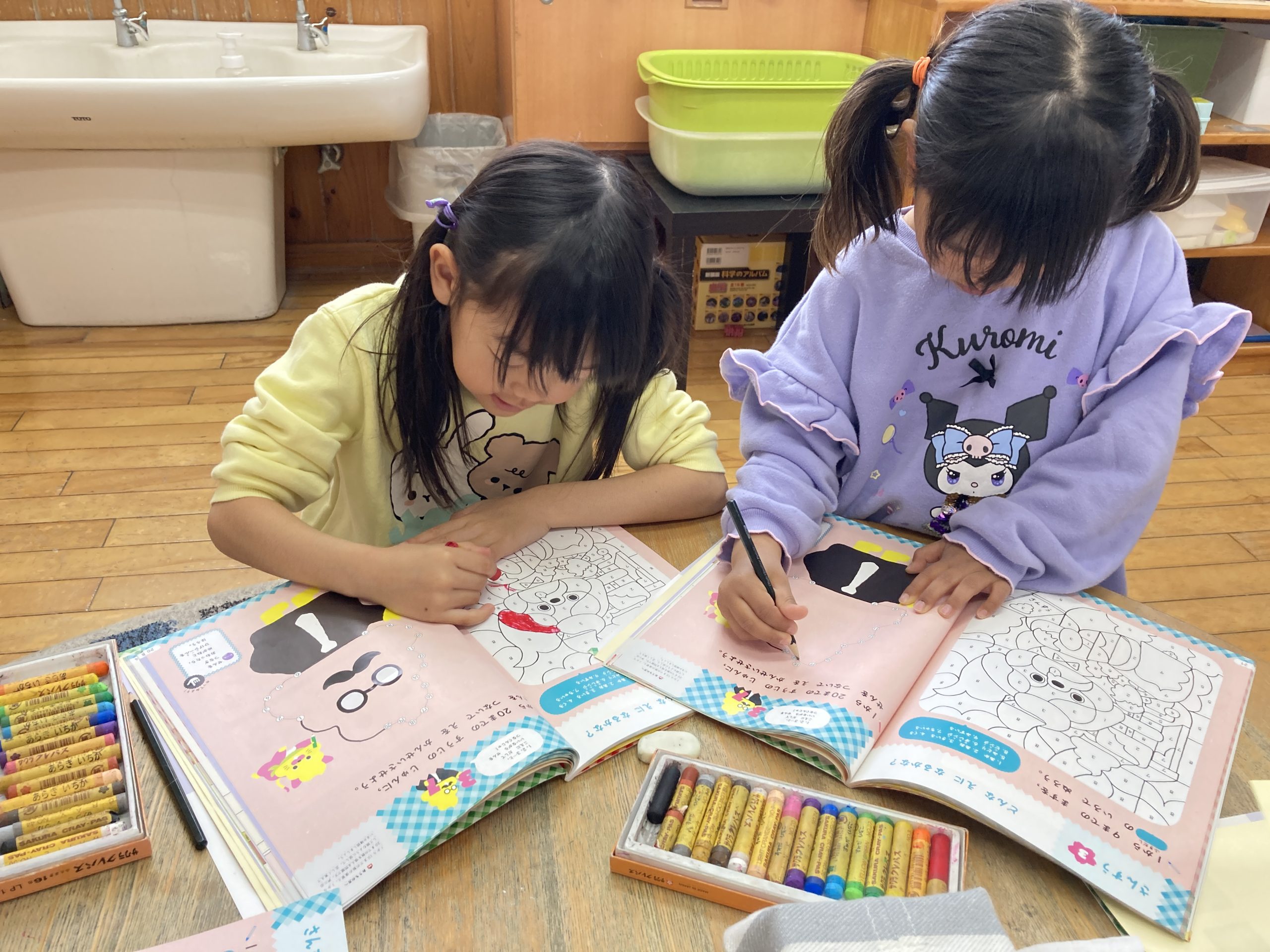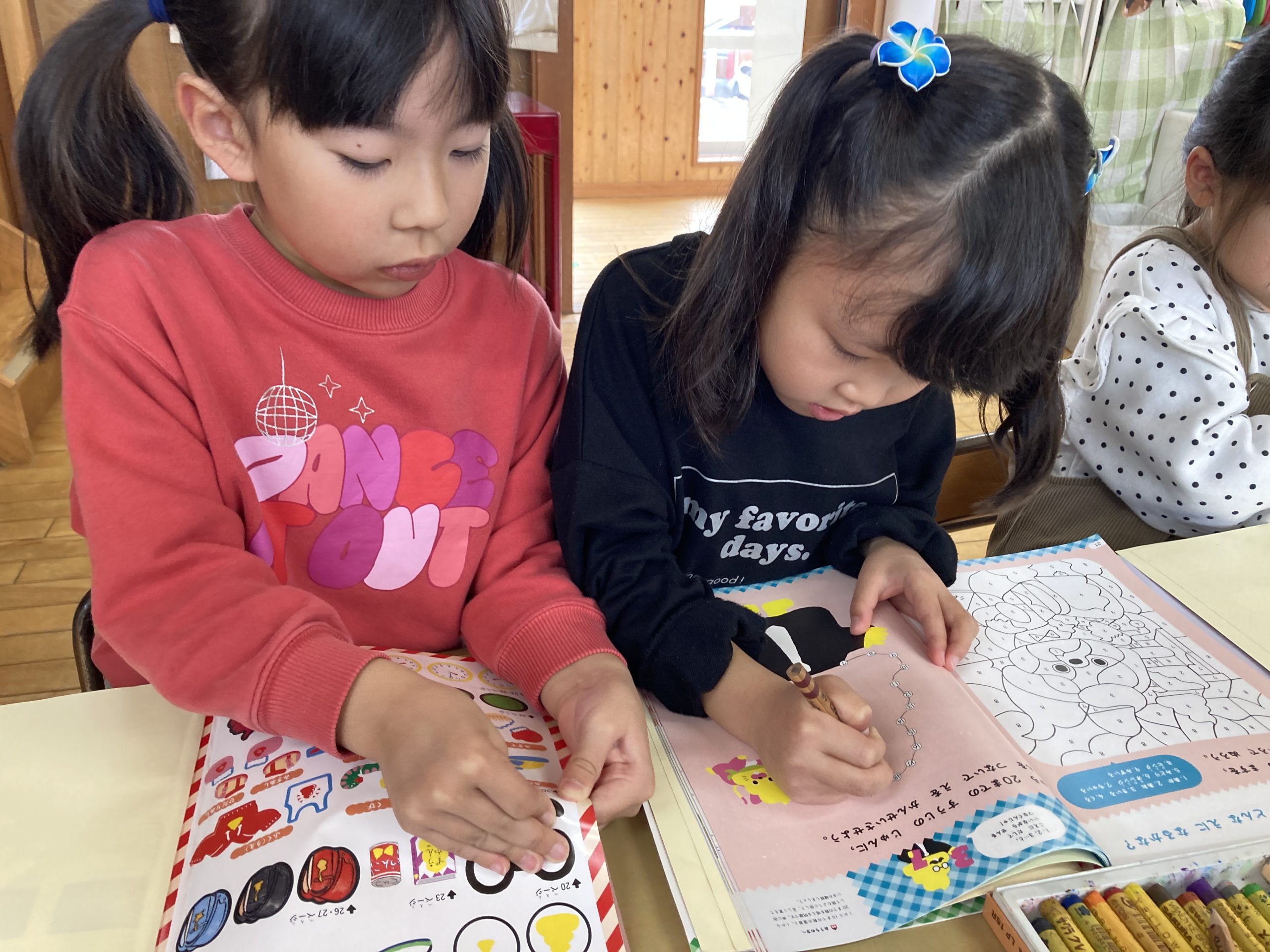 今日は、うんこドリルでもじ・かずあそびをしました。問題をよんで自分で解いていました。クレヨンで色を塗ったり、シールを貼ったりしながら楽しんで遊んでいました。