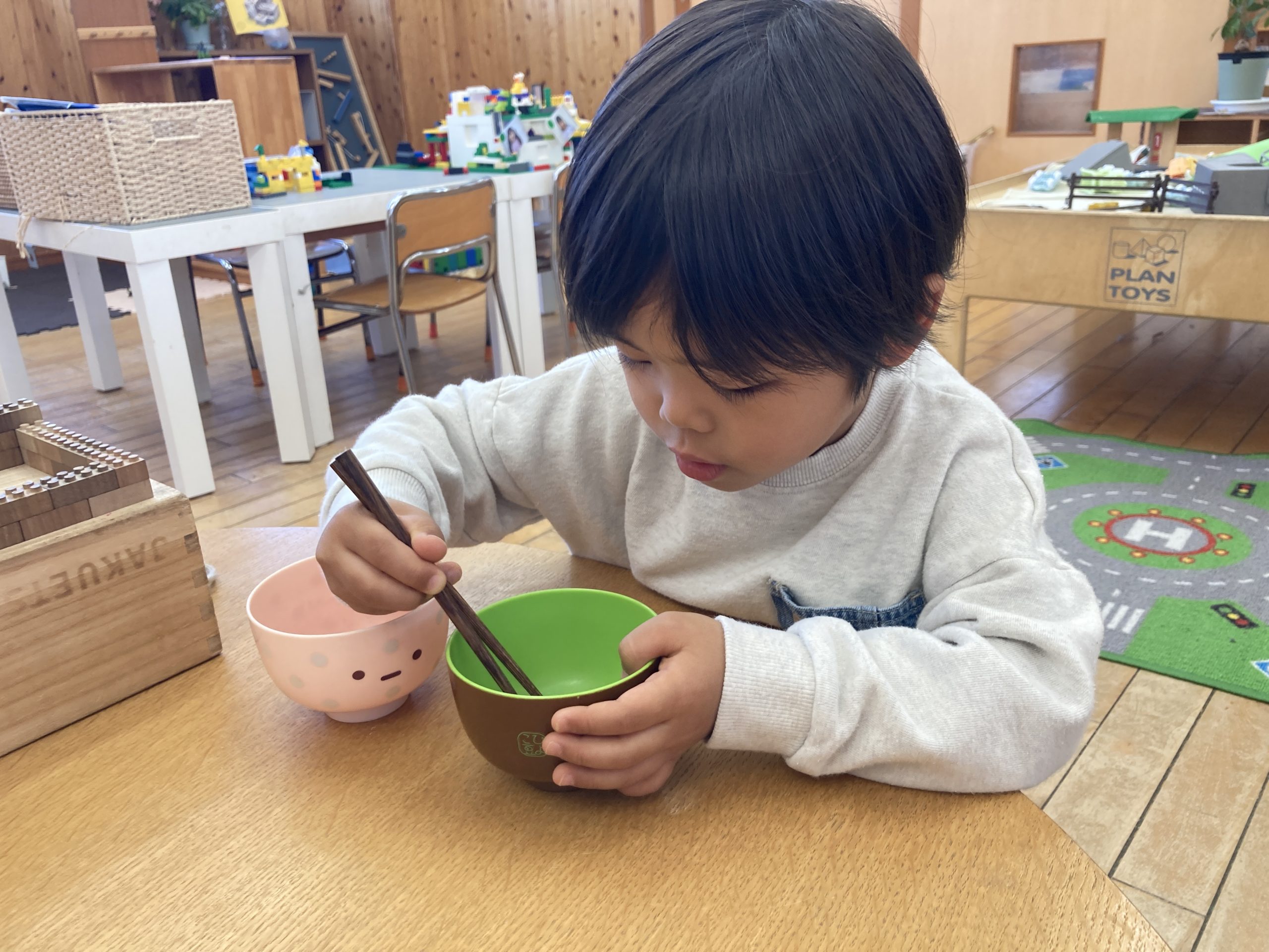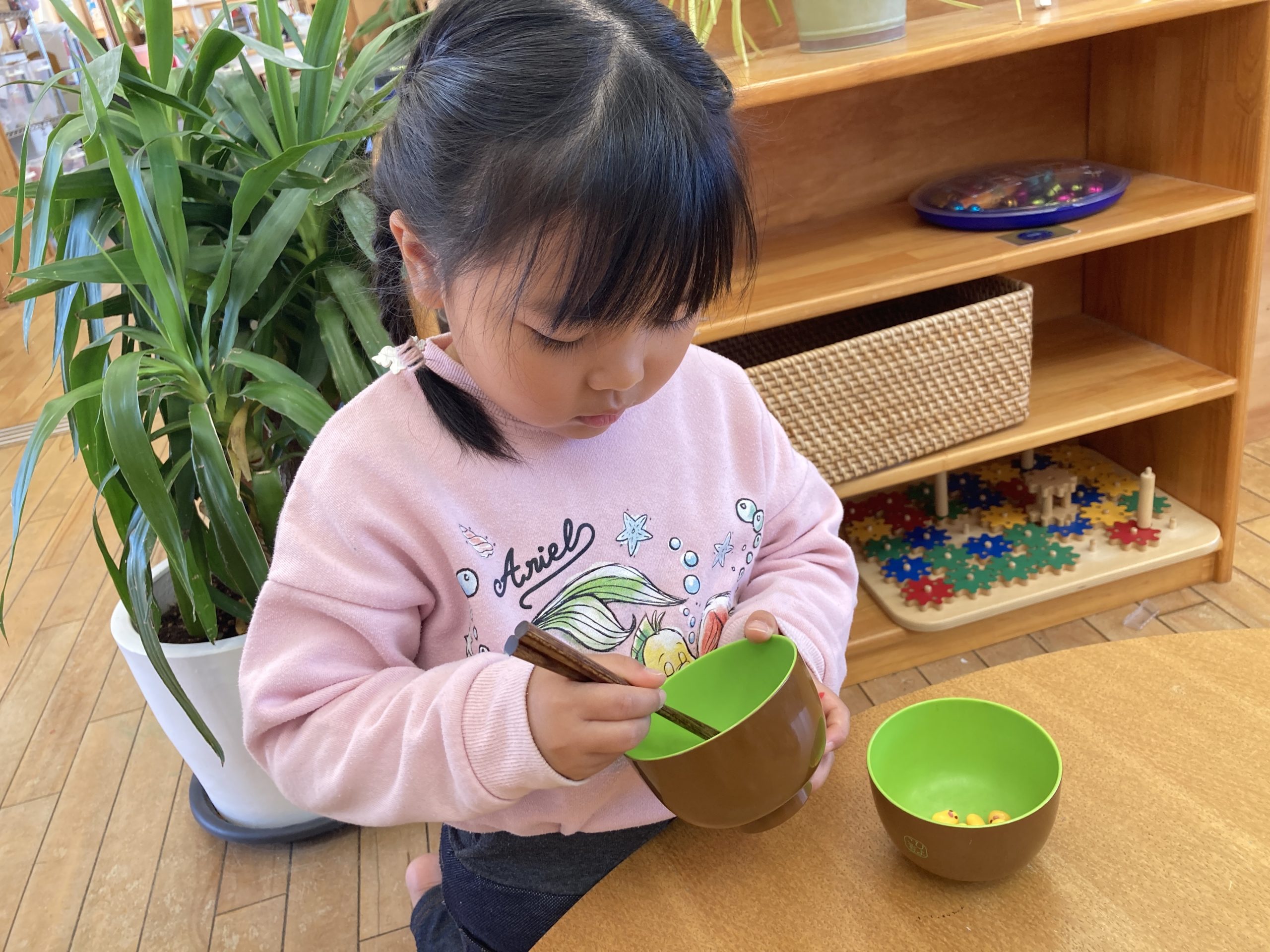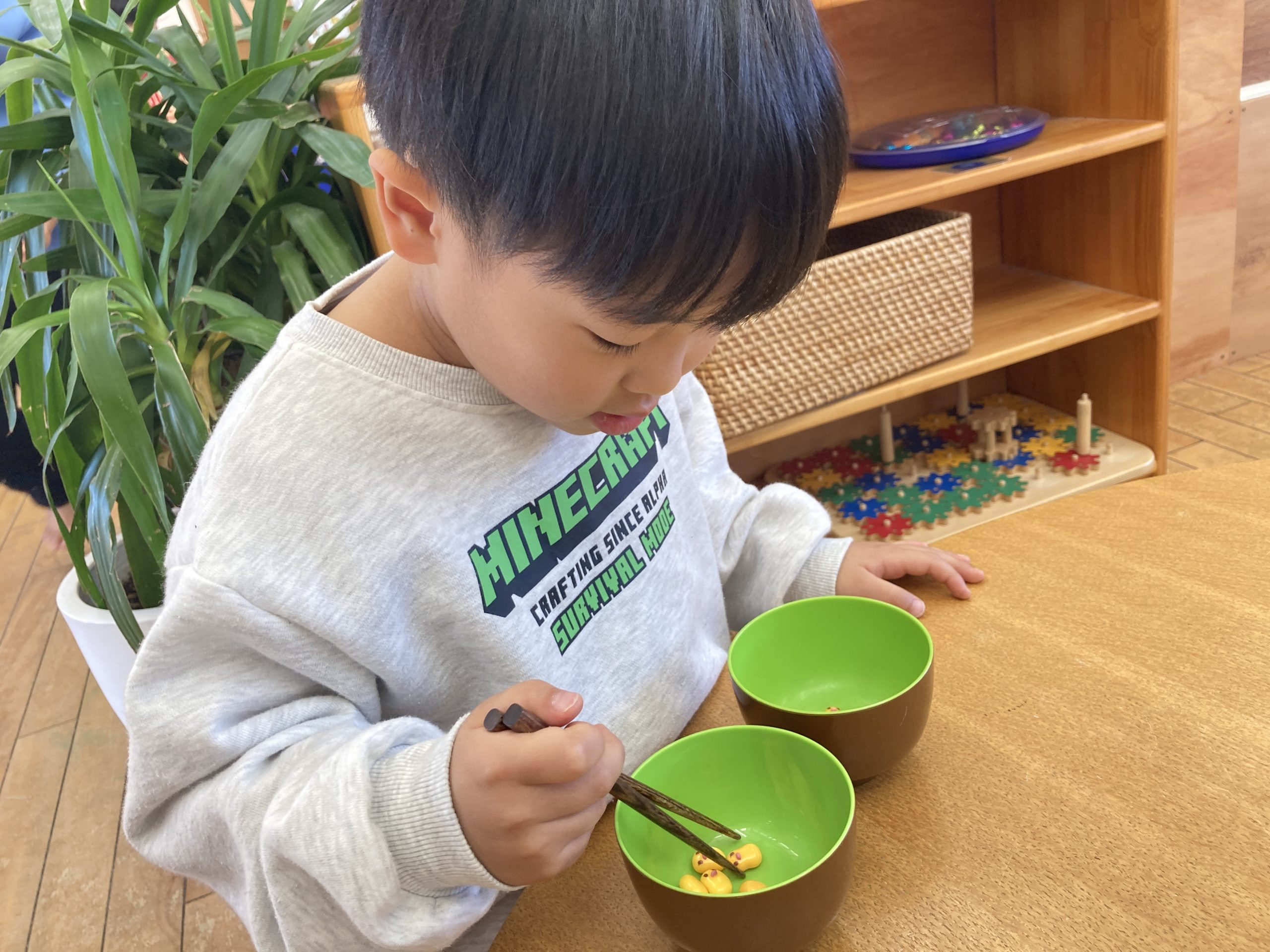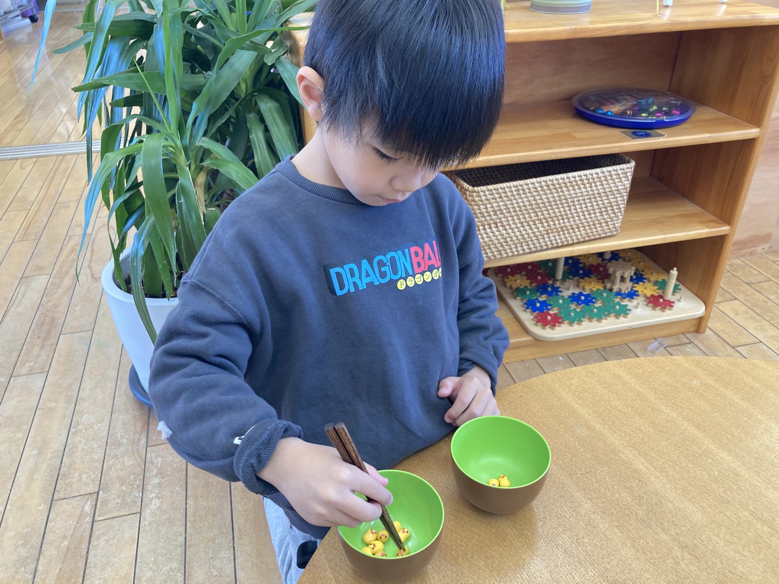 今日は豆うつしをしました。箸の持ち方を意識しながら、ひよこの豆をうつしていました!