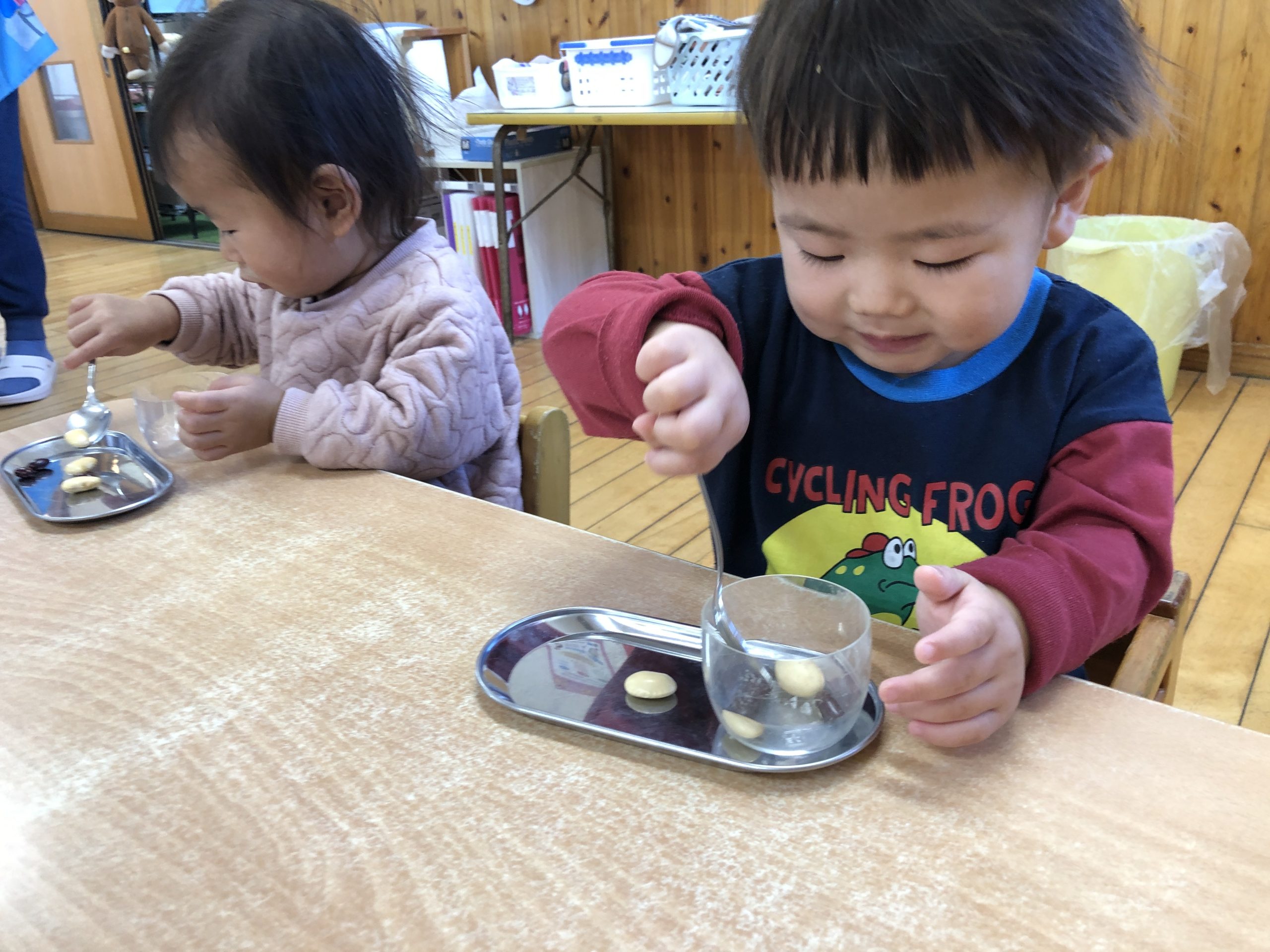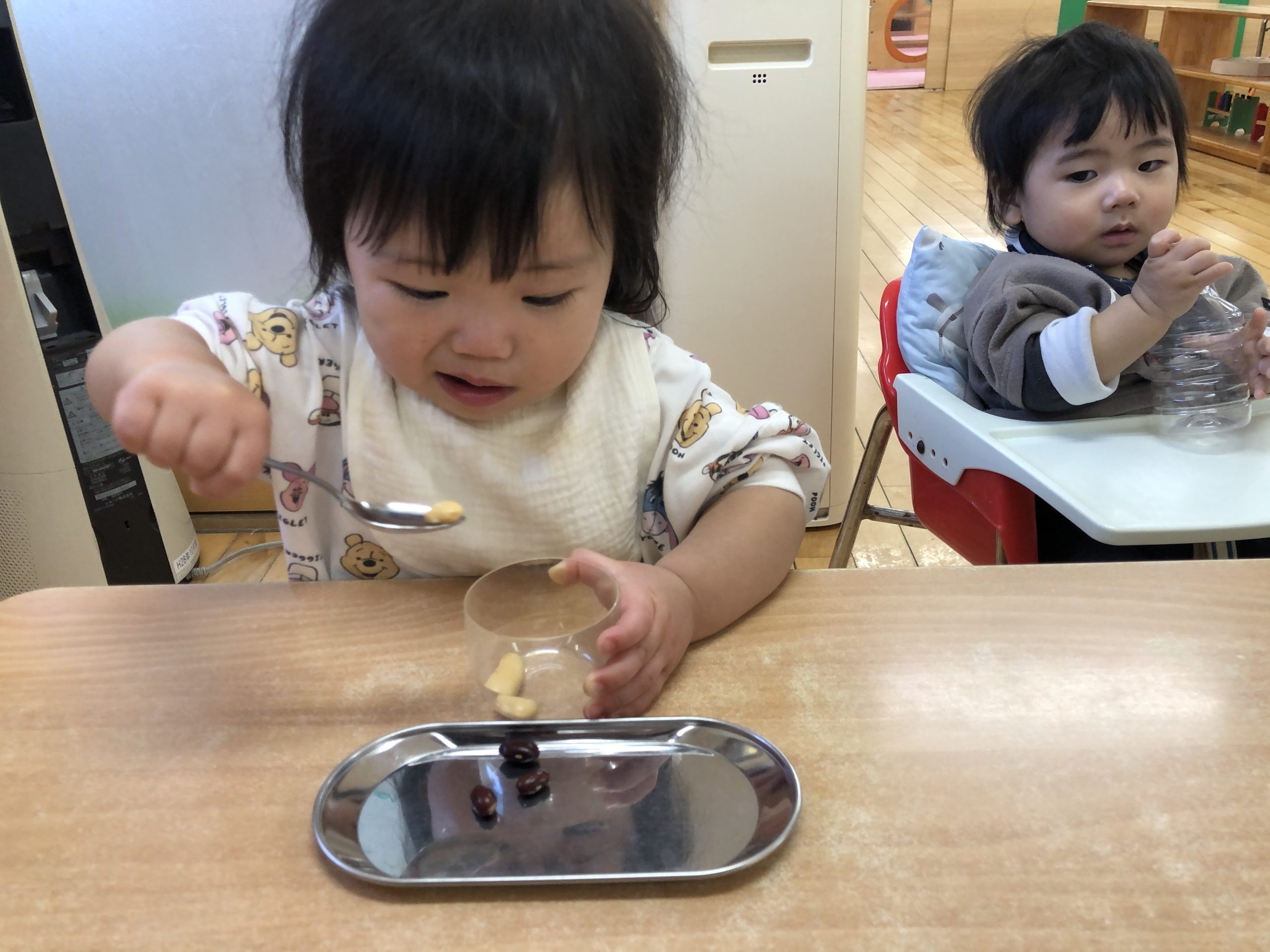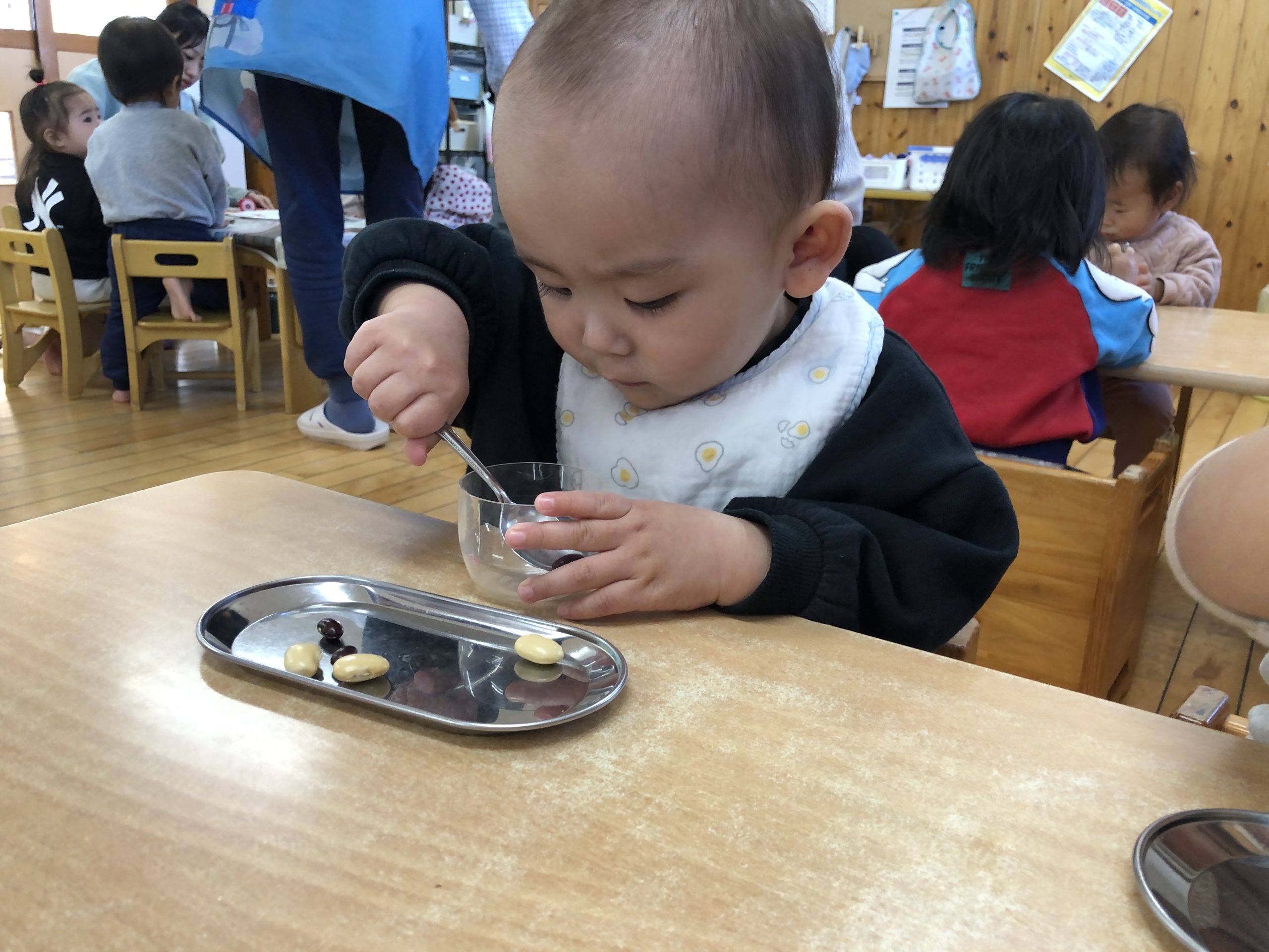 今日は、豆うつしあそびをしました。白花豆と黒豆の二種類の豆🫘をスプーン🥄や指先で摘んで何度も上手に移して楽しんでいました♪