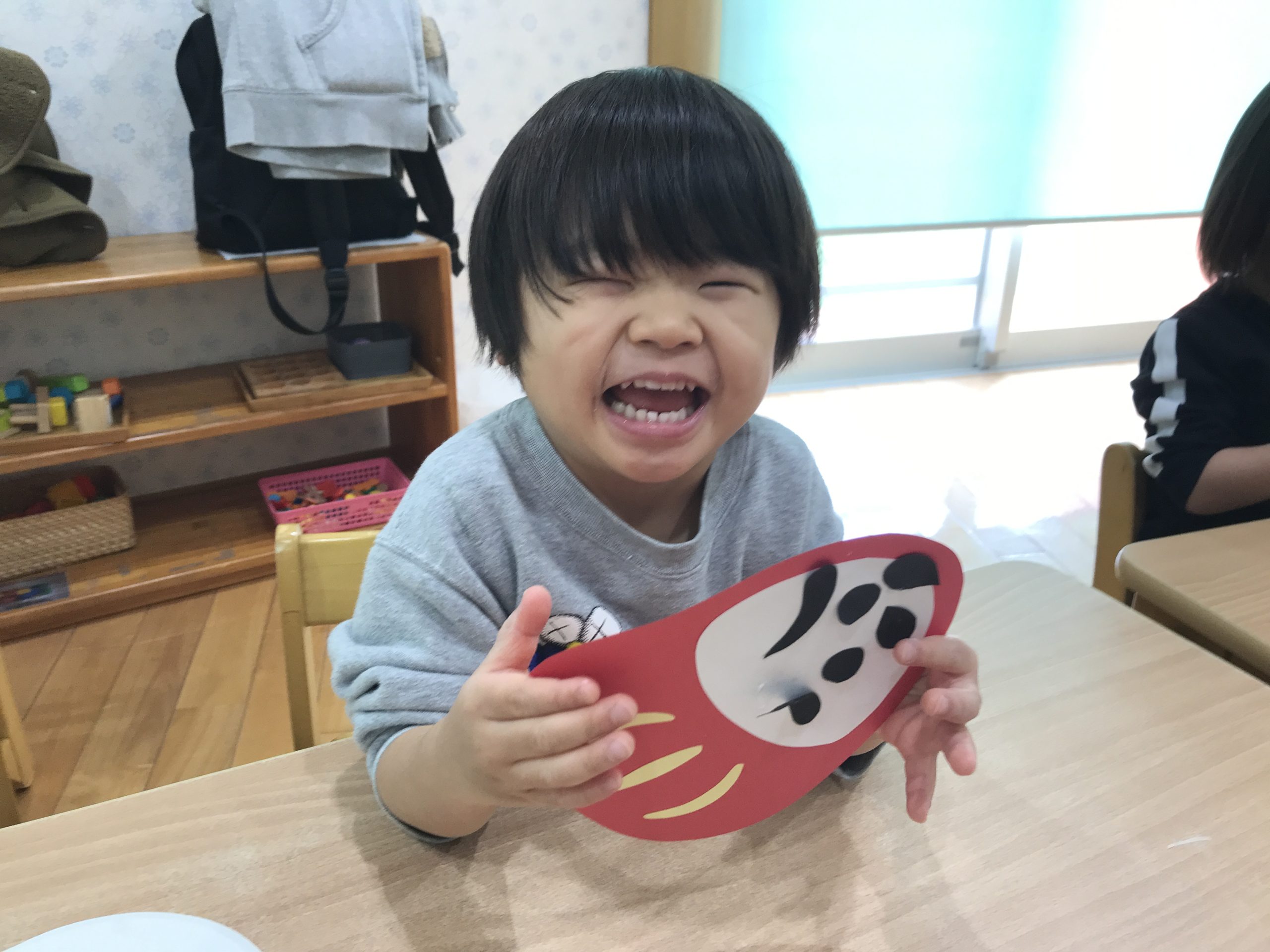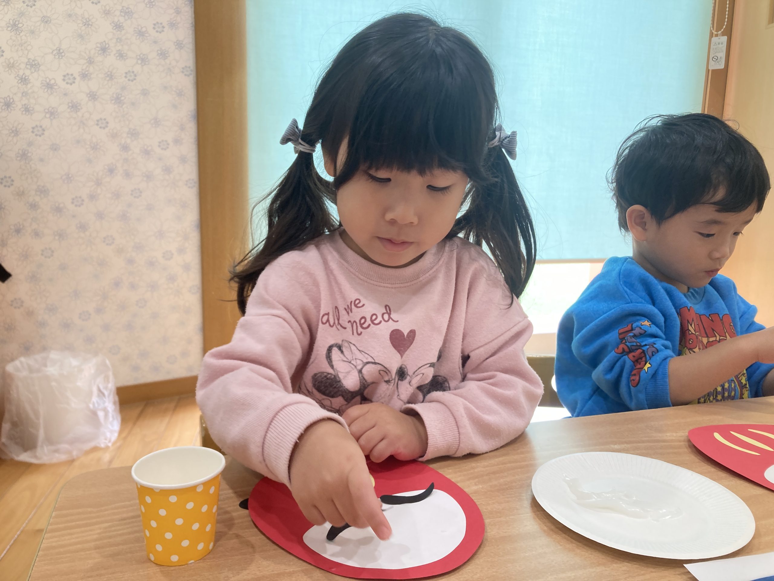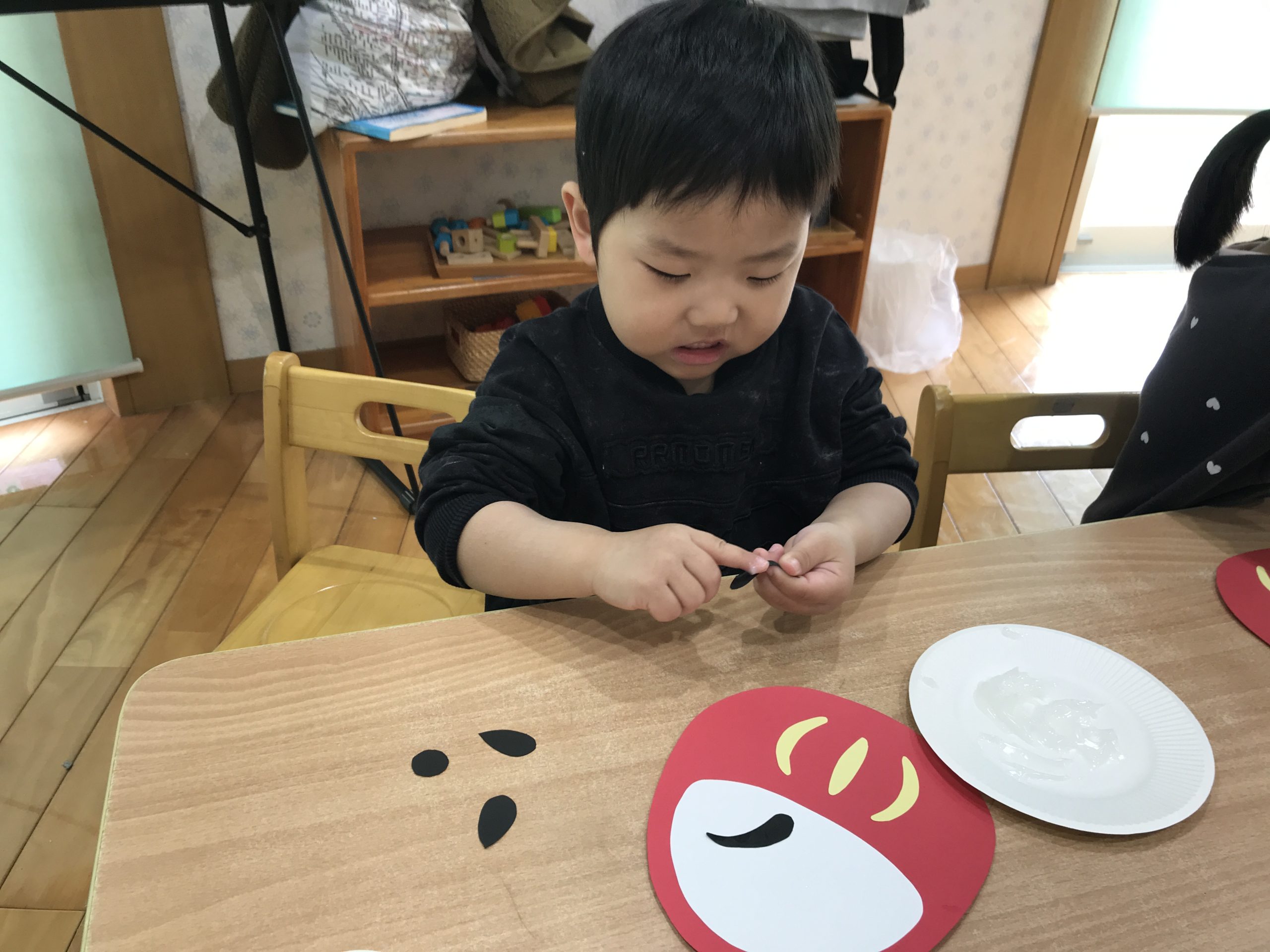 今日は、1月の製作で福笑いをしました😆だるまの顔にまゆげ、目、ヒゲのパーツをのりを使って貼り付けました!個性豊かなだるまが完成しました✨