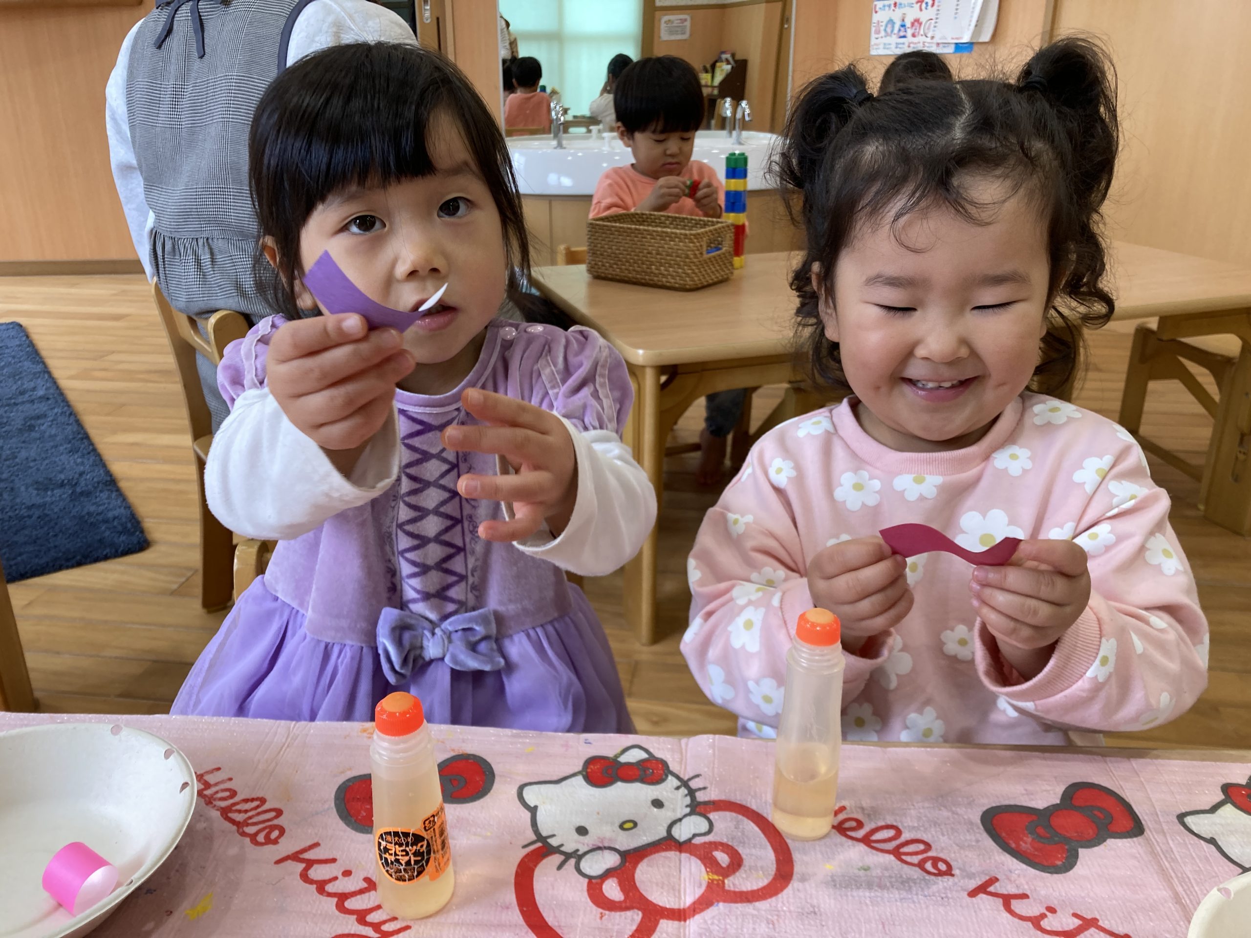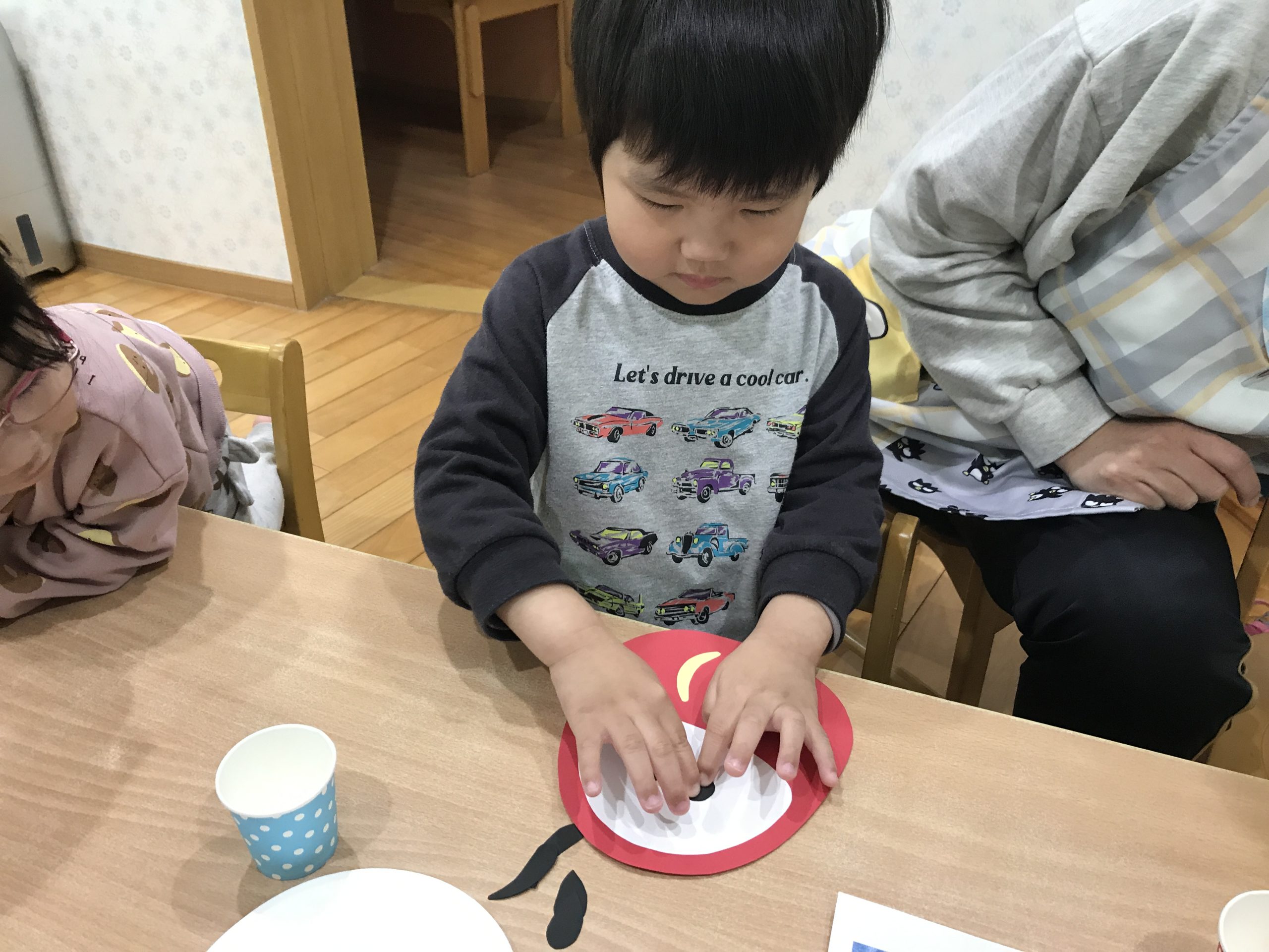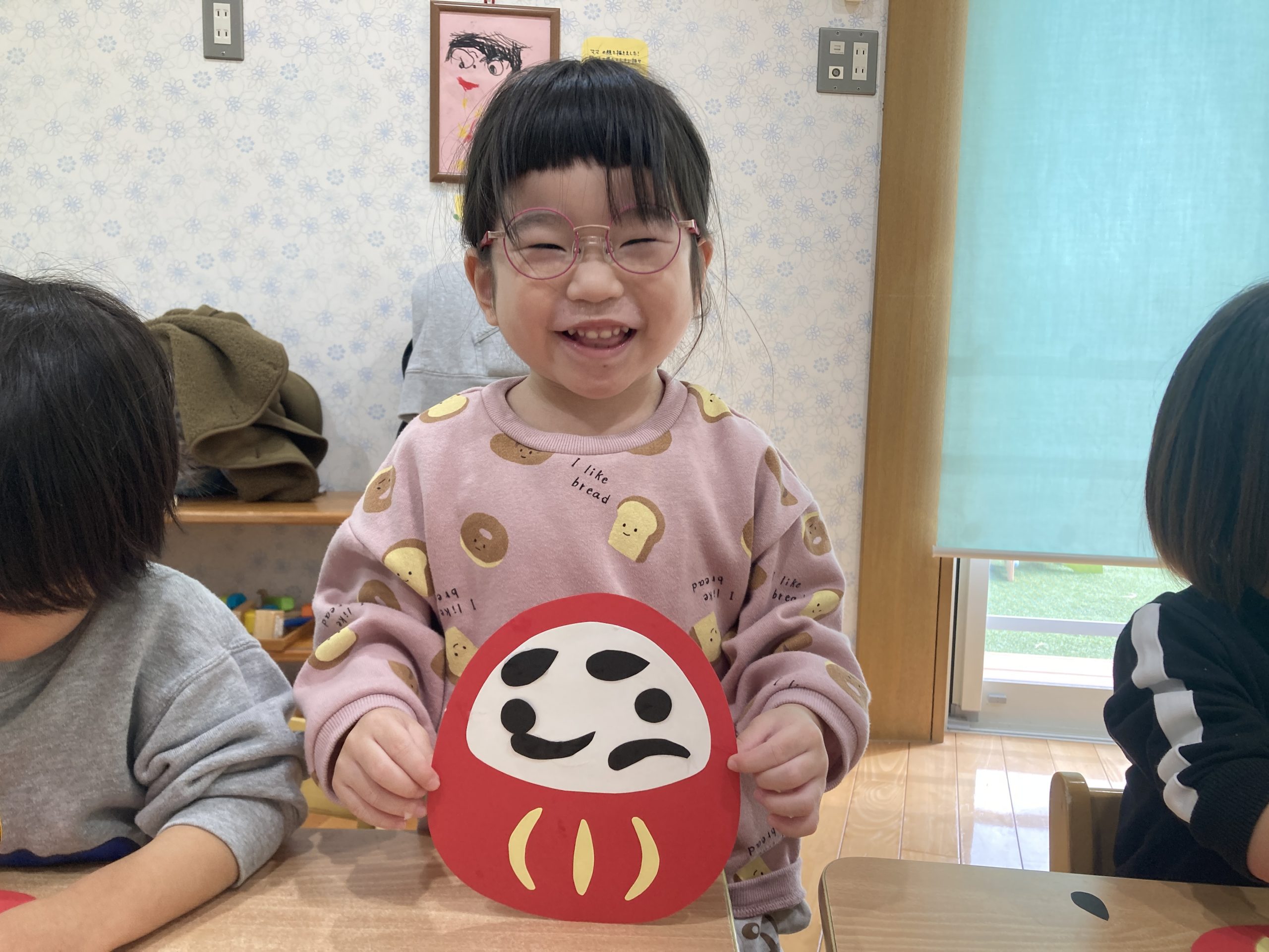今日は、1月の製作で福笑いをしました😆だるまの顔にまゆげ、目、ヒゲのパーツをのりを使って貼り付けました!個性豊かなだるまが完成しました✨