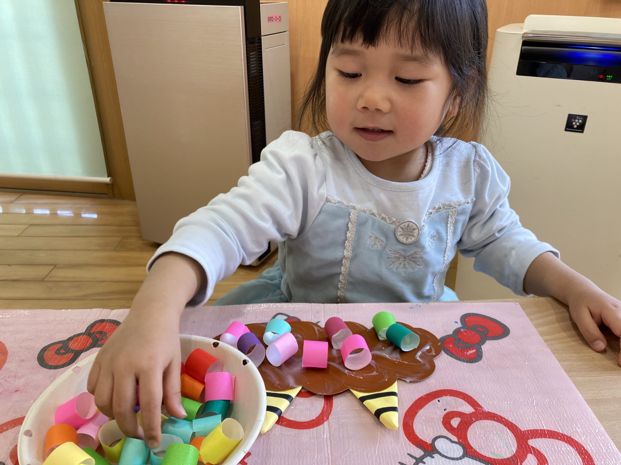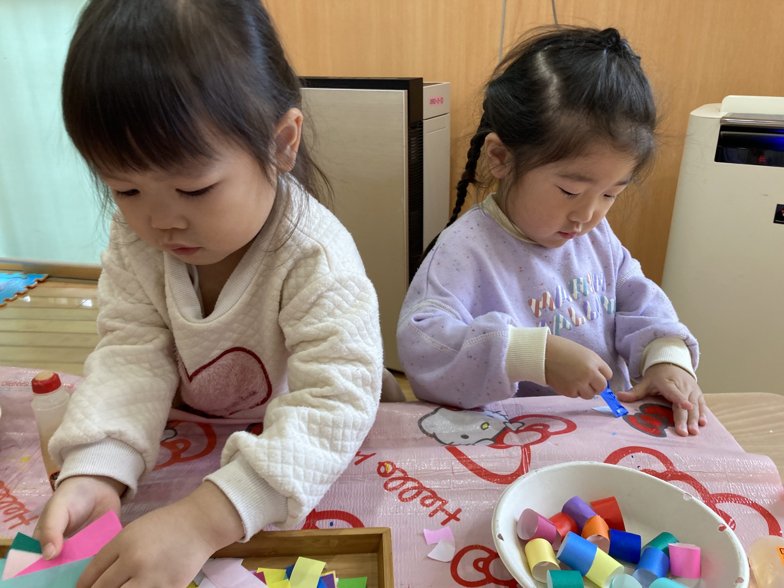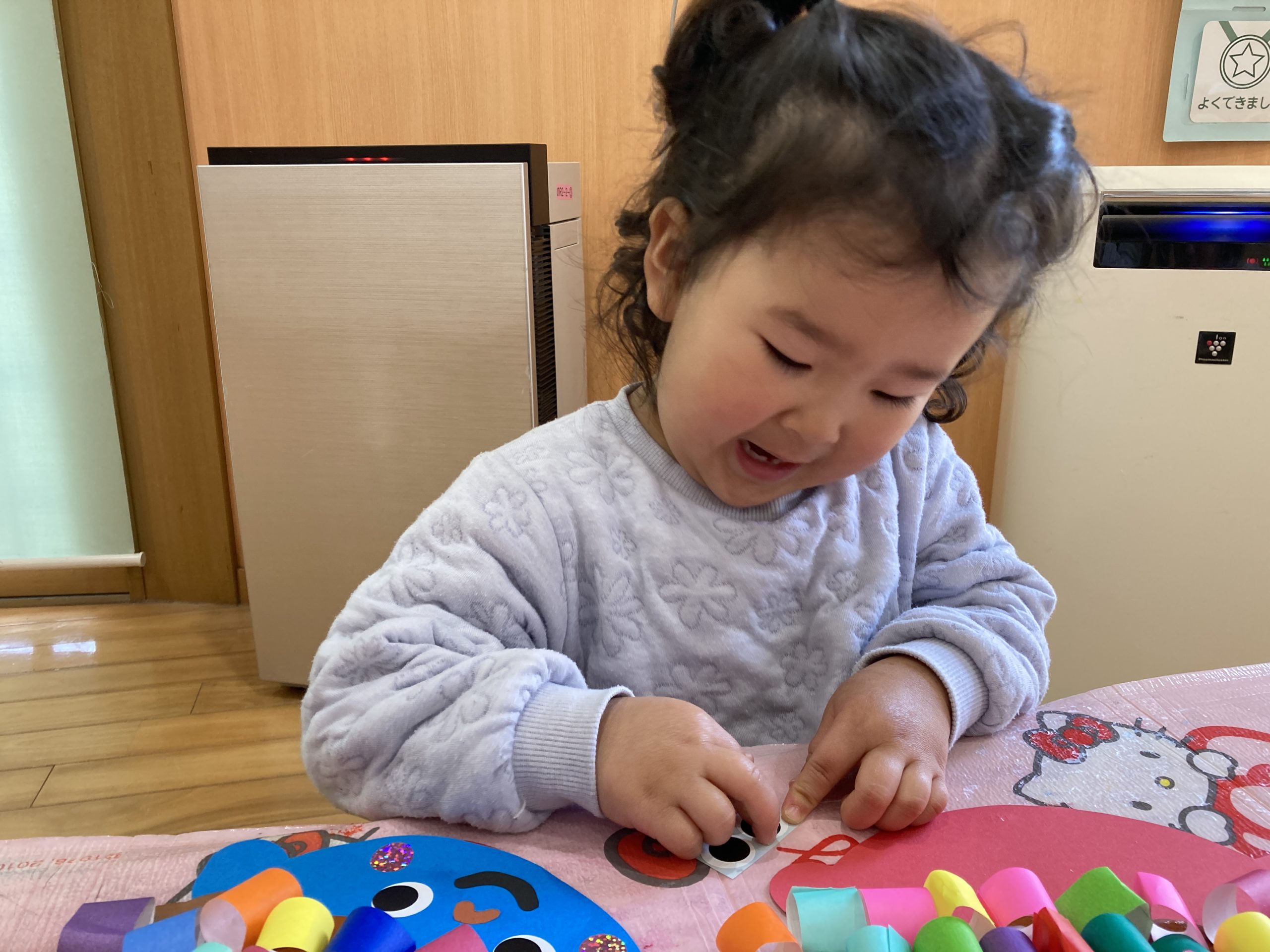 今日は、節分のお面作りをしました🎵✨鬼の髪の毛を折り紙で丸めながらのりでつけていきました👹カラフルな鬼が出来上がっていましたよ😊