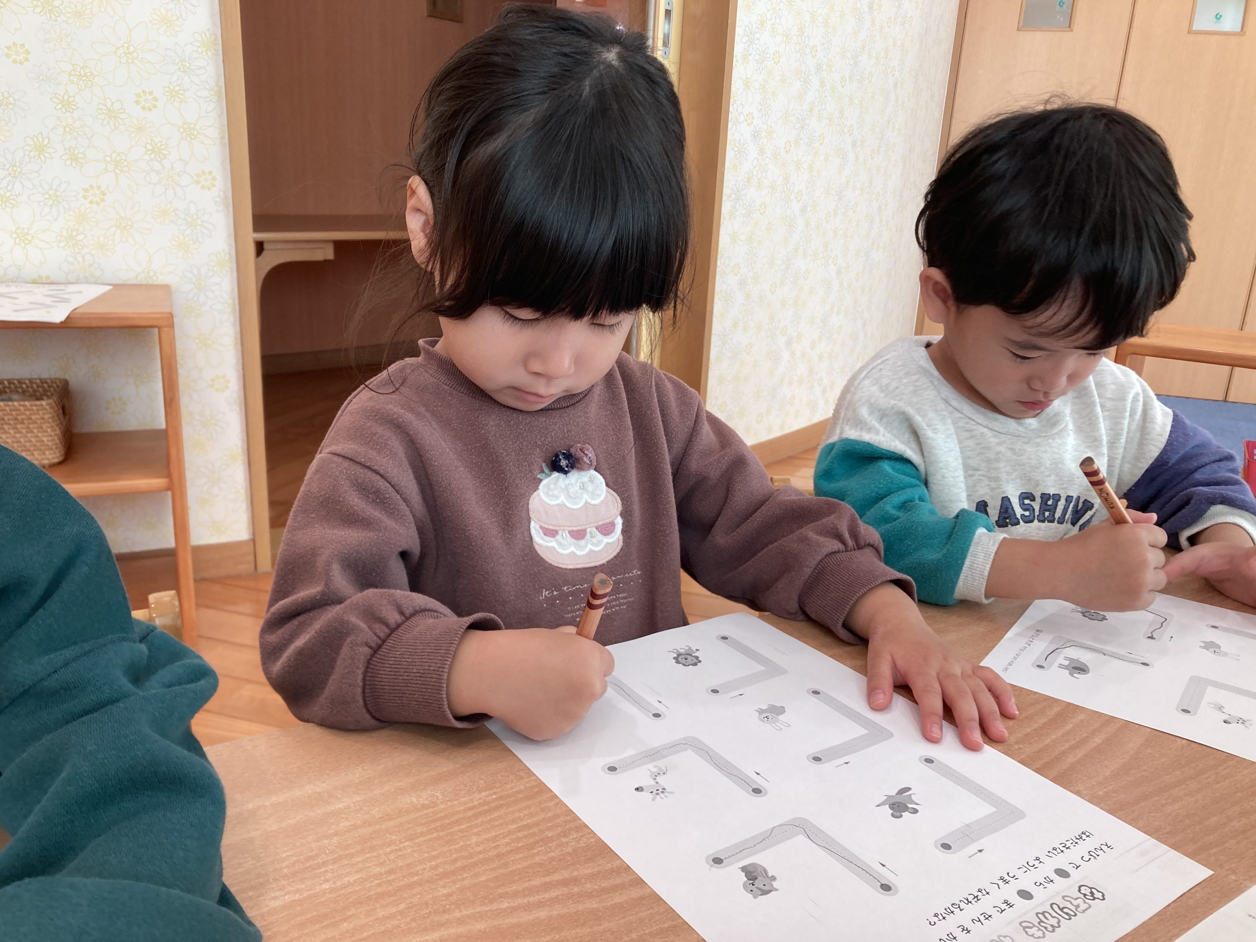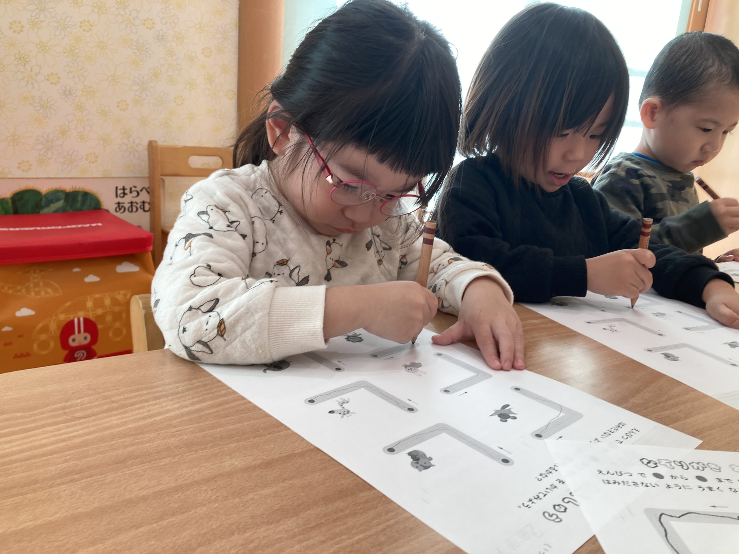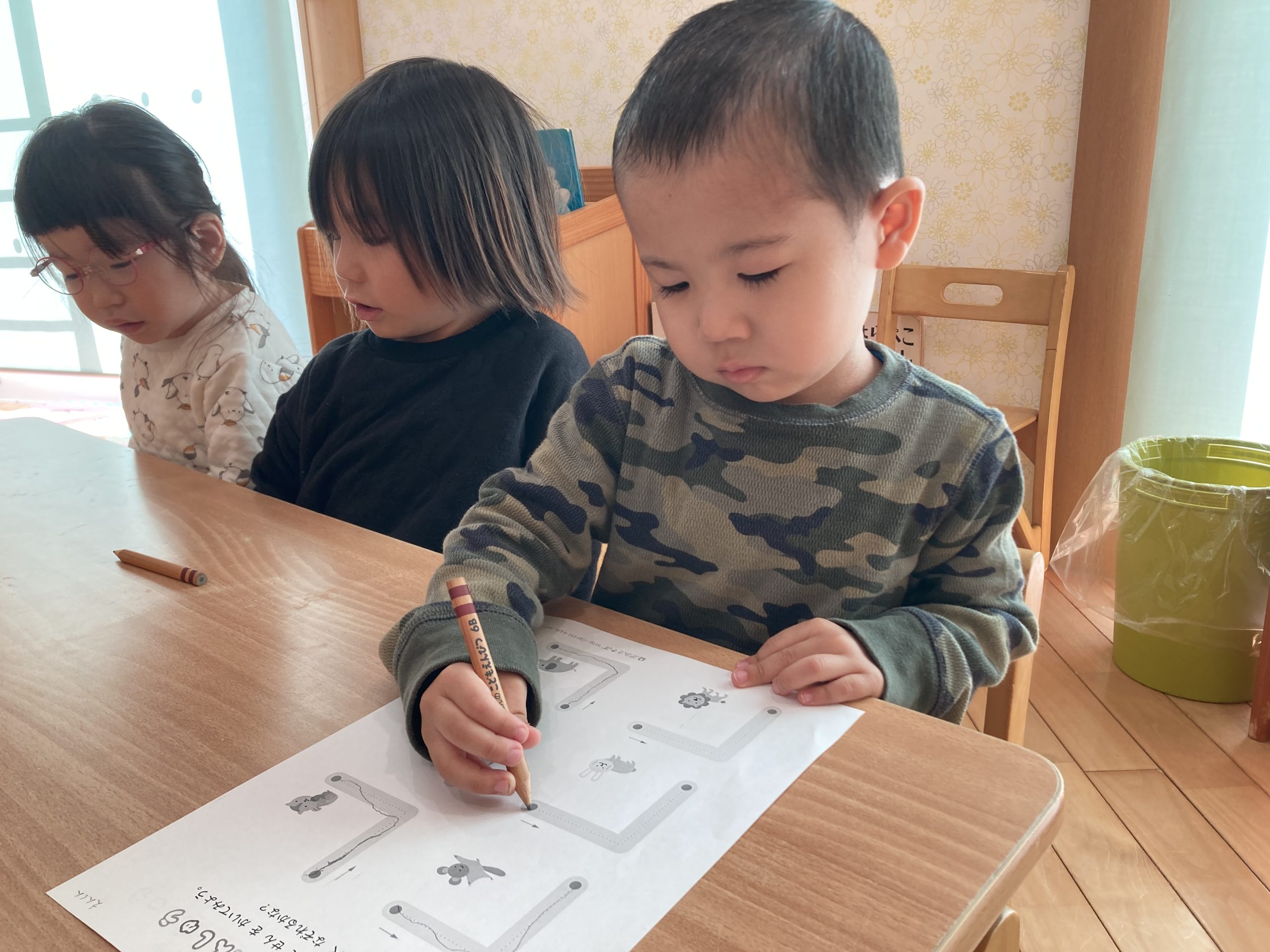 今日は、線なぞりをしました✏️鉛筆の持ち方も練習し、少し苦戦しながらも正しい持ち方を意識しながら線をなぞることができていましたよ✨