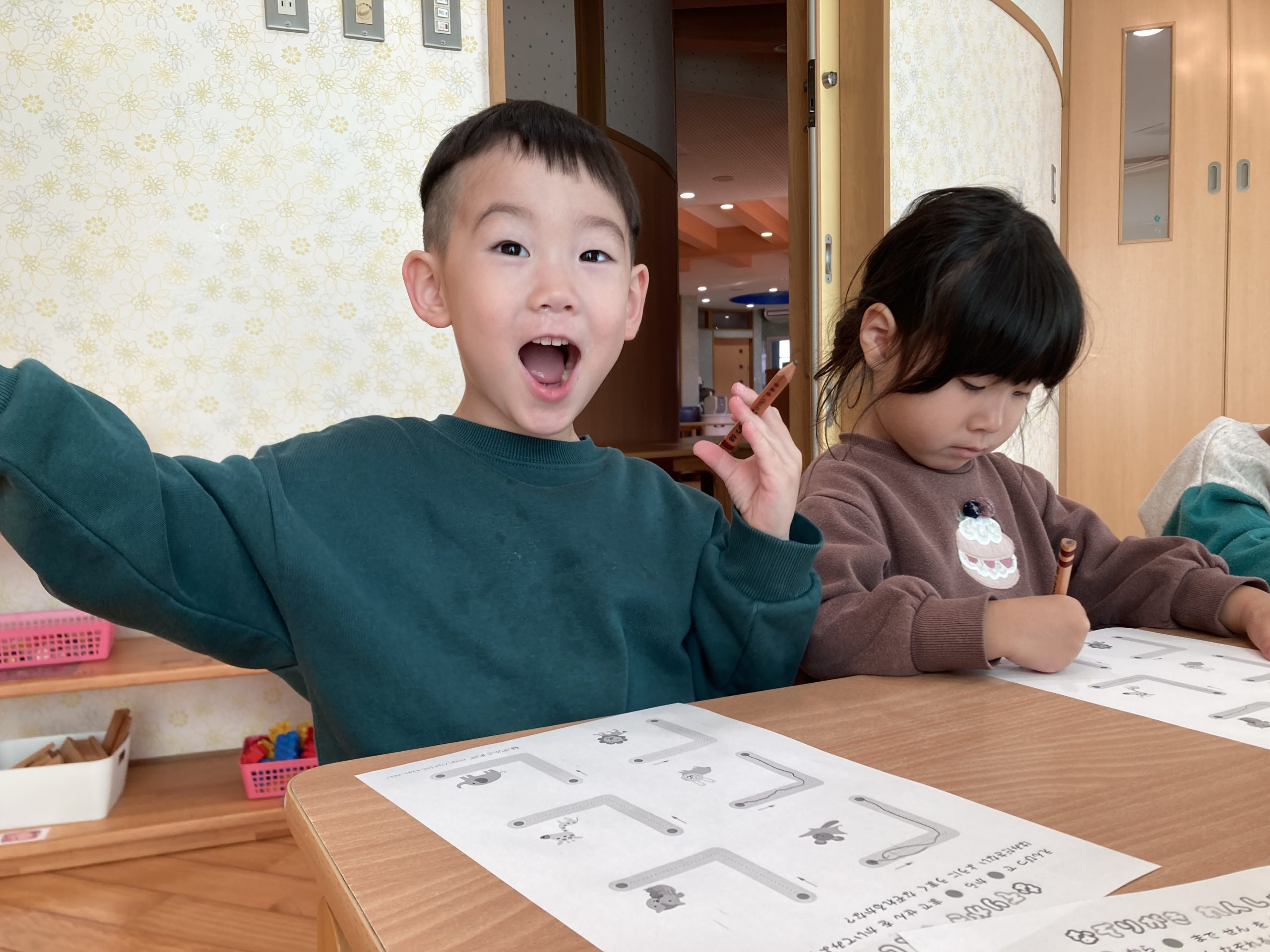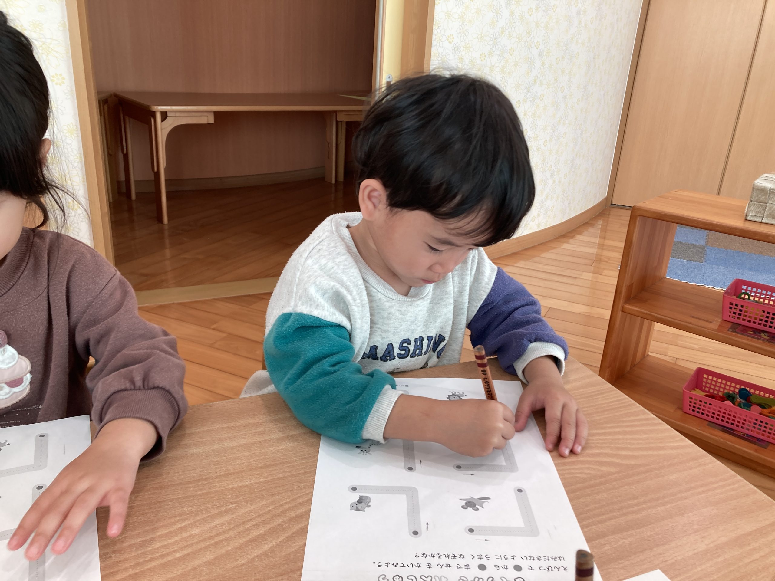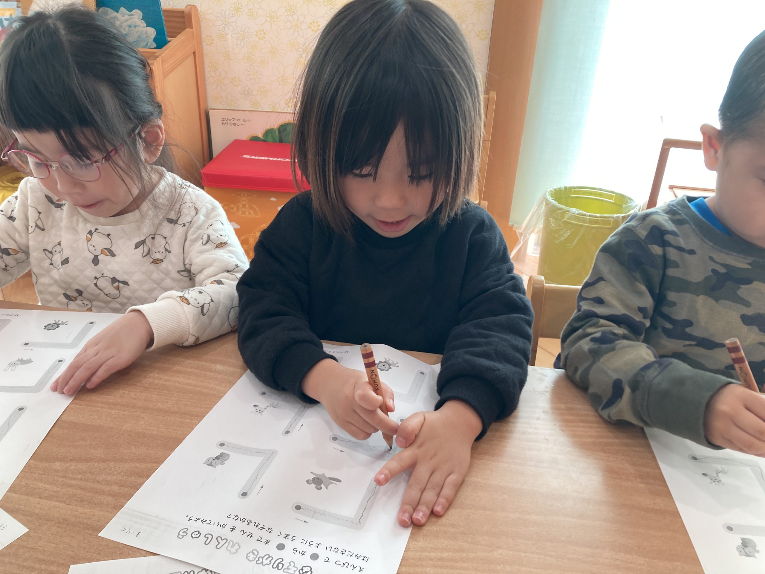 今日は、線なぞりをしました✏️鉛筆の持ち方も練習し、少し苦戦しながらも正しい持ち方を意識しながら線をなぞることができていましたよ✨