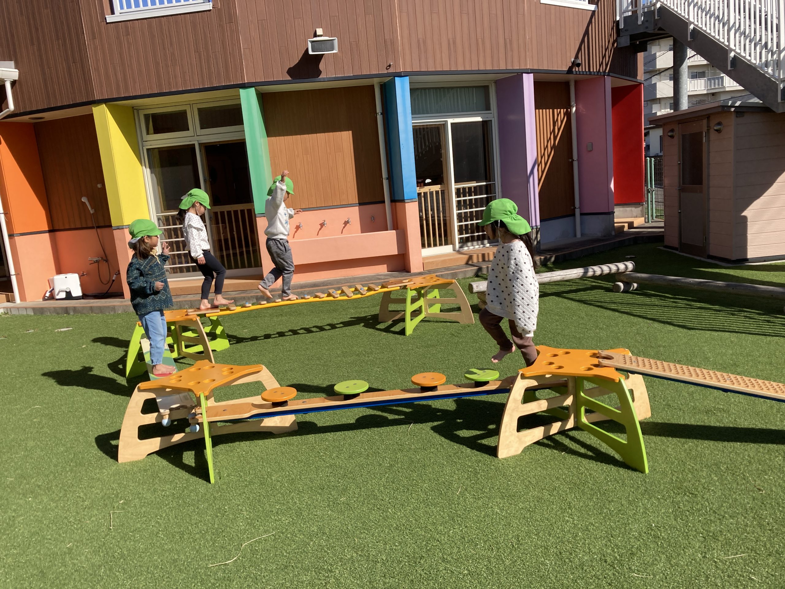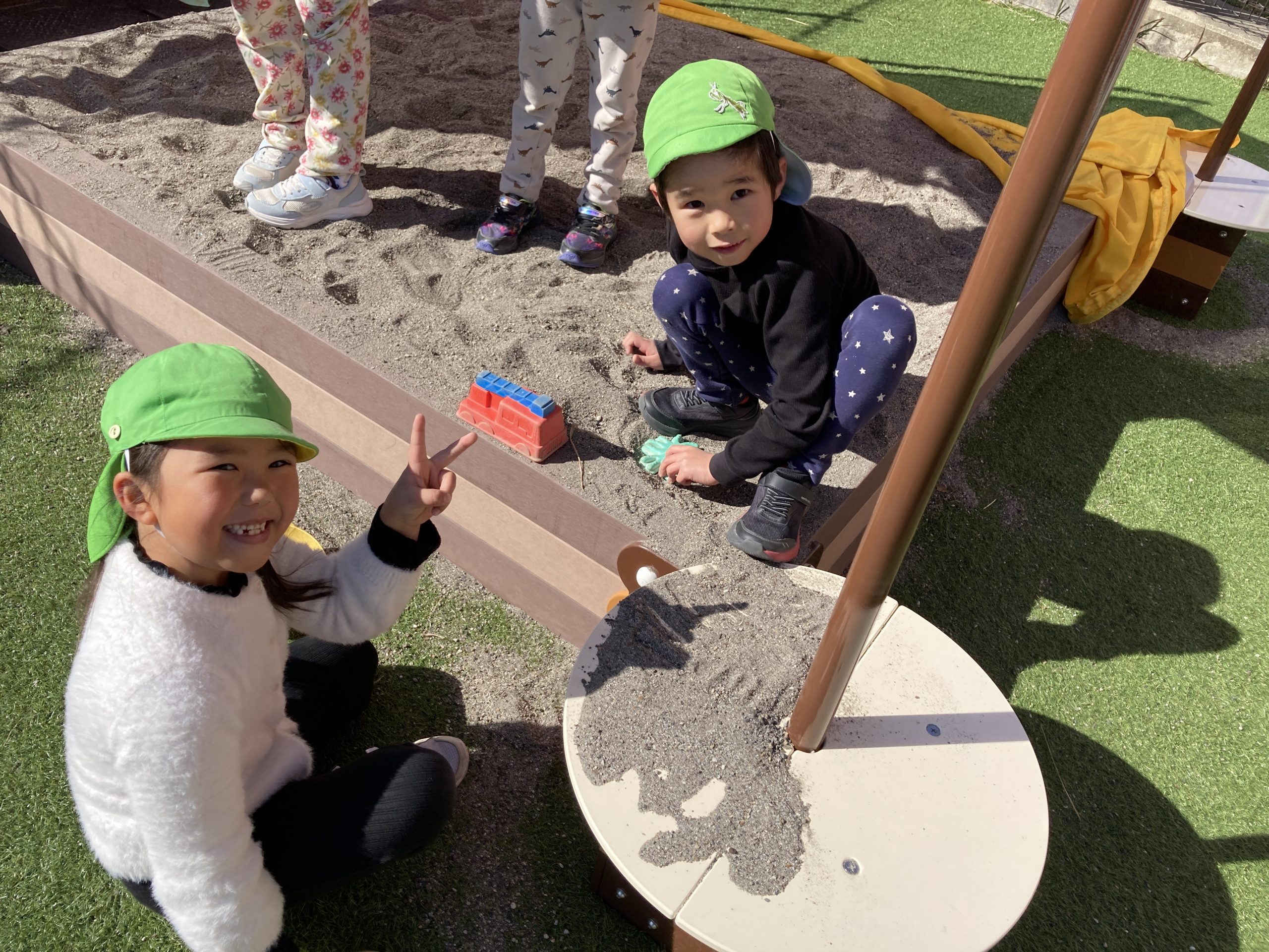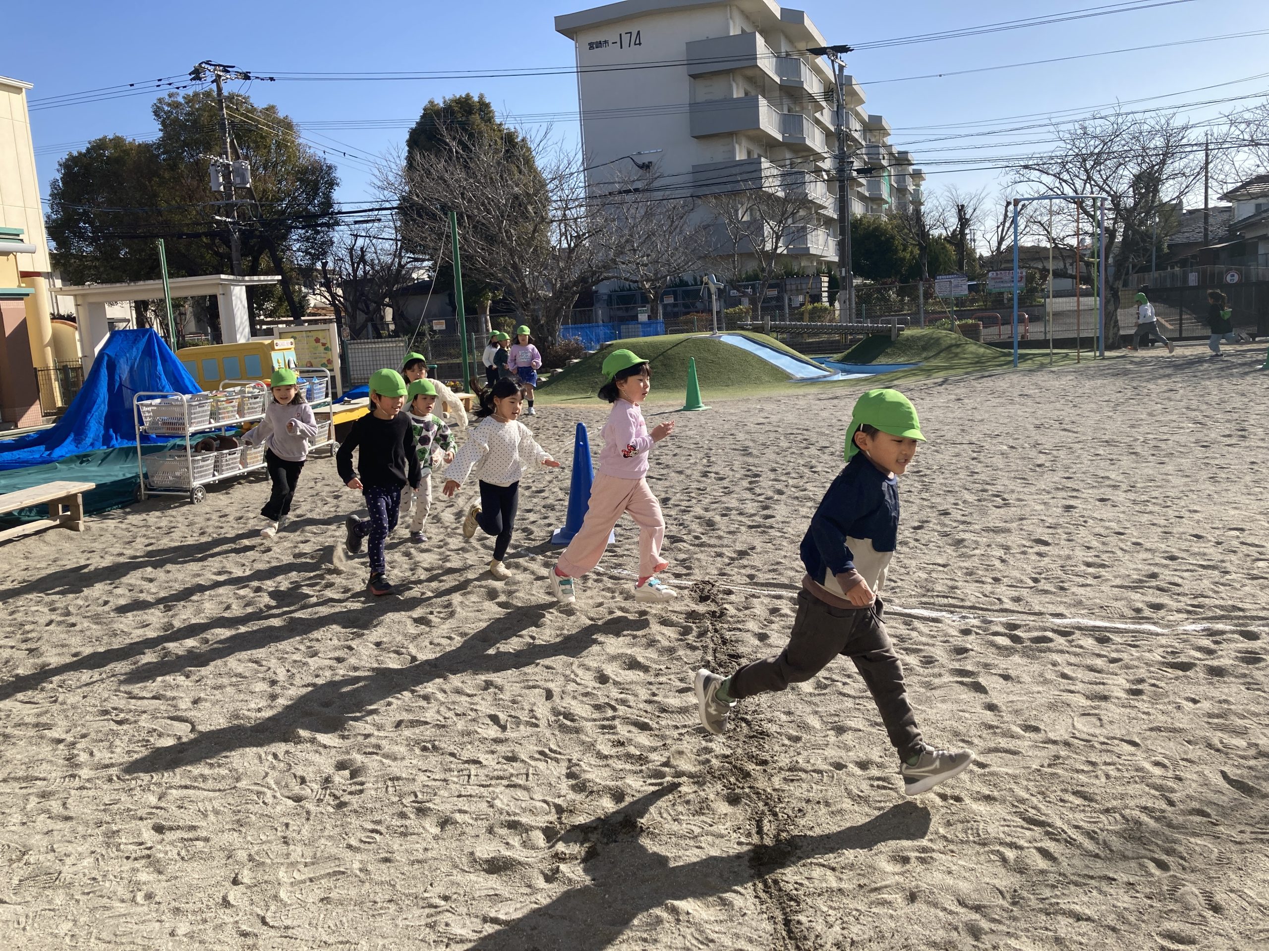 今日は、戸外あそびをしました。最初にマラソン大会に向けて園庭を走りました。いつもより長い距離でしたが頑張って走っていました。その後、新園舎の園庭に行ってサーキットや砂場で遊びました。久しぶりの新園舎にとても喜んでいました。