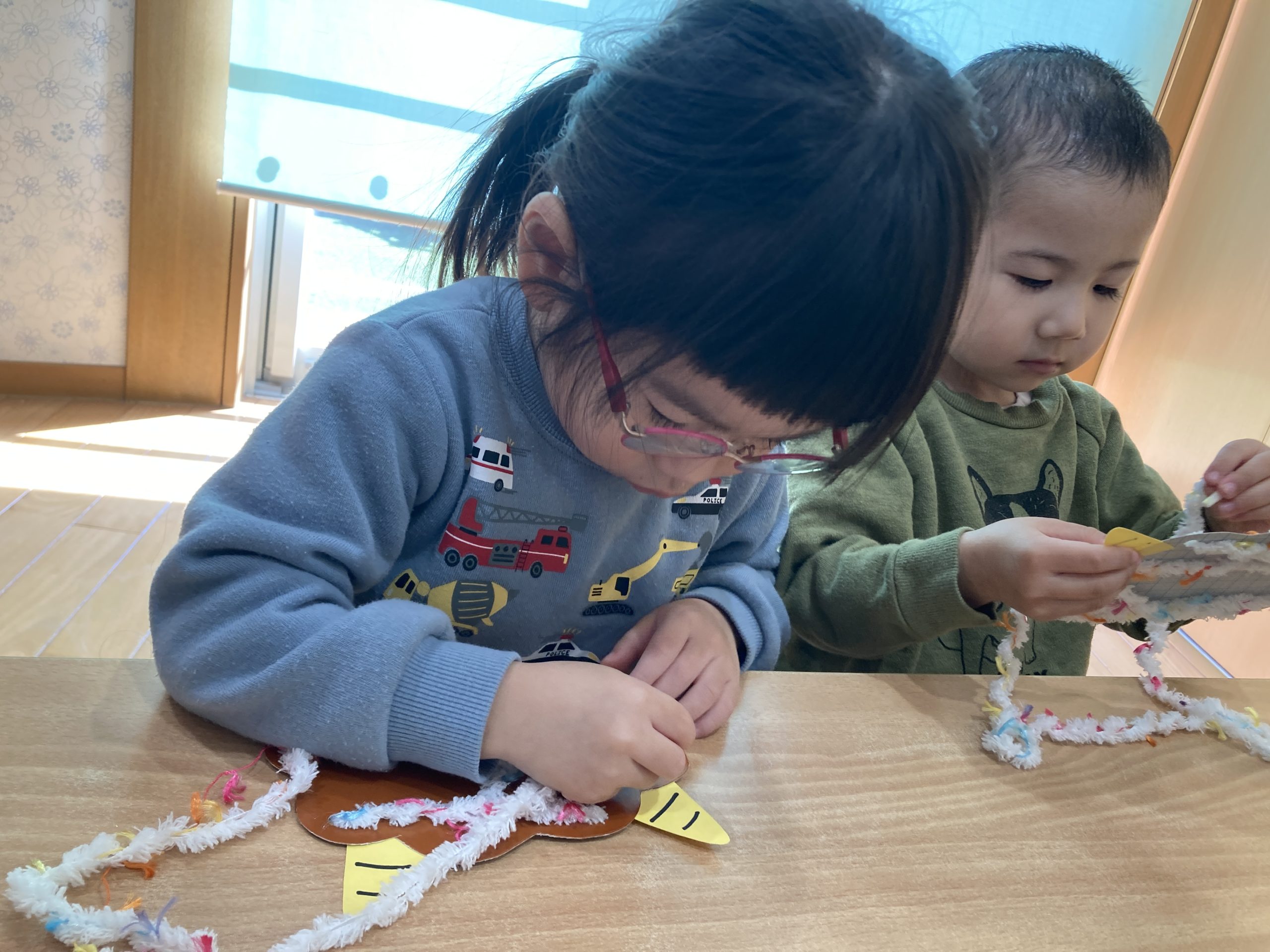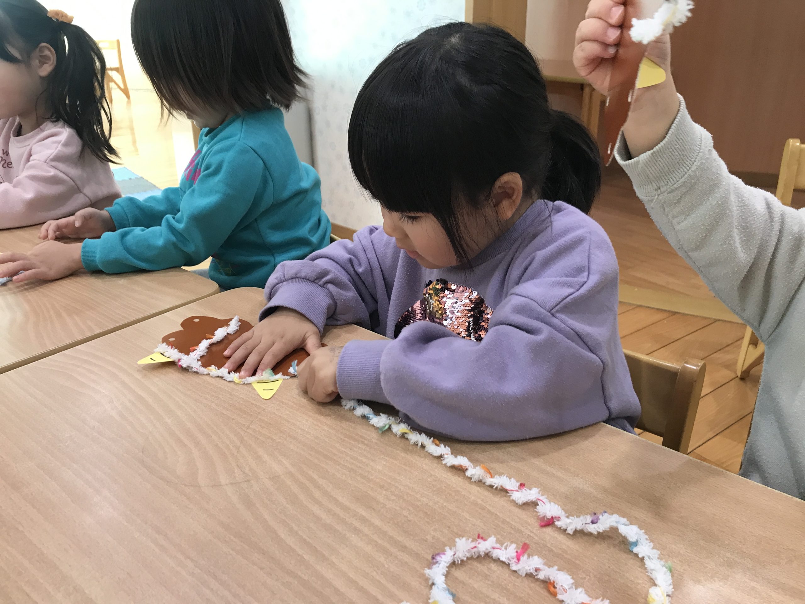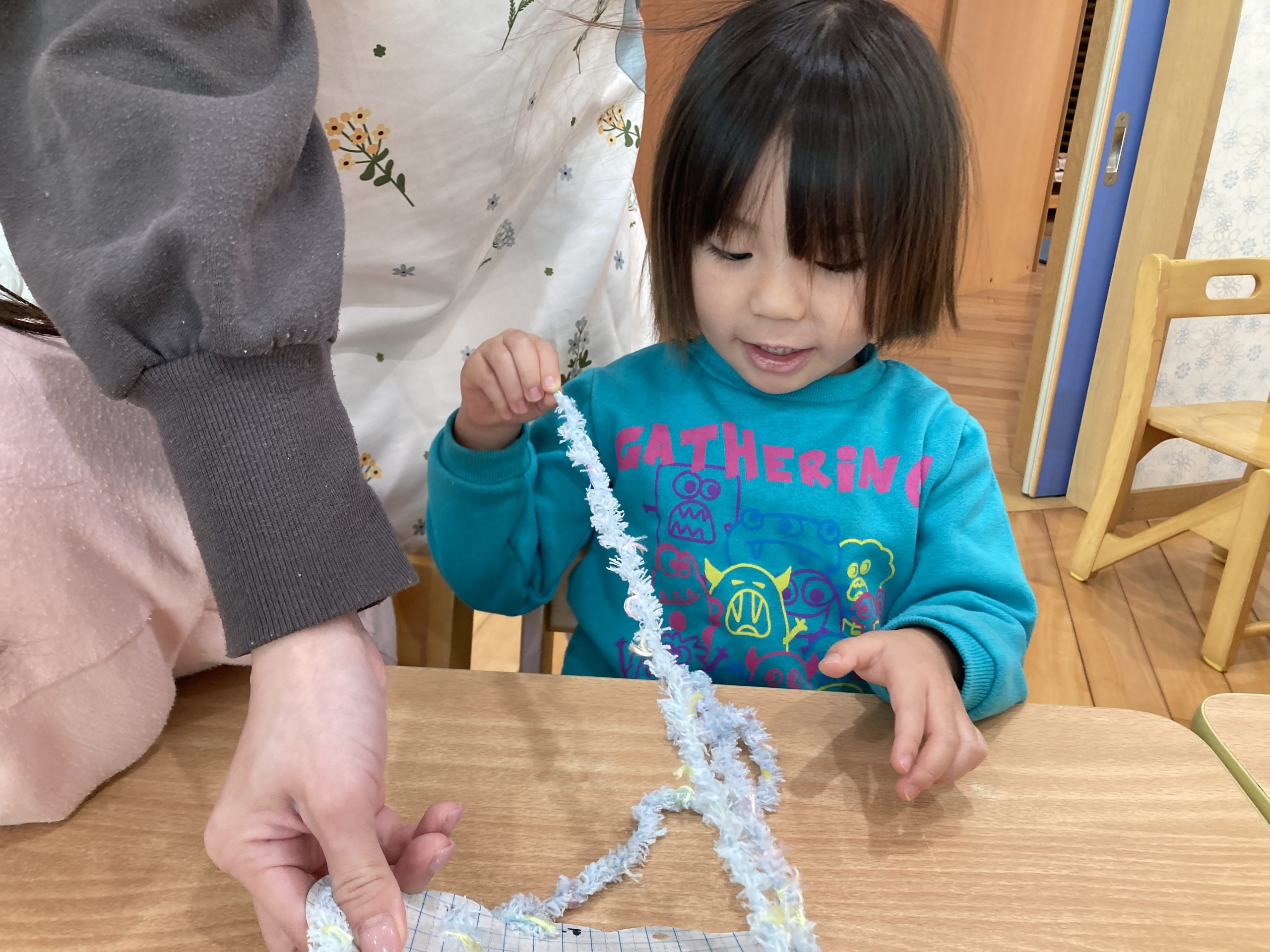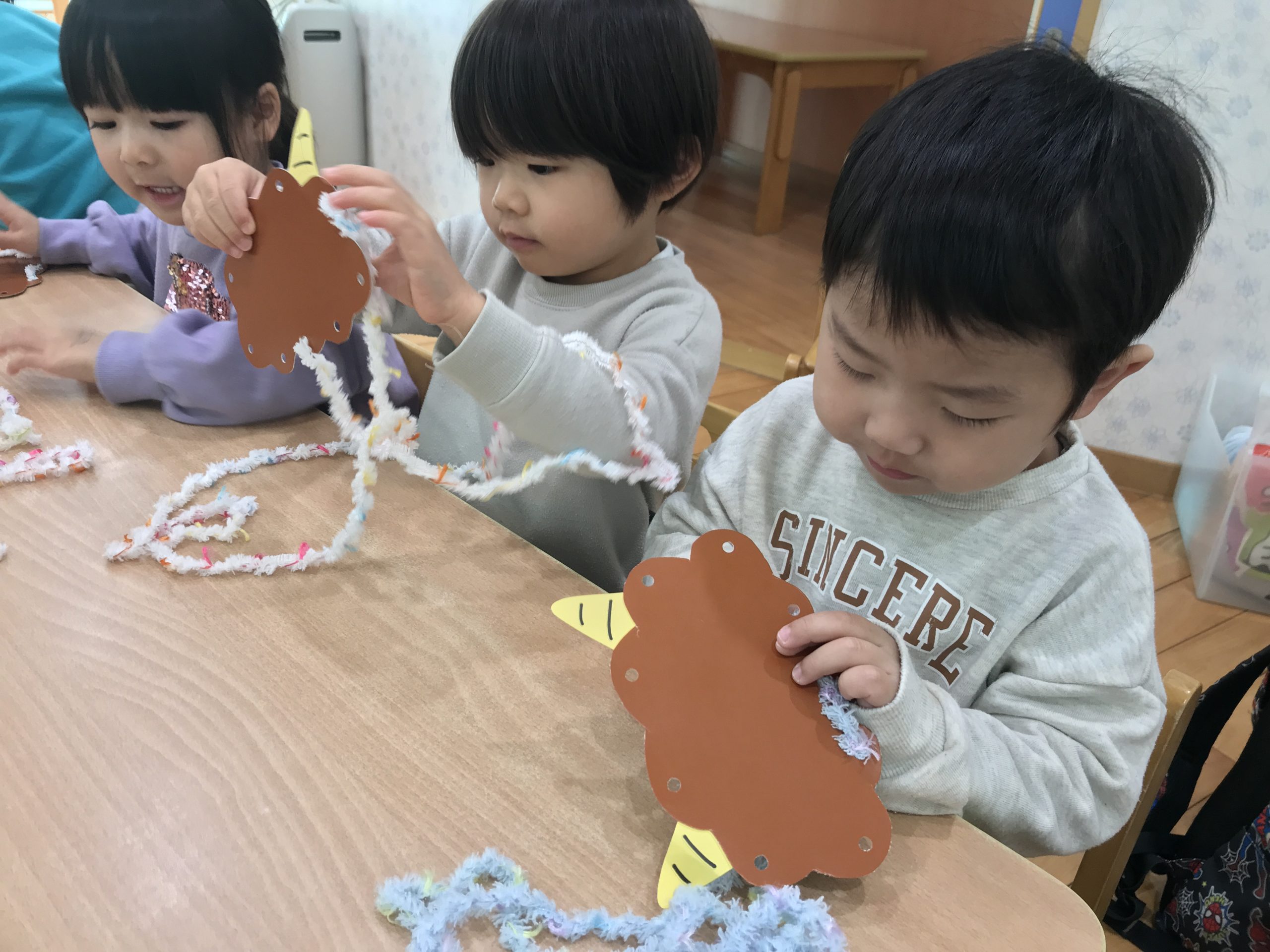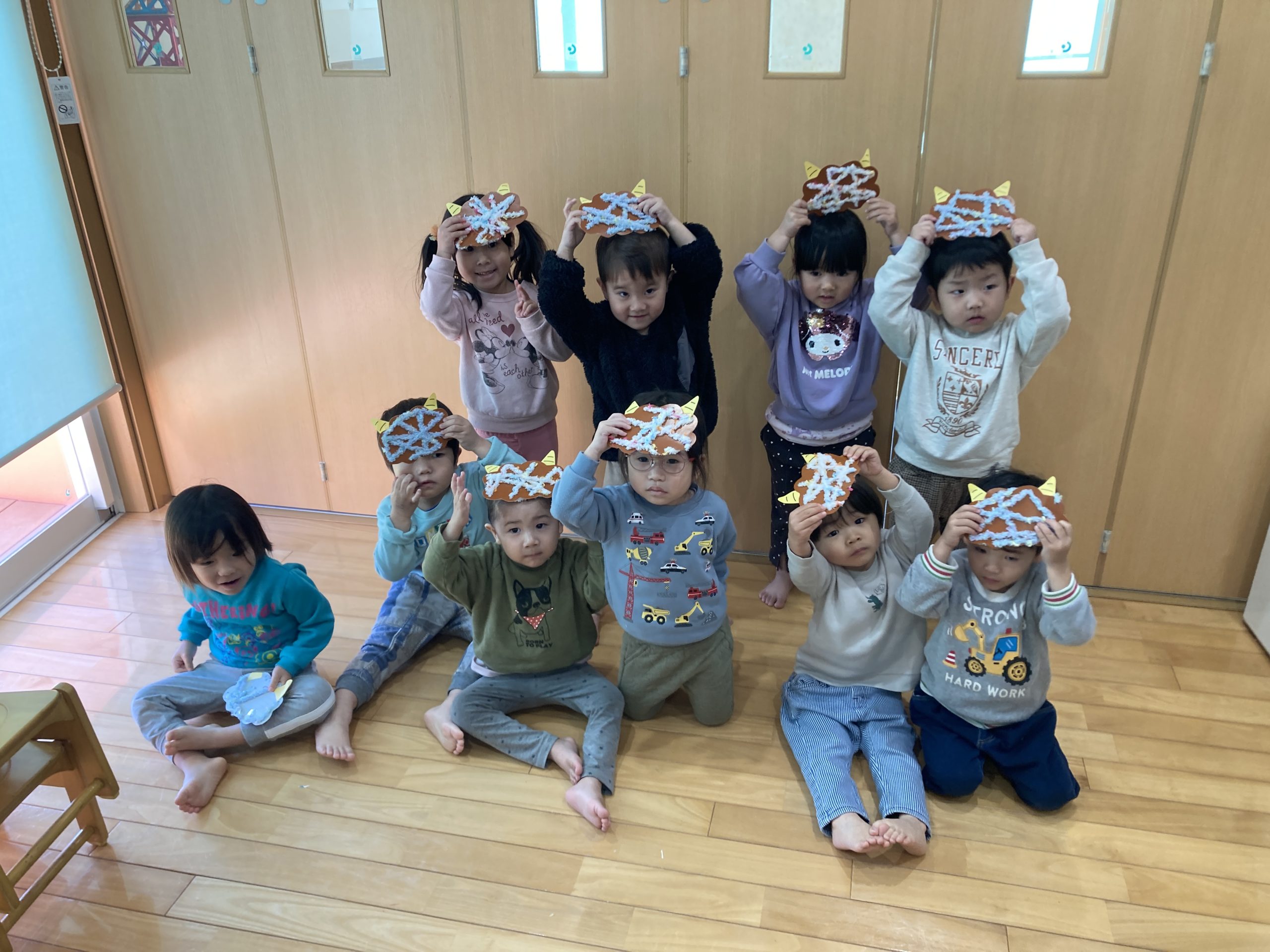 今日は、鬼のお面製作をしました👹今日は厚紙に毛糸を通して、髪の毛の部分のみを作りました!みんな上手にできていましたよ🤎✨