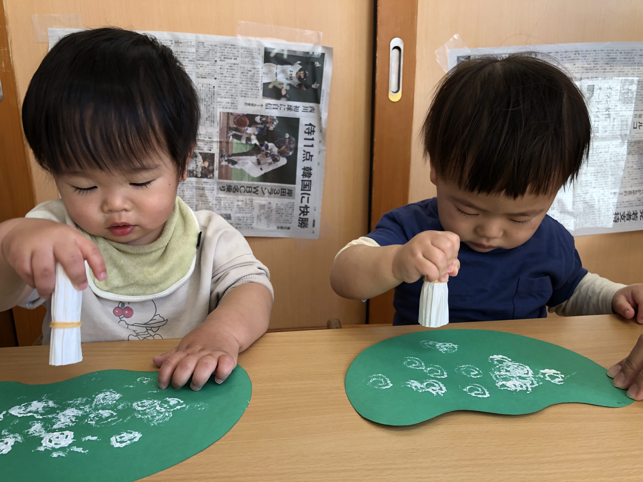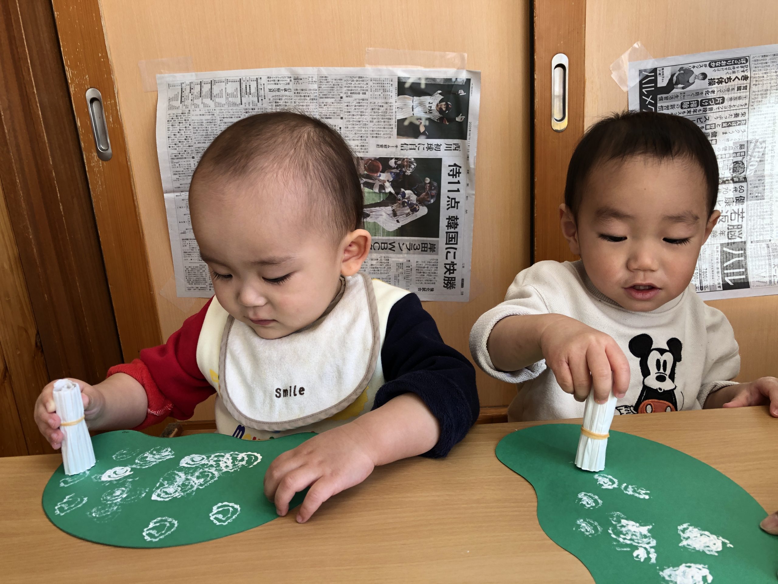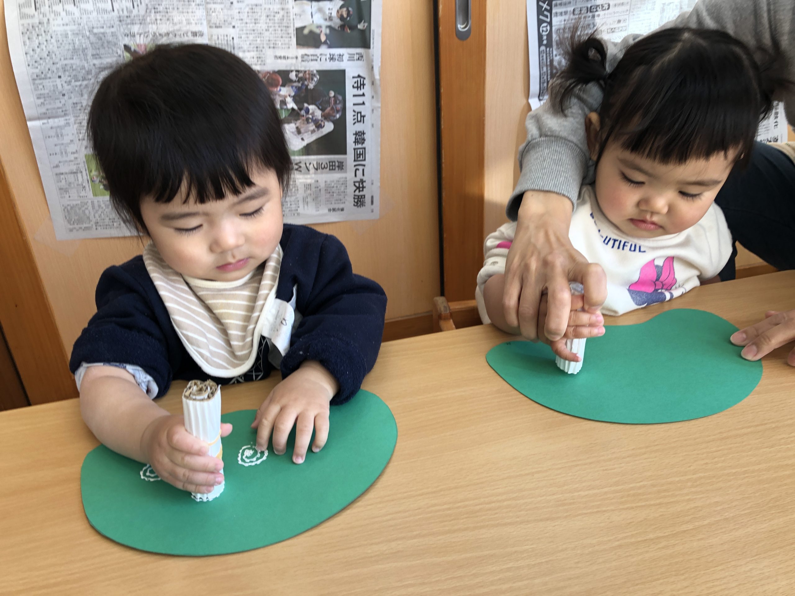 今日は、1月の製作で、段ボールで作ったスタンプを押して、午年ししまいに模様付けをしました。「ぎゅ~っ」とゆっくり押したり、「ポンポン」と連続で押して たくさんスタンプして楽しんでいました。