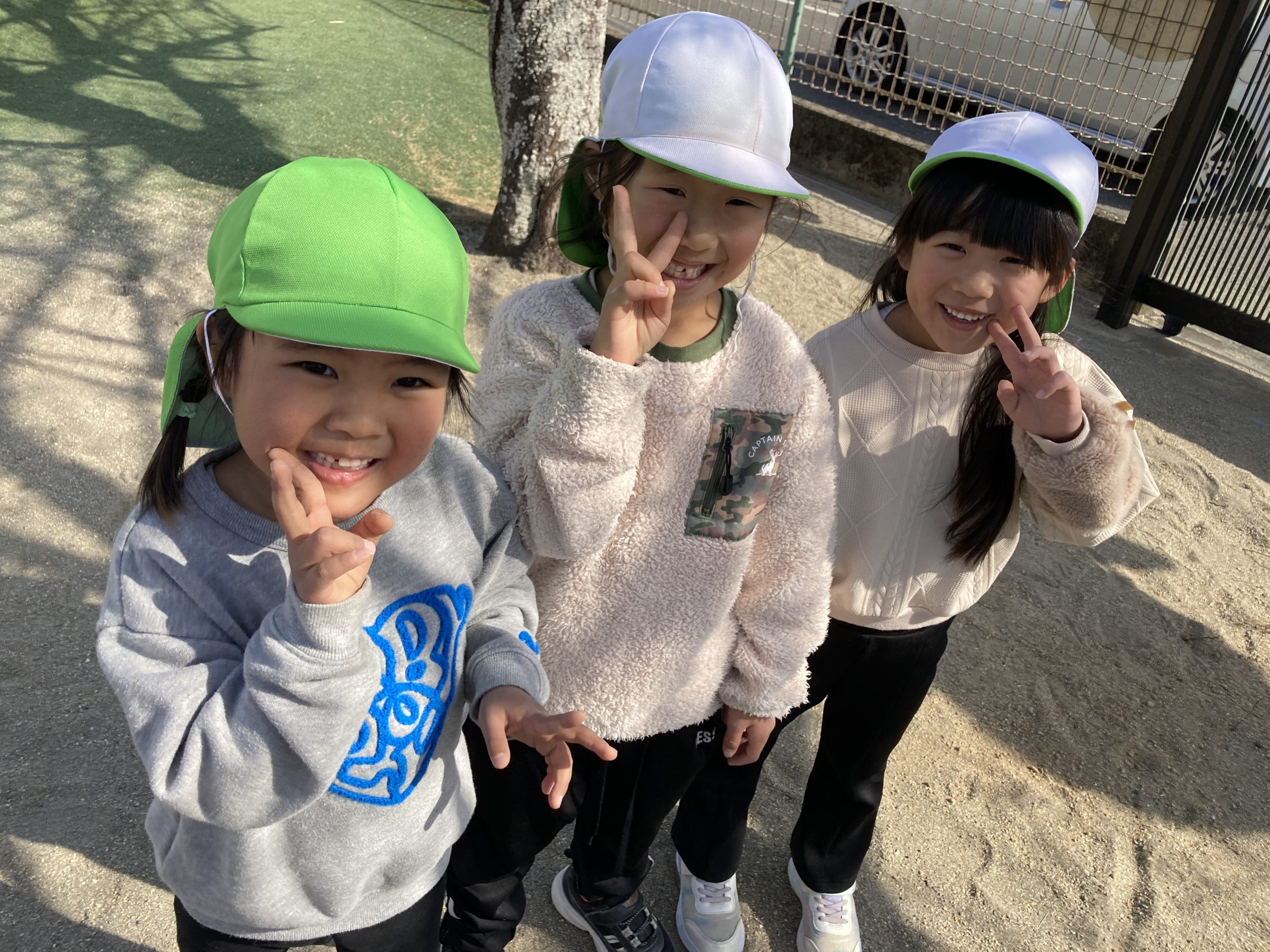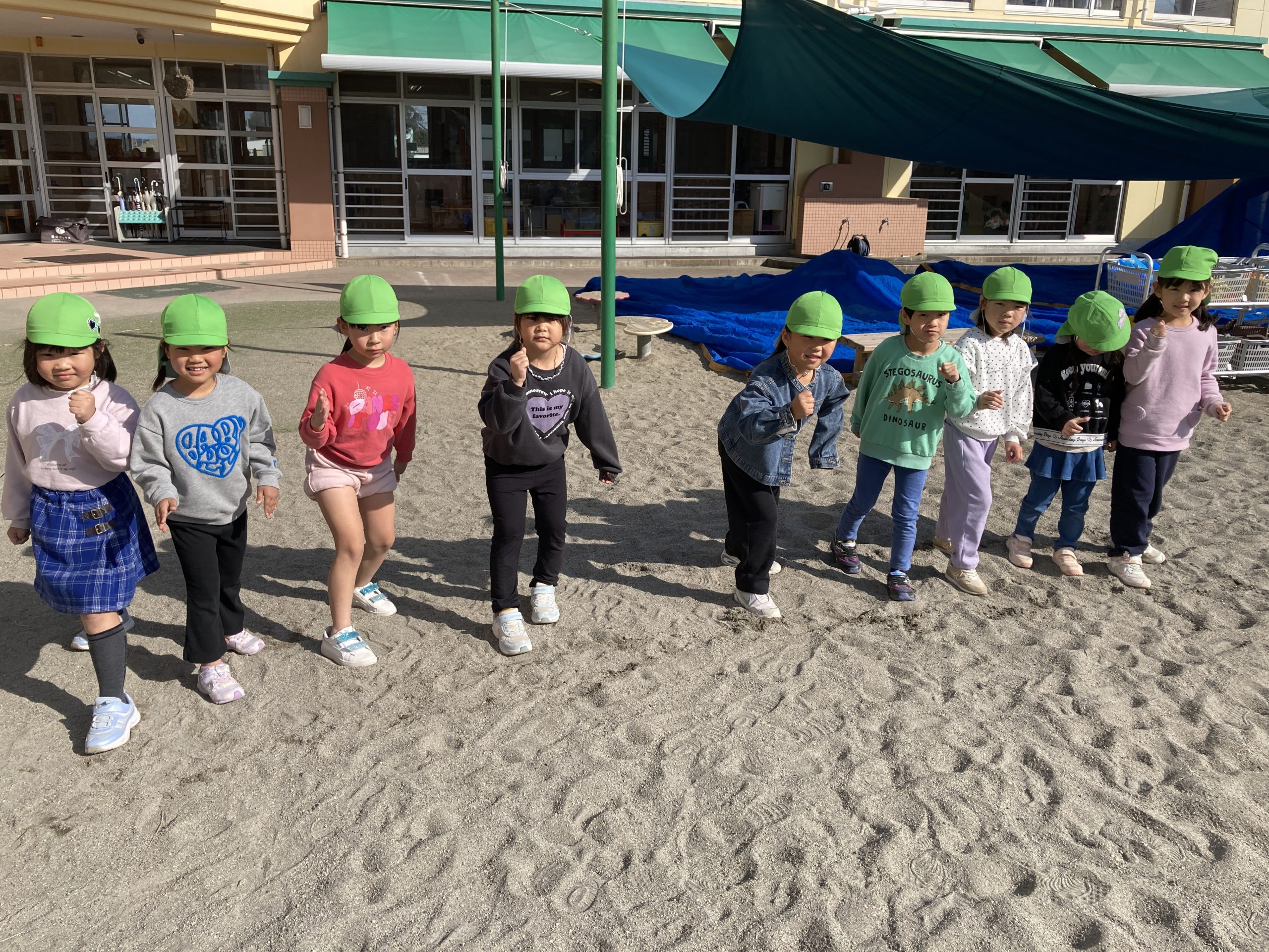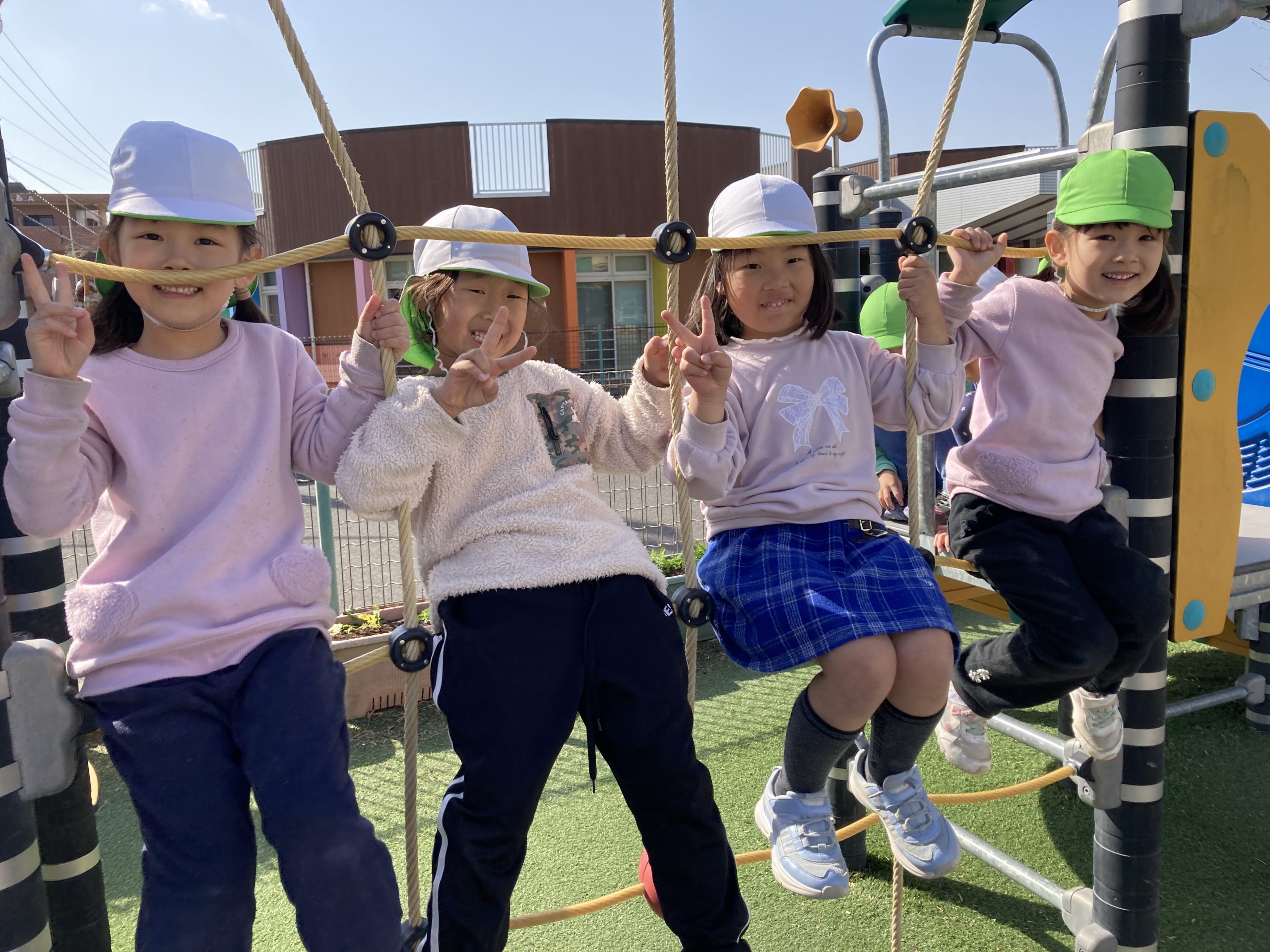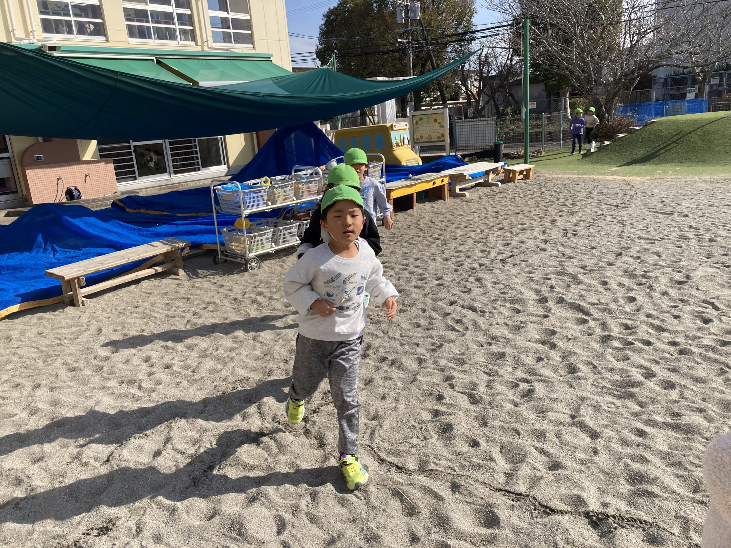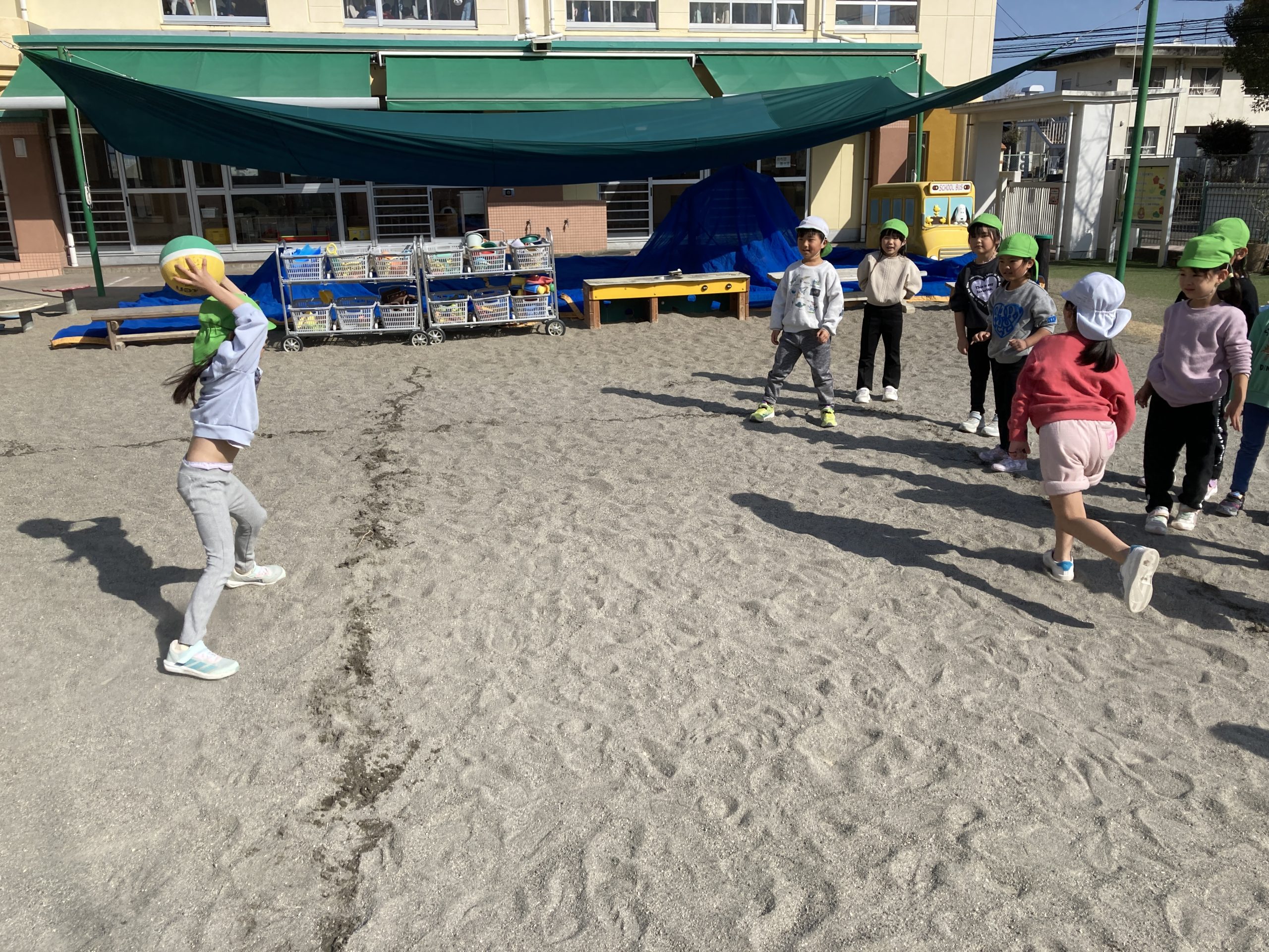 今日は、戸外で遊びました。2つのグループに分かれて、園庭のマラソンを走ったり、ドッチボールの試合をしたりしました。お友だちをねらって投げたり、ボールをキャッチする練習もしました。大型遊具では、体を動かして、たくさん遊びました。