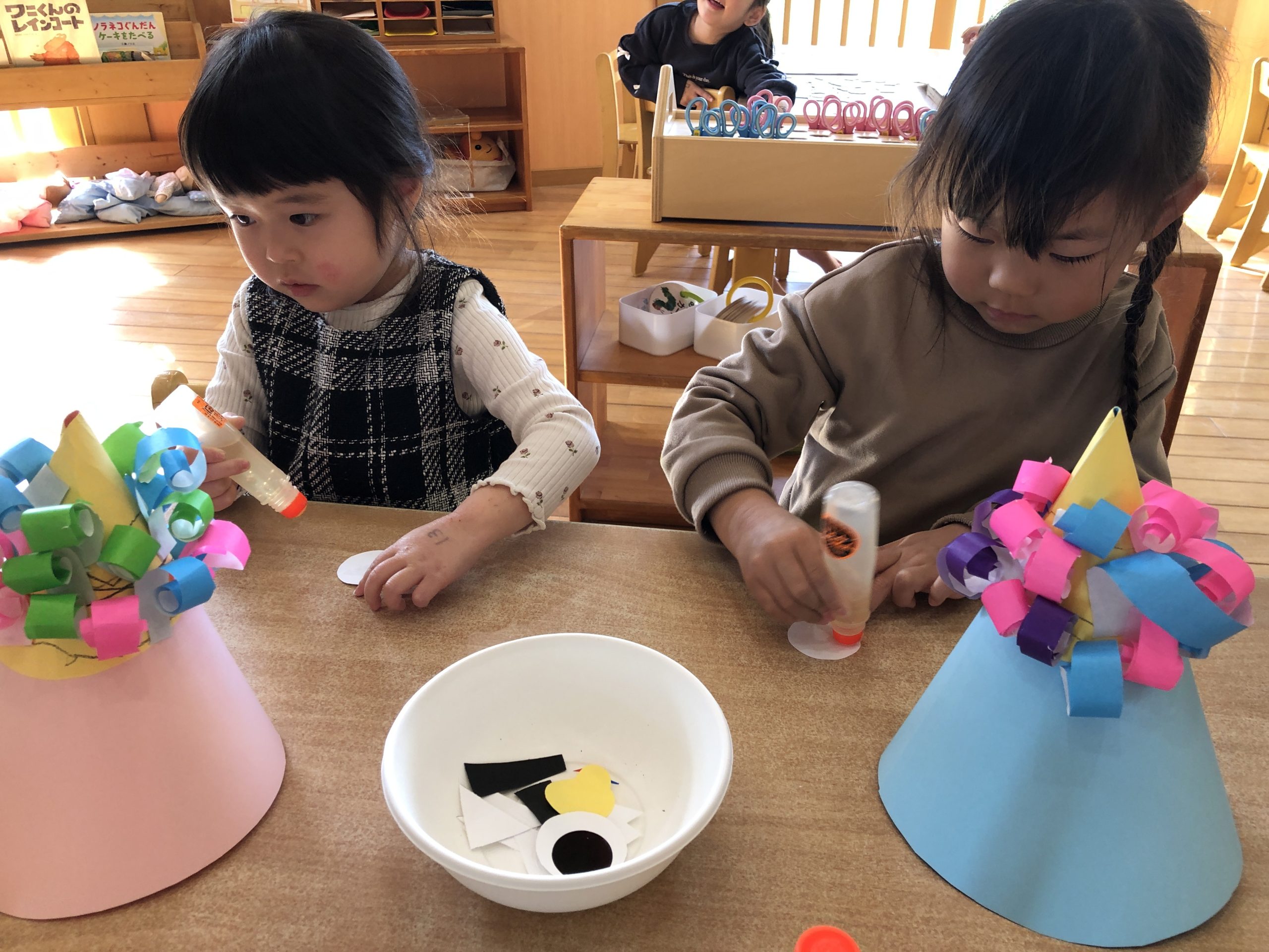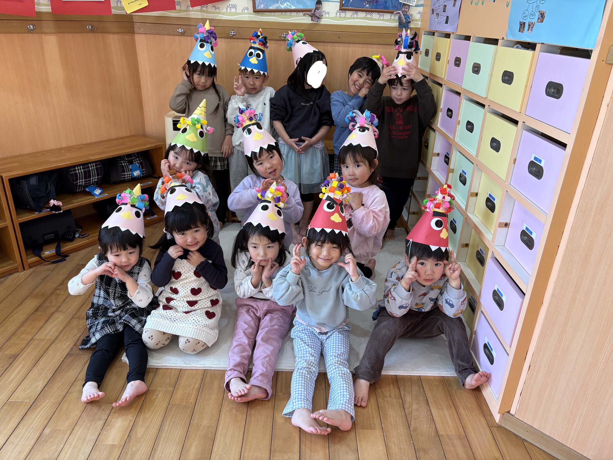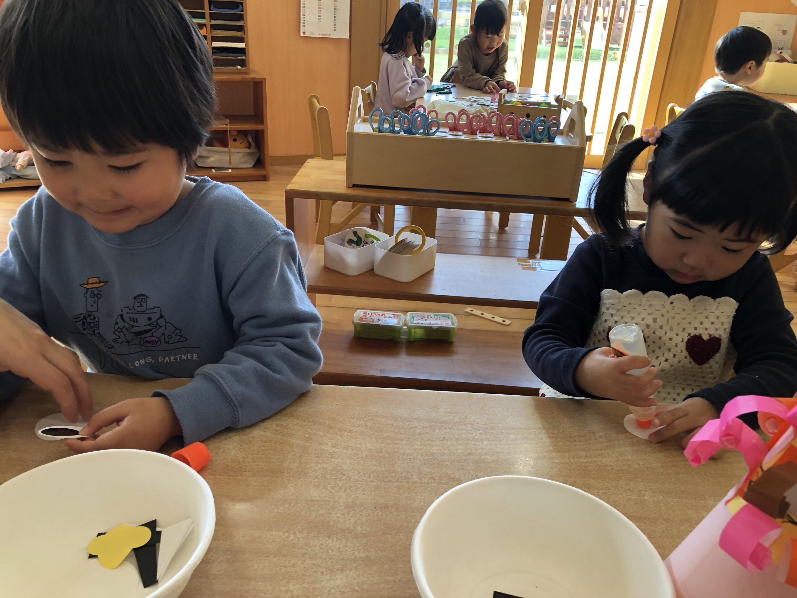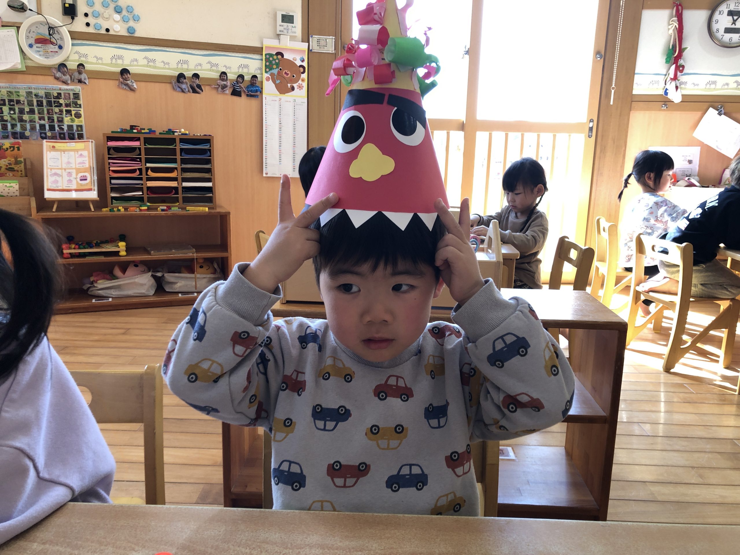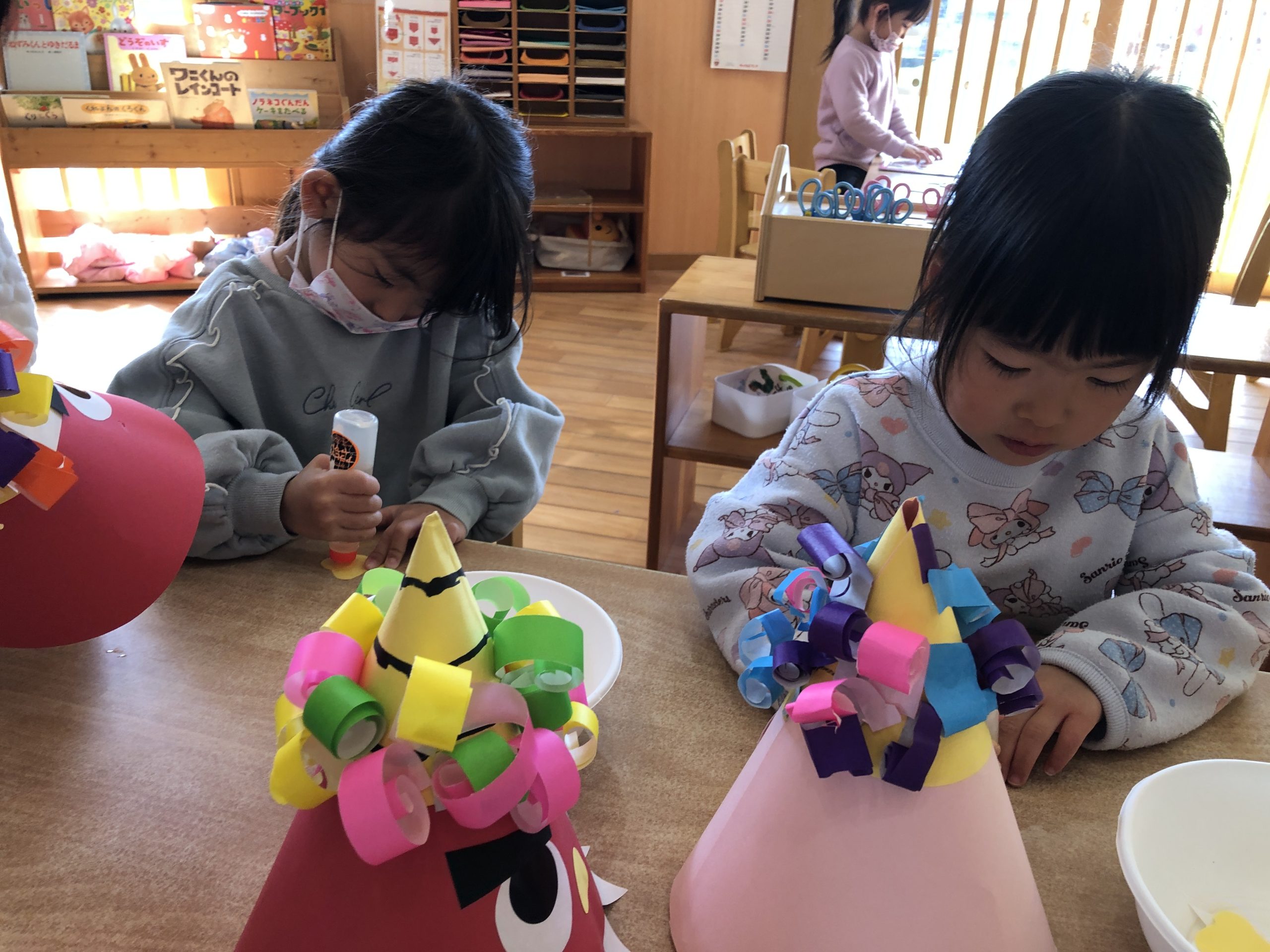 今日は、昨日の続きで鬼の顔にパーツを貼っていきましたよ🎶「かっこいい鬼にする!」「可愛い顔にしたいな〜」と言いながら、製作していましたよ😆完成した後は、本番に向けみんなで掛け声の練習もしましたよ〜👹✨