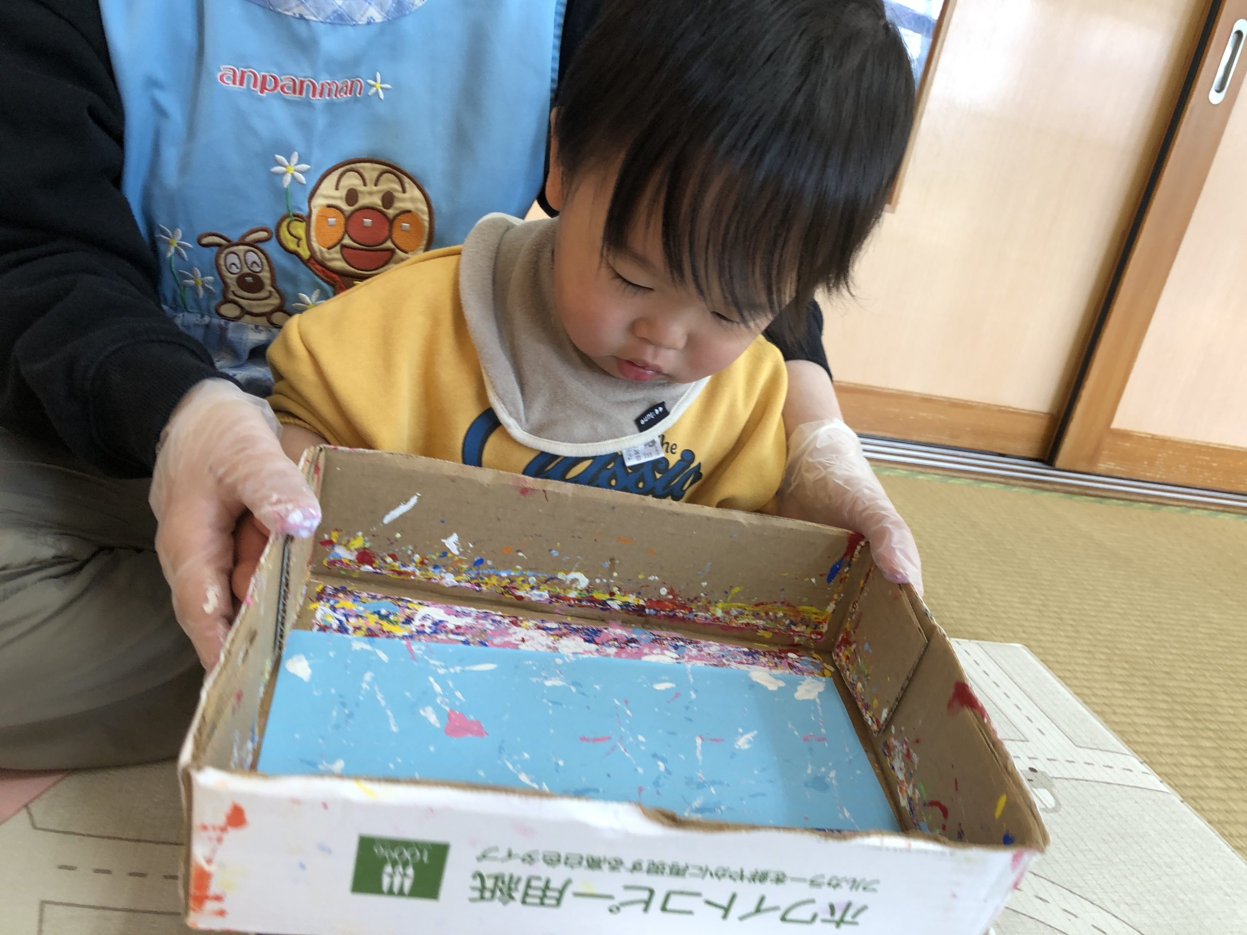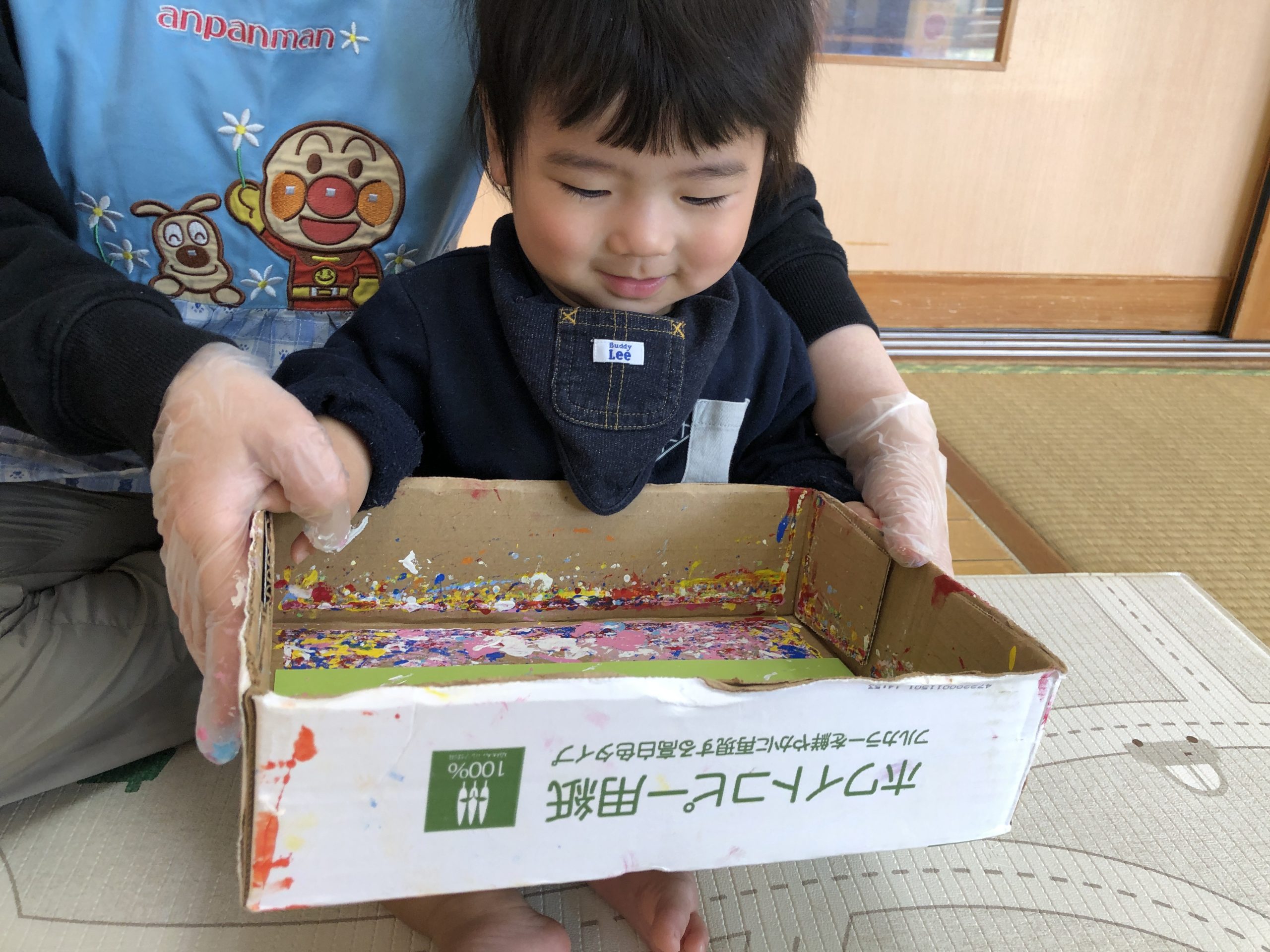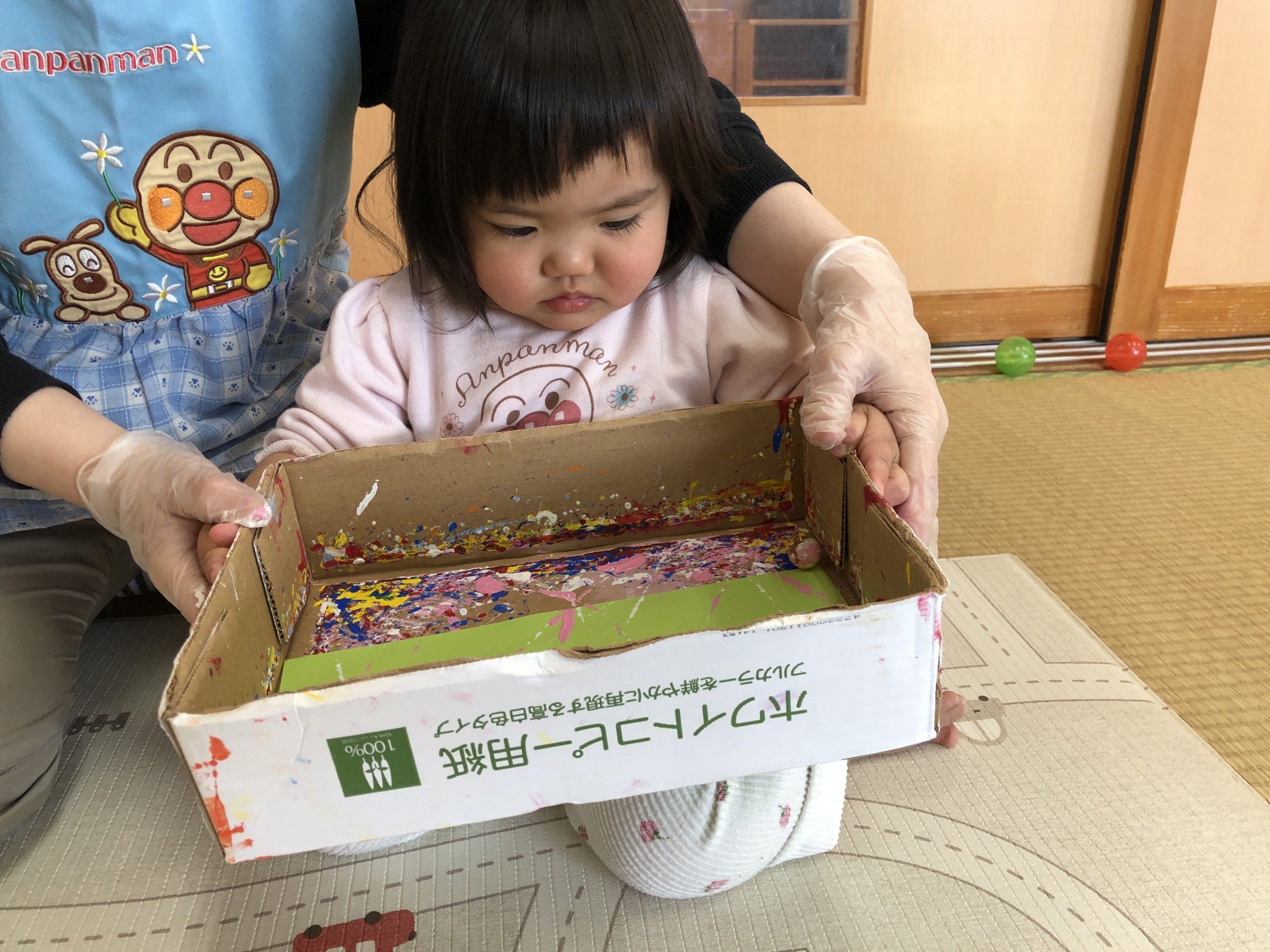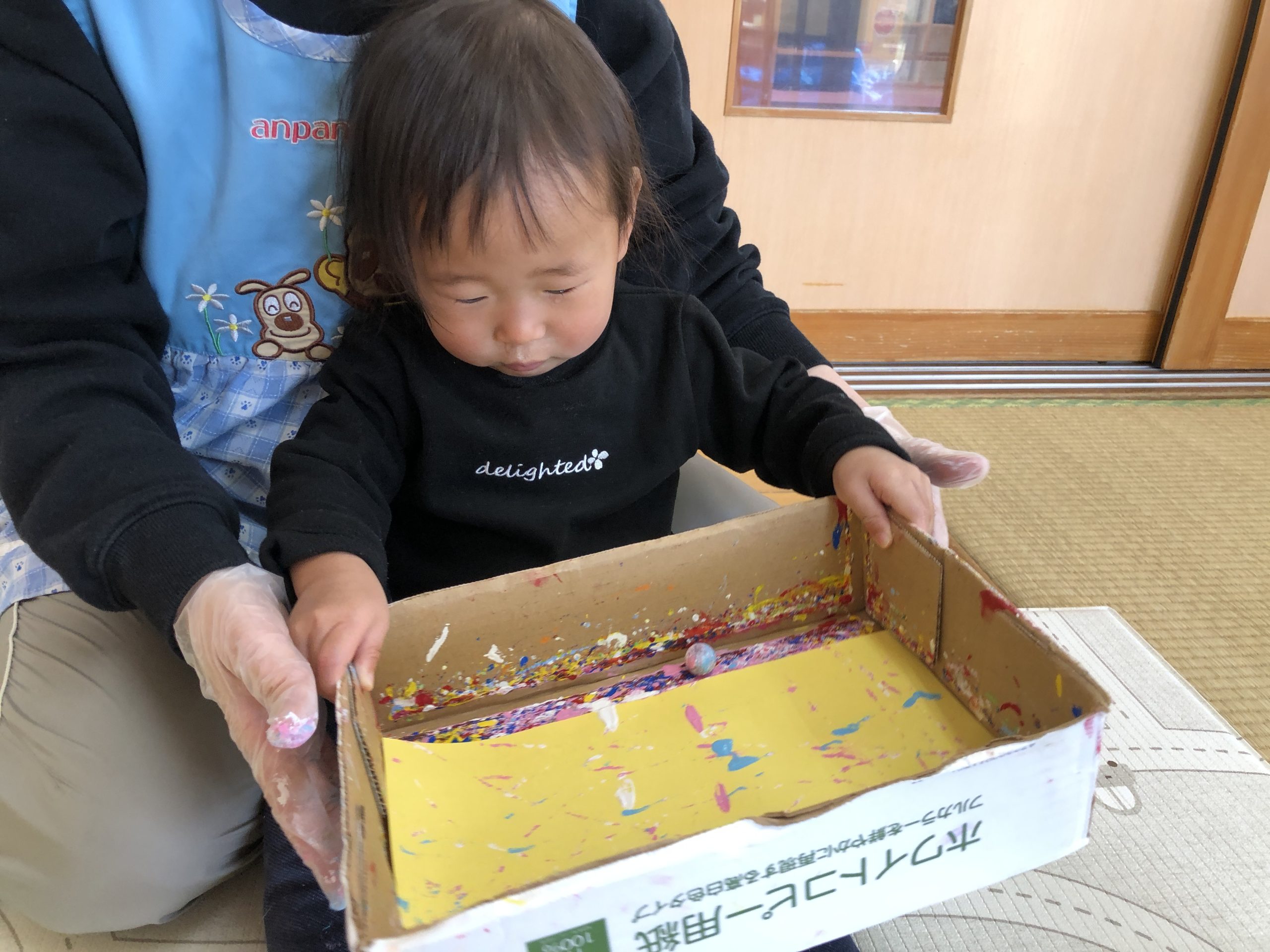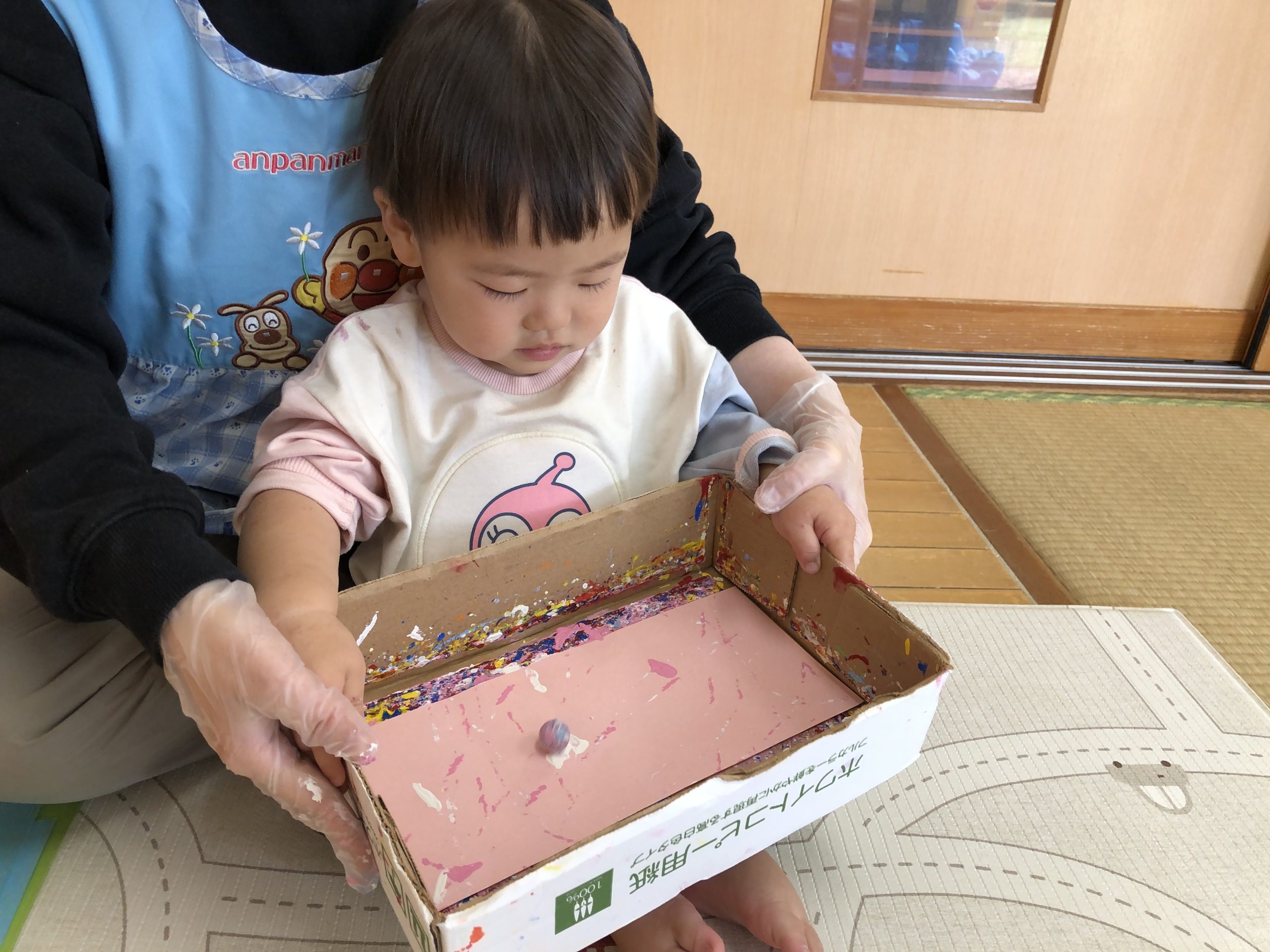 今日は、お買い物ごっこの商品の製作あそびで、絵の具とビー玉で画用紙に模様付けしました♪乾いたら牛乳パックに貼り付けてお財布になります✨