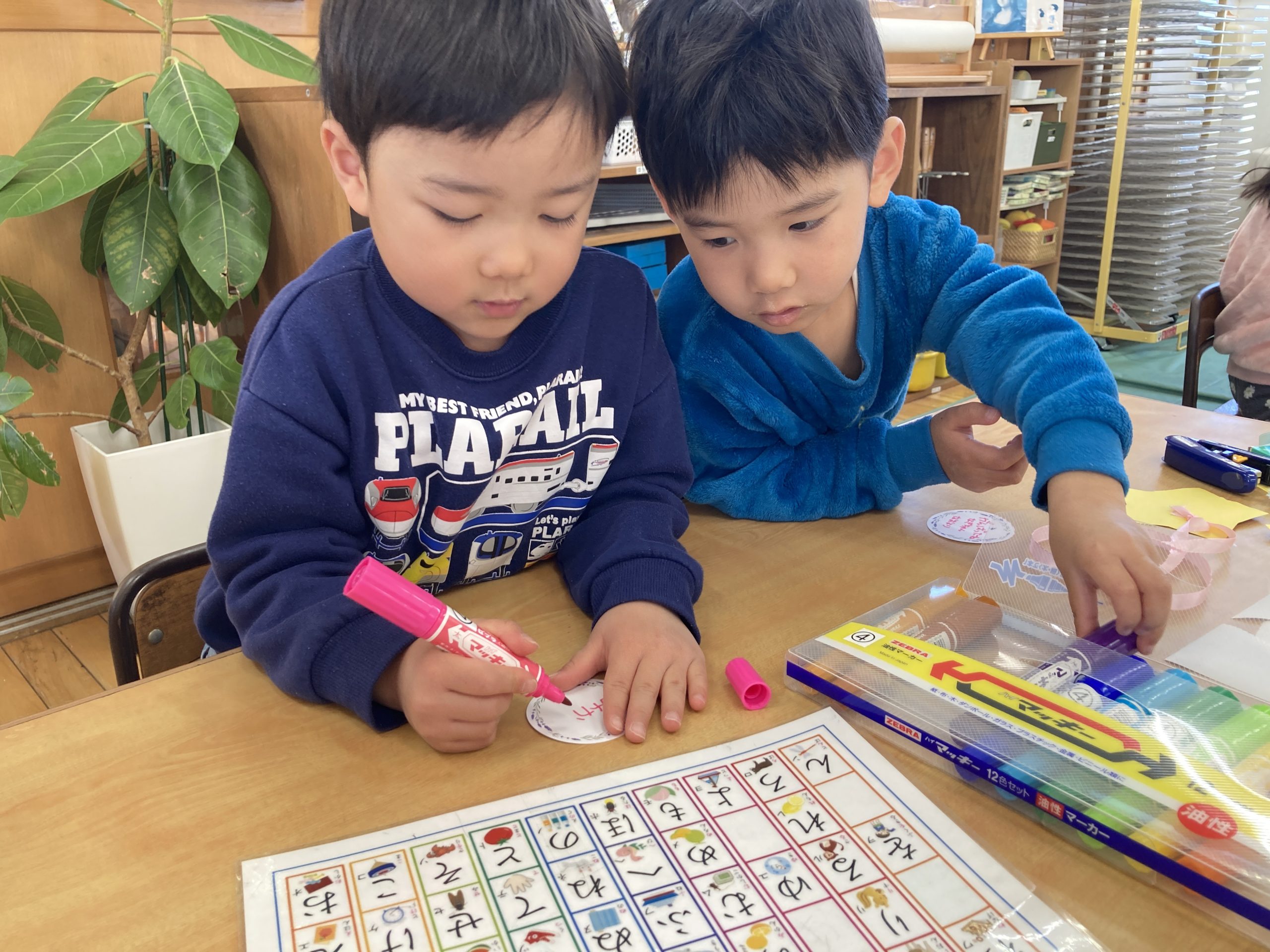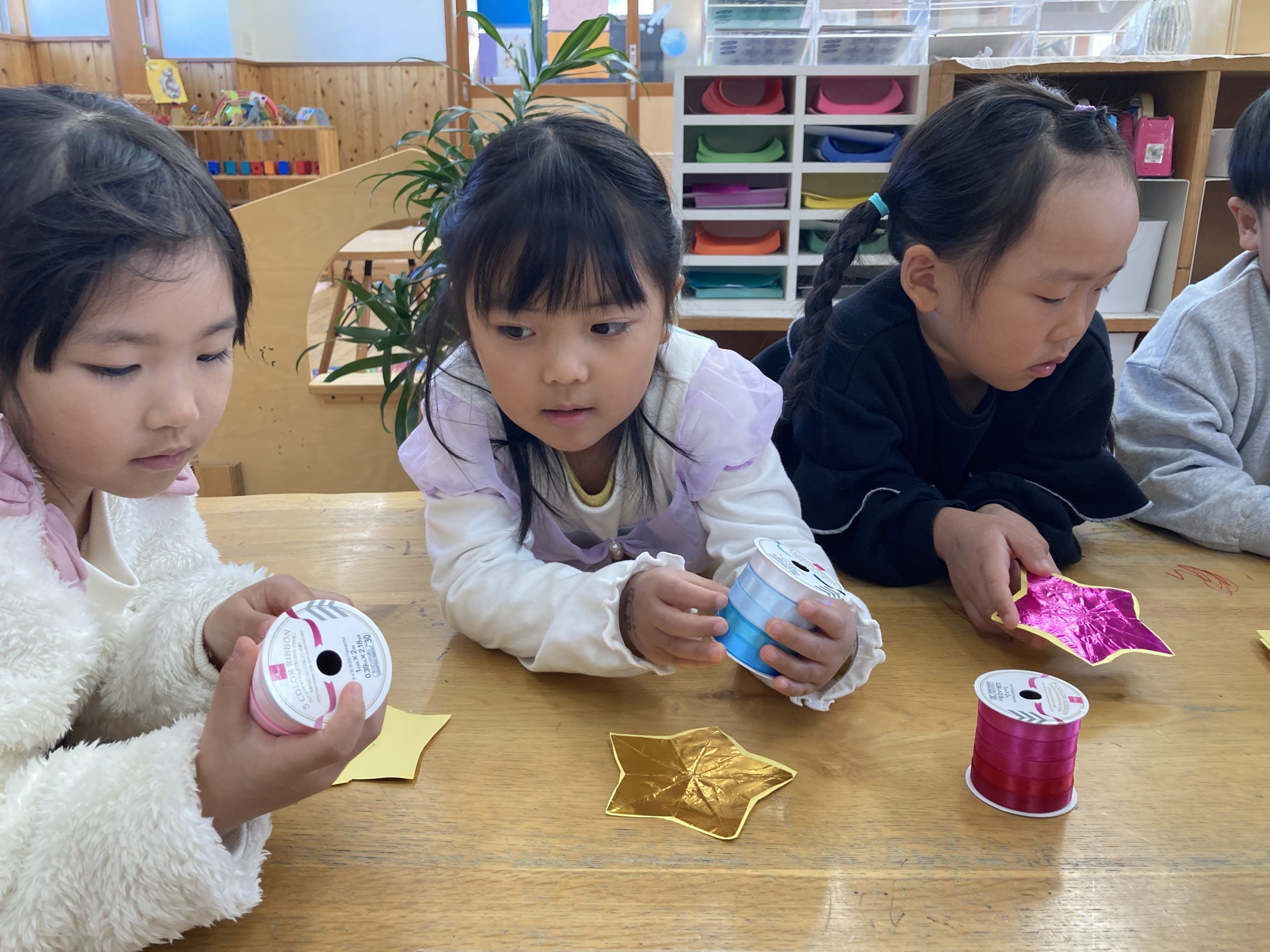 今日は昨日の続きでメダル製作をしました🏅昨日作った星の折り紙の形に画用紙を切ったりリボンを選んだりしました🎀メッセージカードには「頑張りました 〇〇より」などと自分で文字を書いたり保育者と一緒に書いたりもしました✏️「僕たちはどんなメダルもらうのかな〜」と楽しみにしていました💖